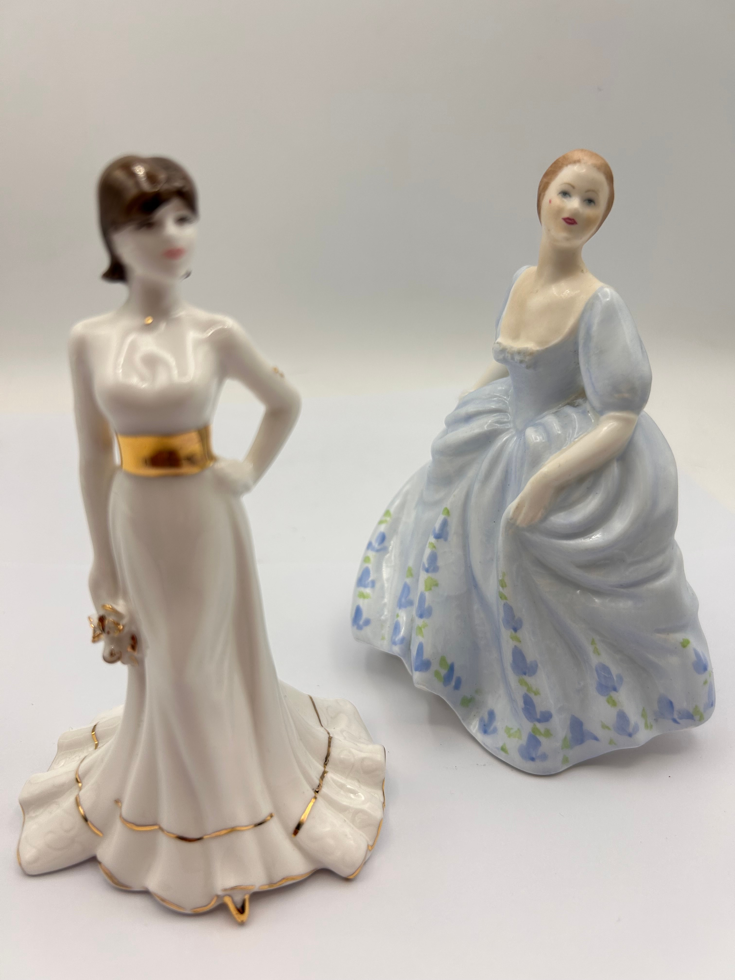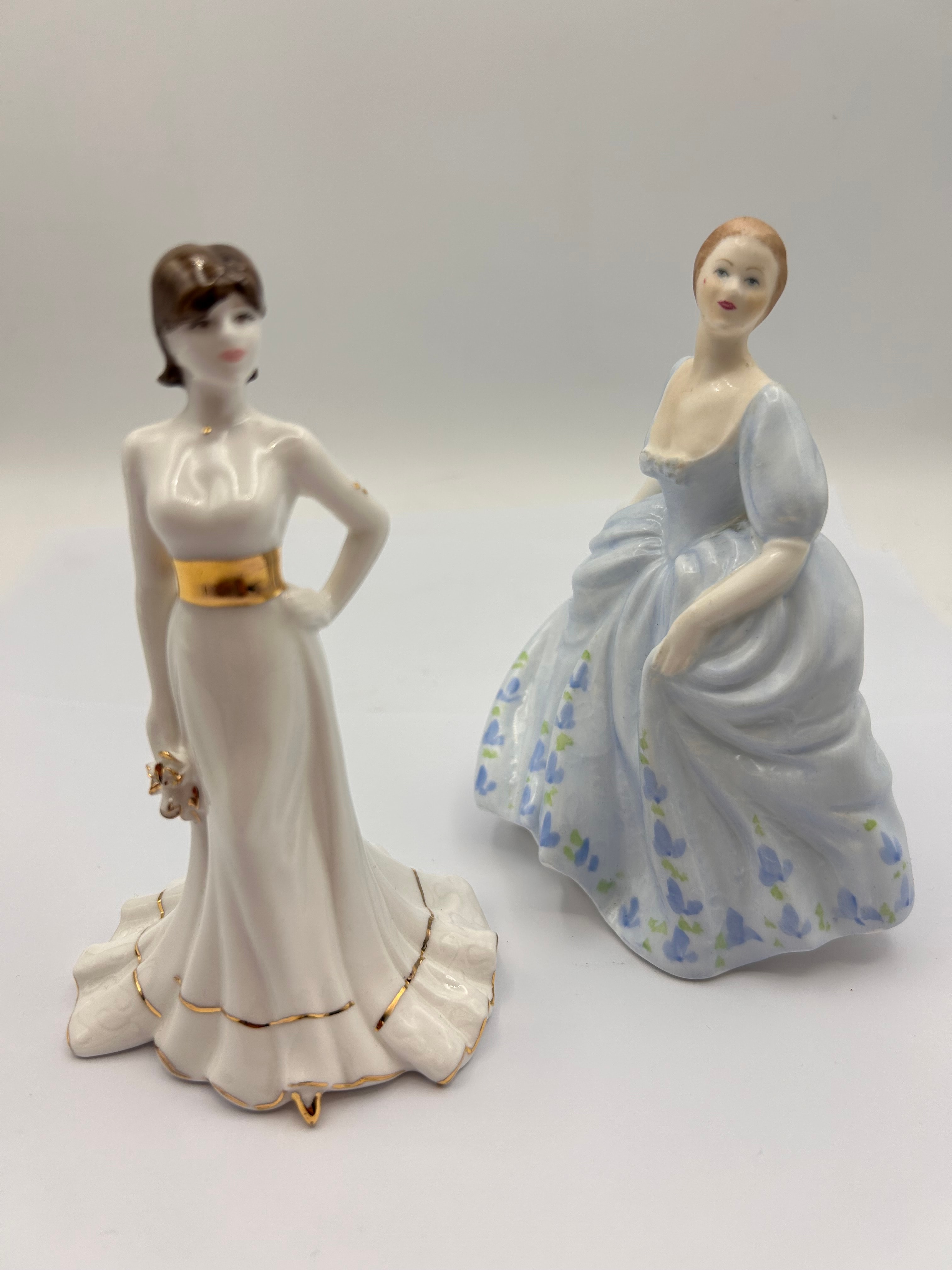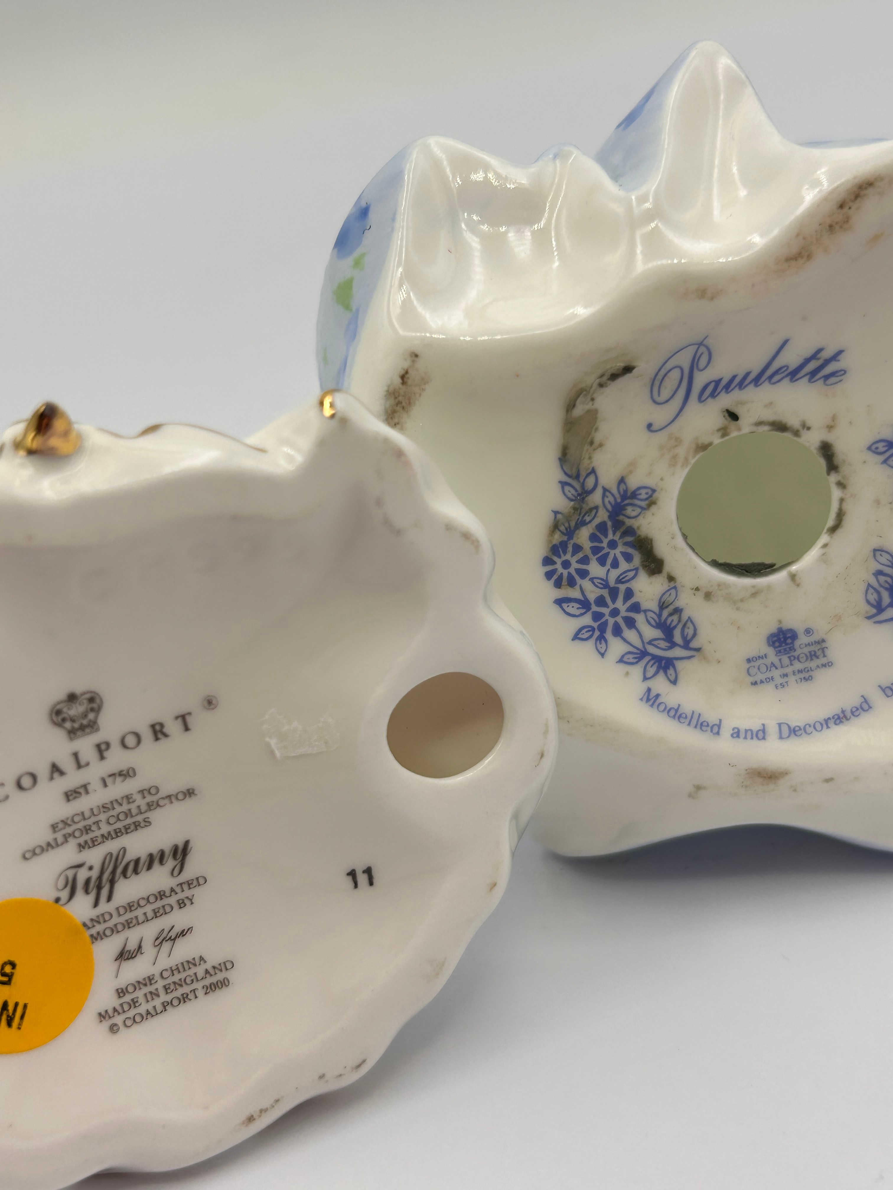 A pair of Coalport bone china figurines, comprising ‘Tiffany’ and ‘Paulette’. The ‘Tiffany’ figurine depicts a woman in a white, floor-length gown with a gold sash, characteristic of a formal or bridal style, holding a small bouquet. Its base is marked “COALPORT®,” “EST. 1750,” “EXCLUSIVE TO COALPORT COLLECTOR MEMBERS,” “Tiffany,” “MODELLED AND DECORATED BY Jan Glyn,” “BONE CHINA,” “MADE IN ENGLAND,” and “© COALPORT 2000.” The ‘Paulette’ figurine portrays a woman in a light blue, voluminous historical-style gown adorned with blue floral patterns. Its base is marked “Paulette,” “COALPORT,” “EST. 1750,” and “MADE IN ENGLAND,” and also indicates it was “MODELLED AND DECORATED by Jan Glyn.” Both figurines suggest a late 20th to early 21st-century production.