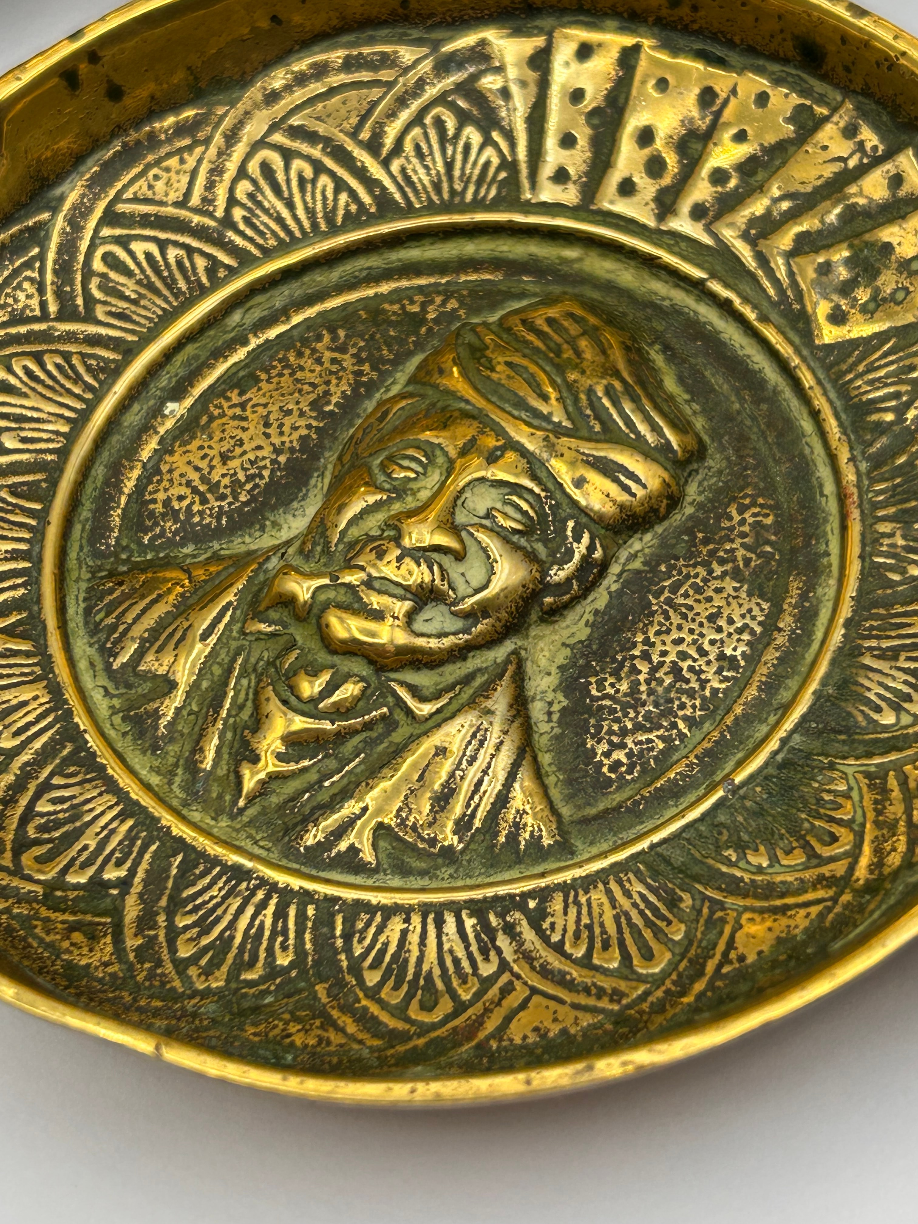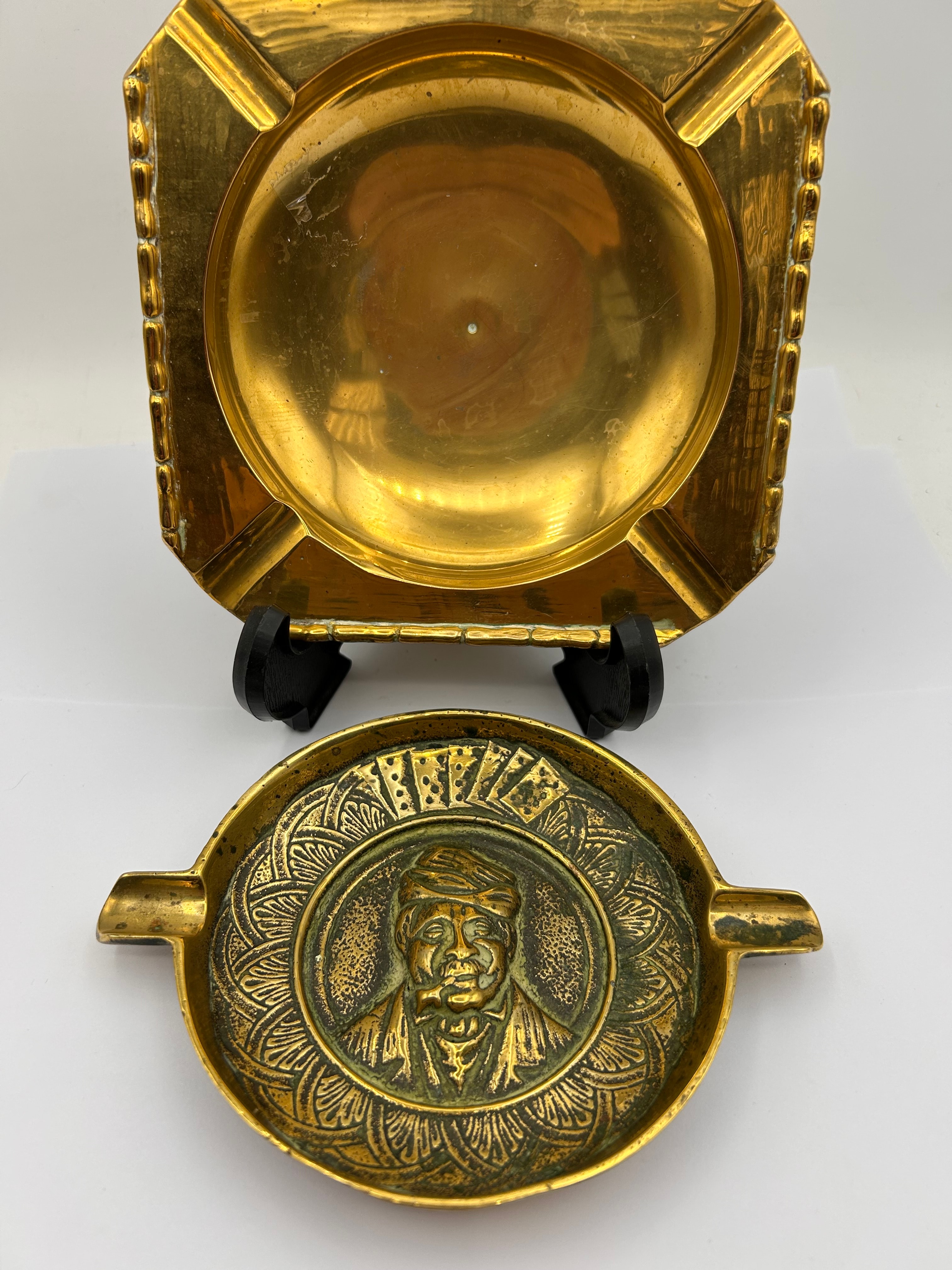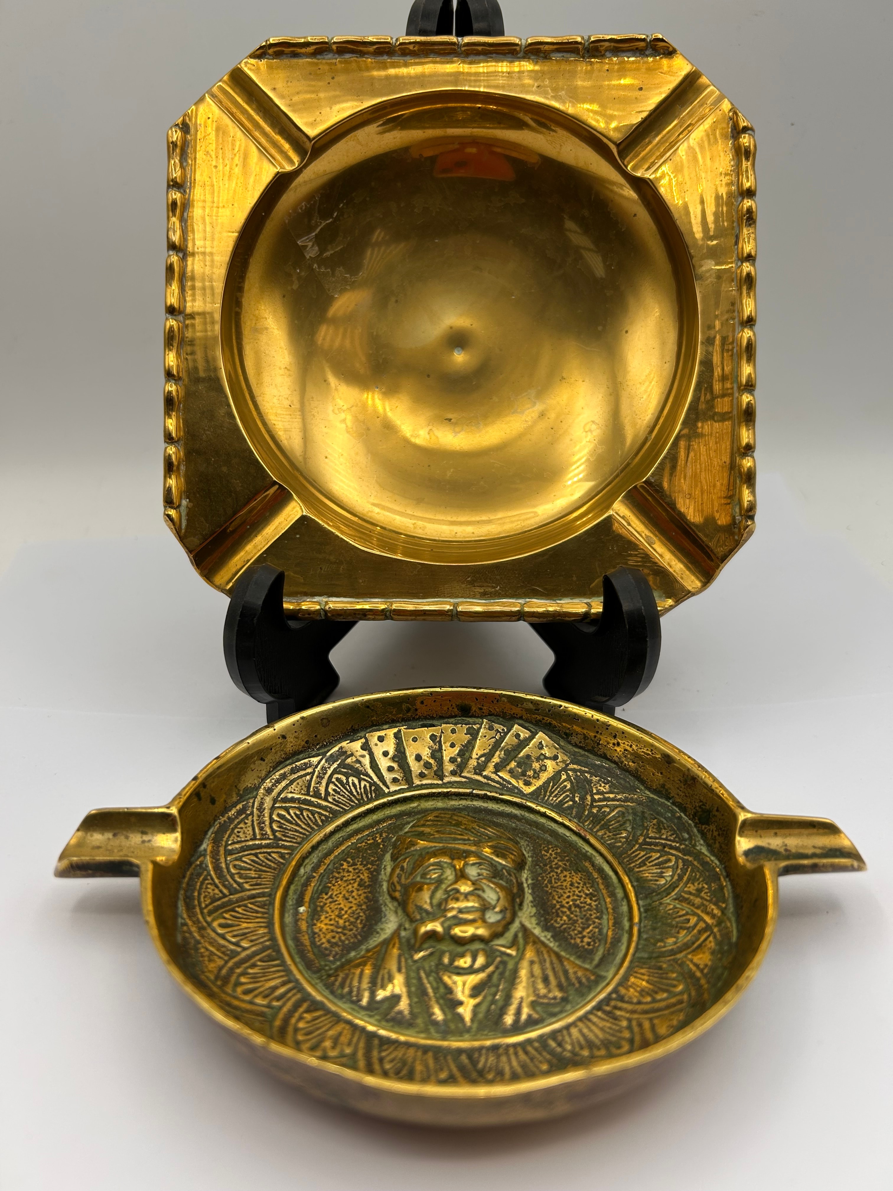 A pair of vintage brass ashtrays. The first is an octagonal ashtray with a circular central well and a geometric raised border. The second is a circular ashtray with two integrated cigarette rests, featuring a prominent central embossed relief depicting a man in a turban smoking a cigar, surrounded by intricate, stylized patterns suggesting a Middle Eastern or North African influence. Web intelligence suggests this piece may be of Indian origin and features Egyptian Revival style etching.