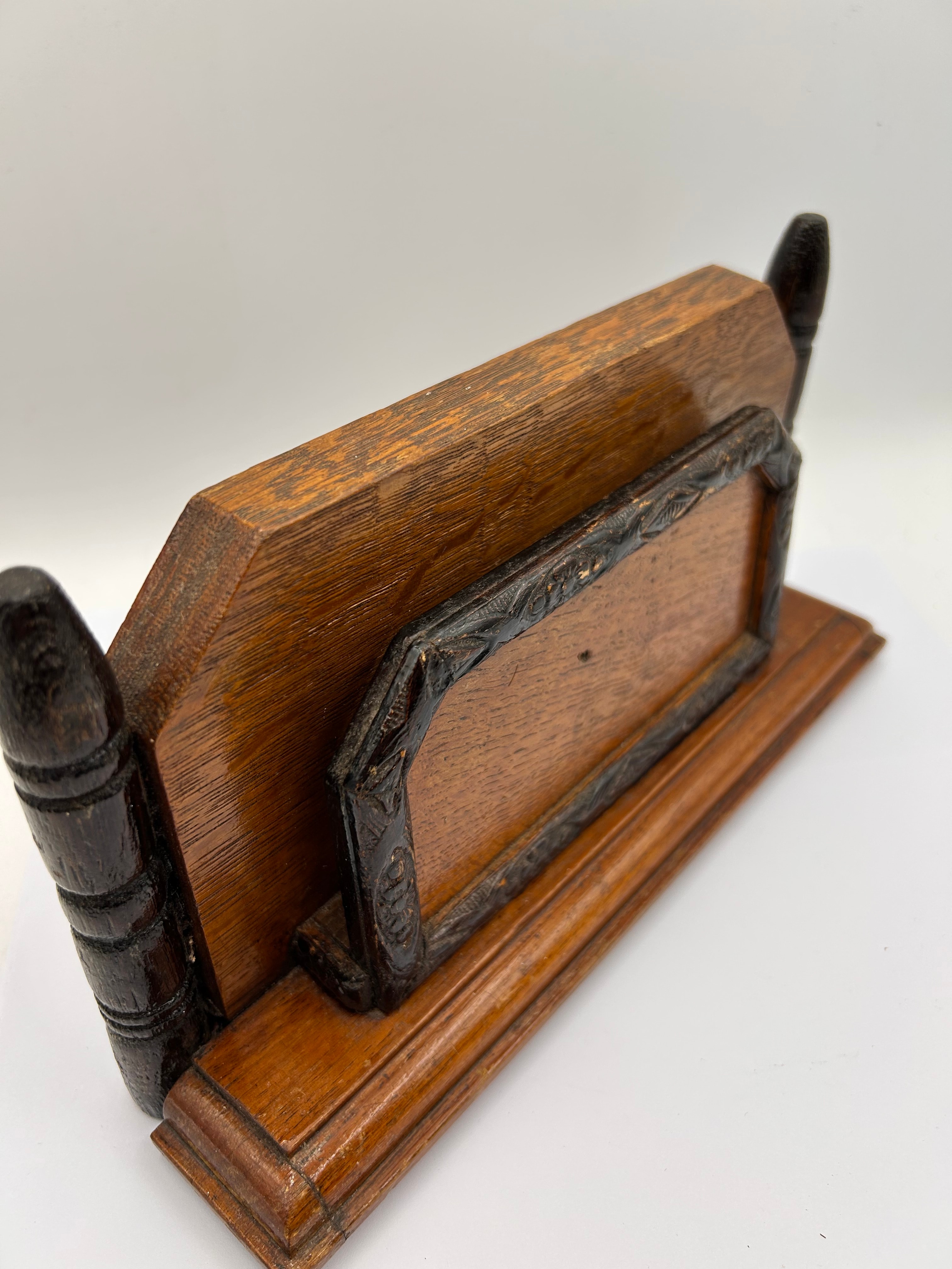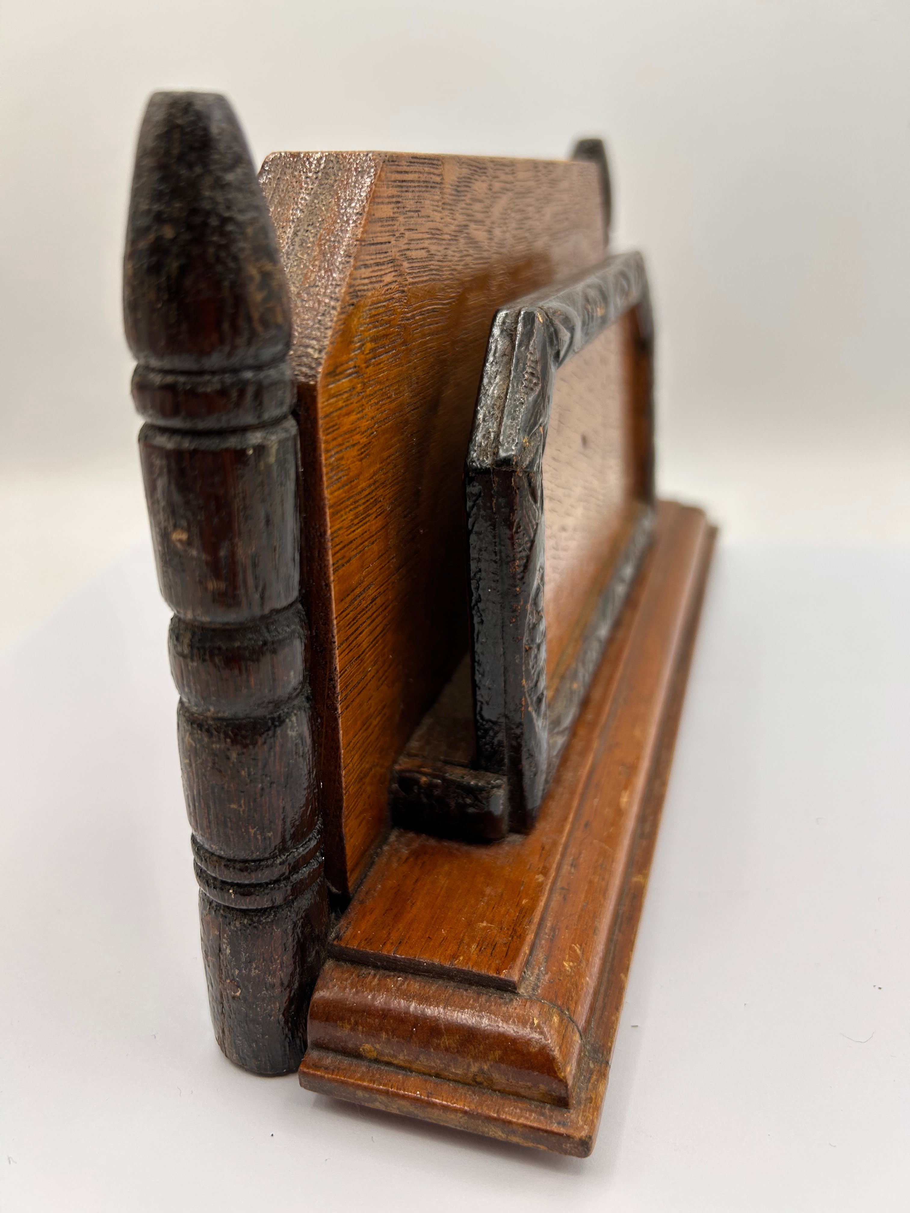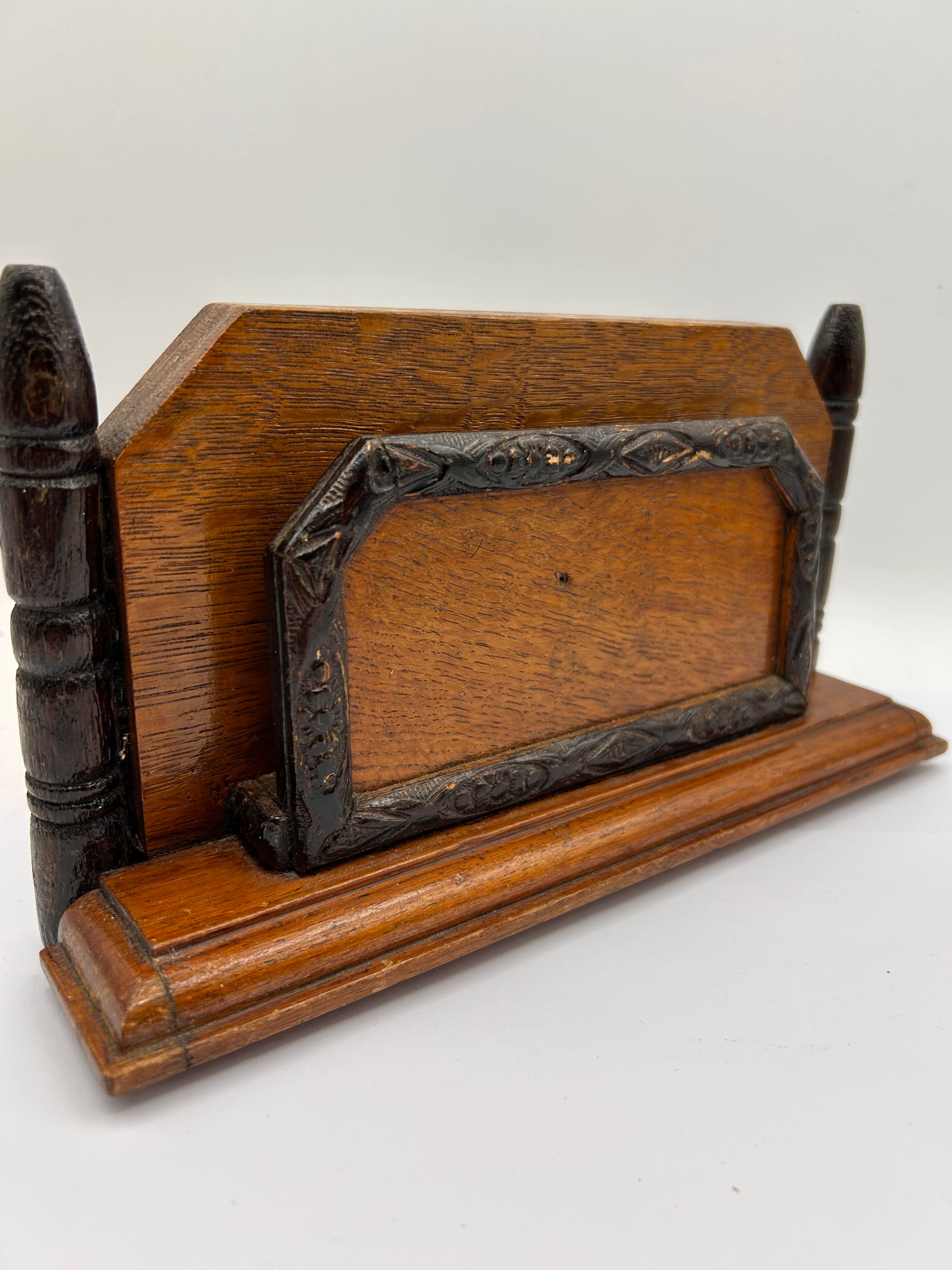 This item is an Edwardian-style wooden letter rack or business card holder. It features a medium-toned wood base and a taller back panel, likely oak or a similar hardwood, with a varnished finish. Decorative elements include a darker, possibly ebonized, carved wooden frame on the front, and two matching dark, turned vertical posts on either side of the back panel. No visible text, manufacturer’s marks, or labels are present.