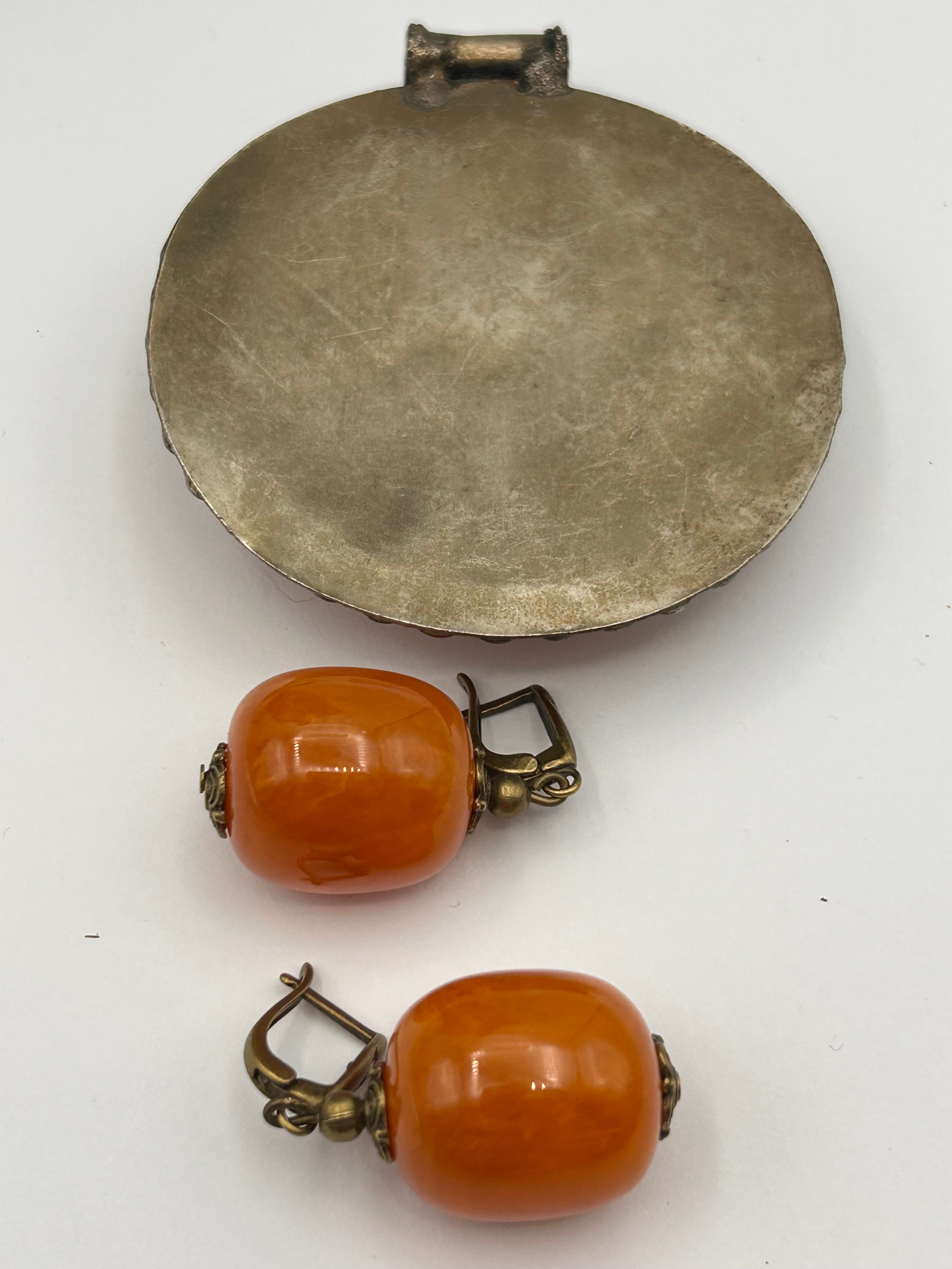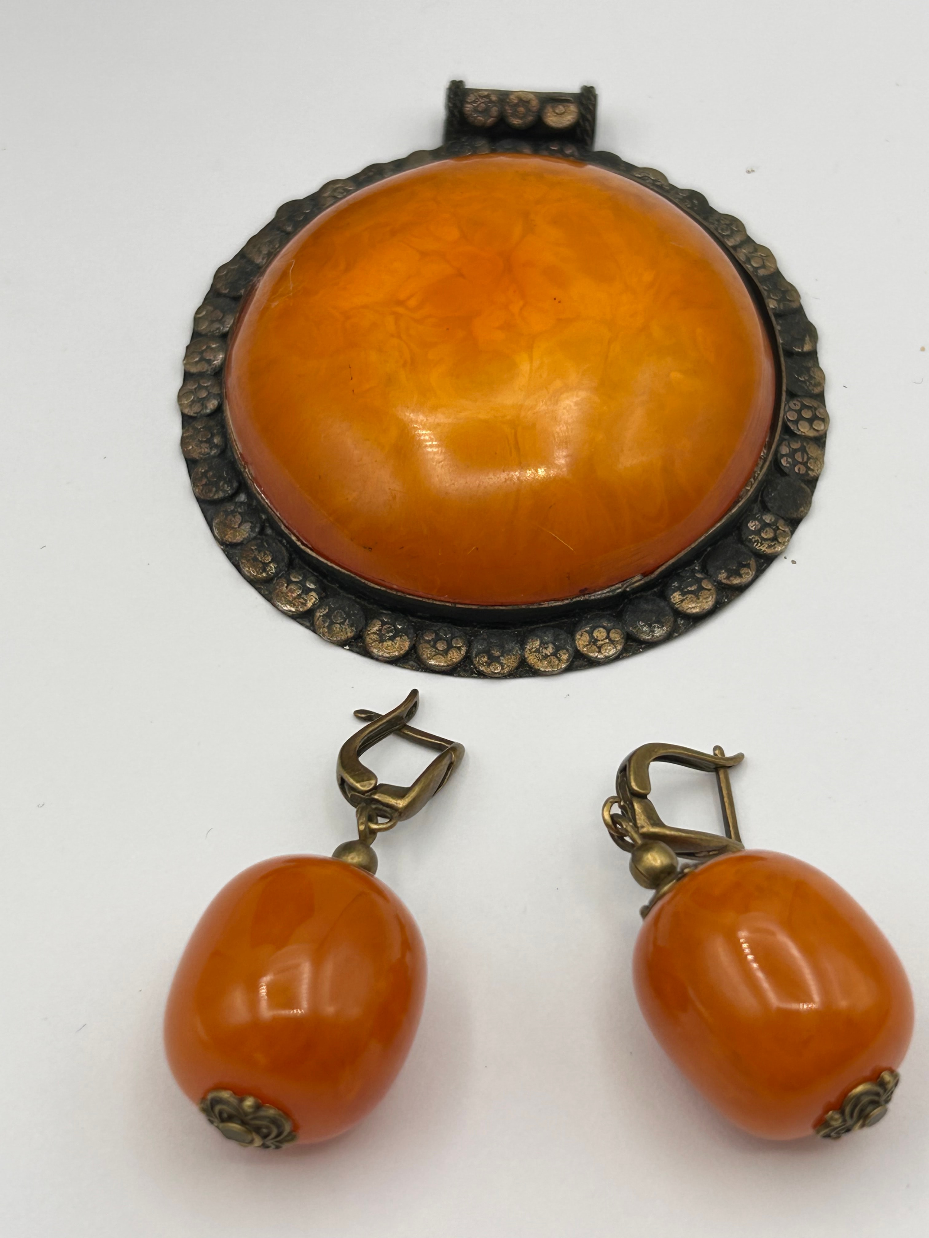 A two-piece vintage jewelry set, comprising a large pendant and a pair of matching dangle earrings. The pendant features a prominent, domed, opaque, orange-colored resinous or plastic material set within a circular, dark-toned base metal frame adorned with a textured, possibly floral or beaded, border. A simple bail is affixed to the top of the pendant, and its reverse reveals a plain, aged silver-tone metal backing. The earrings each consist of a single, elongated oval bead of the same orange material, capped with decorative dark-toned metal elements, suspended from a hinged, lever-back ear wire of similar metal. The metal components appear to be a base metal with an antiqued finish. No visible text, hallmarks, or other identifying markings are discernible on any of the pieces.