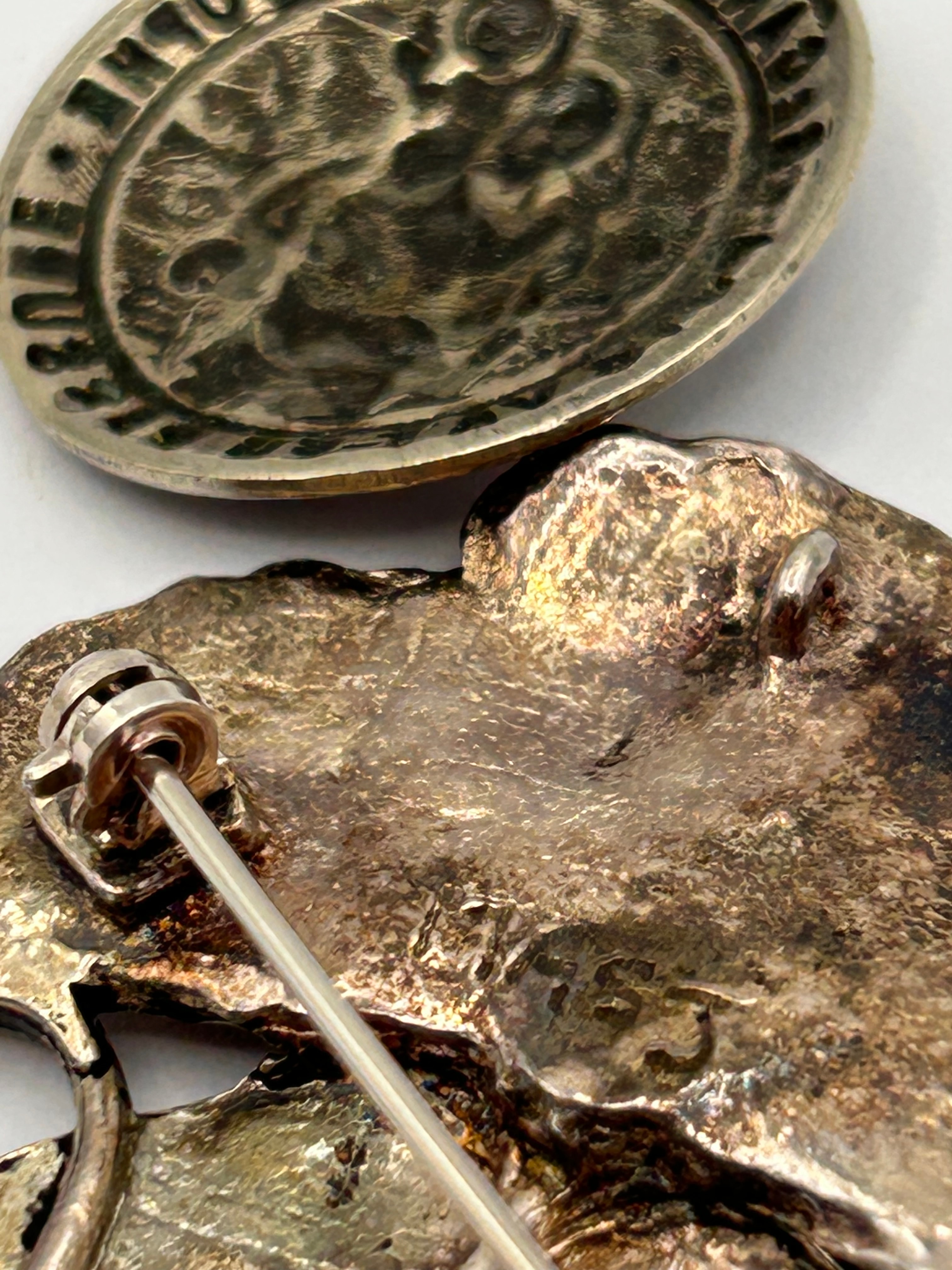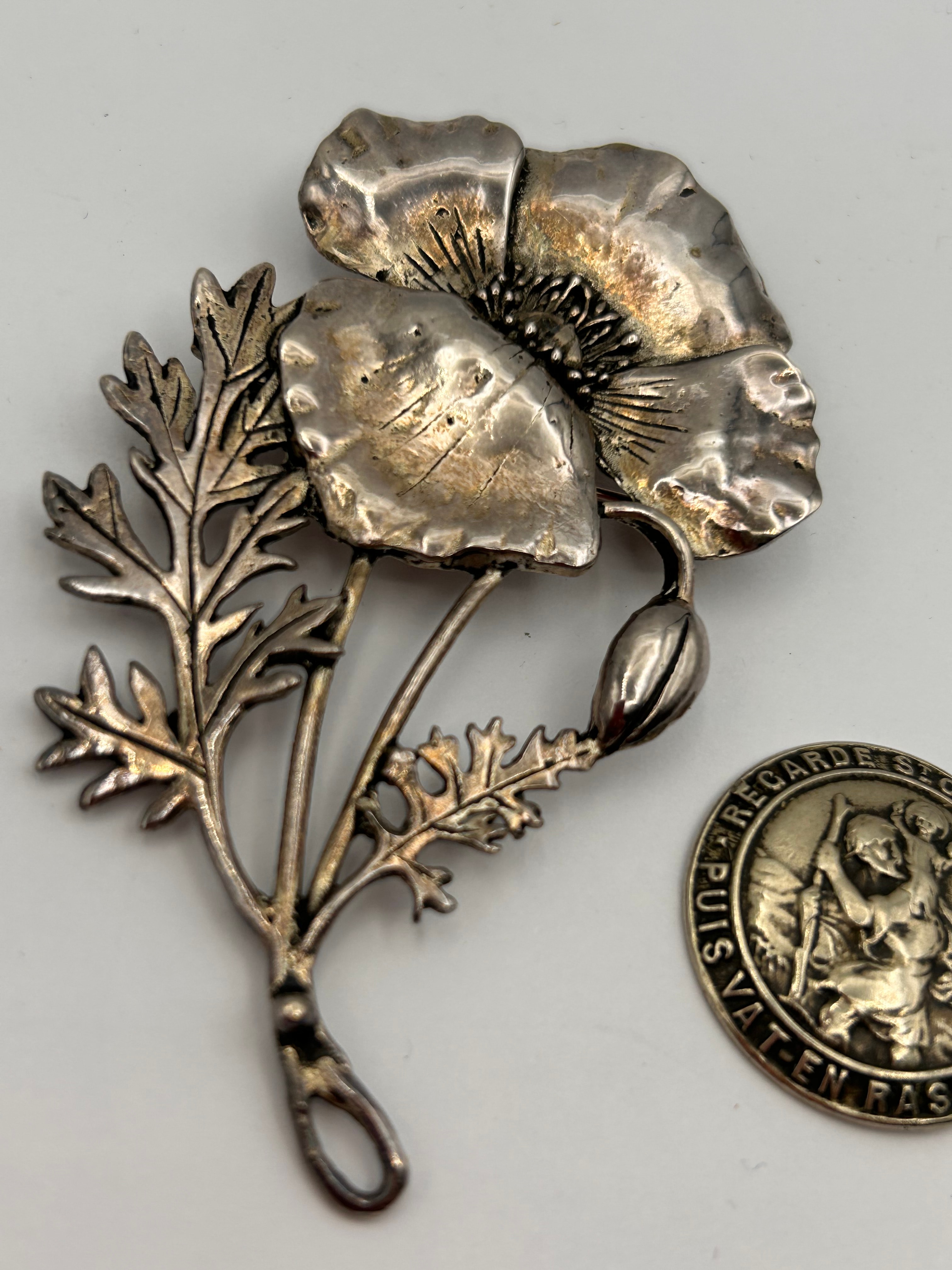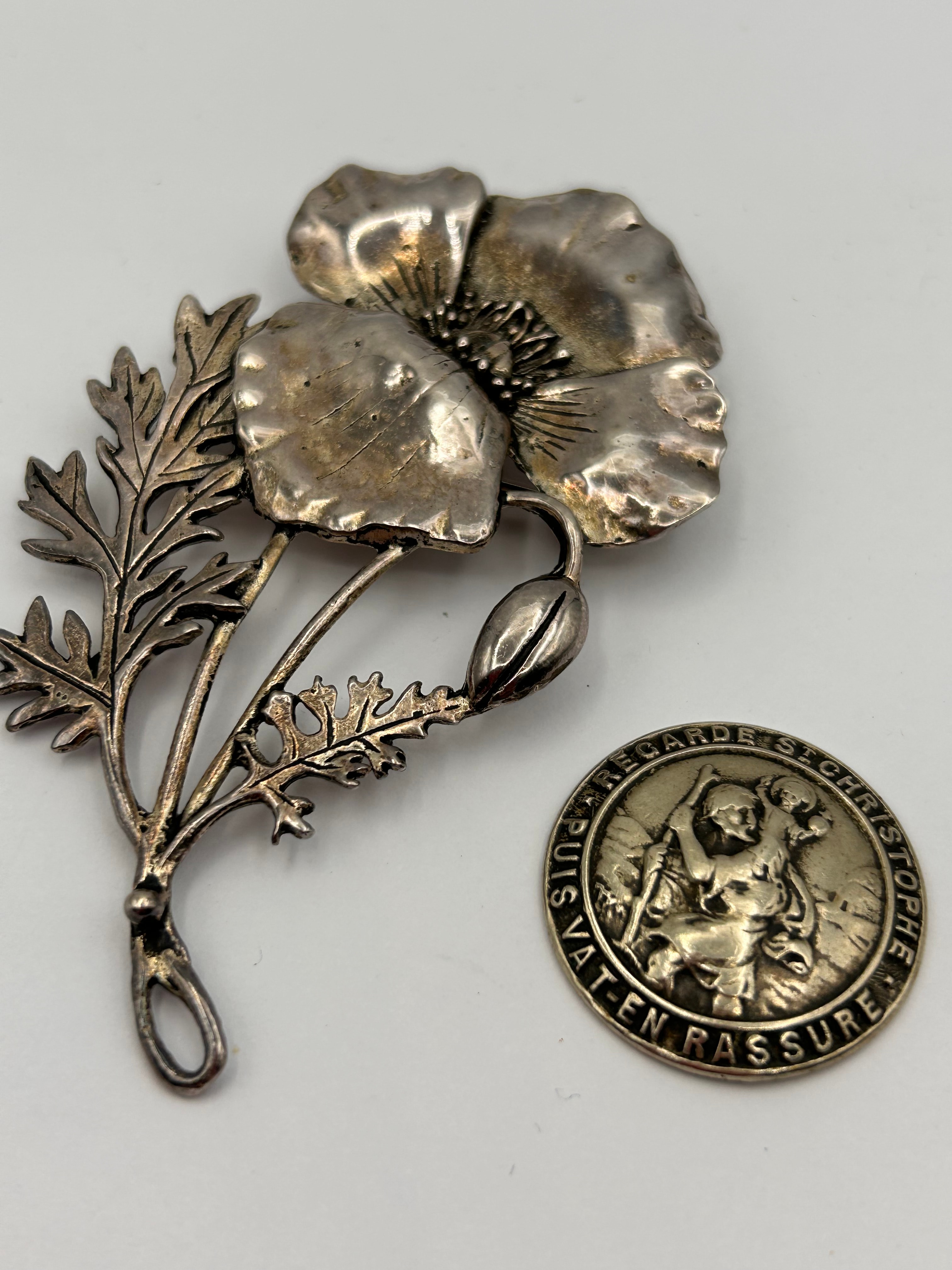 A pair of items crafted from silver-toned metal, comprising an Art Nouveau style poppy brooch and a Saint Christopher medal. The brooch features a naturalistic depiction of a poppy plant, complete with two opened blossoms, a bud, and textured leaves, secured by a standard pin-back fastening. The accompanying circular medallion, likely a religious travel medal, prominently displays a relief image of Saint Christopher carrying a child across water, encircled by the French inscription “REGARDE ST CHRISTOPHE PUIS VAT-EN RASSURE,” which translates to “Look at Saint Christopher, then go reassured.”