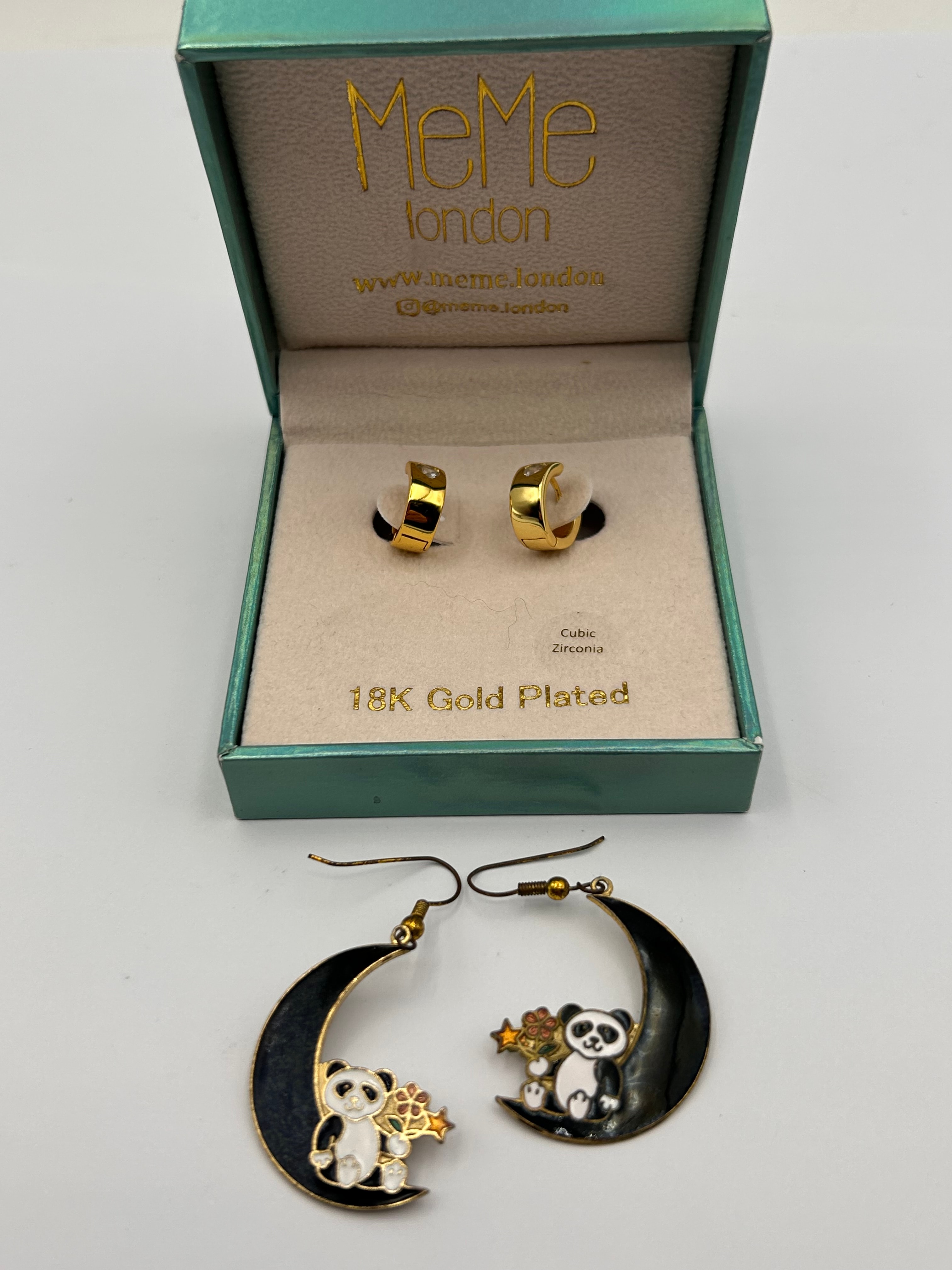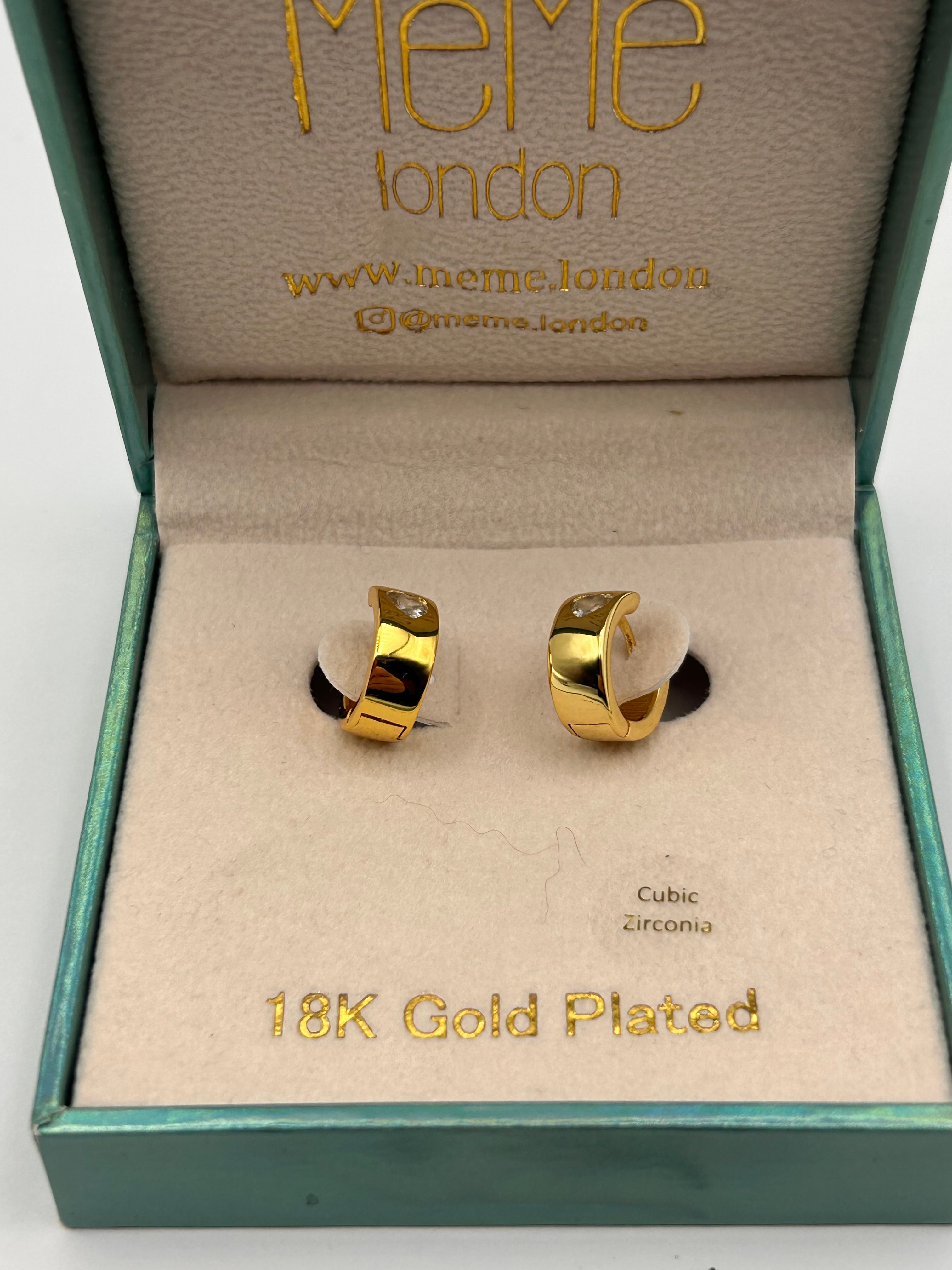 A pair of MeMe London 18K gold plated hoop earrings, each set with a single cubic zirconia stone. Presented in their original teal and cream branded box, which further specifies ‘www.meme.london’ and ‘@meme.london’.