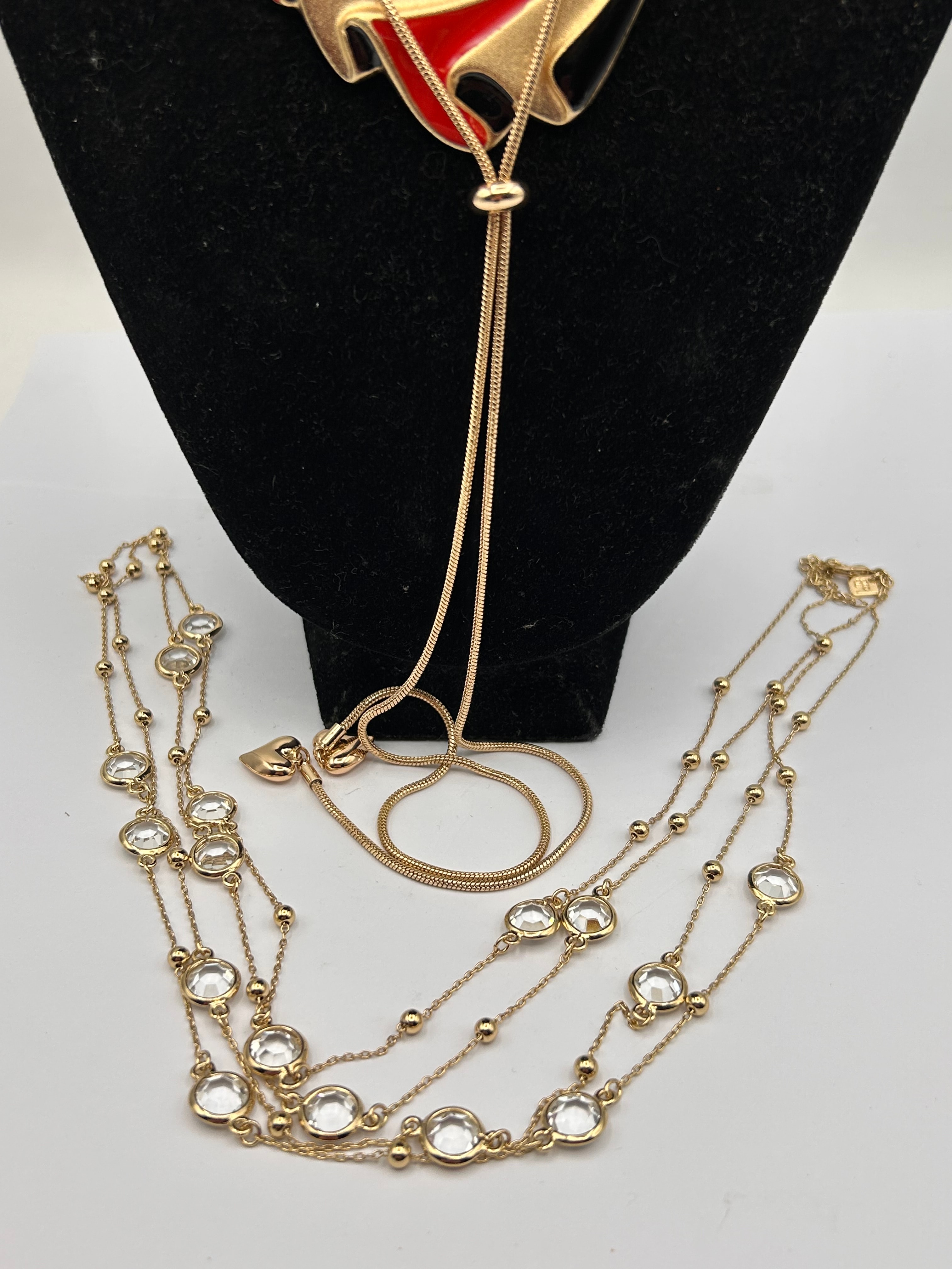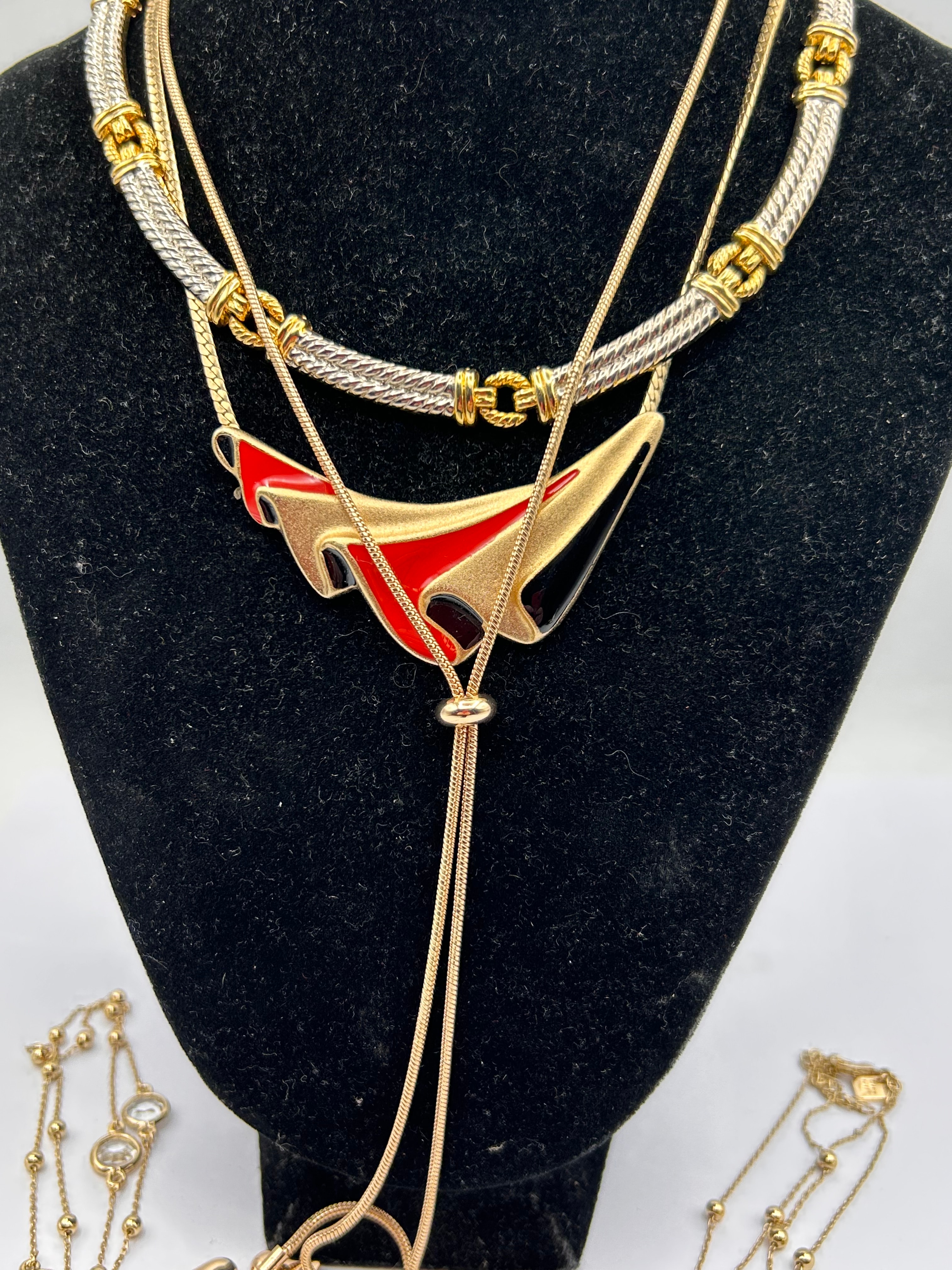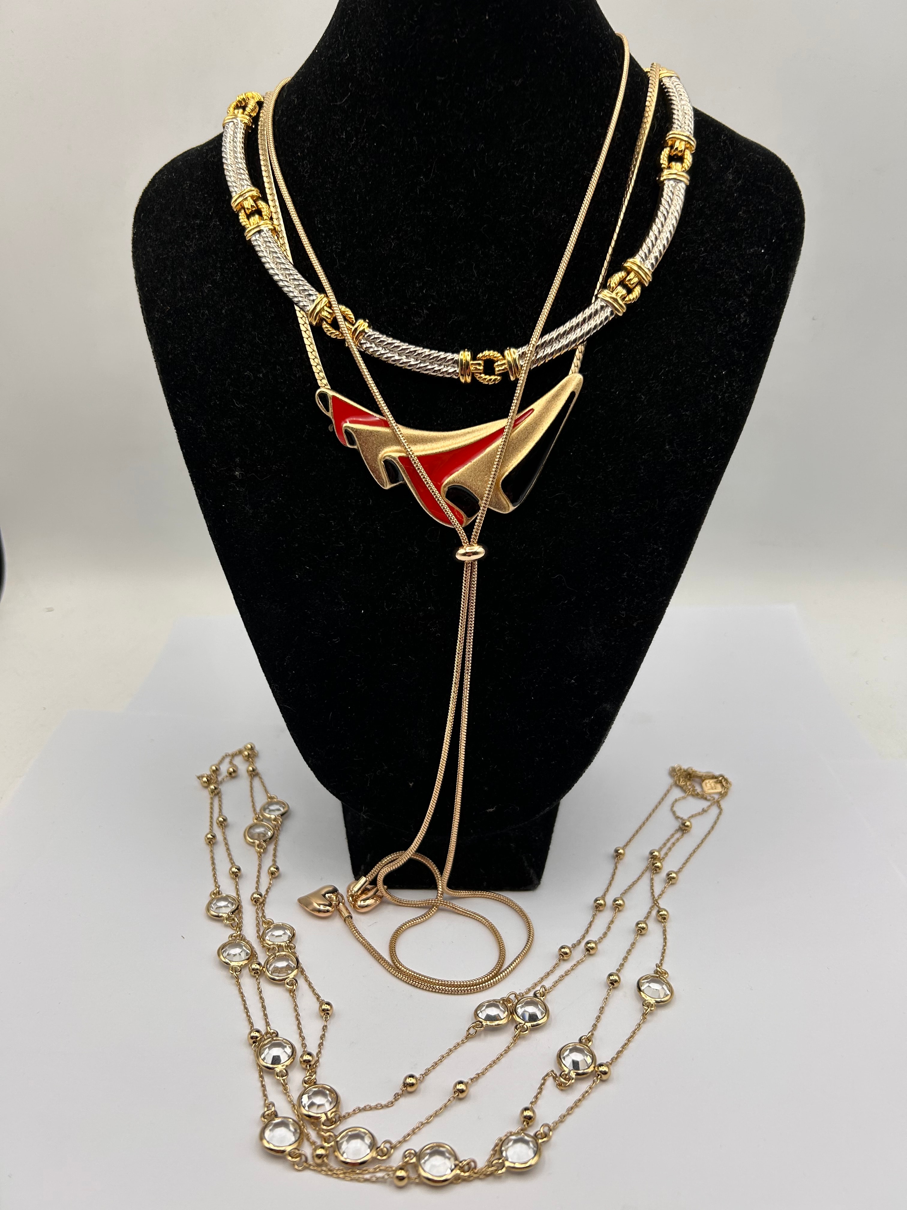 A group of four contemporary costume necklaces. The lot includes a two-tone choker-style necklace featuring braided silver-tone segments linked with gold-tone accents. Layered below is a long gold-tone snake chain necklace with an adjustable slider, suspending an abstract, geometric pendant detailed with red and black enamel against a gold-tone base. Also present are two additional long gold-tone chain necklaces, each adorned with evenly spaced, bezel-set clear faceted stones and small gold-tone beads. The collective style is consistent with mid-to-late 20th century or early 21st century fashion jewelry. No discernible manufacturer’s marks or hallmarks are visible.