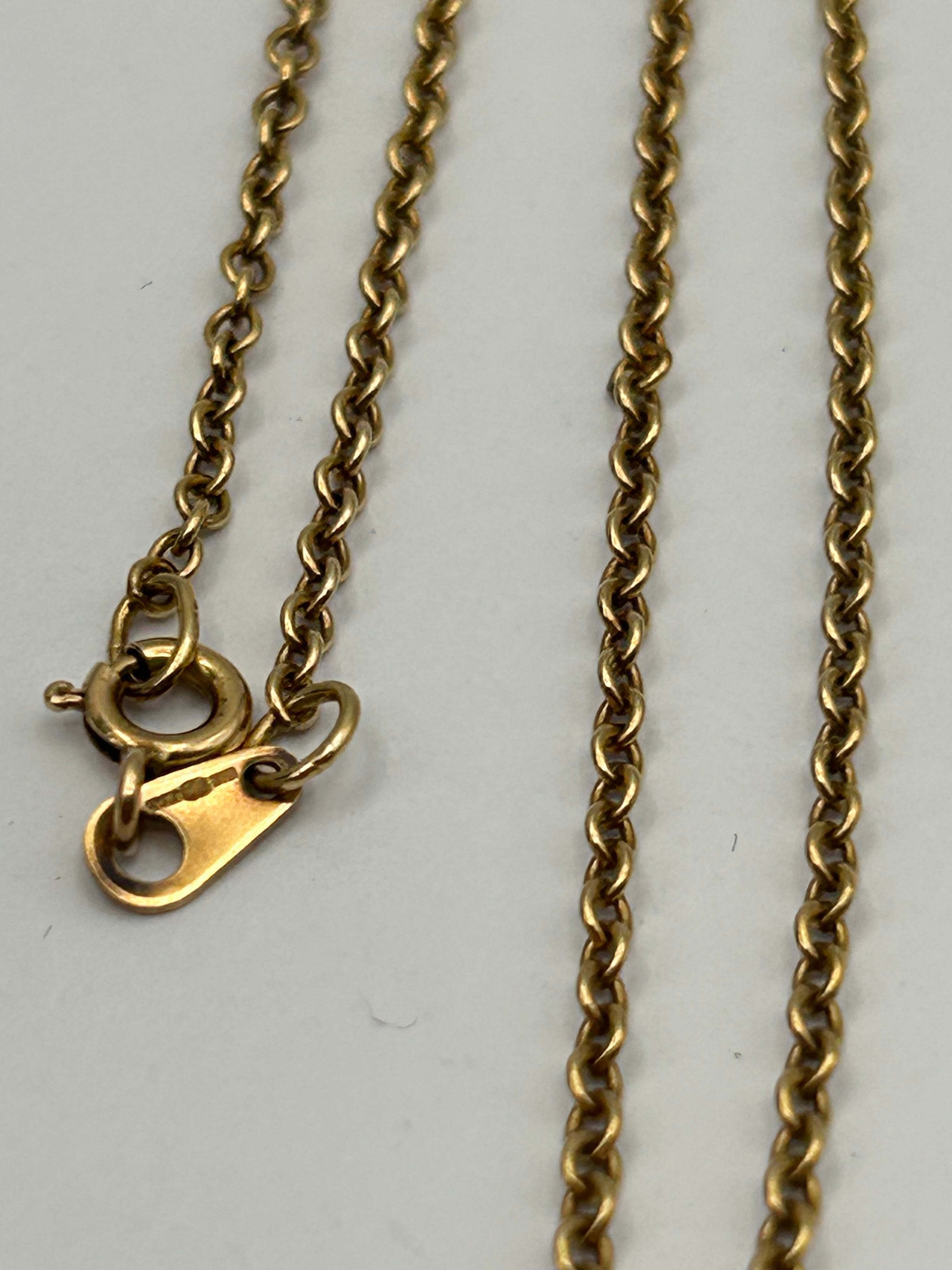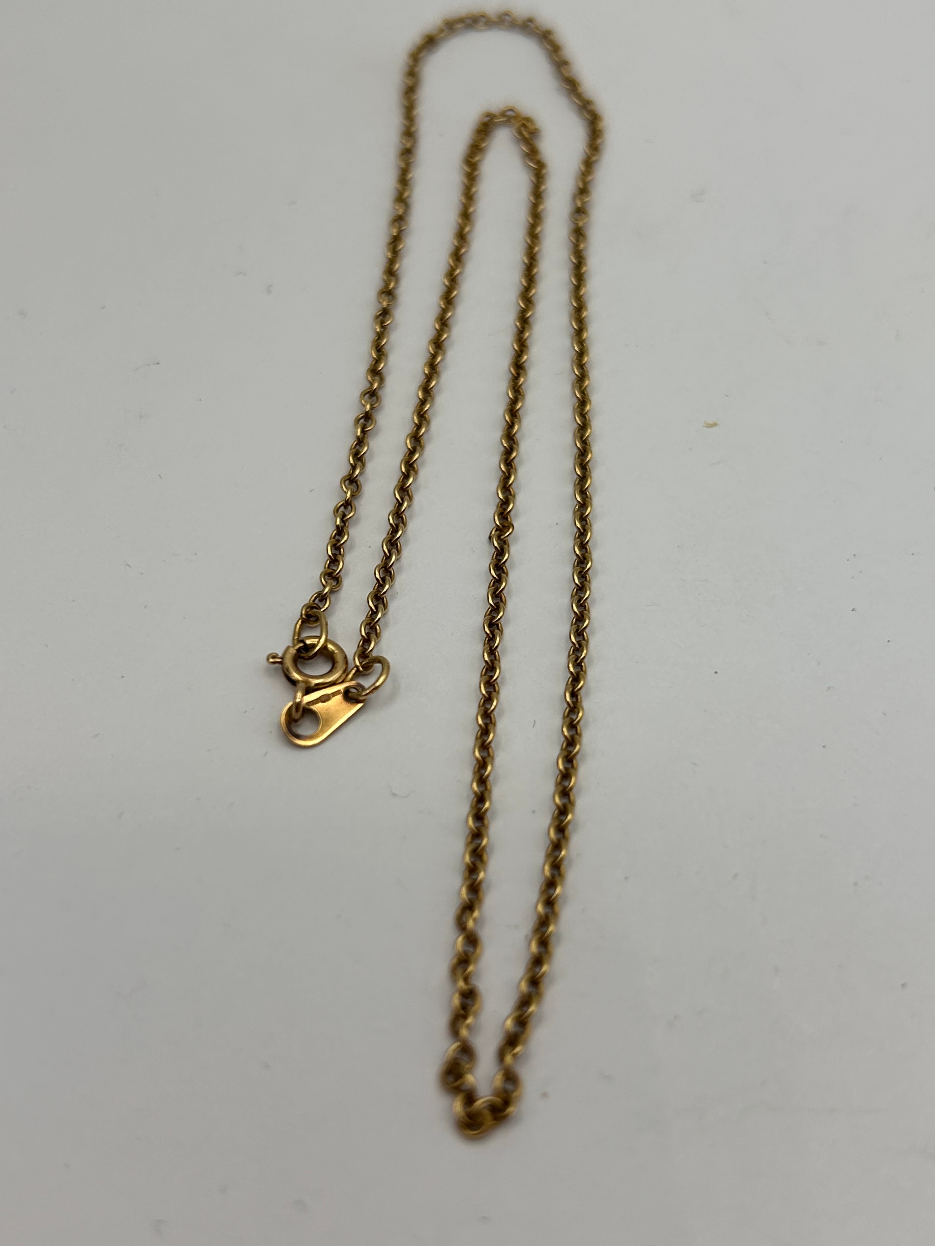 A 9ct gold cable chain necklace, featuring small, uniform links and secured with a spring ring clasp. The metal displays a uniform yellow luster. No legible text, hallmarks, or maker’s marks are discernible on the clasp or the small attached tag.