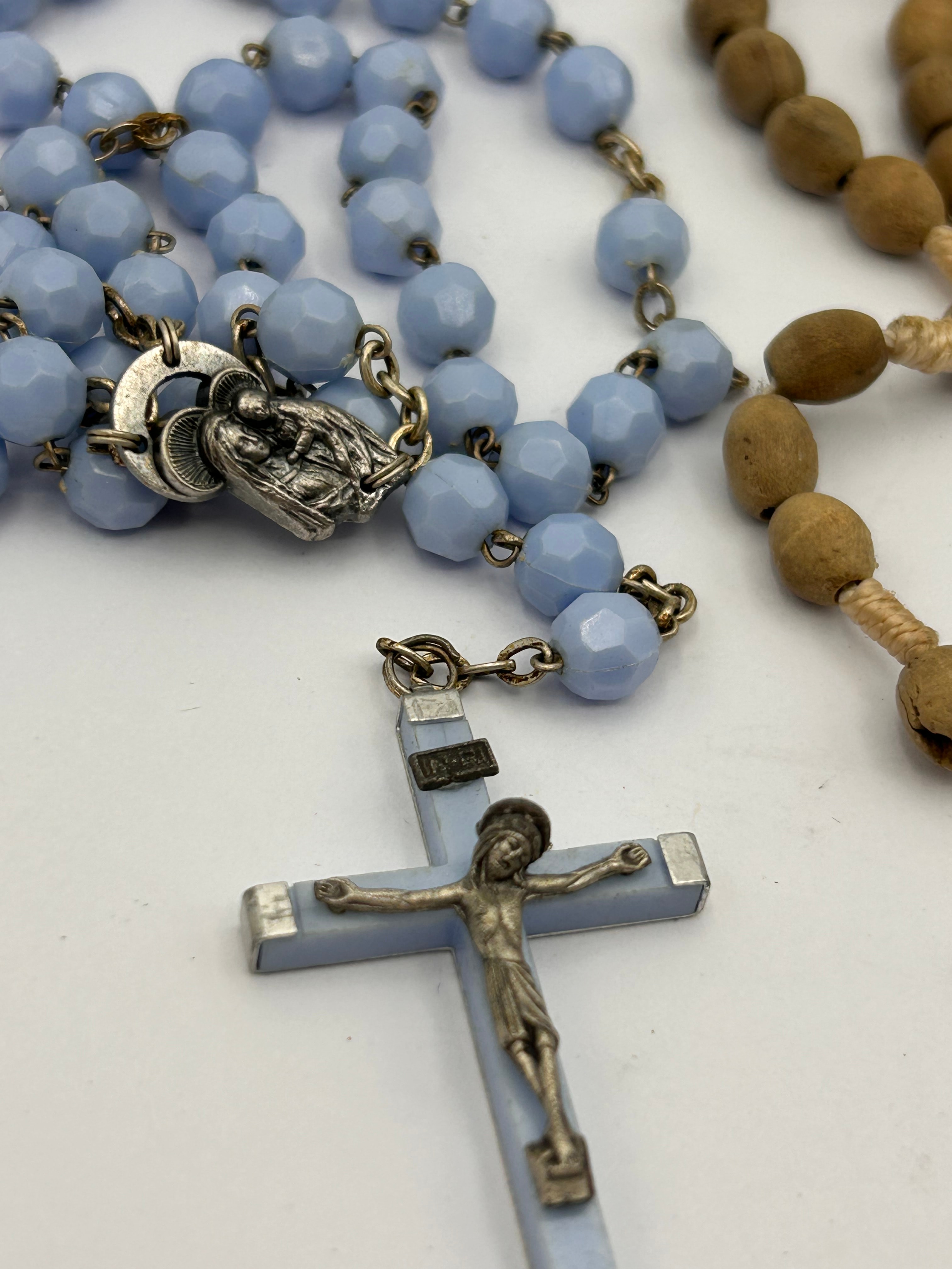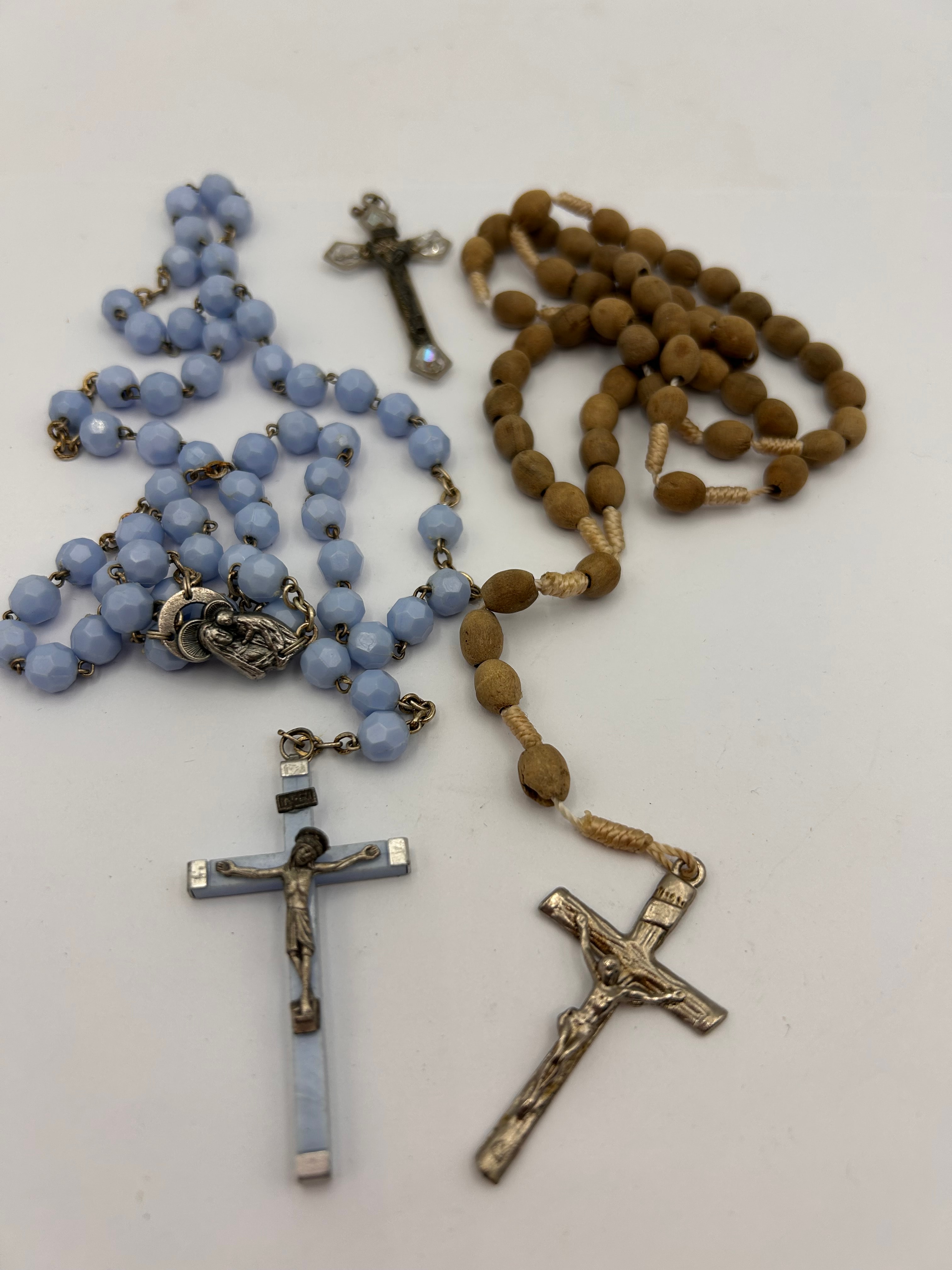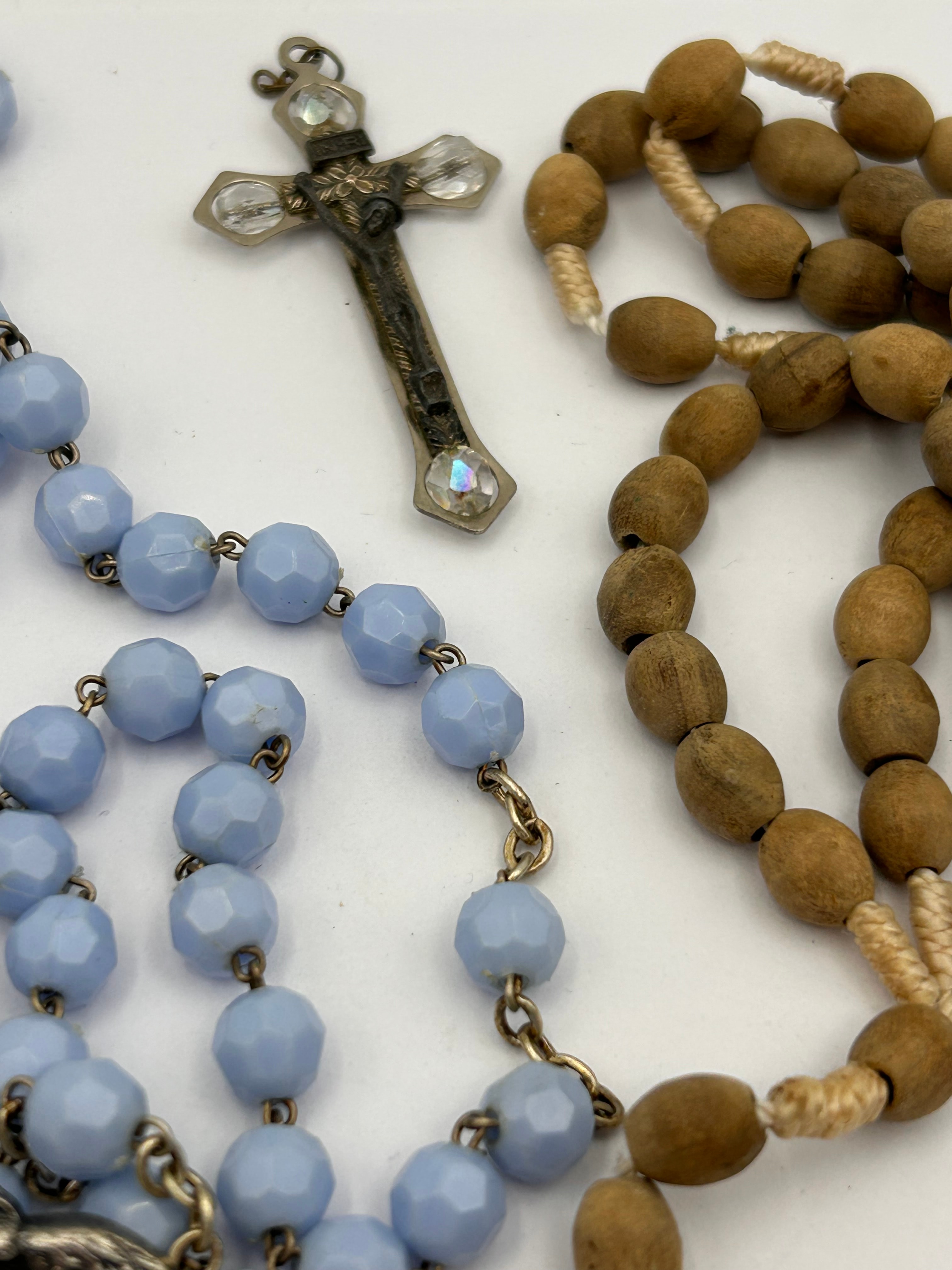This lot presents a group of religious devotional items, comprising two rosaries and two loose crucifixes. One rosary features light blue faceted beads on a silver-toned chain, complete with a Marian medal and a crucifix. The second rosary is crafted with brown wooden beads strung on natural cord, terminating in a metal crucifix. The two additional crucifixes include a darkened metal cross embellished with clear crystals, and a silver-toned corpus mounted on a light blue-inlaid cross with metal caps. Both crucifixes featuring corpora prominently display the Latin inscription ‘INRI’ (Iesus Nazarenus Rex Iudaeorum – Jesus of Nazareth, King of the Jews). The items are composed of varying materials, including glass or plastic, wood, and base metals, and appear to be of varying ages.