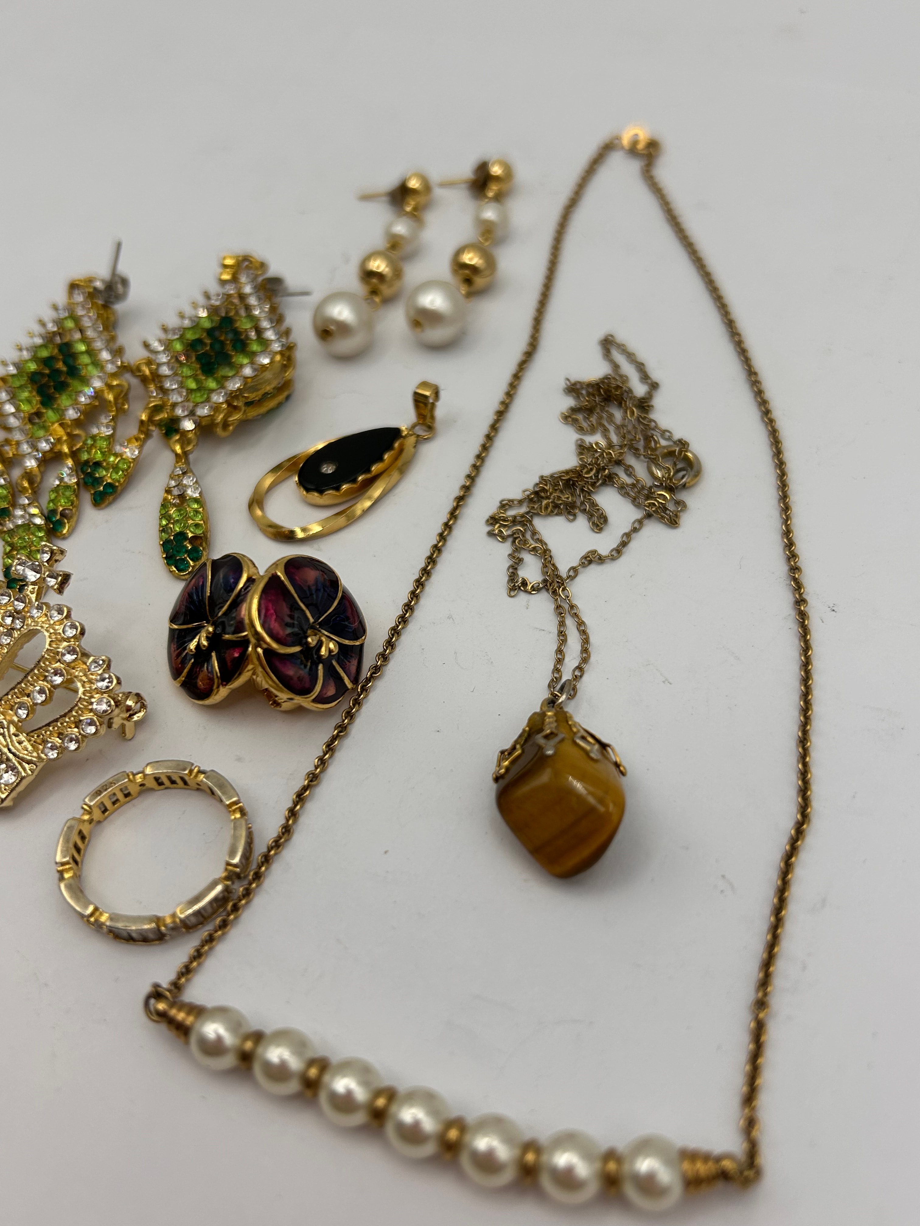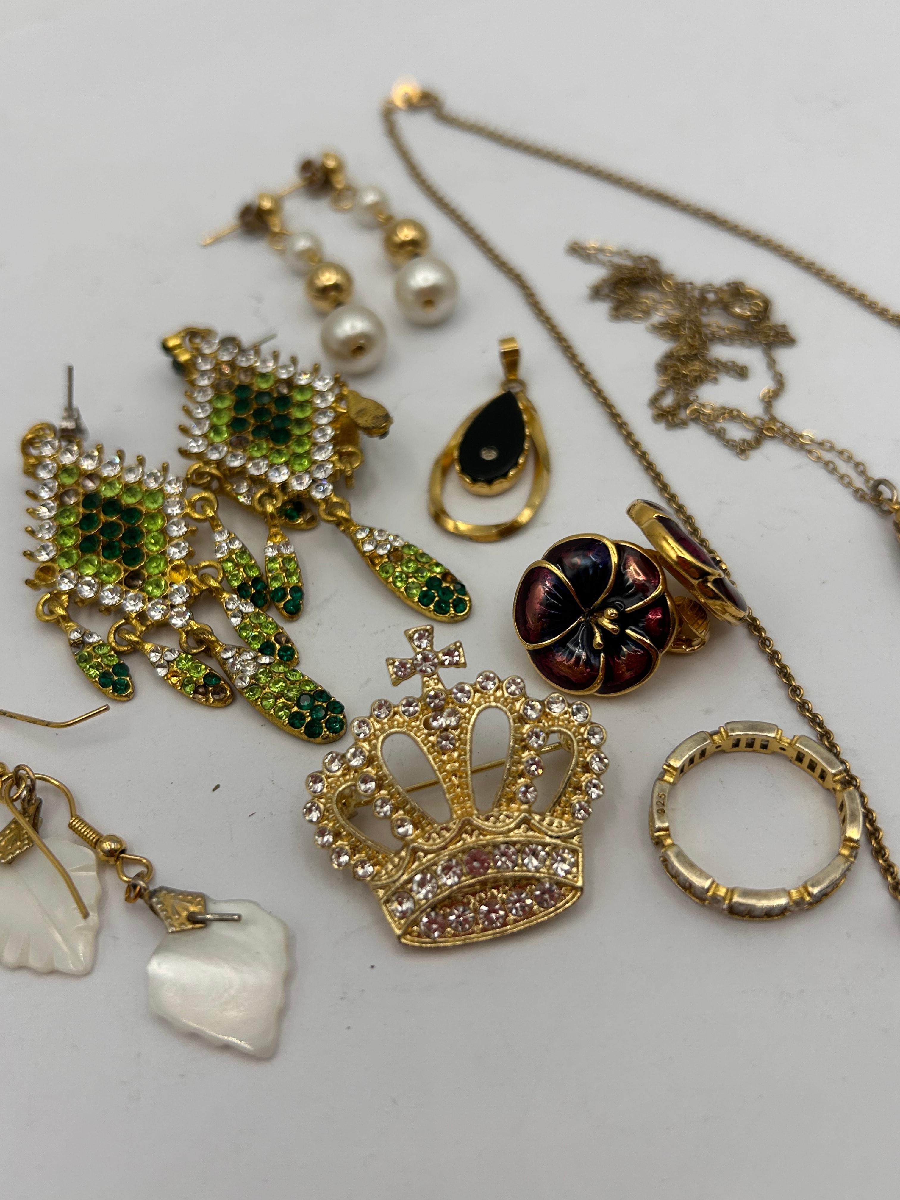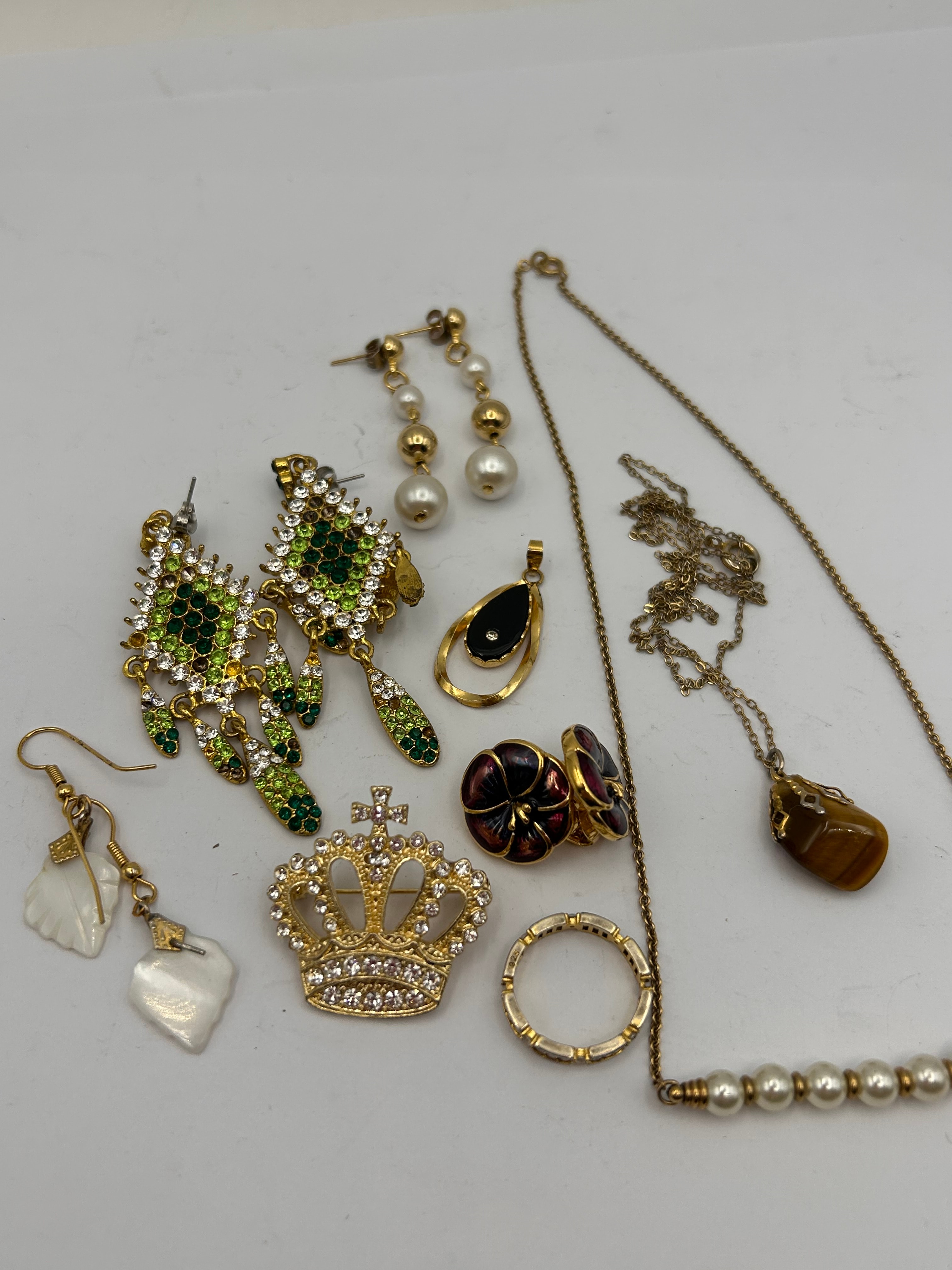 A collection of assorted vintage and estate costume jewelry, predominantly crafted from gold-tone metal. The group includes multiple pairs of dangle earrings: one set ornate with green and clear rhinestones, another featuring graduated imitation pearls, and a third with carved white mother-of-pearl or shell elements. Two necklaces are present, one a long chain with a section of imitation pearls, and another with a faceted brown stone pendant resembling tiger’s eye. Additional items include a black teardrop-shaped pendant, a gold-tone crown-shaped brooch lavishly set with clear rhinestones and a cross, a gold-tone band ring with channel-set clear accents, and a pair of dark enamel floral-motif items, possibly clip-on earrings or cufflinks.