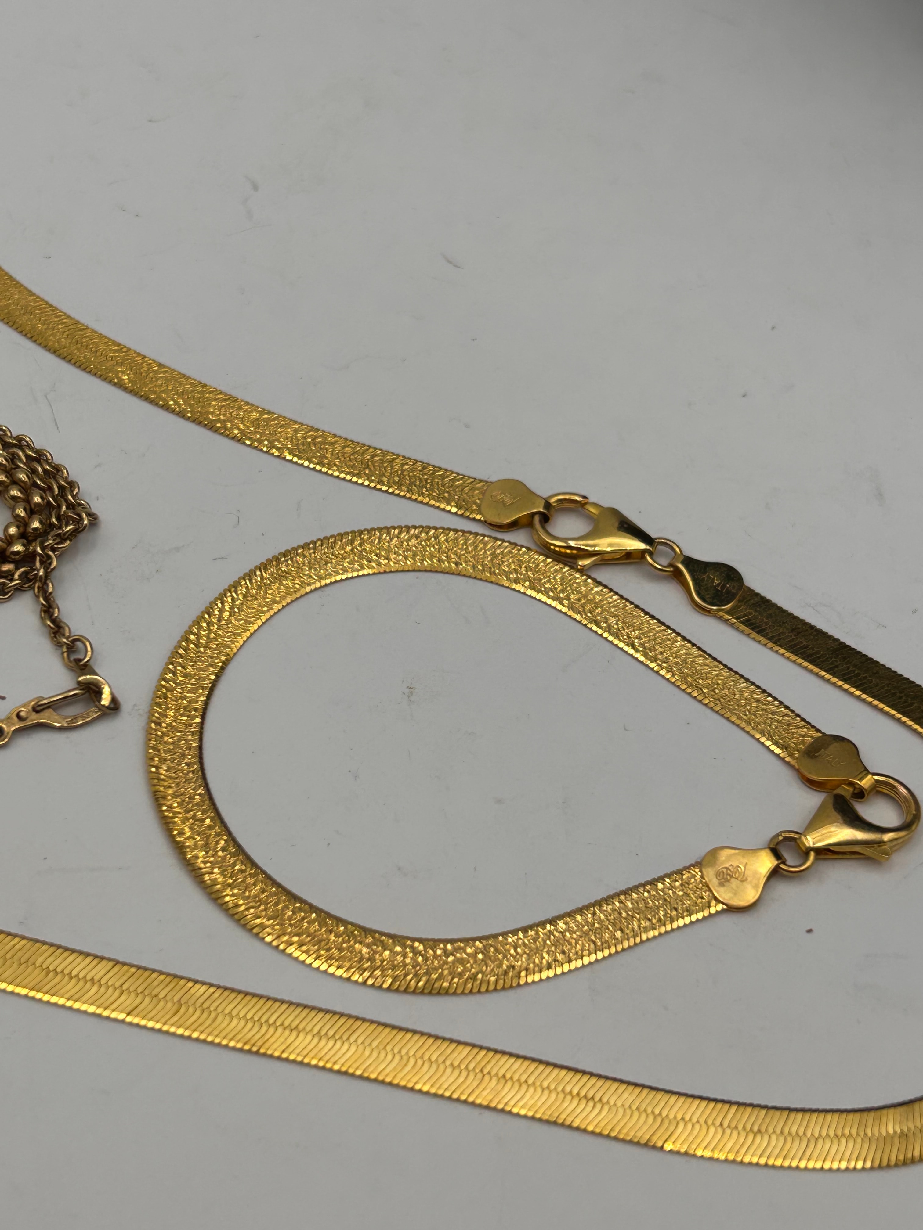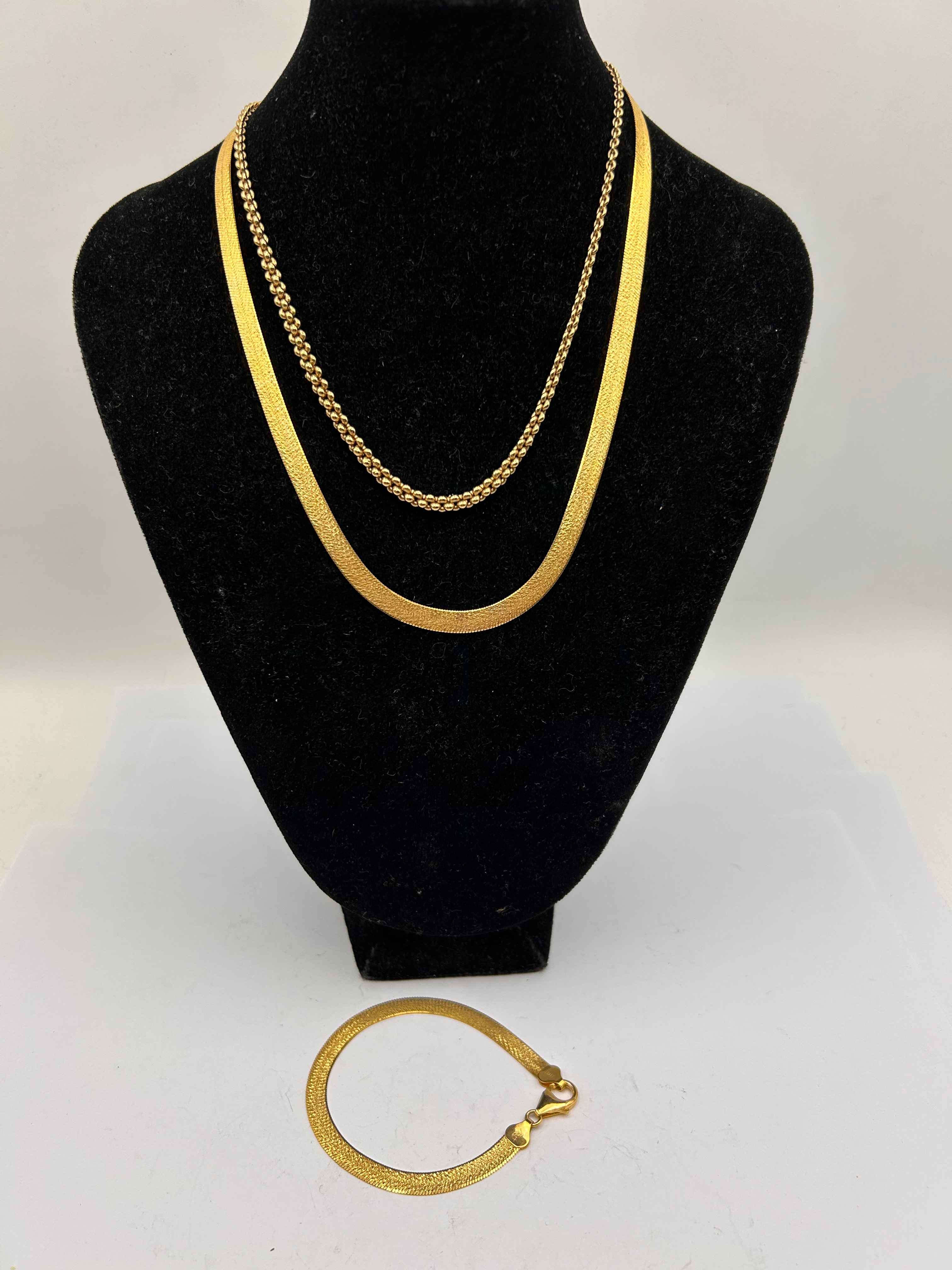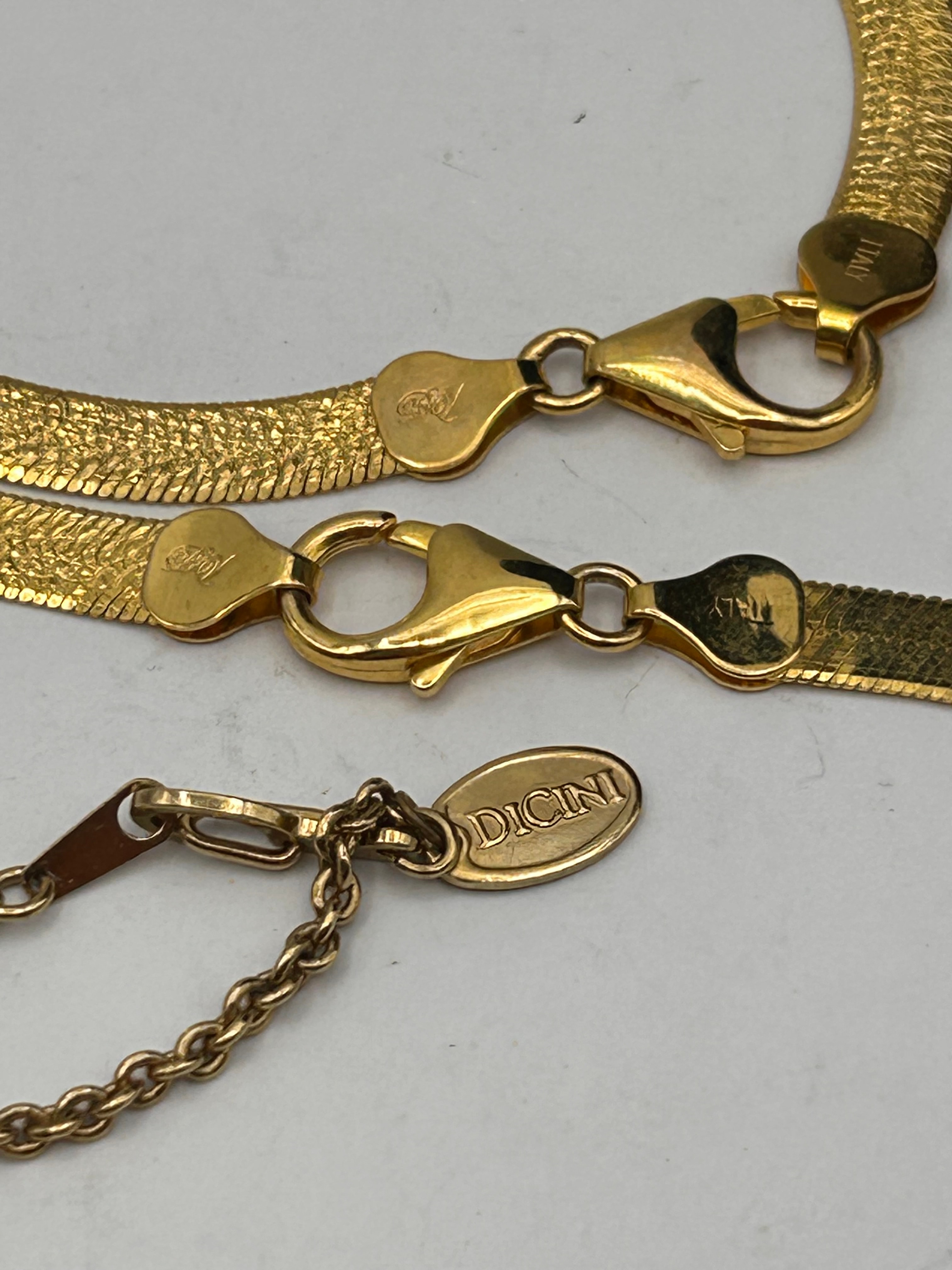 A three-piece gold-toned metal jewelry set, comprising two necklaces and one bracelet. One necklace and the bracelet feature a wide, flat, flexible herringbone-style chain, each stamped ‘ITALY’ on the clasp tabs. The second necklace is a finer, rounder popcorn-style chain, featuring an oval hang tag engraved with ‘DICINI’.