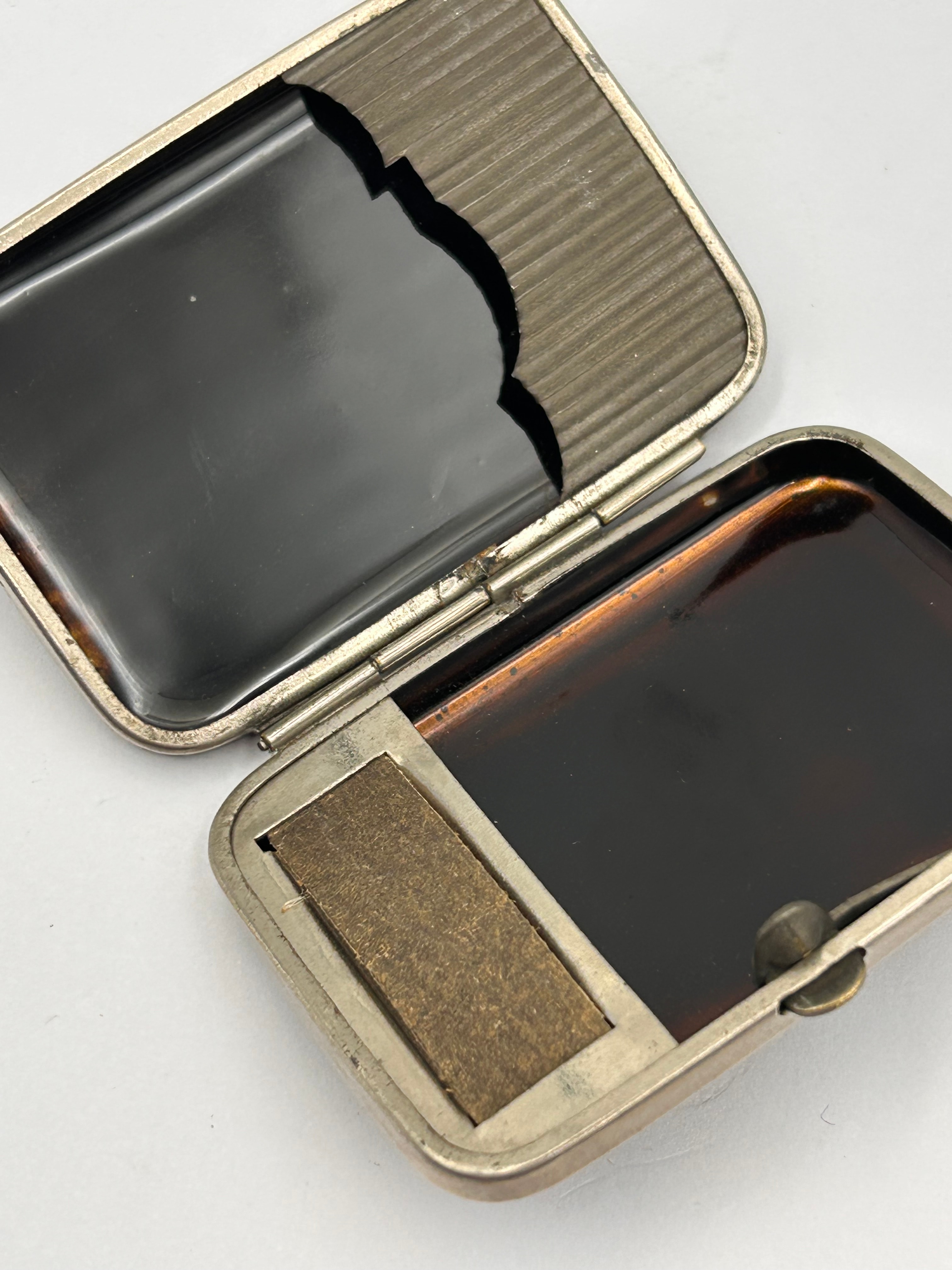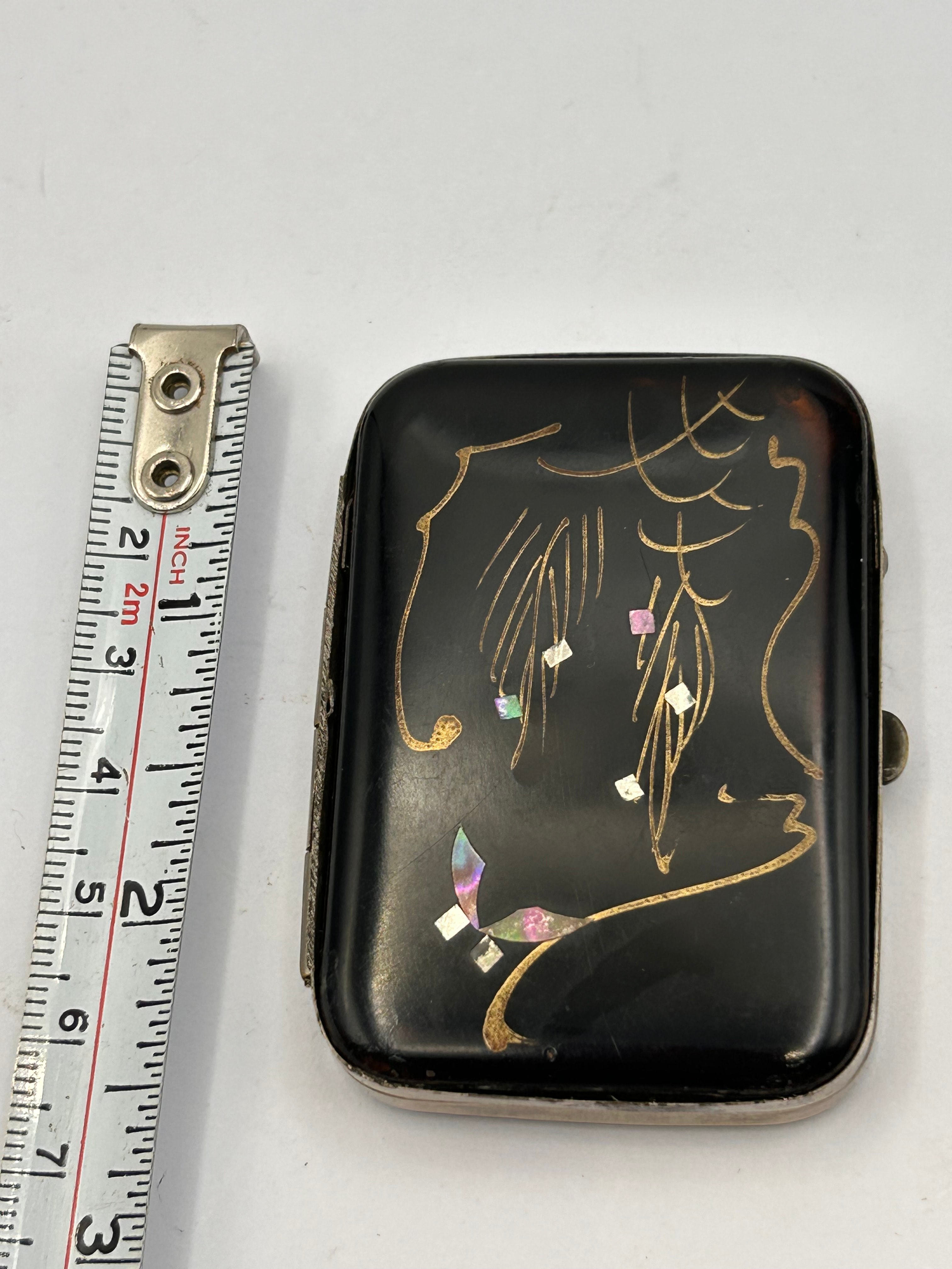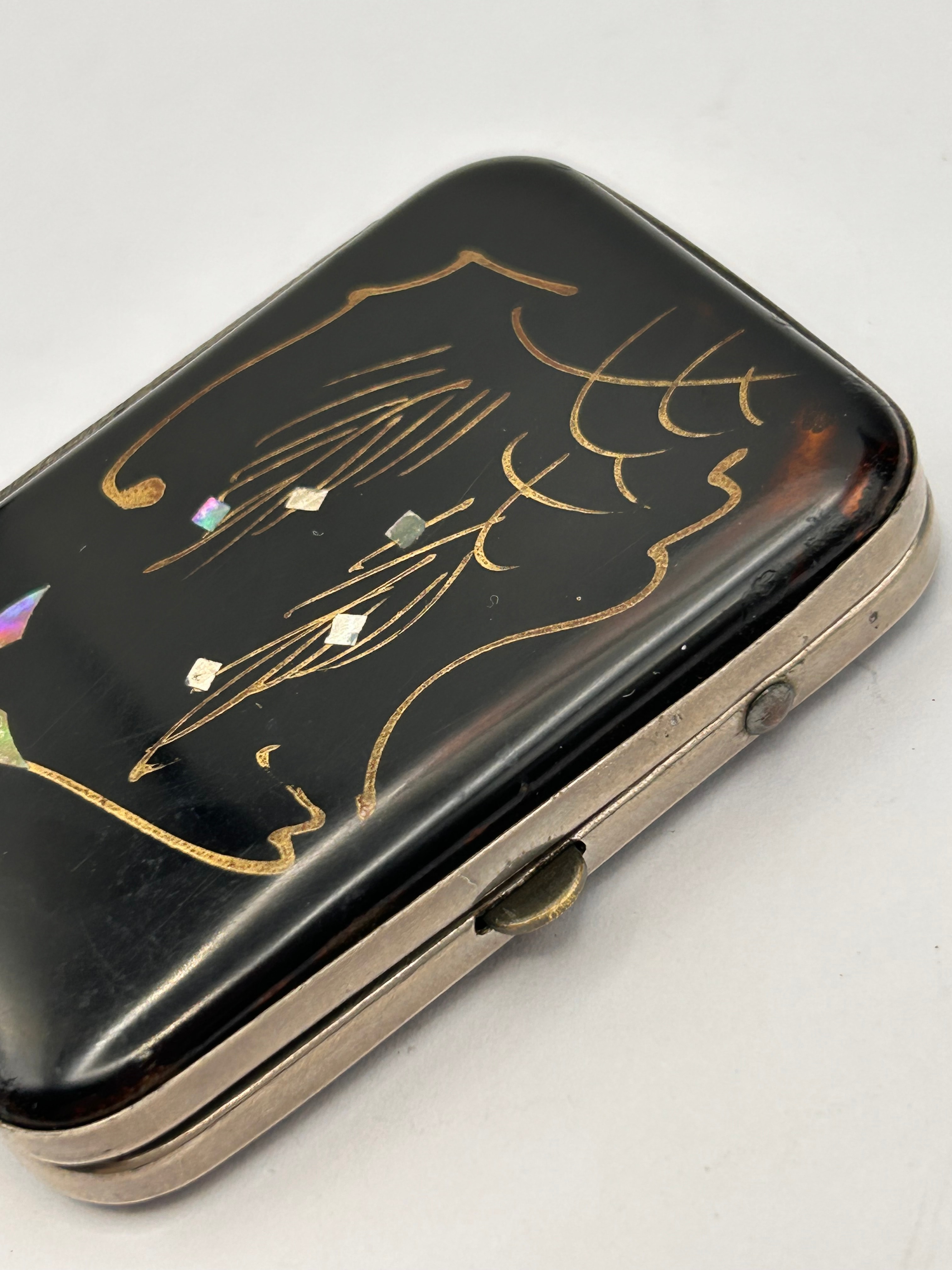A vintage Japanese vesta case. This small, rectangular, hinged case features dark, glossy exterior panels, likely celluloid or a resin imitation of tortoise shell, adorned with a stylized design in delicate gold paint and iridescent mother-of-pearl or abalone shell inlay. The design appears to depict flowing lines or a natural motif, suggesting an East Asian aesthetic. The case is constructed with a silver-toned metal frame, hinge, and interior components, including a spring-loaded retention bar.