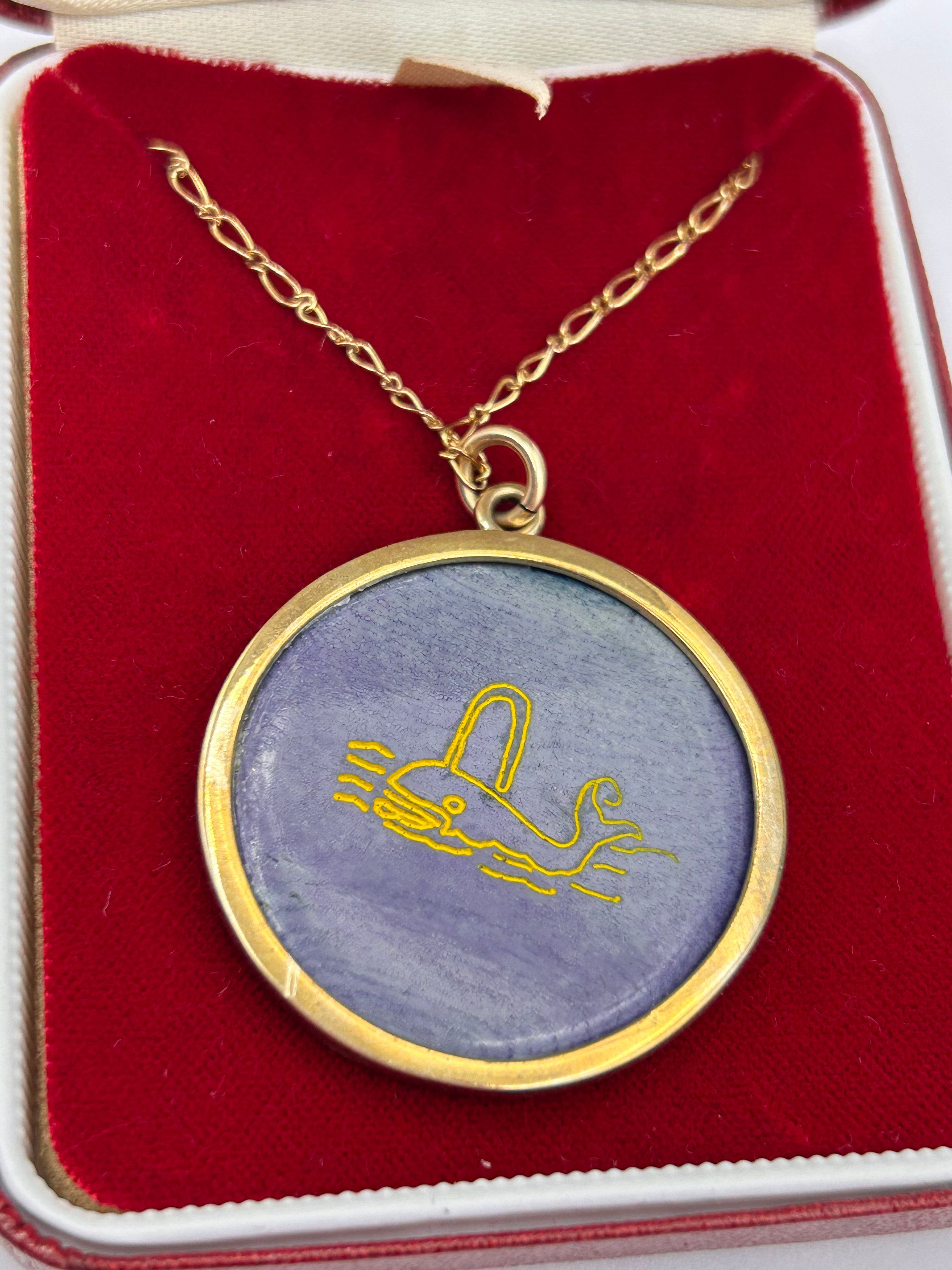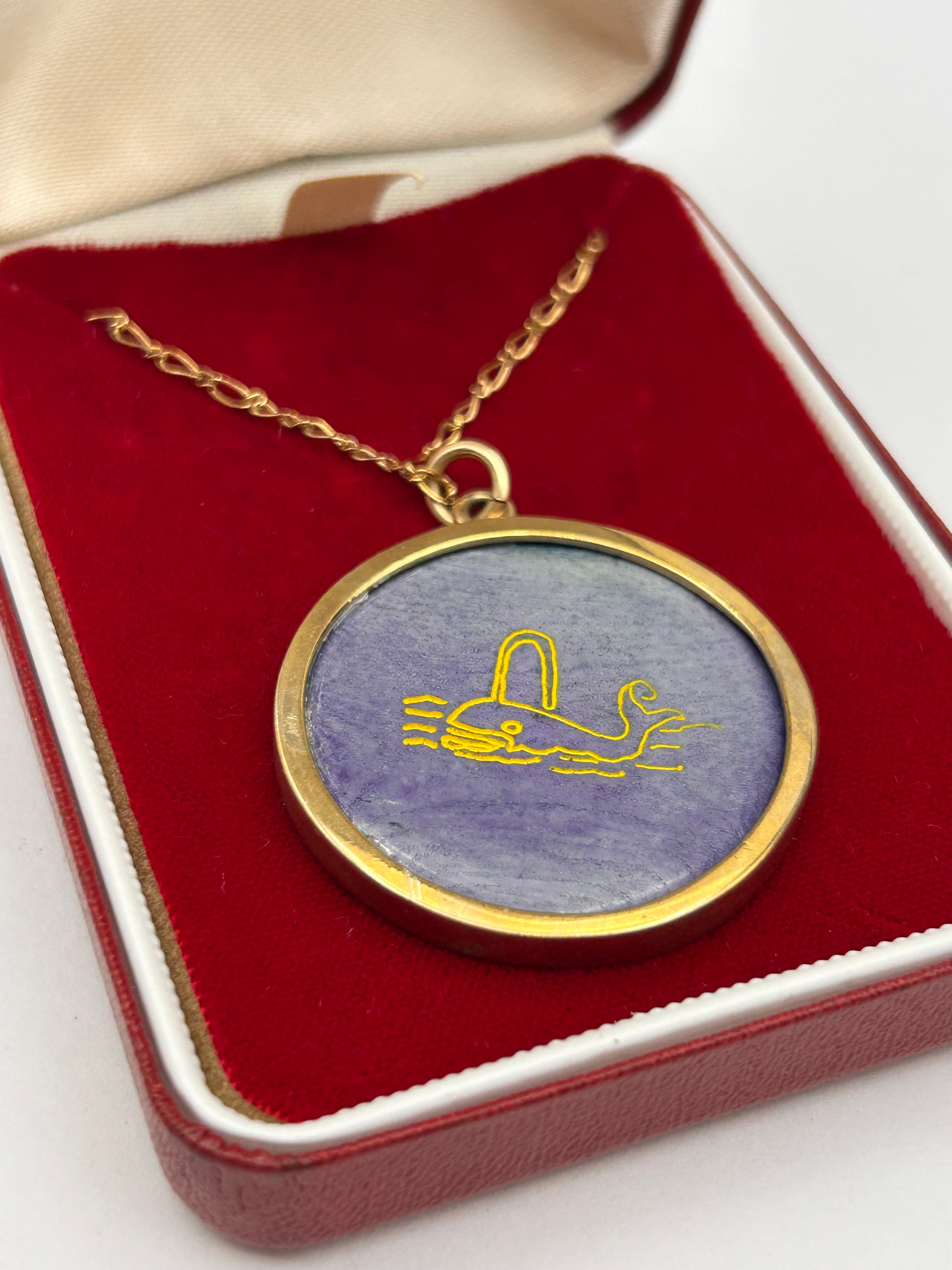 A necklace featuring a gold-toned metal chain and a circular pendant. The pendant comprises a gold-toned bezel framing a pale blue/lilac textured surface, upon which a stylized yellow line drawing of a whale spouting water is depicted. No discernible text or manufacturer’s markings are visible on the item. The necklace is presented in a red velvet-lined hinged box.