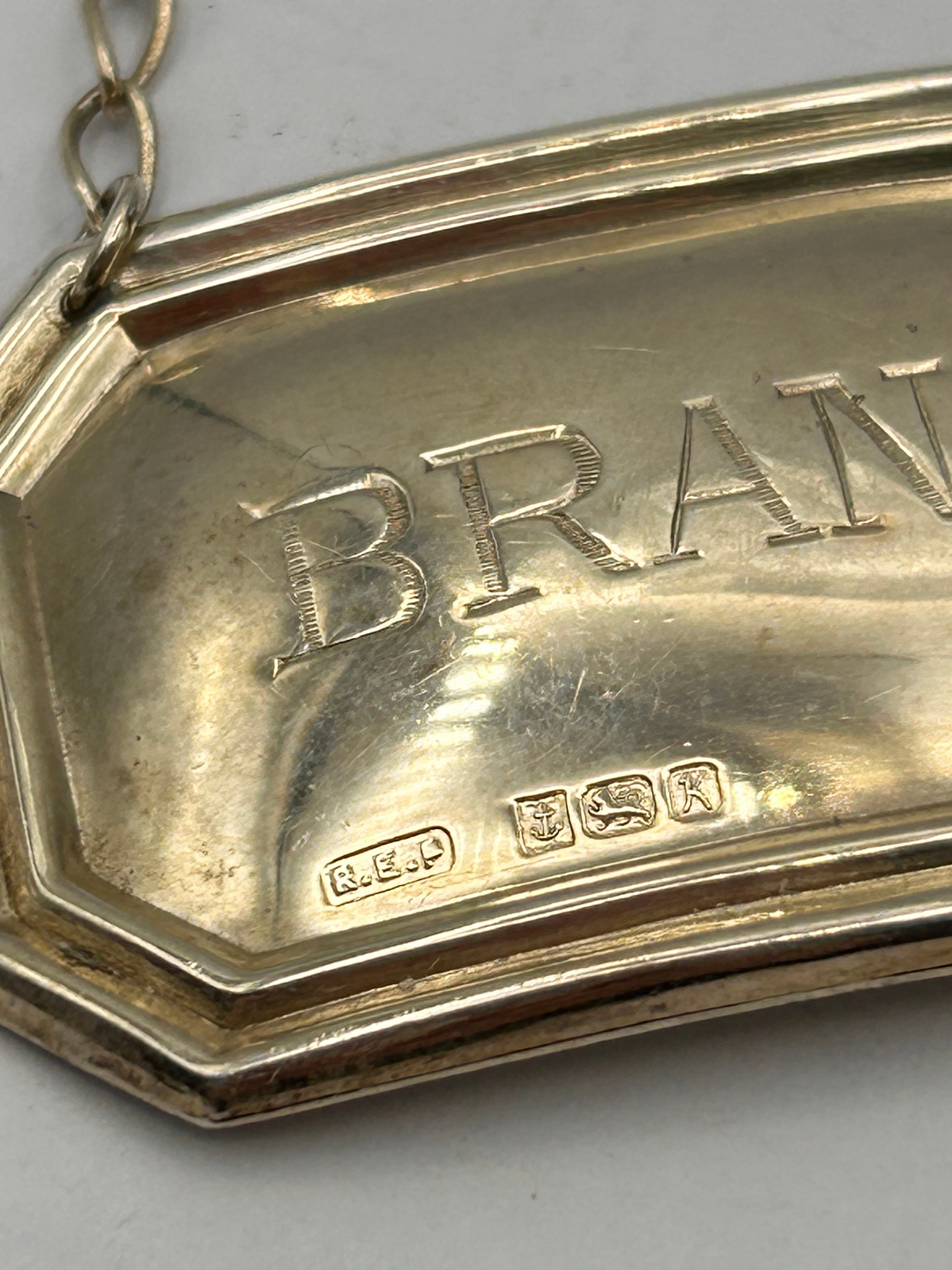 A sterling silver decanter label, engraved ‘BRANDY’, hallmarked Birmingham 1934-35. This octagonal bottle ticket is suspended from a simple chain. The front face is prominently engraved with the word ‘BRANDY’ in capital letters. Below the text, a series of legible hallmarks includes the maker’s mark ‘R.E.G.’, the Birmingham assay office anchor, the lion passant indicating sterling silver, and the date letter ‘K’ for 1934-35.