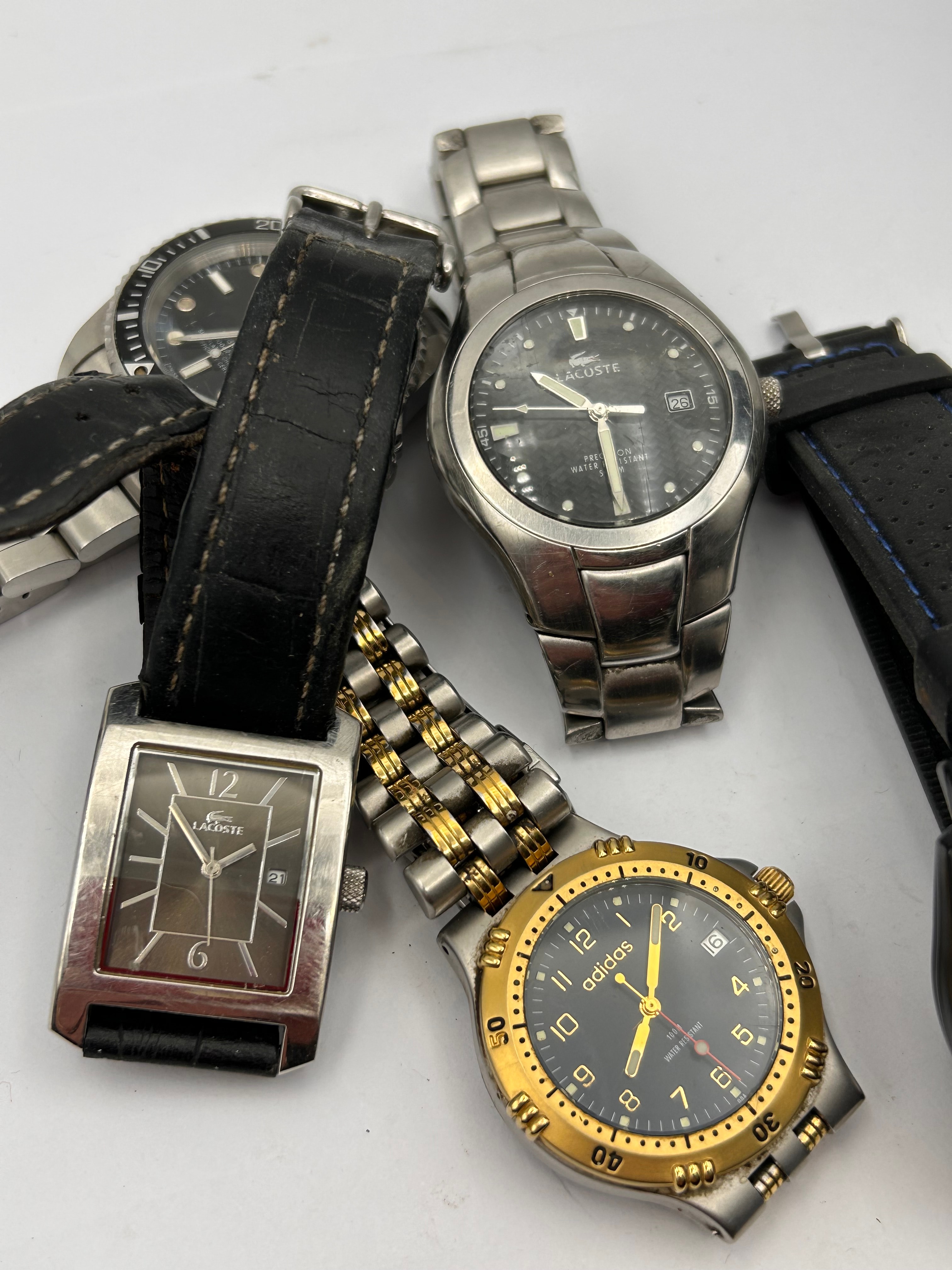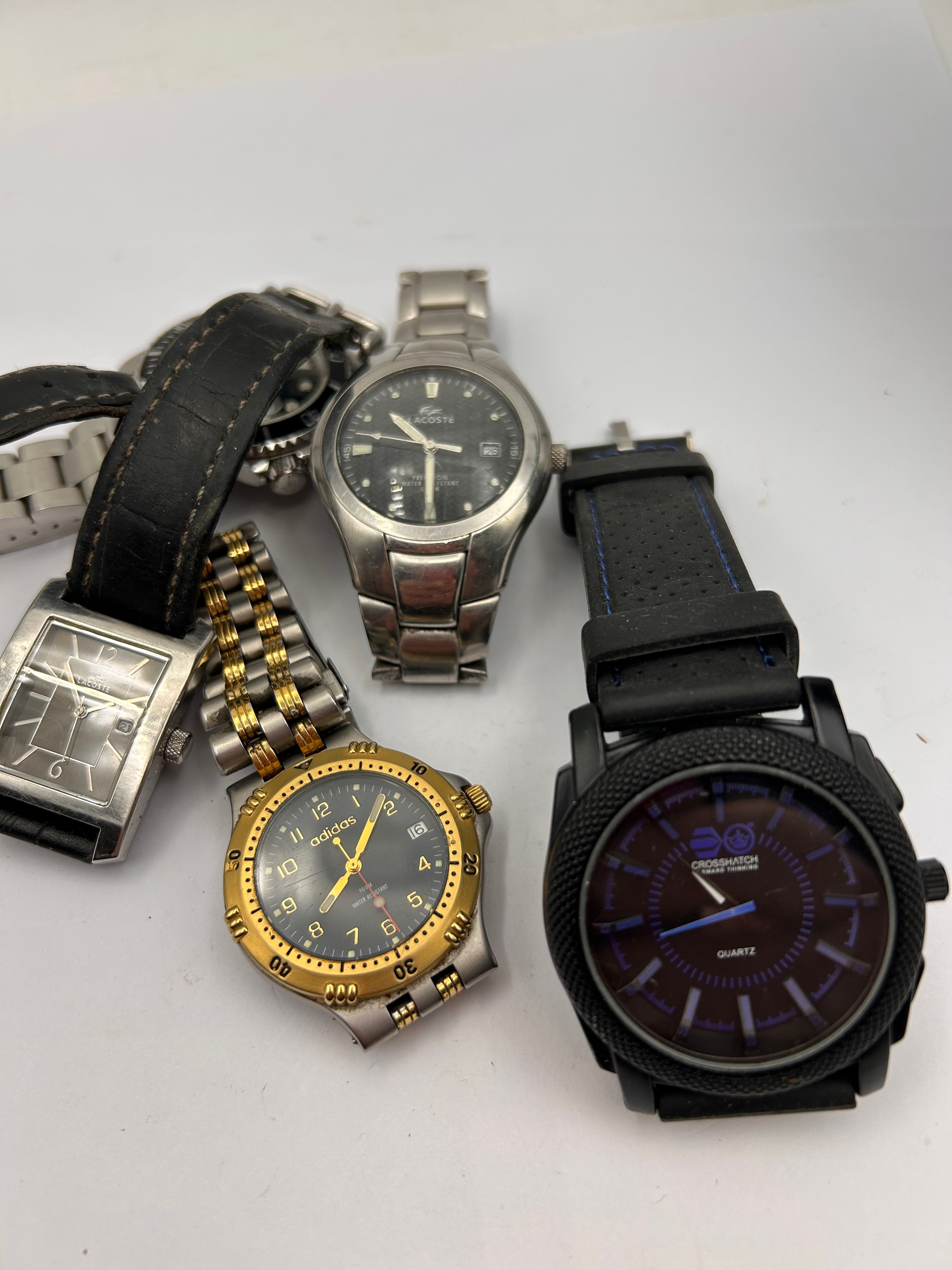 A group of five modern wristwatches, predominantly men’s, featuring a mix of styles and materials. The lot includes two Lacoste watches: one rectangular silver-tone piece with a black leather strap, and another round stainless steel model with a black dial, date display, and marked “WATER RESISTANT 20M.” An Adidas watch is present, characterized by its two-tone gold-tone bezel and bracelet accents on a silver-tone case, with a black dial marked “QUARTZ” and “10 BAR WATER RESISTANT” (partially visible). Also included is a large, black-cased Crosshatch watch with a textured black strap featuring blue stitching and a distinctive dark digital-analog display, marked “TOUGH WEAR” and “QUARTZ.” A fifth, partially obscured silver-tone watch with a black dial and strap is also visible. All watches appear to be quartz movement.