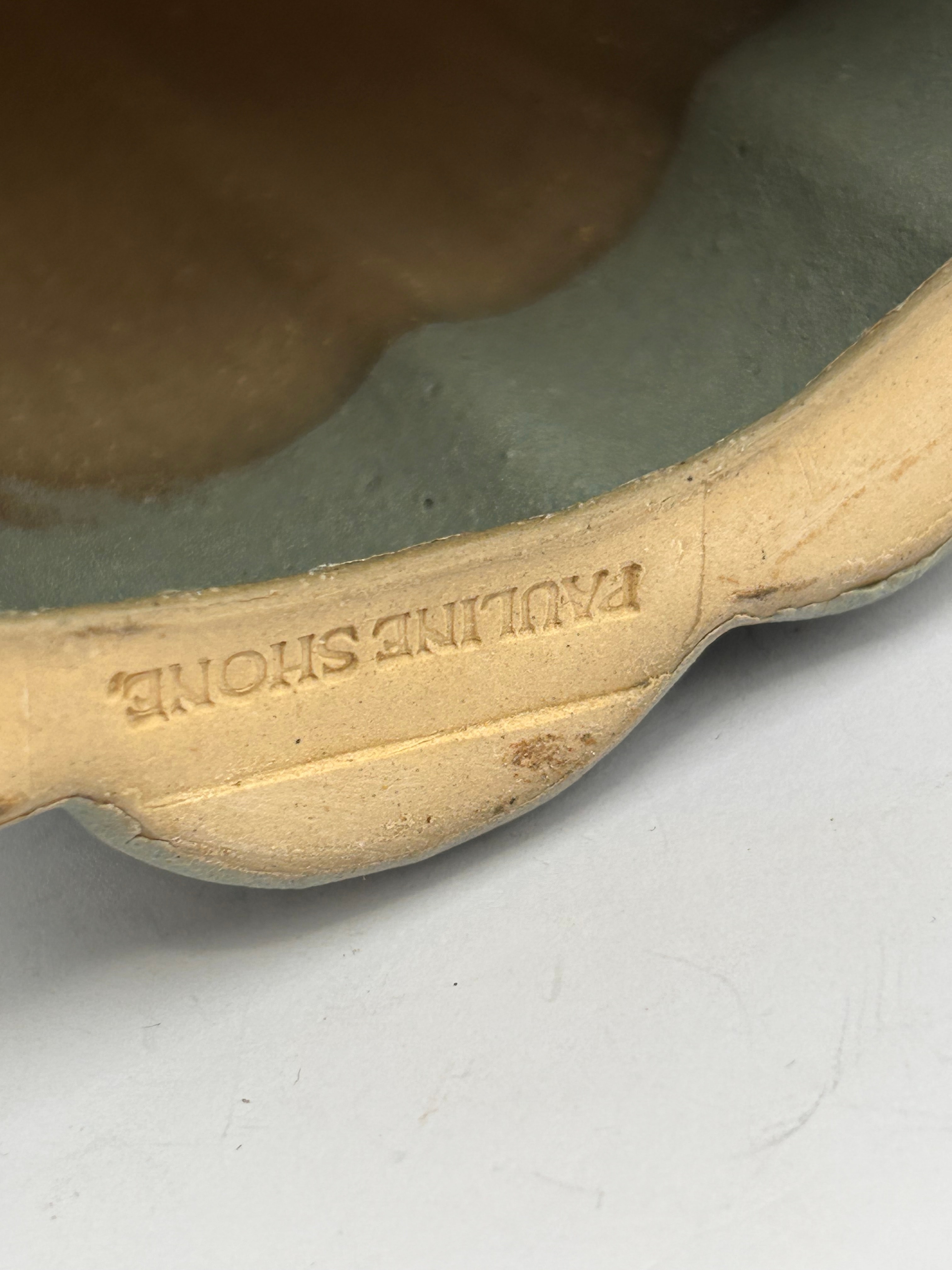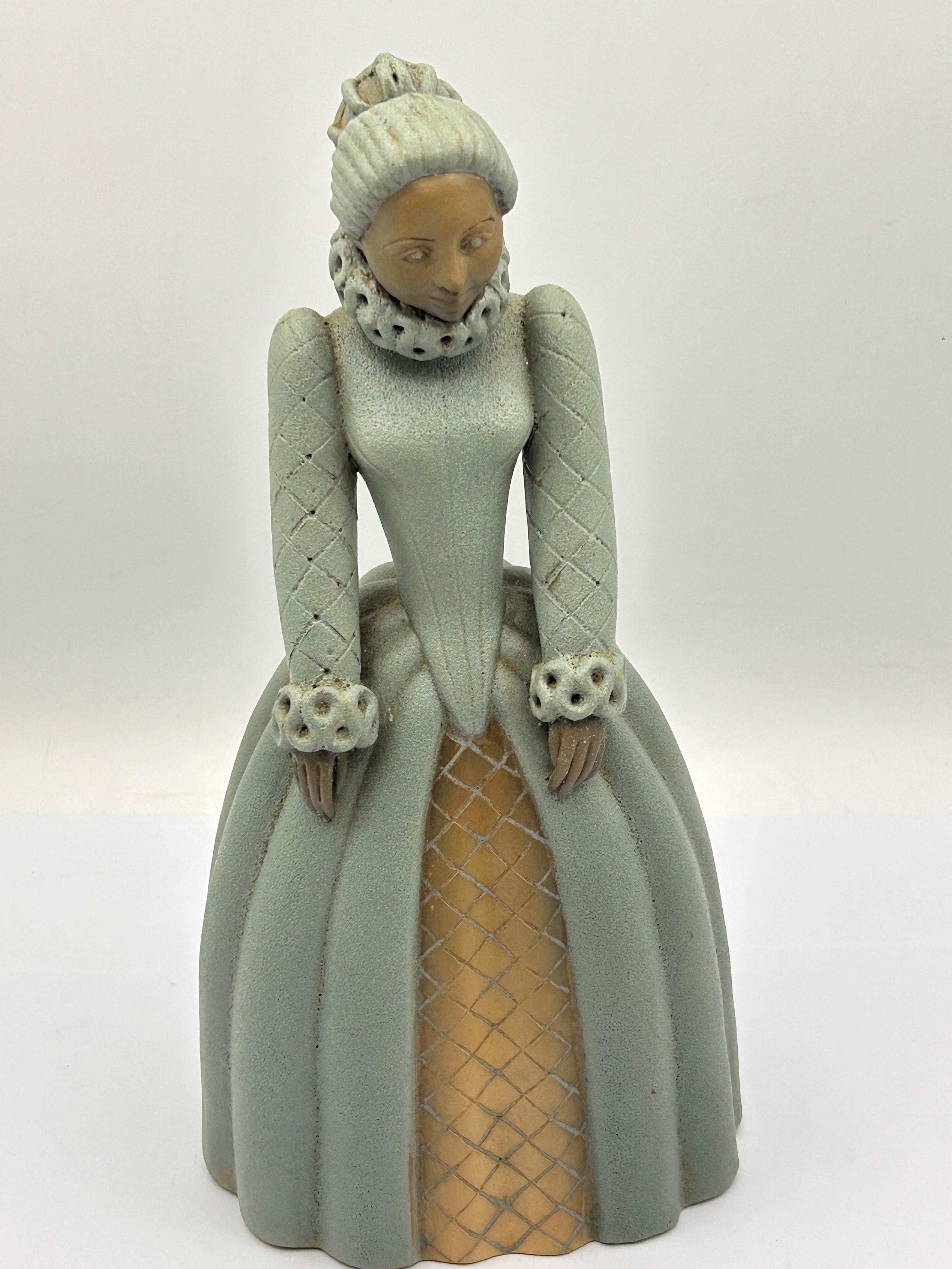 A ceramic figural sculpture depicting a woman in historical-style attire, featuring a prominent ruff collar, textured and patterned puffed sleeves, and a voluminous skirt revealing a gold-toned diamond-patterned underskirt. The face and hands are rendered in a smooth, matte tan finish, contrasting with the textured, matte light grey-green glaze on the hair and garments. The base is impressed with the text “PAULINE SHONE.”