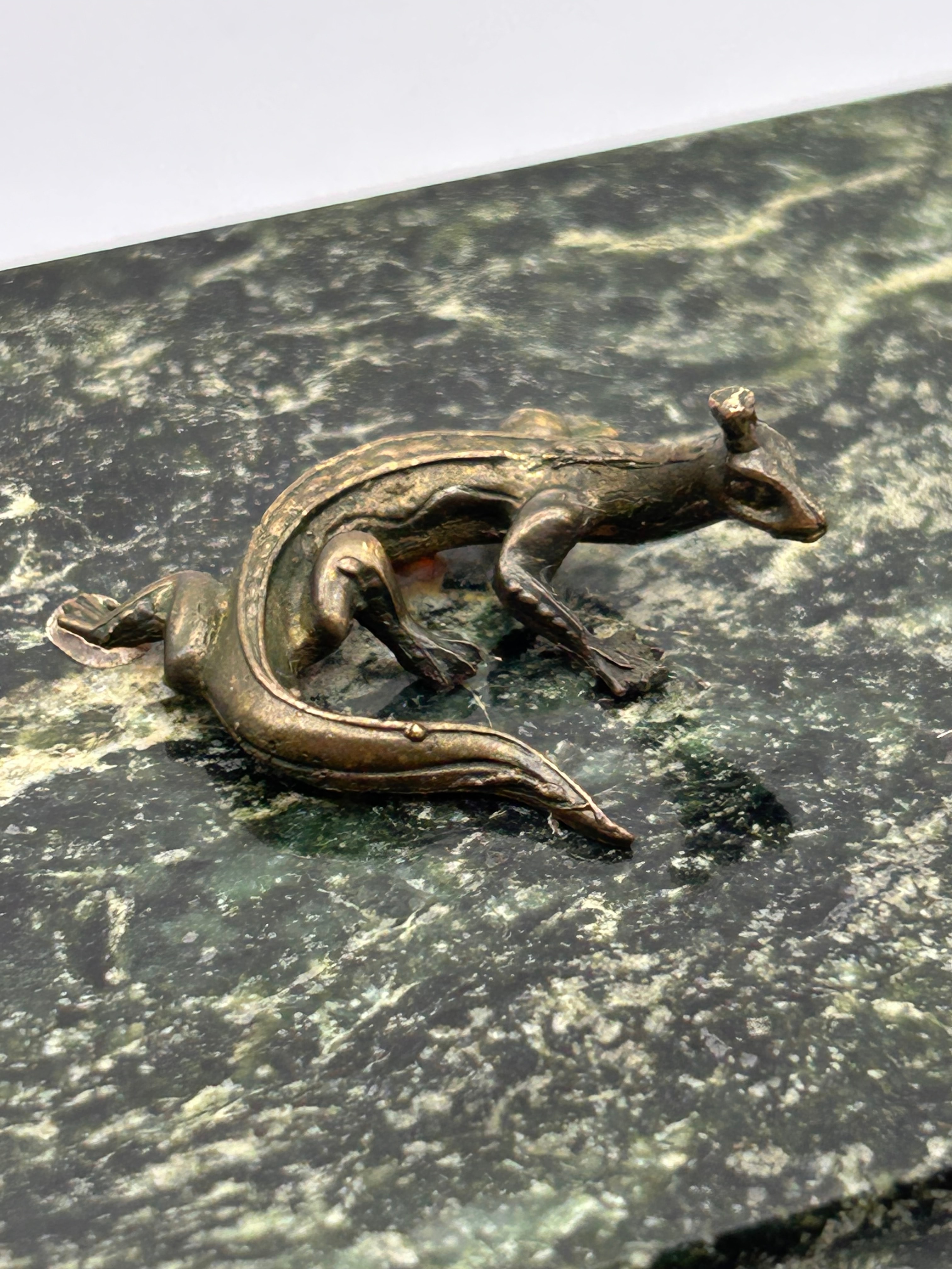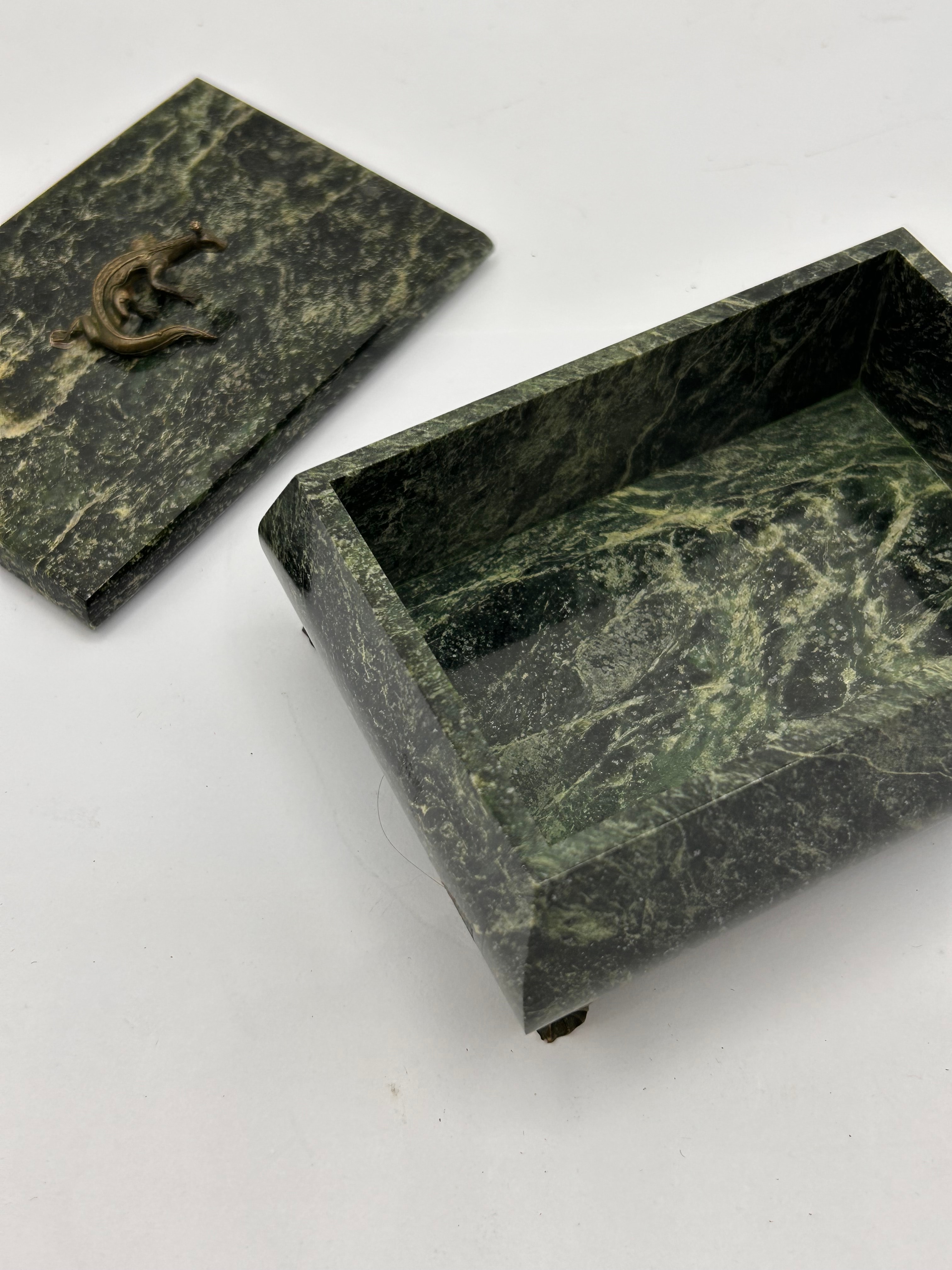 A vintage lidded box crafted from serpentine stone, adorned with a bronze lizard appliqué. The rectangular box is made from a dark green, variegated stone, exhibiting a polished finish and natural veining throughout. It is elevated on four ornate, scrolled feet, likely cast bronze. The lid features a detailed bronze figural appliqué depicting a lizard or salamander. The bronze elements display an aged patina. No visible manufacturer’s marks or inscriptions are apparent. Similar examples in the market have been identified as Russian Jasper.