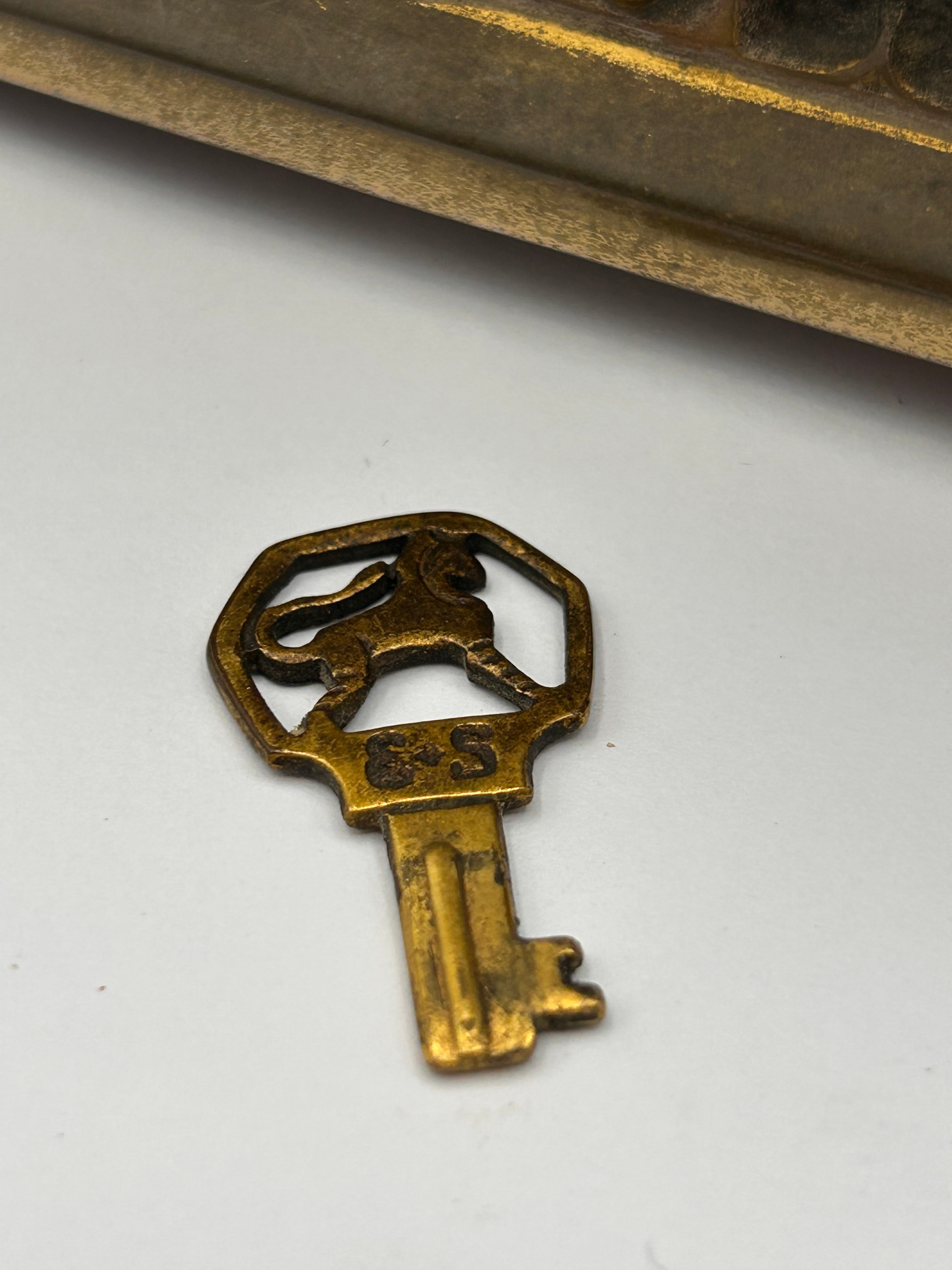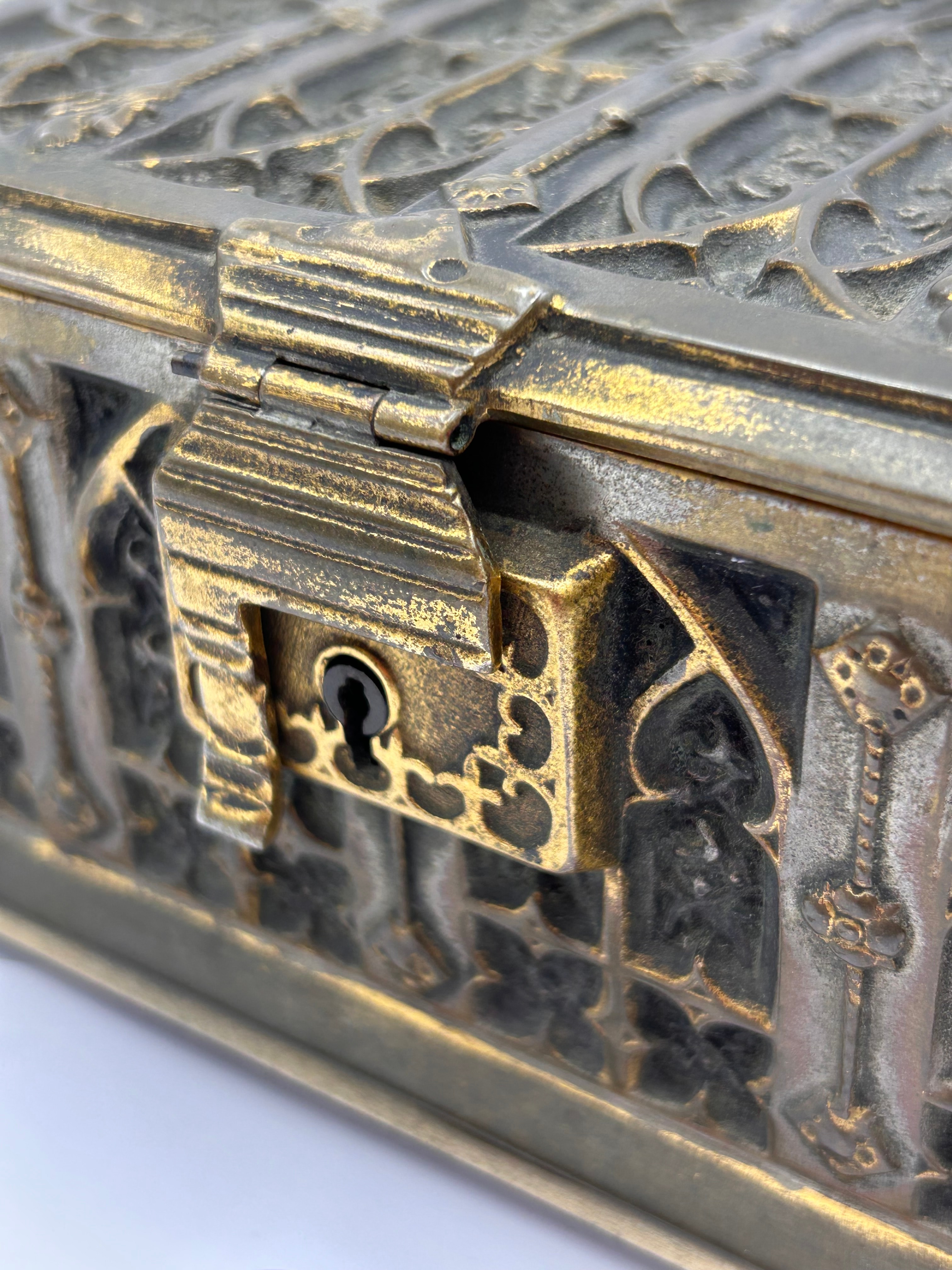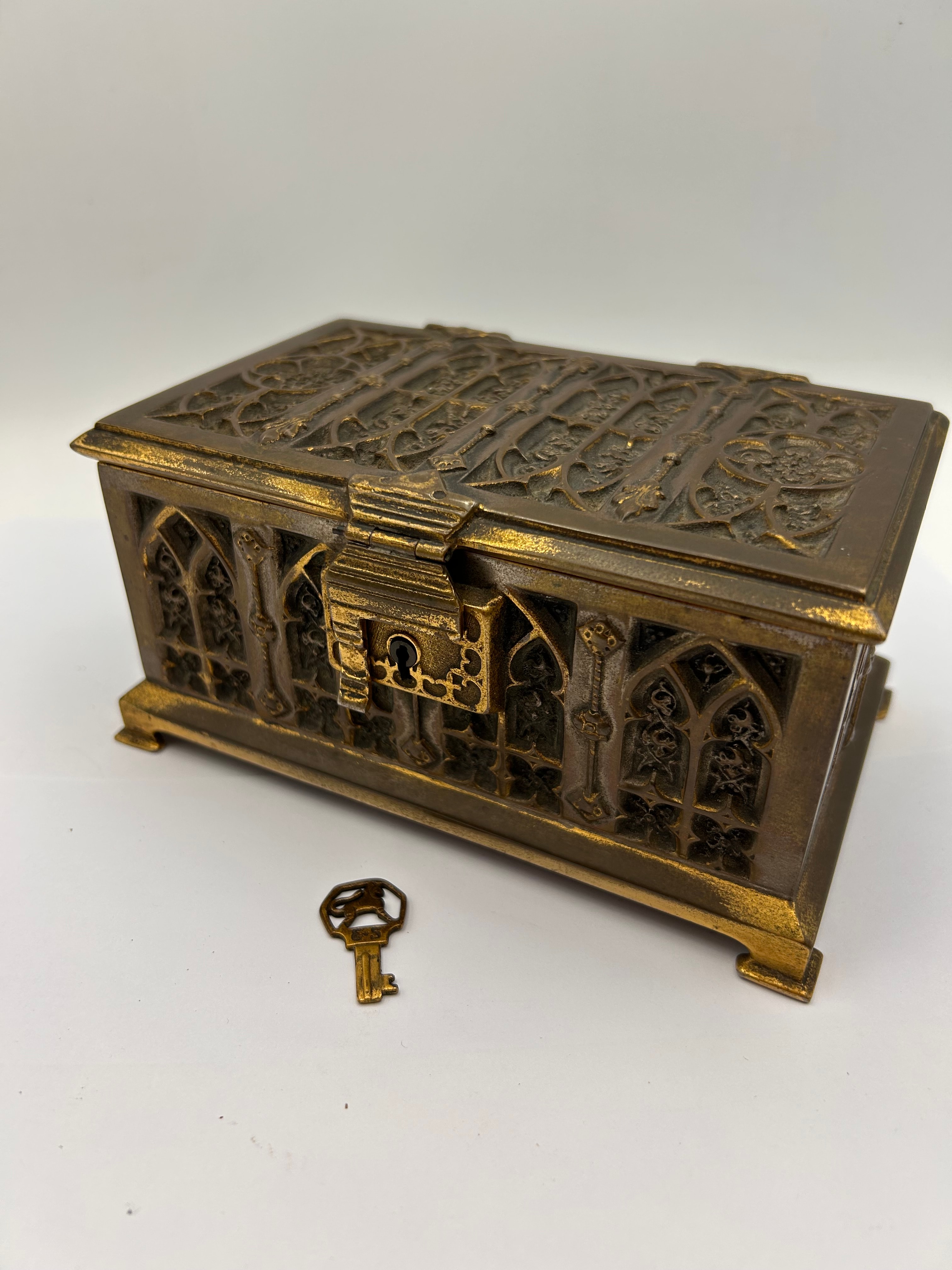 An antique rectangular decorative casket, styled in the Gothic Revival manner. It features ornate cast metalwork with intricate architectural details including tracery, pointed arches, and stylized foliage. The item exhibits a two-tone finish, with a darker, bronzed or antique silver-tone base accented by a contrasting gilded or gold-tone on raised elements and edges. A prominent hasp and staple lock is visible on the front. A small, separate key with a cutout of a stylized lion and the letters “SFS” on its bow is present.