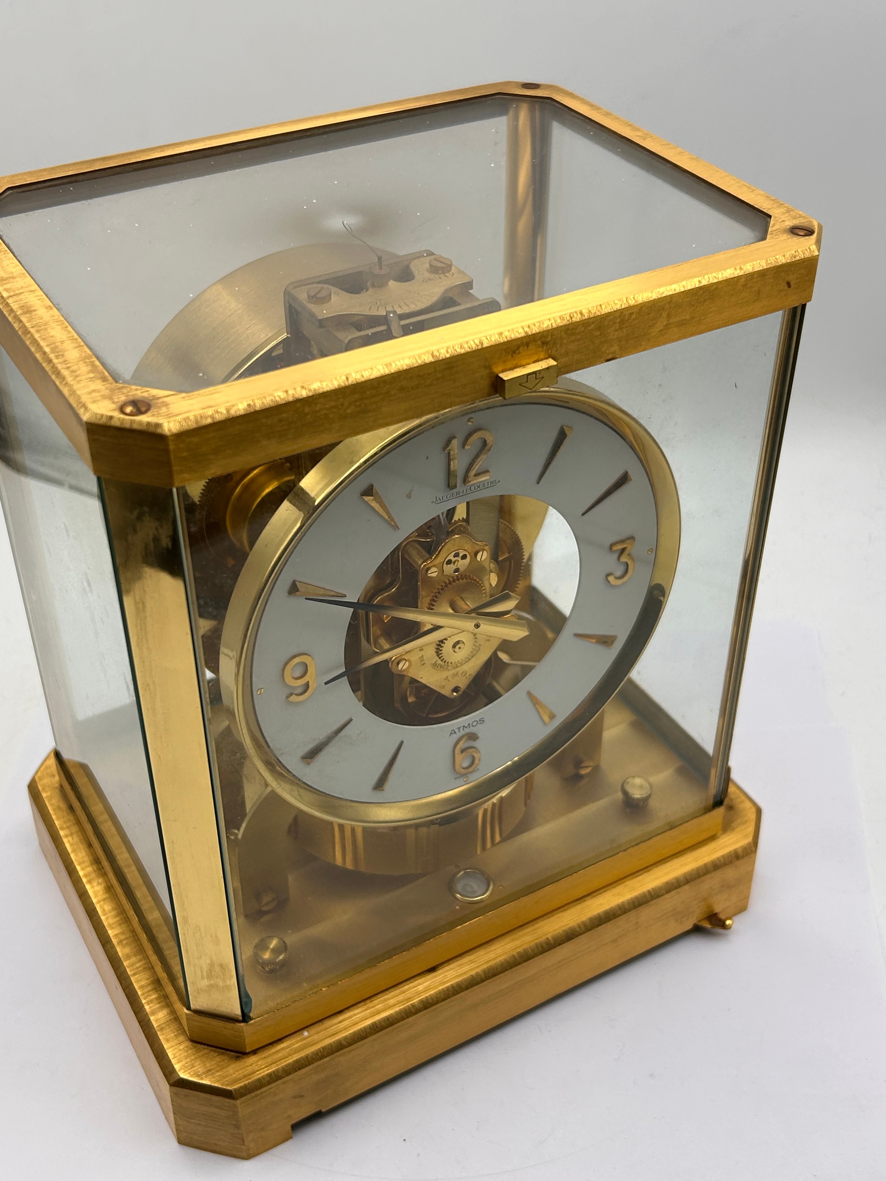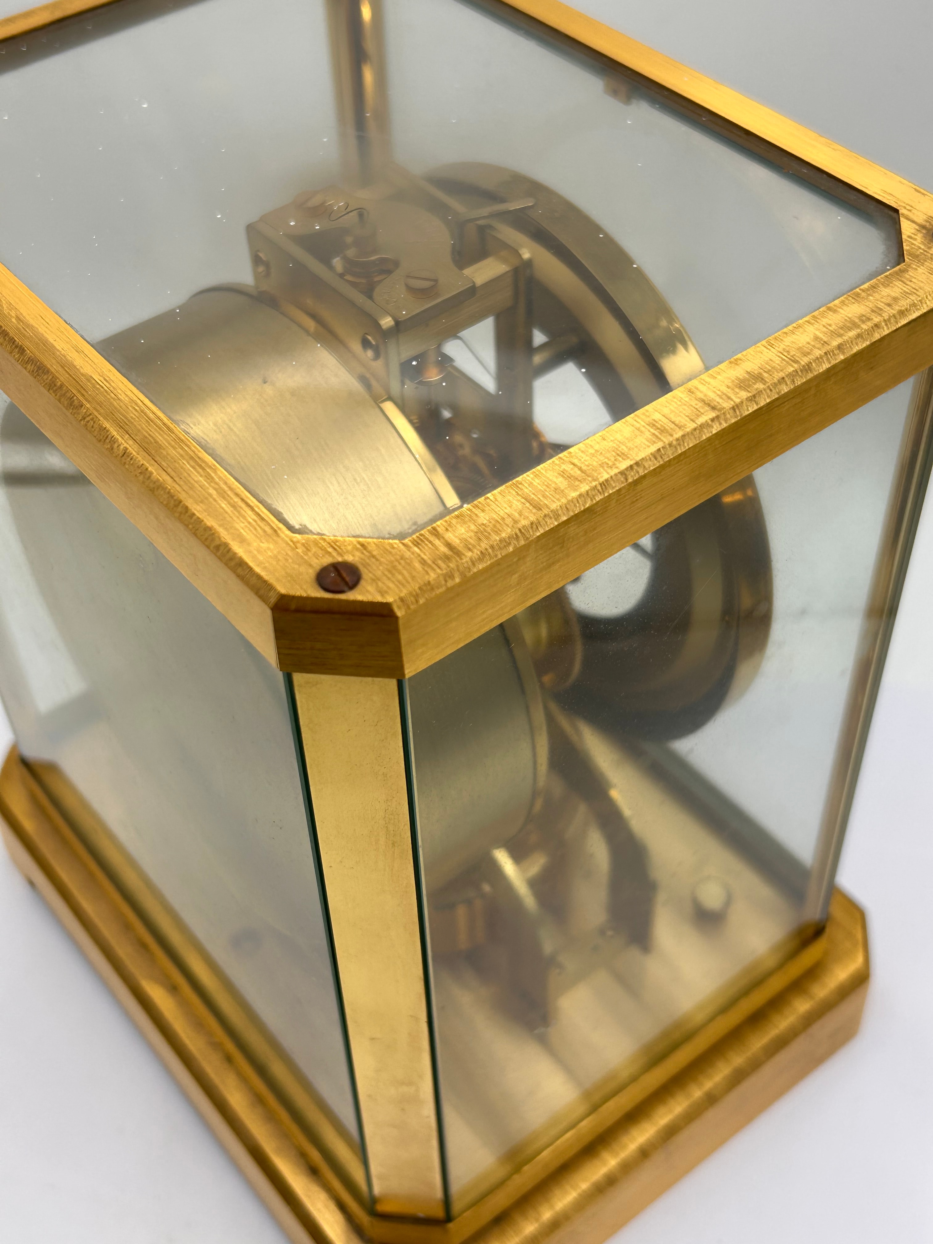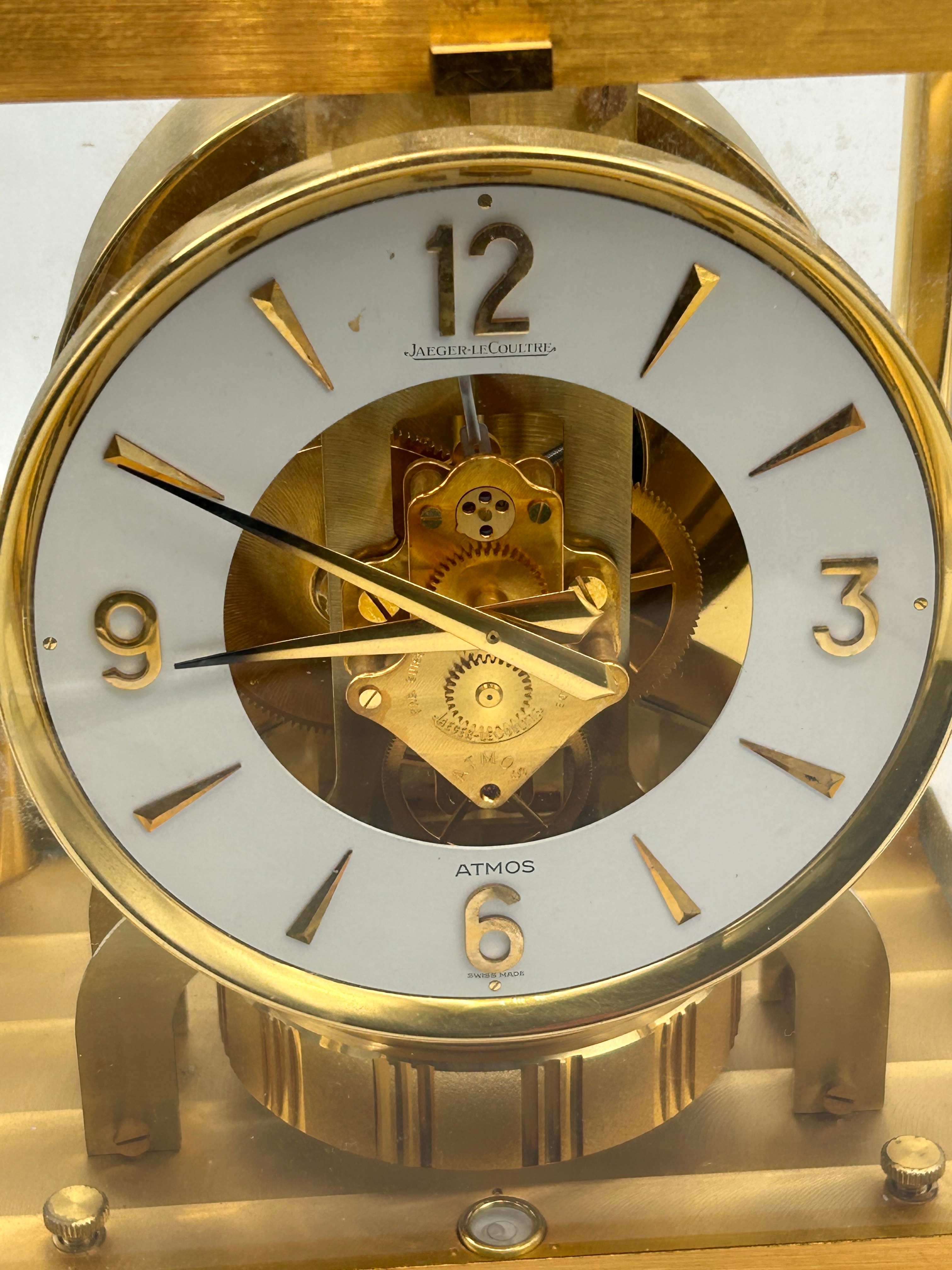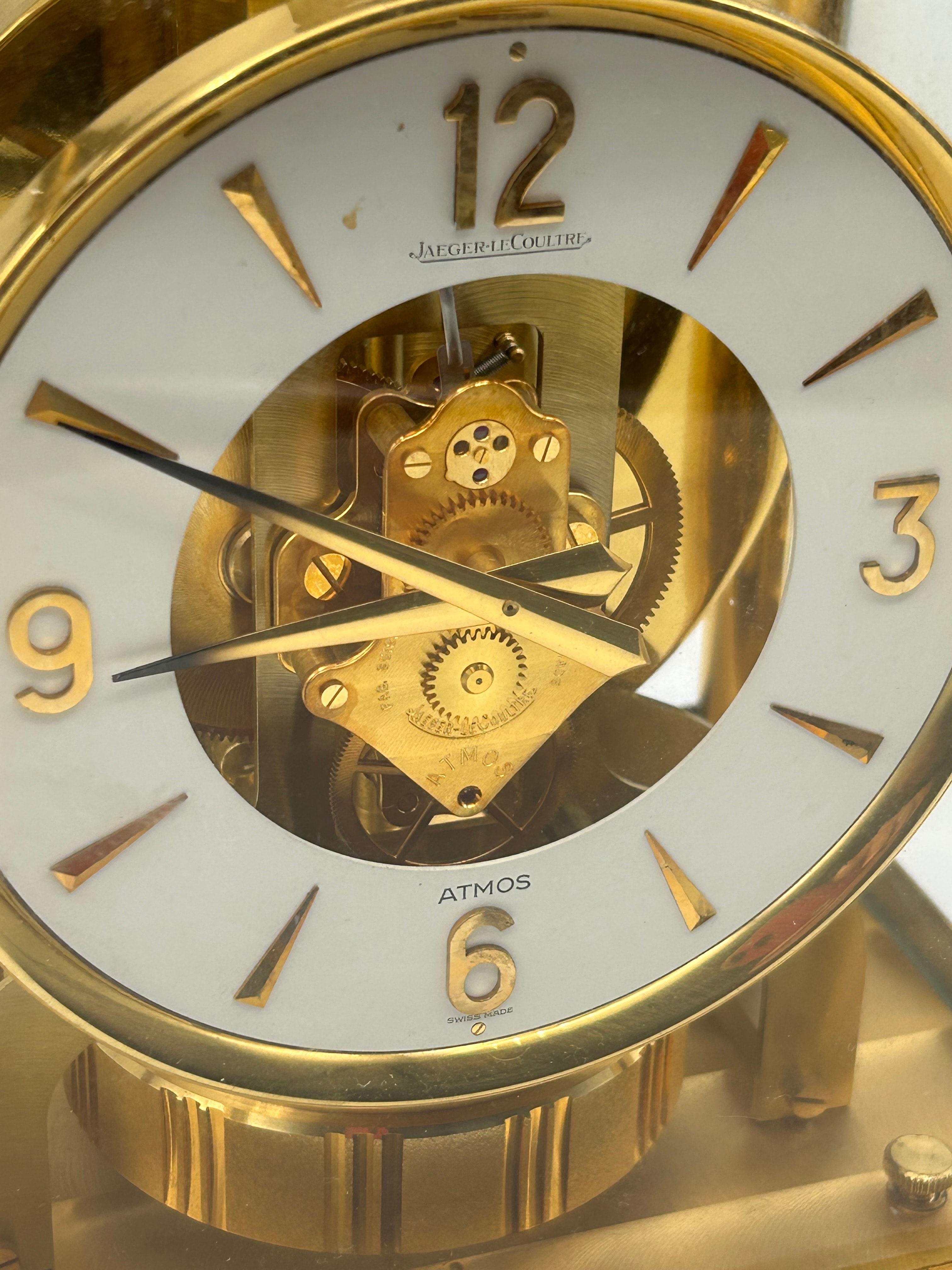 A Jaeger-LeCoultre Atmos perpetual motion table clock, Caliber 528-8. Enclosed in a rectangular glass case with a gold-toned brass frame and a stepped base. The clock features a round, white dial with prominent gold Arabic numerals at 12, 3, 6, and 9, complemented by gold baton hour markers. The dial is clearly marked “JAEGER-LECOULTRE” below the 12, and “ATMOS” with “SWISS MADE” above the 6. An open aperture in the dial reveals the complex, polished brass mechanism, which bears faint markings including “FAB. SUISSE” and “15 JEWELS”.