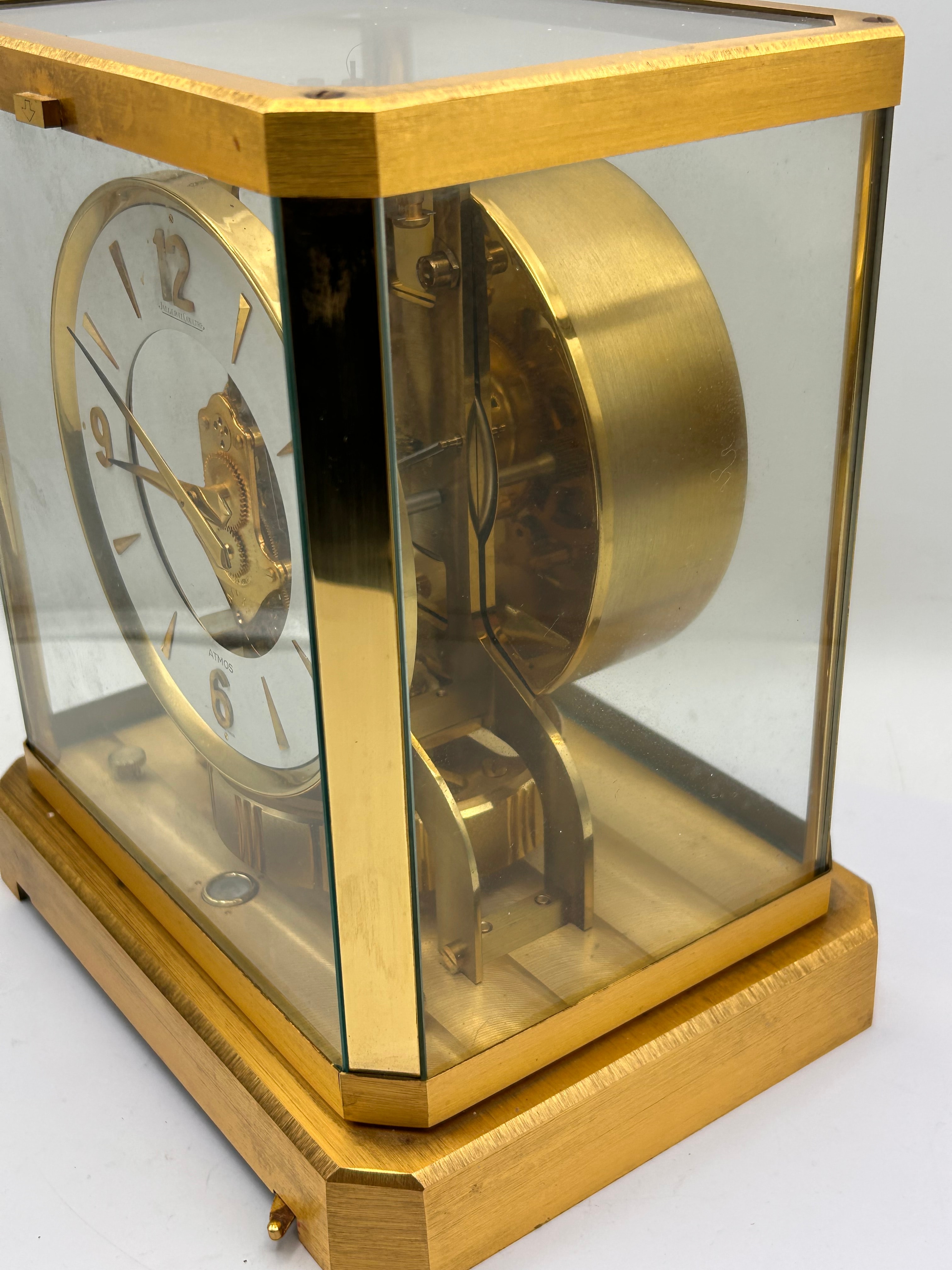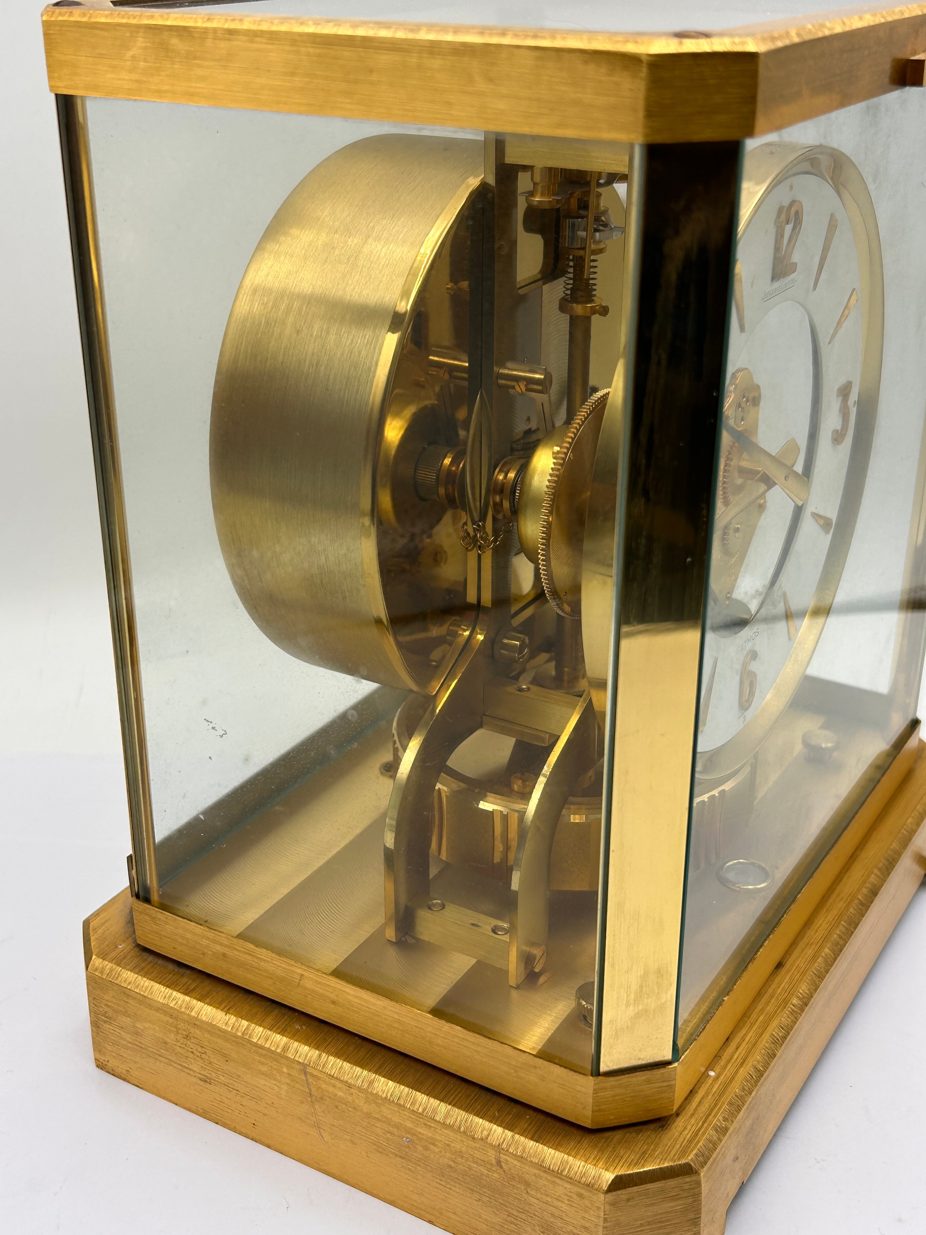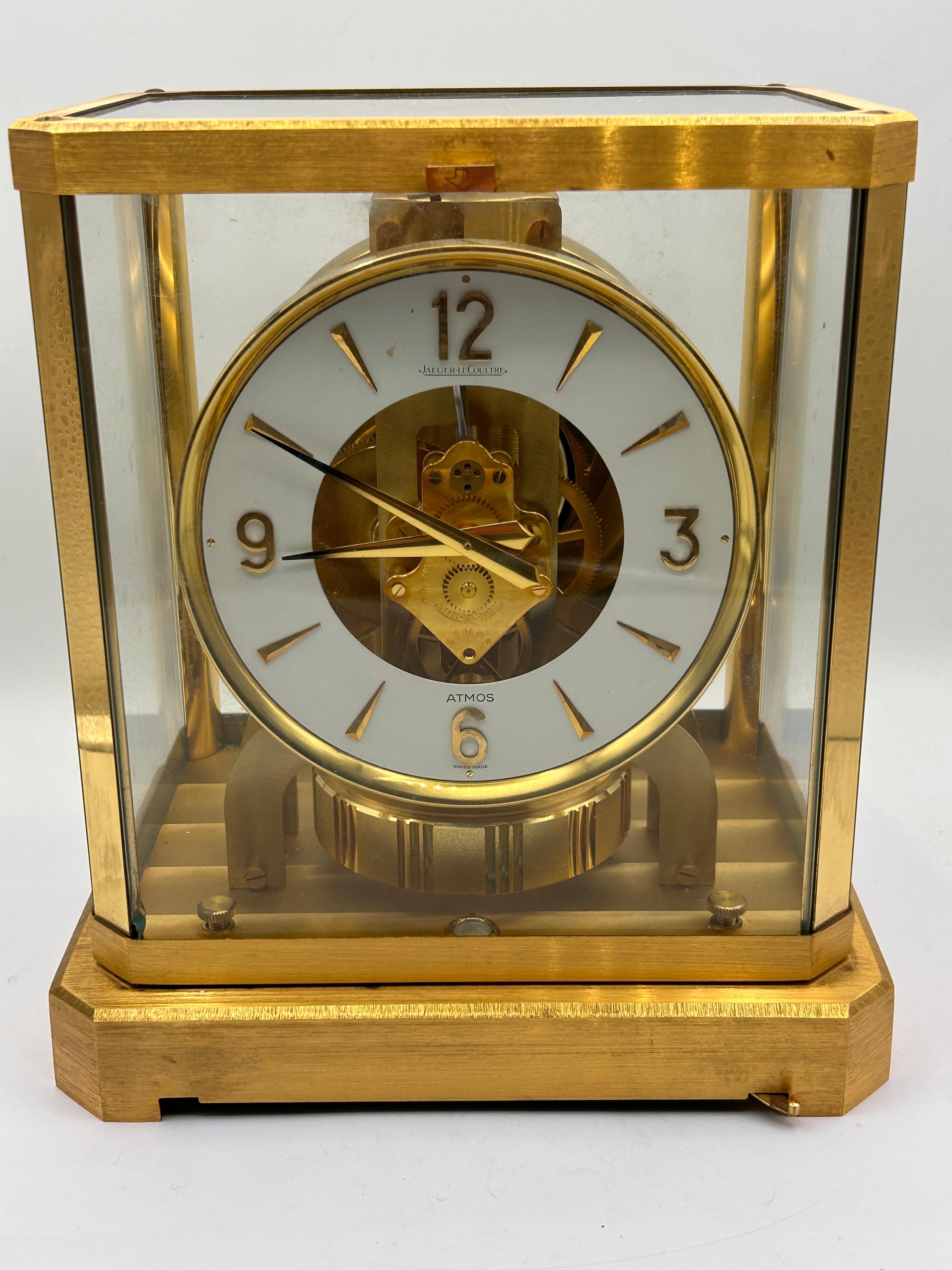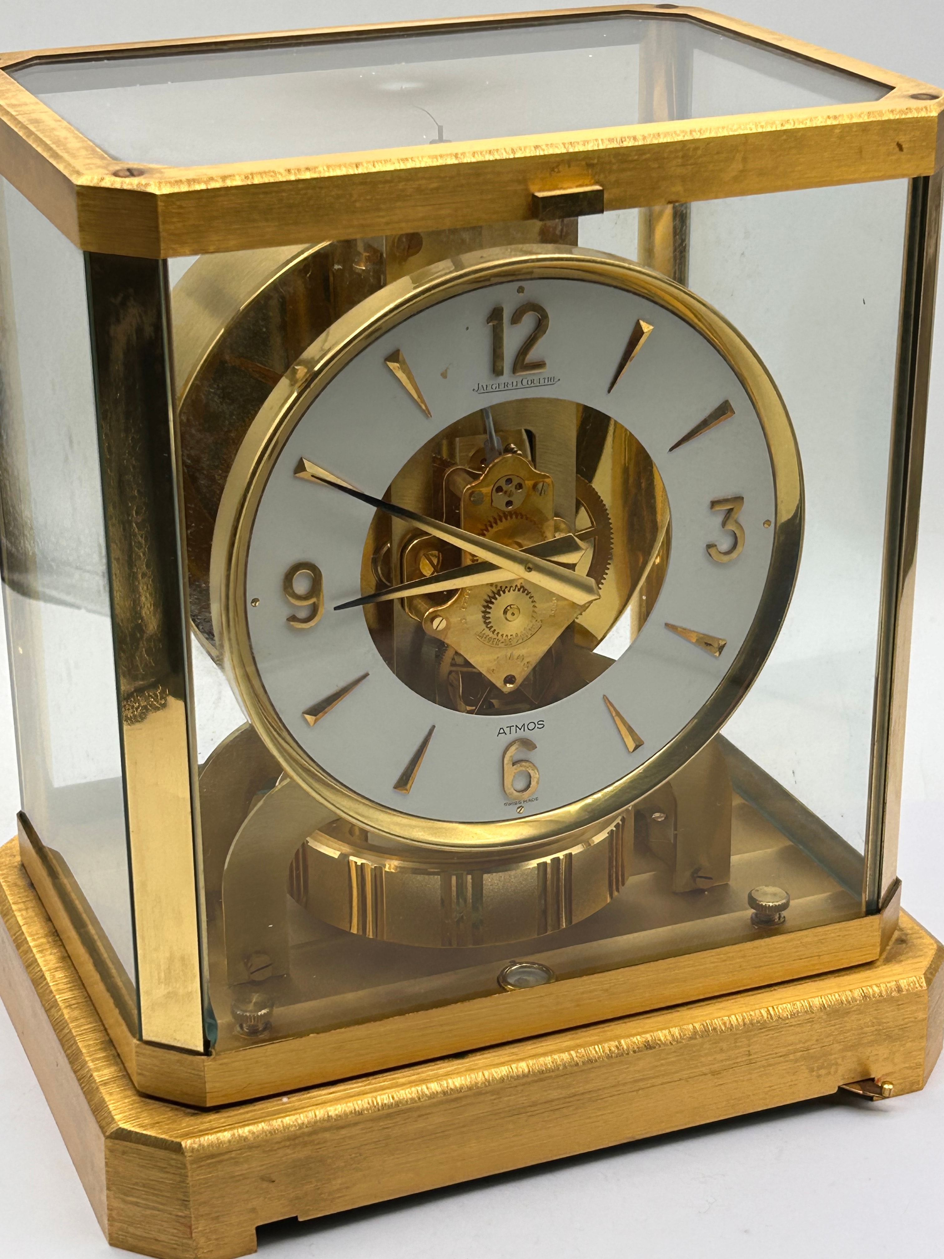 A Jaeger-LeCoultre Atmos perpetual motion table clock, Caliber 528-8. Enclosed in a rectangular glass case with a gold-toned brass frame and a stepped base. The clock features a round, white dial with prominent gold Arabic numerals at 12, 3, 6, and 9, complemented by gold baton hour markers. The dial is clearly marked “JAEGER-LECOULTRE” below the 12, and “ATMOS” with “SWISS MADE” above the 6. An open aperture in the dial reveals the complex, polished brass mechanism, which bears faint markings including “FAB. SUISSE” and “15 JEWELS”.