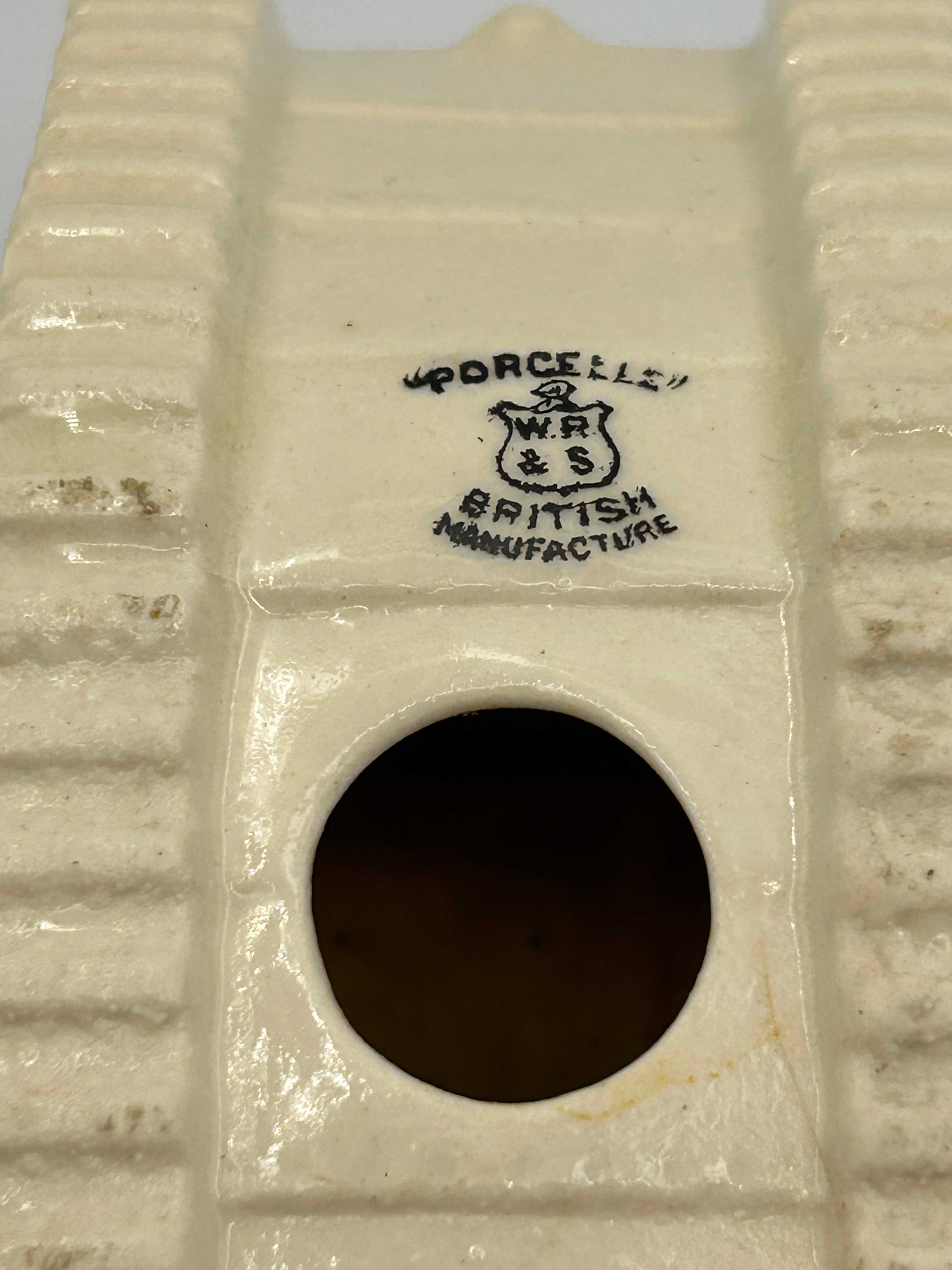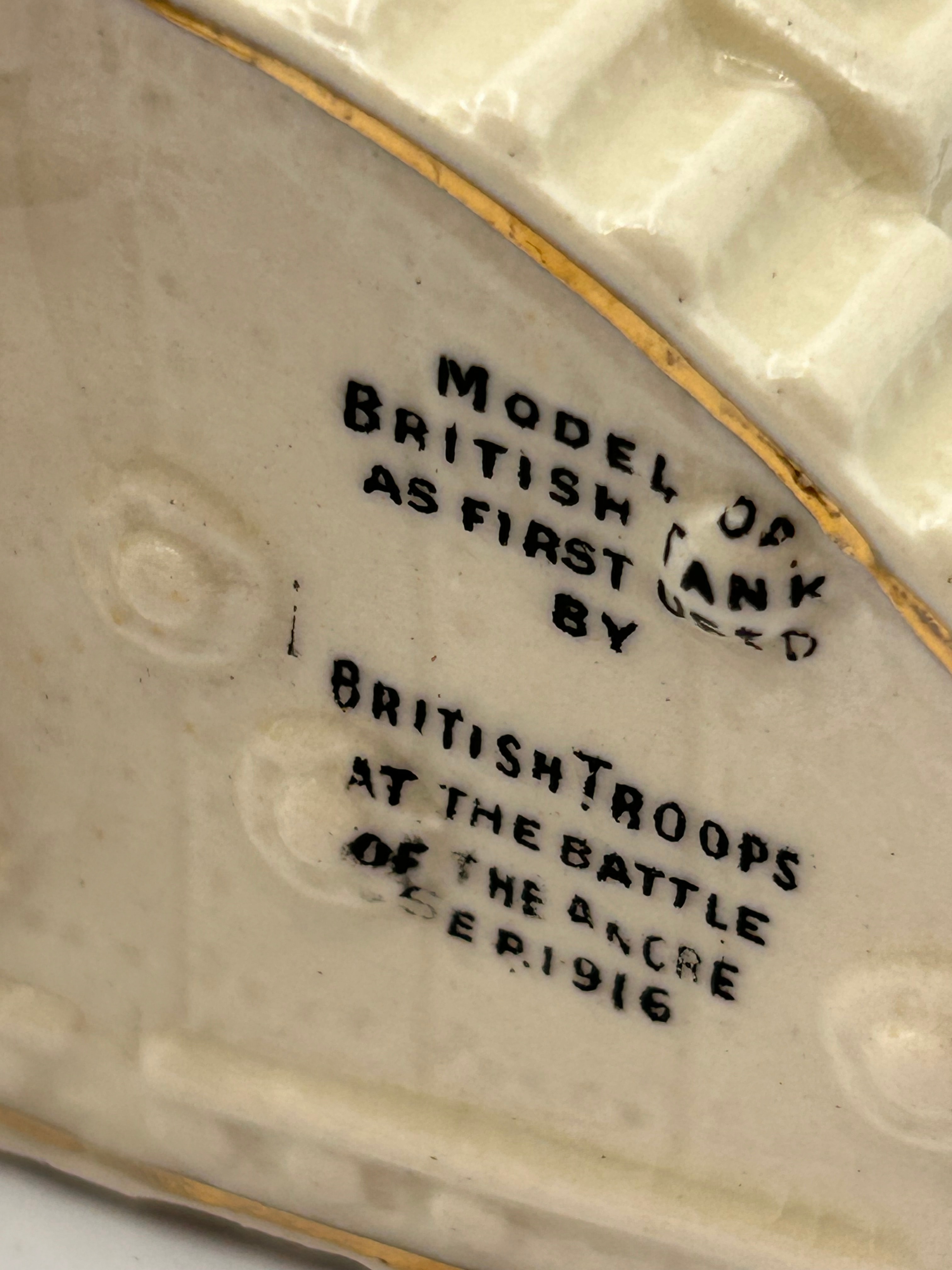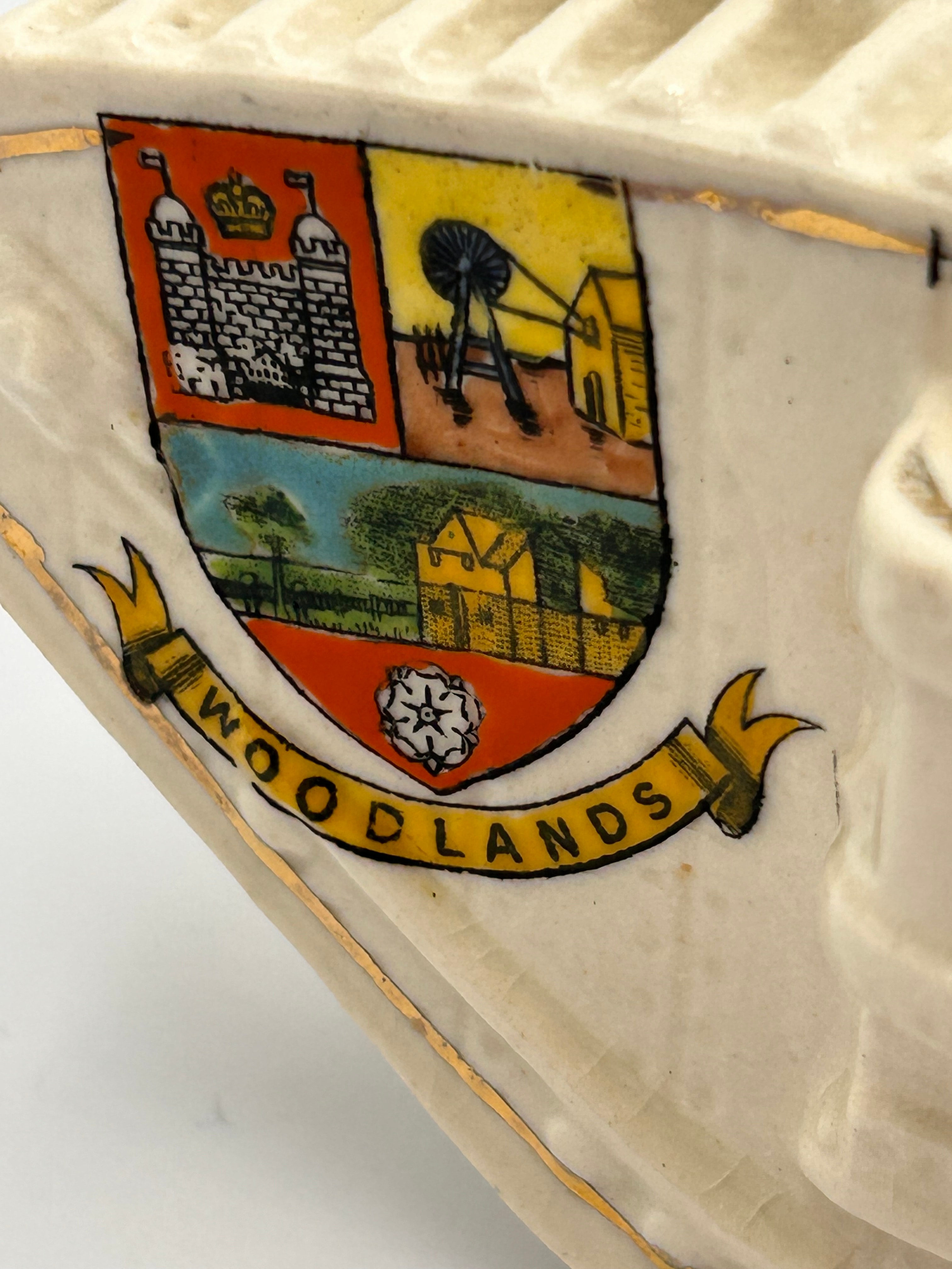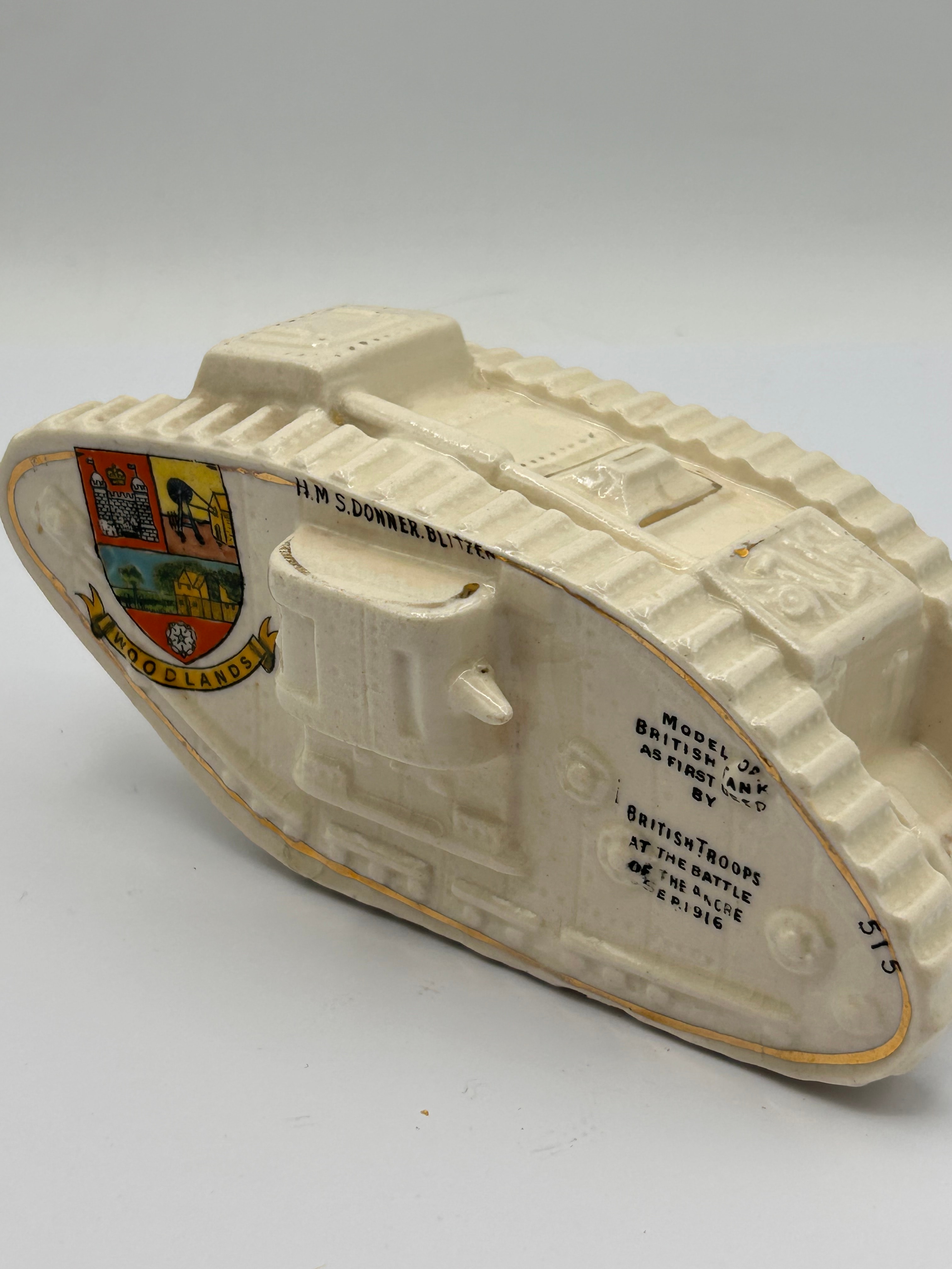 A glazed ceramic souvenir model of an early British tank, identified as a Savoy China Crested WW1 Tank. The model features hand-painted details including a coat of arms with the inscription “WOODLANDS” below it, depicting a castle, mining headgear, houses, and a white rose. Further inscriptions on the side read “HMS DONNER BLITZEN” and “MODEL OF BRITISH TANK AS FIRST USED BY BRITISH TROOPS AT THE BATTLE OF THE ANCRE SEP. 1916.” The underside bears the marks “PORCELLE,” “W.R. & S.,” and “BRITISH MANUFACTURE,” along with the number “515” on the rear right side.