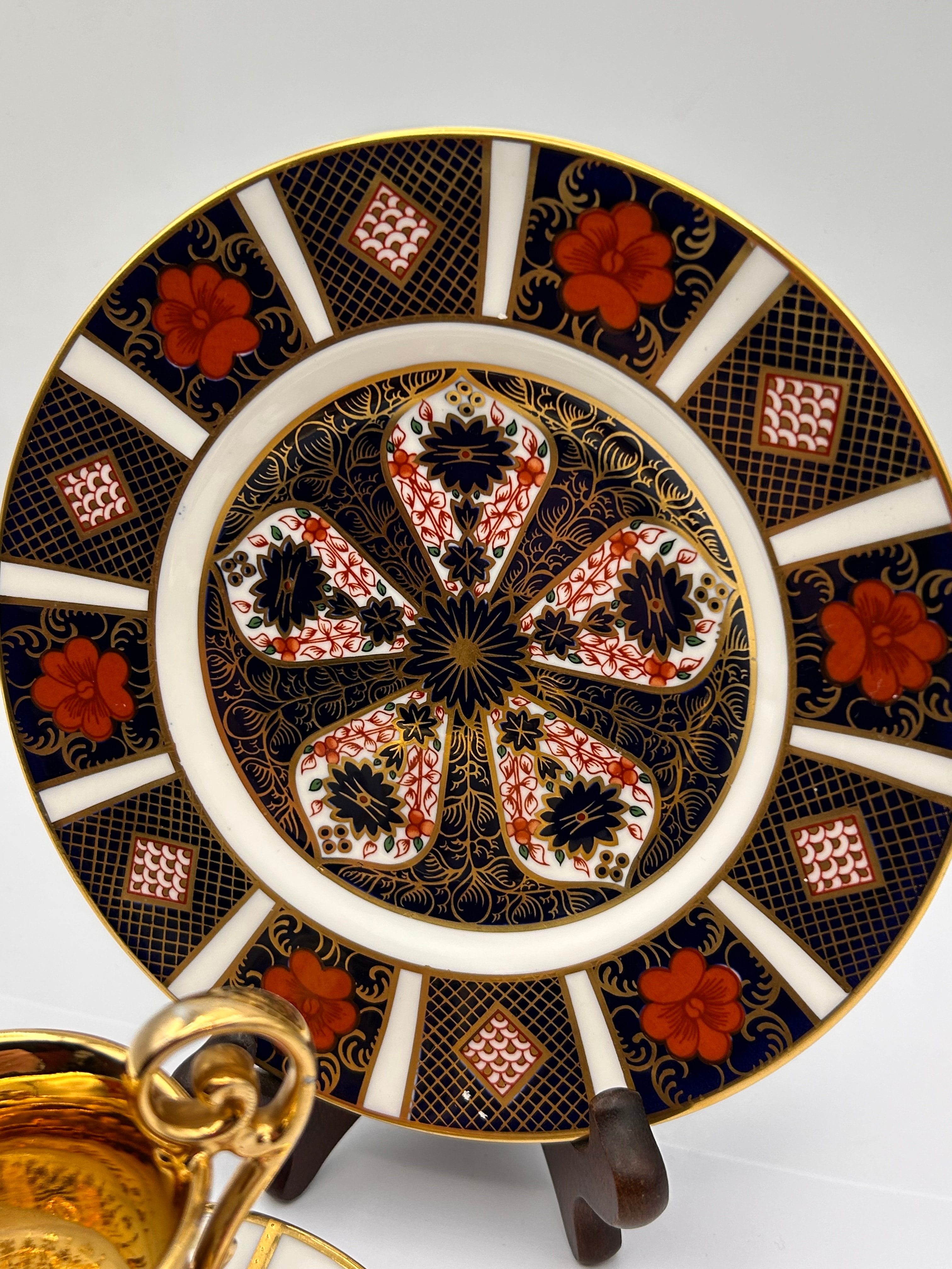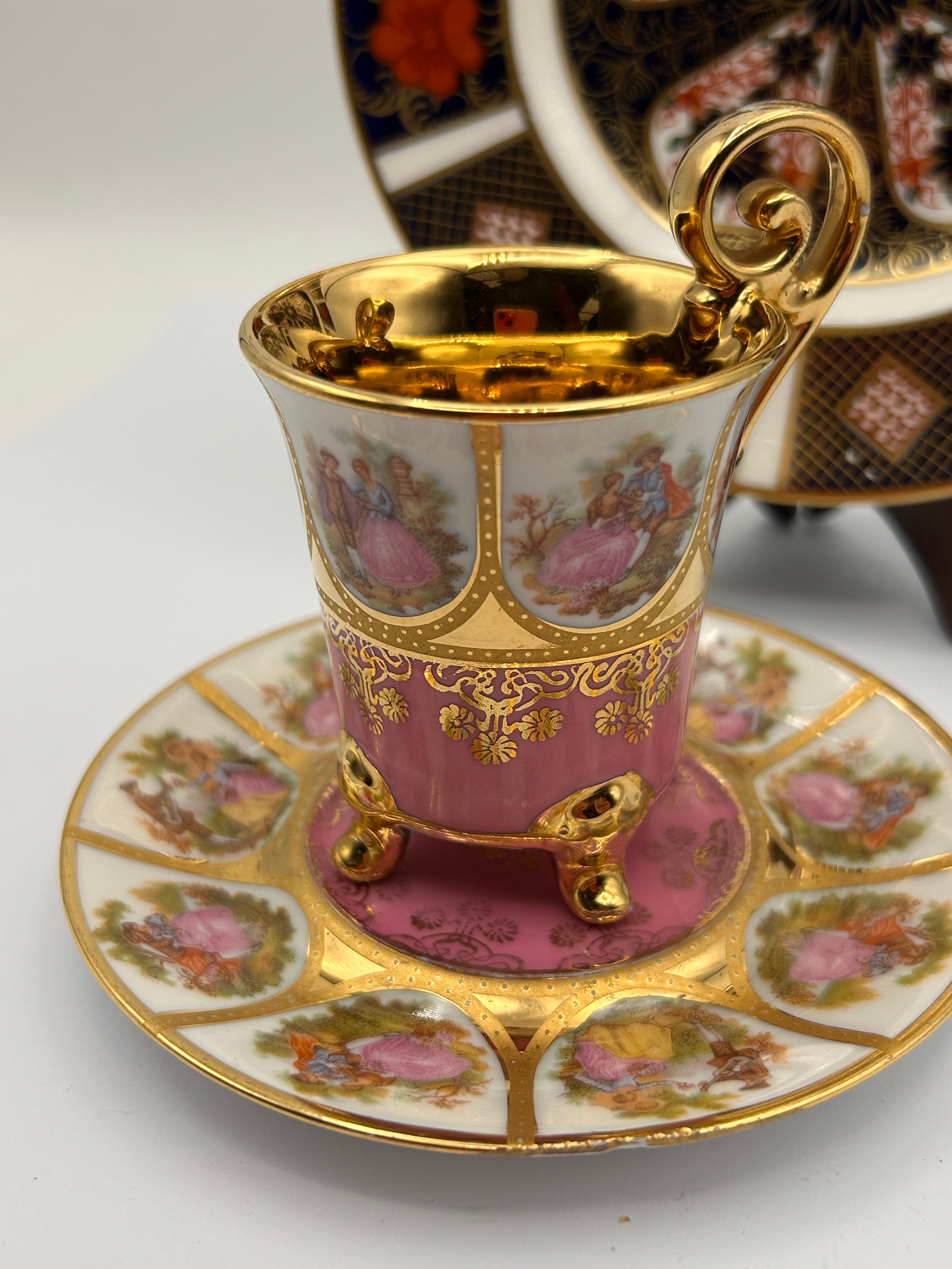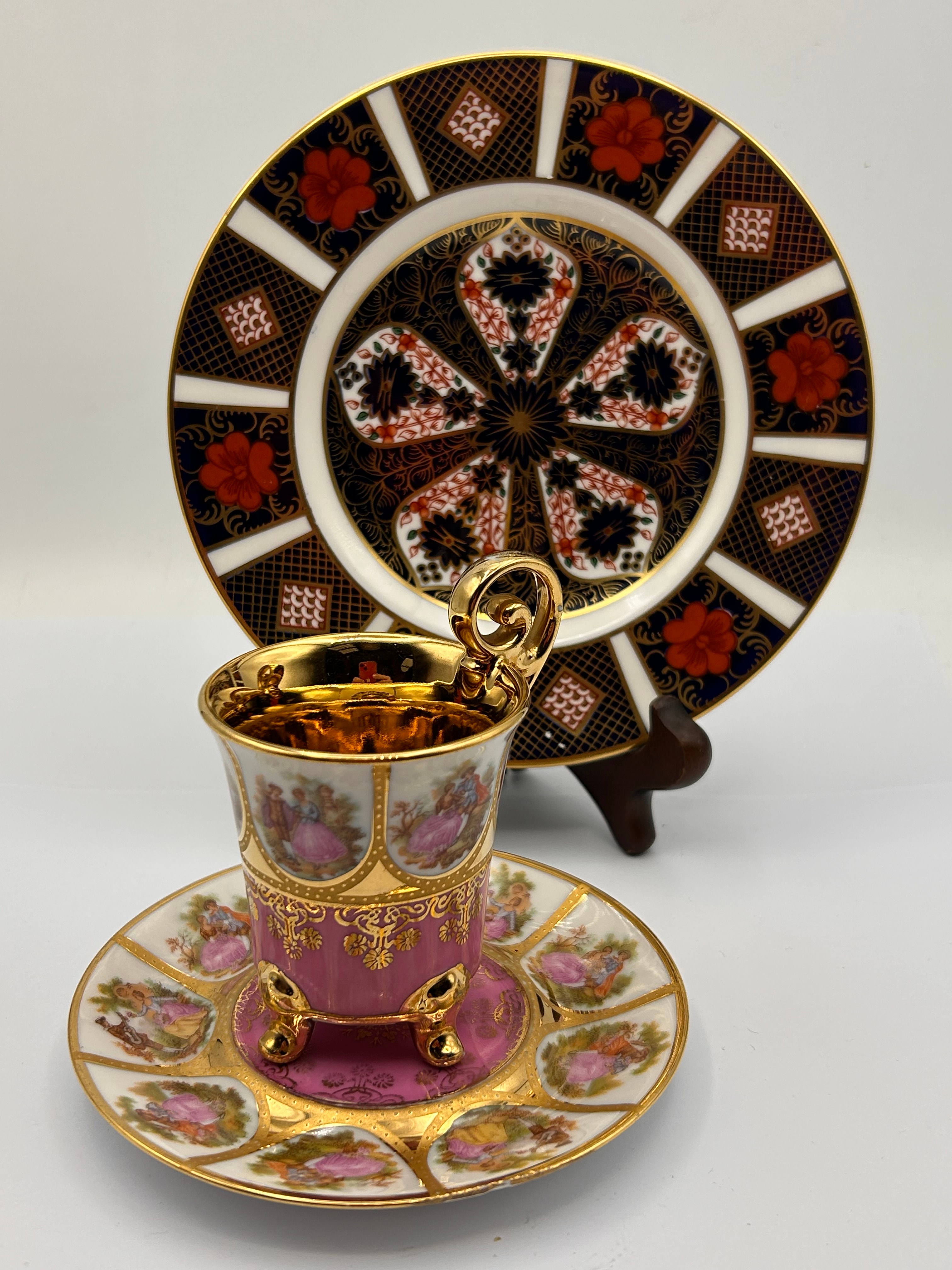 A Royal Crown Derby Old Imari demitasse cup, saucer, and plate. The demitasse cup and saucer are characterized by extensive gold gilding and a vibrant pink ground color on the cup. The cup is supported by three gilded feet and features a scrolled gold handle, along with the saucer, adorned with romantic rococo-style figural scenes within shaped cartouches. The accompanying plate or charger showcases a rich, radial ‘Japan’ or Imari-style pattern in dark blue, red, and gold, incorporating stylized floral and geometric motifs.
