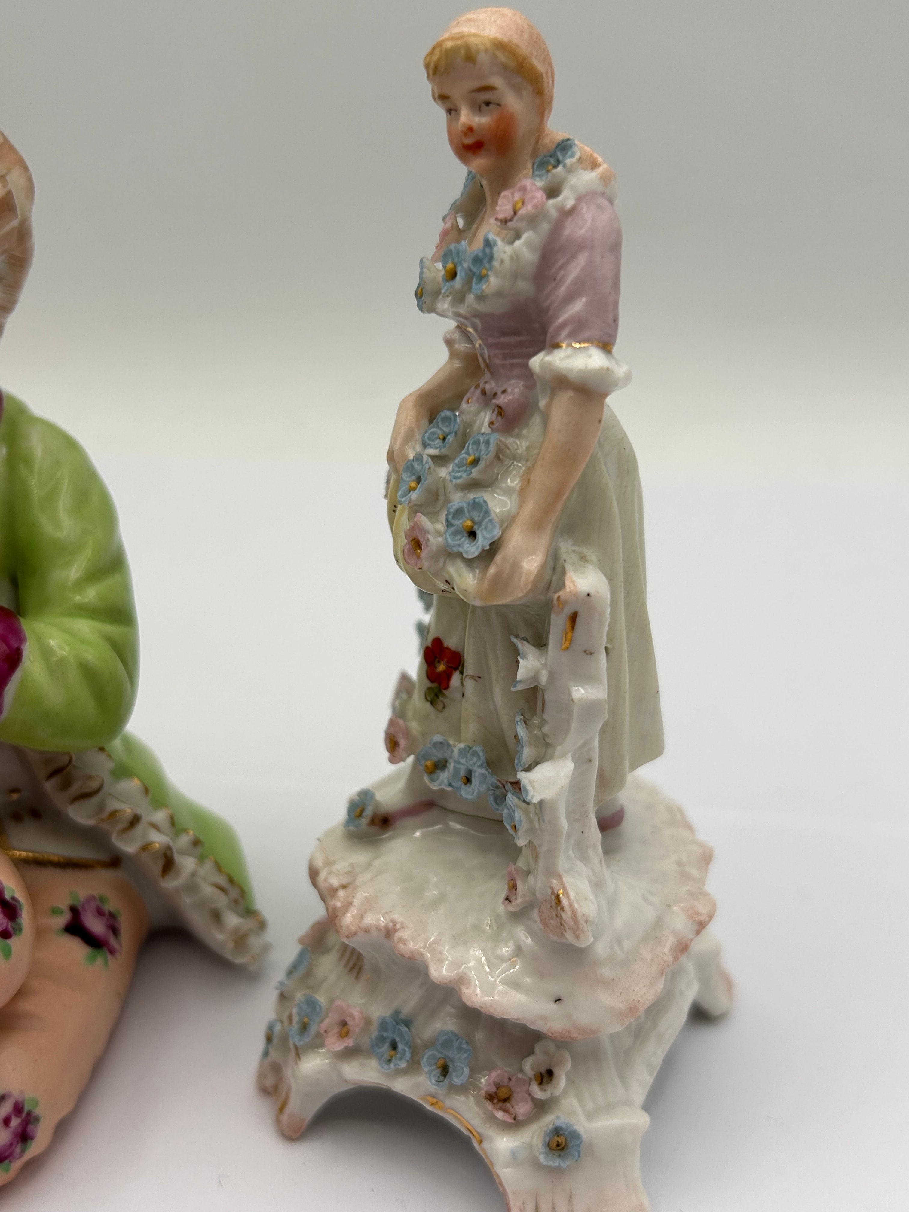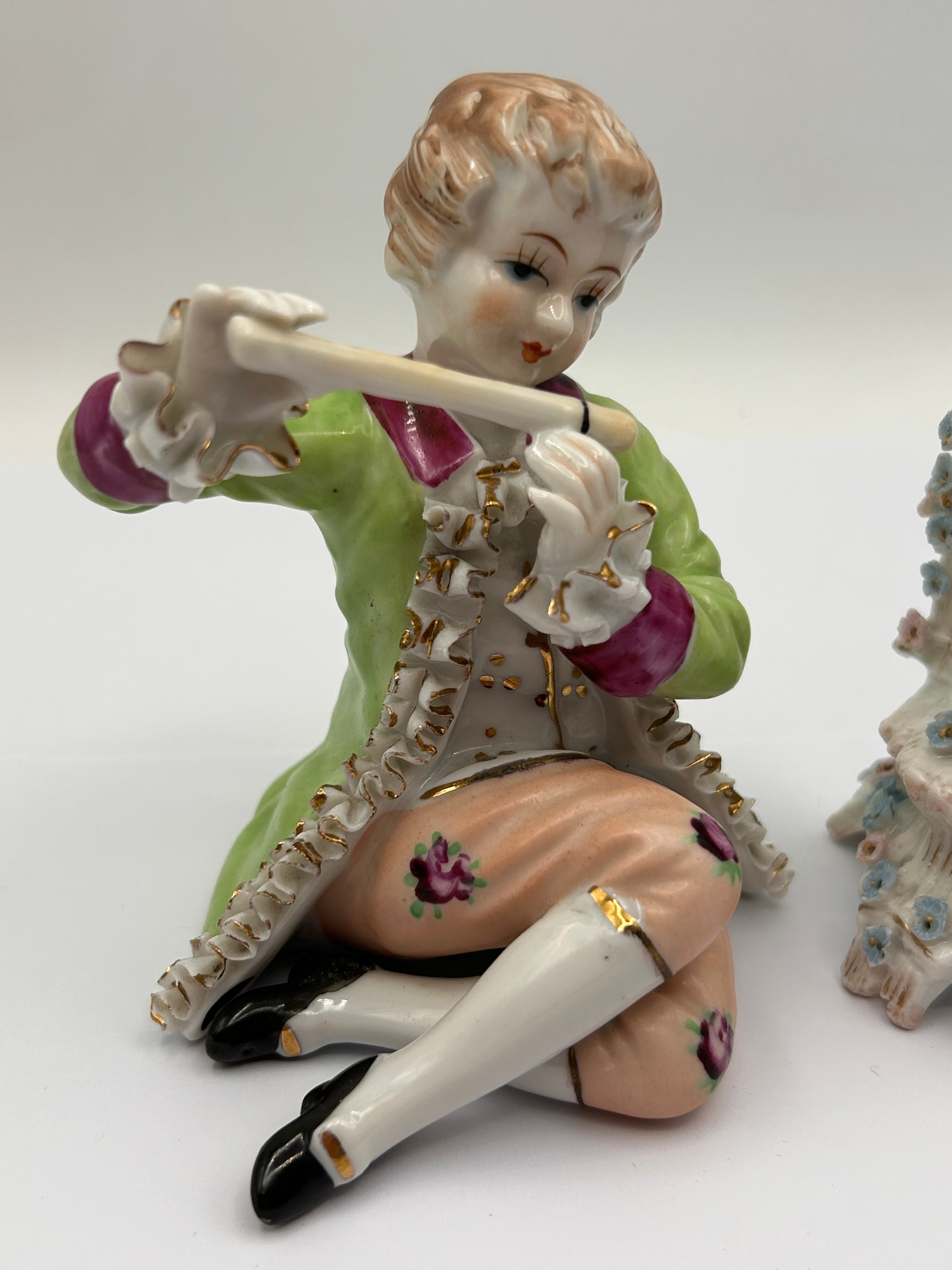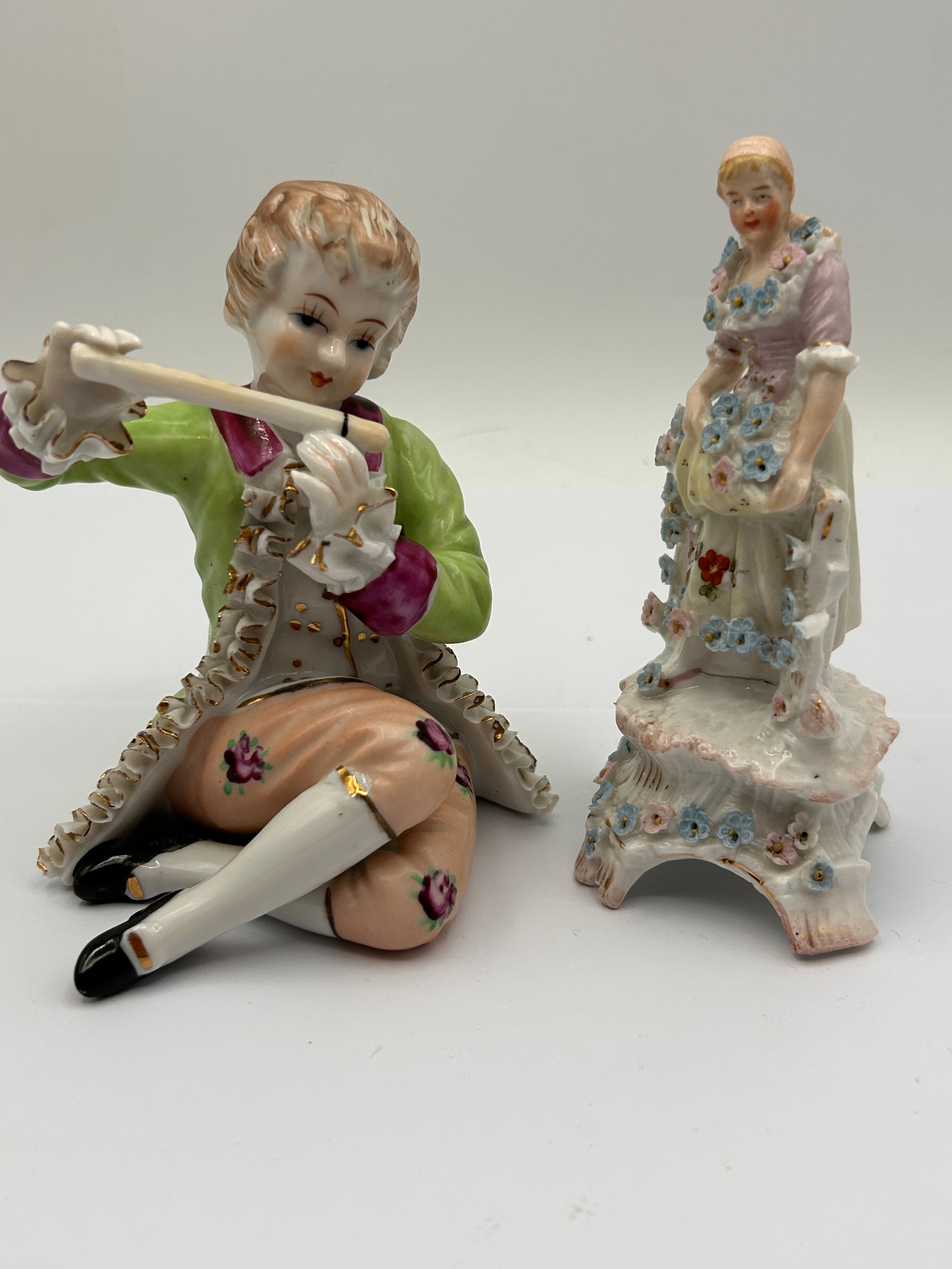 A pair of German Rococo style porcelain figurines, executed in the manner of Meissen. The male figure is depicted seated, playing a flute, dressed in a green coat with gold trim, a white waistcoat, and pink breeches adorned with floral motifs. The female figure stands on an elaborate, scalloped base, wearing a pink bodice and cream skirt, holding an apron filled with pastel flowers. Both pieces feature delicate hand-painted details.