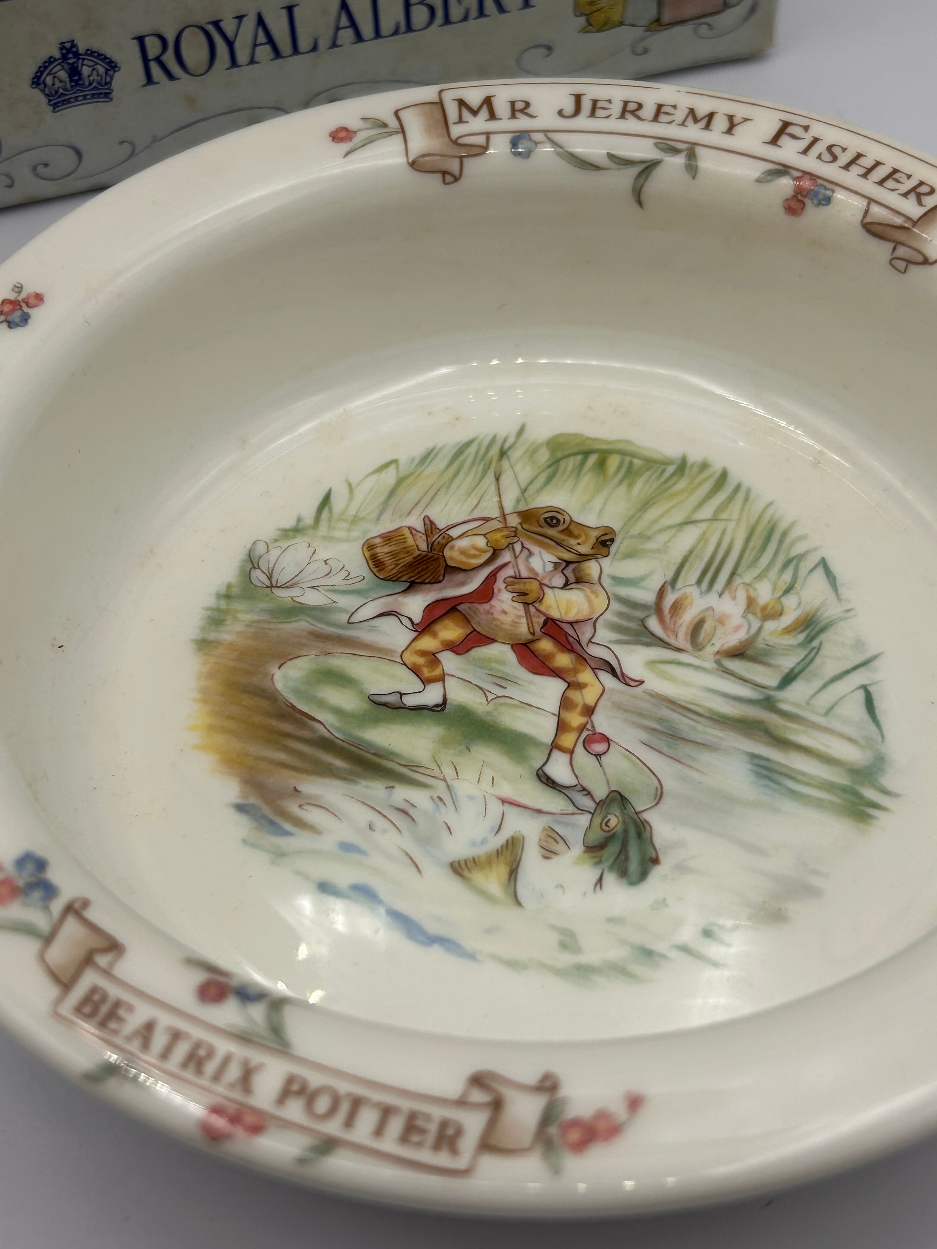 A Royal Albert ‘The World of Beatrix Potter’ ceramic children’s bowl, depicting Mr Jeremy Fisher, dated 1986. The bowl features a central image of the anthropomorphic frog character Mr Jeremy Fisher fishing, with ‘MR JEREMY FISHER’ and ‘BEATRIX POTTER’ inscribed on banners around the rim, accented by small floral designs. It is accompanied by its original packaging box, prominently labeled ‘THE WORLD OF BEATRIX POTTER’ and ‘ROYAL ALBERT’, which also depicts several other Beatrix Potter characters including Mrs. Tittle Mouse, Jemima Puddleduck, Tom Kitten, and Squirrel Nutkin.