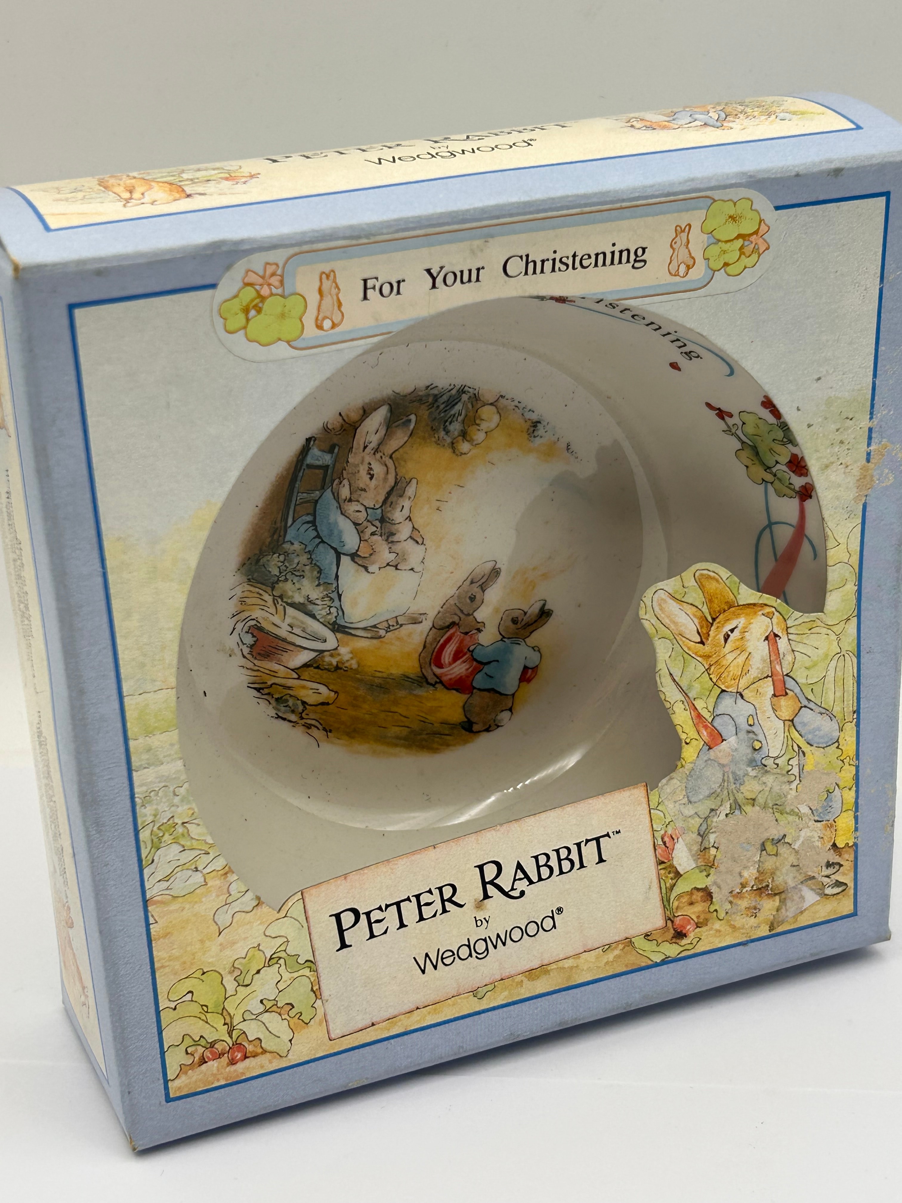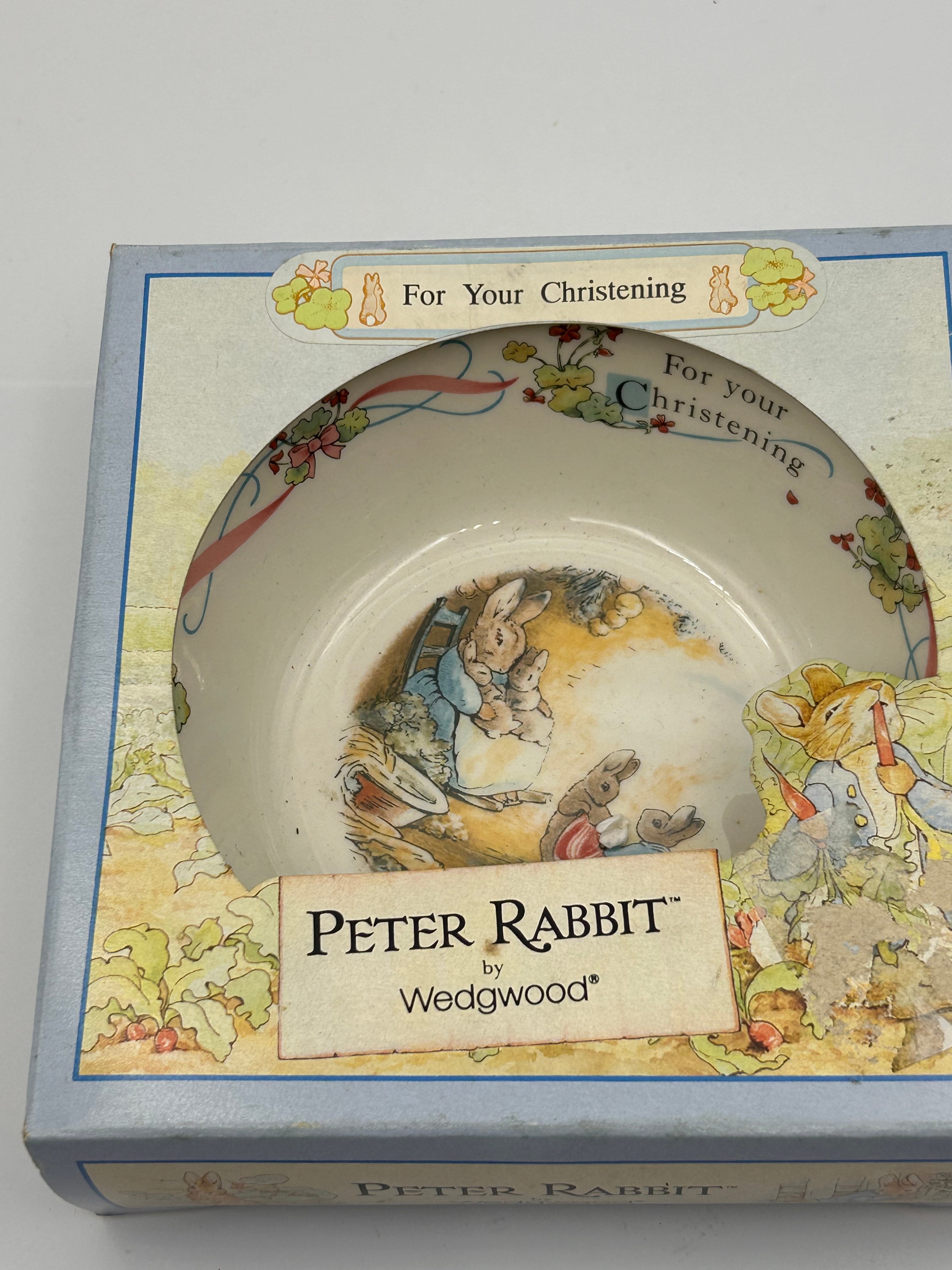 A Wedgwood Peter Rabbit Christening bowl. The ceramic bowl, likely porcelain or bone china, features classic illustrations of Peter Rabbit characters and the text “For your Christening”. It is presented in its original light blue cardboard box, which prominently displays “For Your Christening,” “PETER RABBIT™,” and “by Wedgwood®” on the front. The style of illustration and branding suggests a late 20th to early 21st-century production.