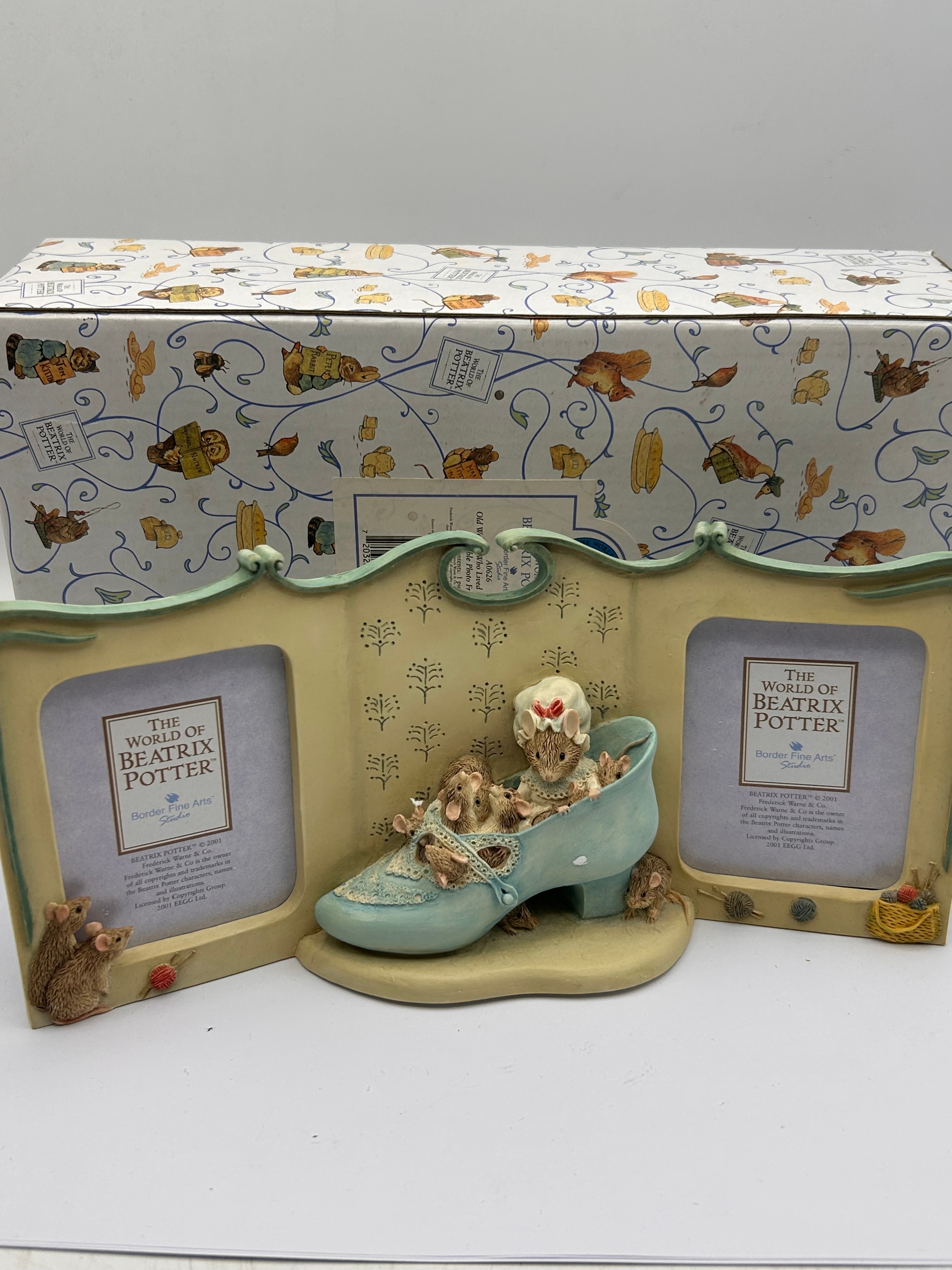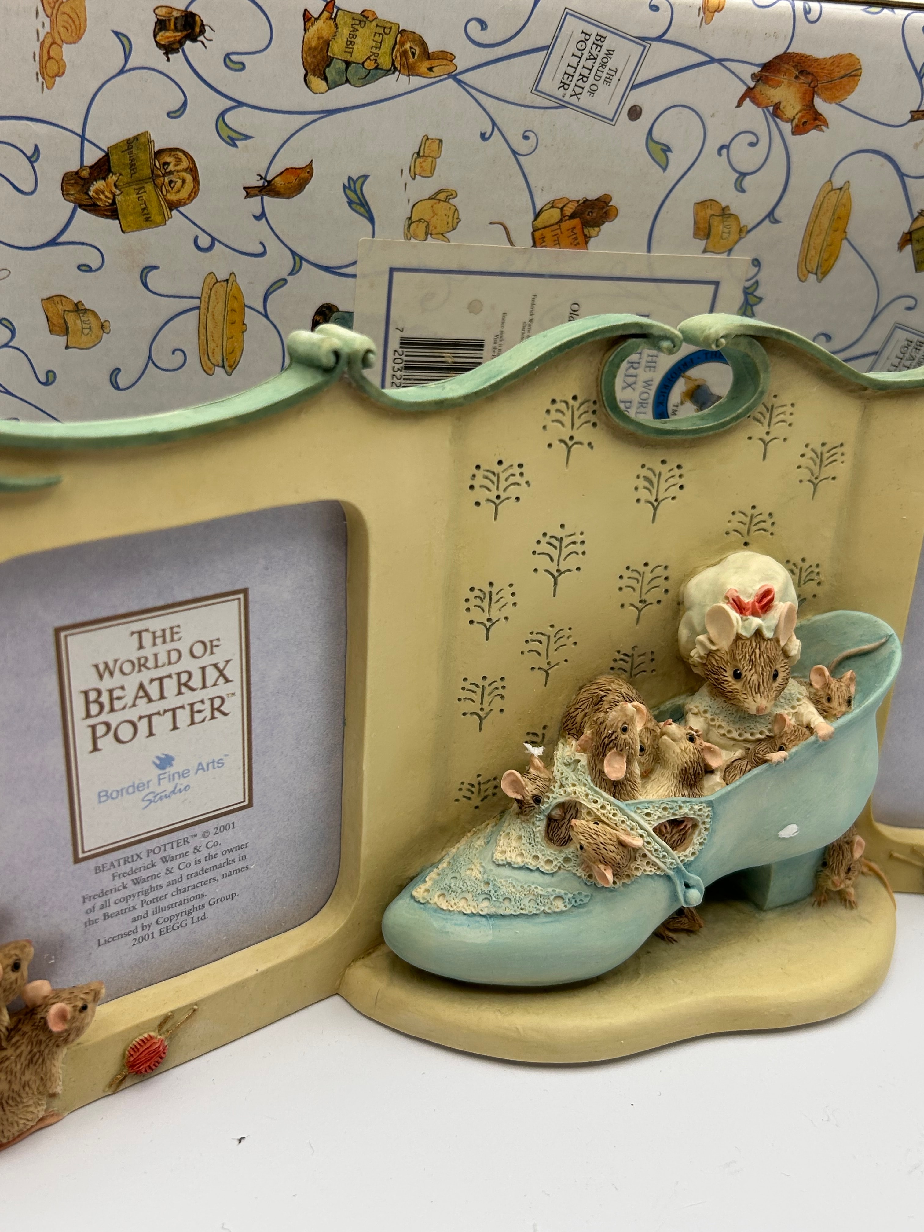 A Border Fine Arts ‘The World of Beatrix Potter’ double photo frame, depicting ‘The Old Woman Who Lived In A Shoe’. This decorative figural multi-opening picture frame is likely made of resin or a similar cold-cast material. It features a whimsical scene from “THE WORLD OF BEATRIX POTTER,” with two arched photo openings bordered in light green. These openings flank a central diorama showing several mouse characters, including one in a white cap and red bow, situated in and around a blue heeled shoe adorned with lace. The item is marked “Border Fine Arts Studio” and includes copyright details “BEATRIX POTTER™ © 2001 Frederick Warne & Co. Licensed by Copyright Group, EGG Ltd.” It is accompanied by its original decorative box, which features various Beatrix Potter illustrations.