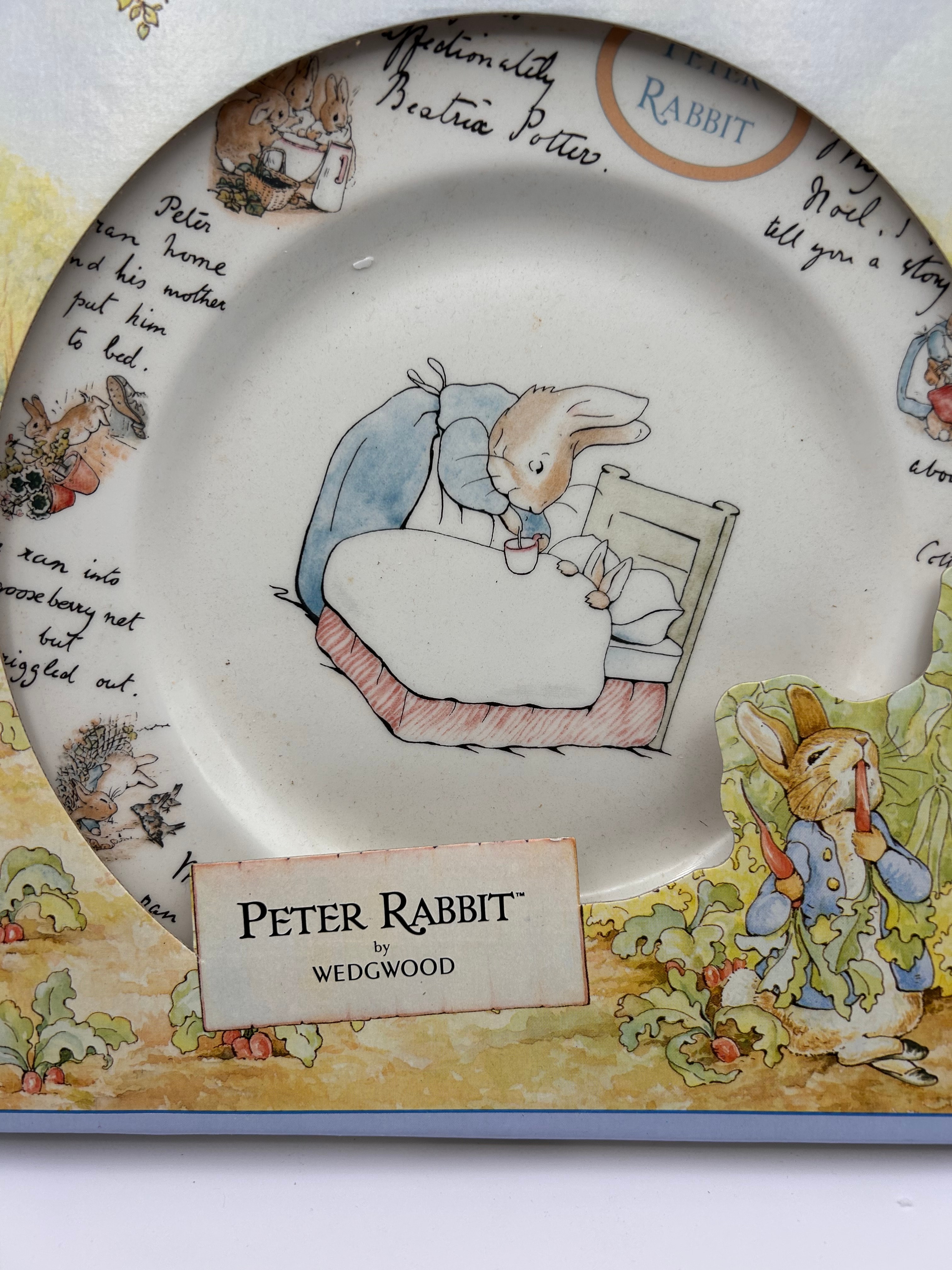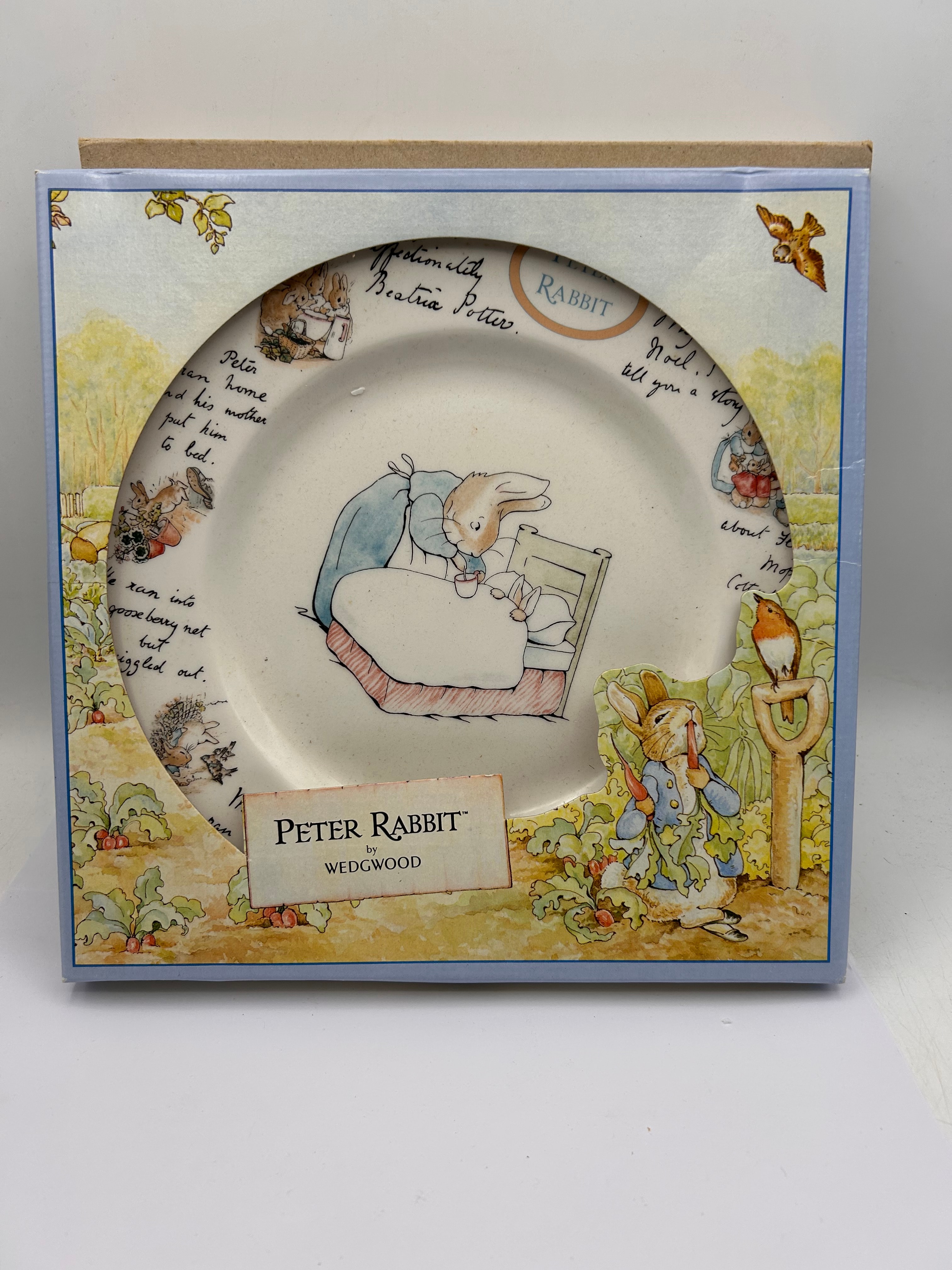 A Peter Rabbit by WEDGWOOD porcelain cake plate, produced by Frederick Warne. The plate features illustrations from Beatrix Potter’s “Peter Rabbit,” with a central image depicting a rabbit in bed being tended to. The rim includes additional character illustrations and handwritten-style text excerpts from the story, such as “Peter ran home,” “his mother put him to bed,” “ran into gooseberry net,” and “wiggled out.” The item is presented in its original cardboard box, which, along with the plate’s insert, identifies the item as “PETER RABBIT™ by WEDGWOOD,” with “affectionately Beatrix Potter” also visible on the box.