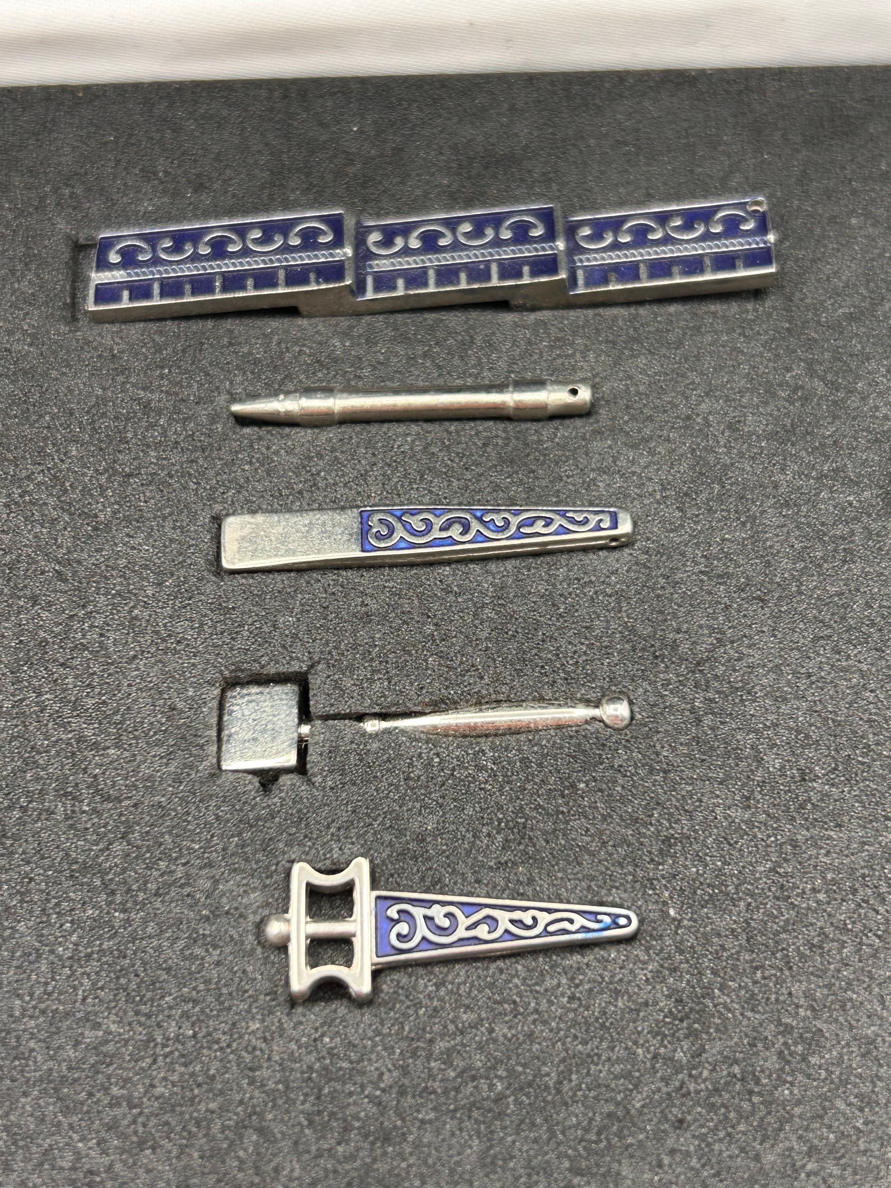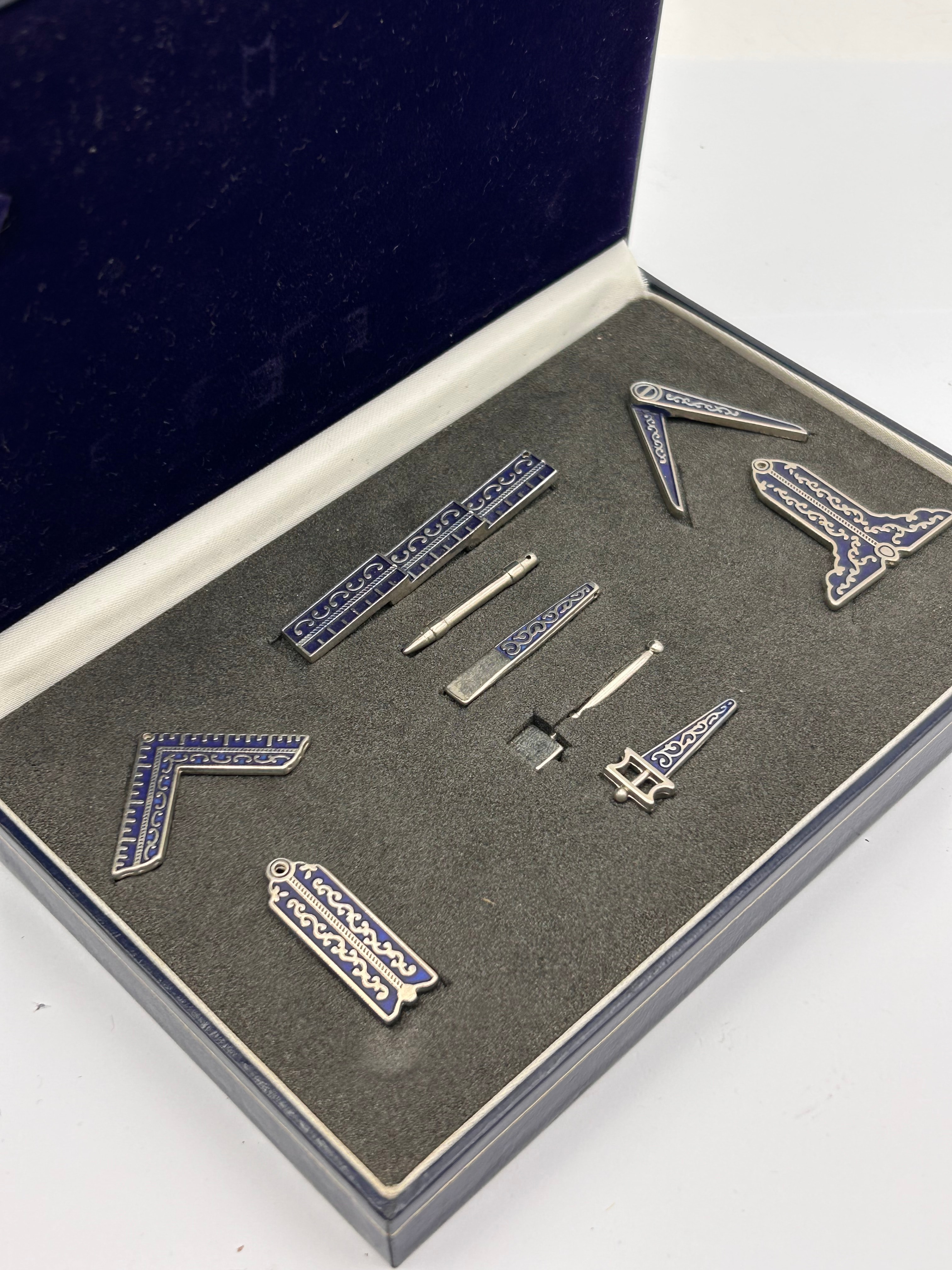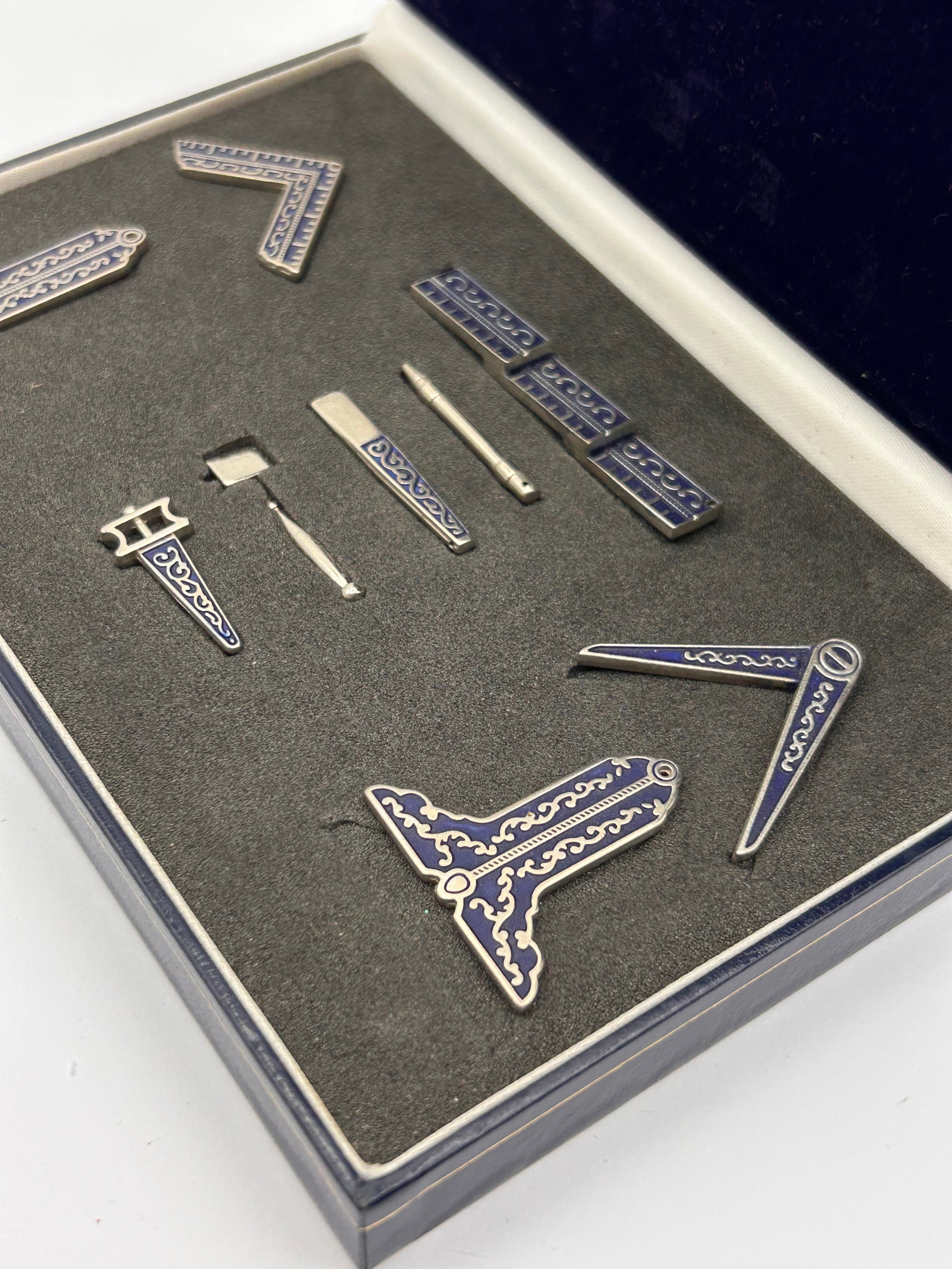 A set of eleven miniature Masonic working tools, presented in a dark blue hinged box with a velvet-lined lid and a dark grey fitted foam insert. Each piece is crafted from silver-toned metal, featuring extensive dark blue enamel inlay with a scrolling or interlocking curvilinear pattern. The individual pieces include several L-shaped rulers, some with engraved incremental markings; a segmented straight bar; a cylindrical pointed rod; a flat rectangular tool; a miniature hammer/mallet; a plumb-bob-like tool; a sword or dagger-shaped emblem; and two additional ornate, possibly stylized, tools or emblems, one with a wing-like form and another L-shape incorporating a circular element.
