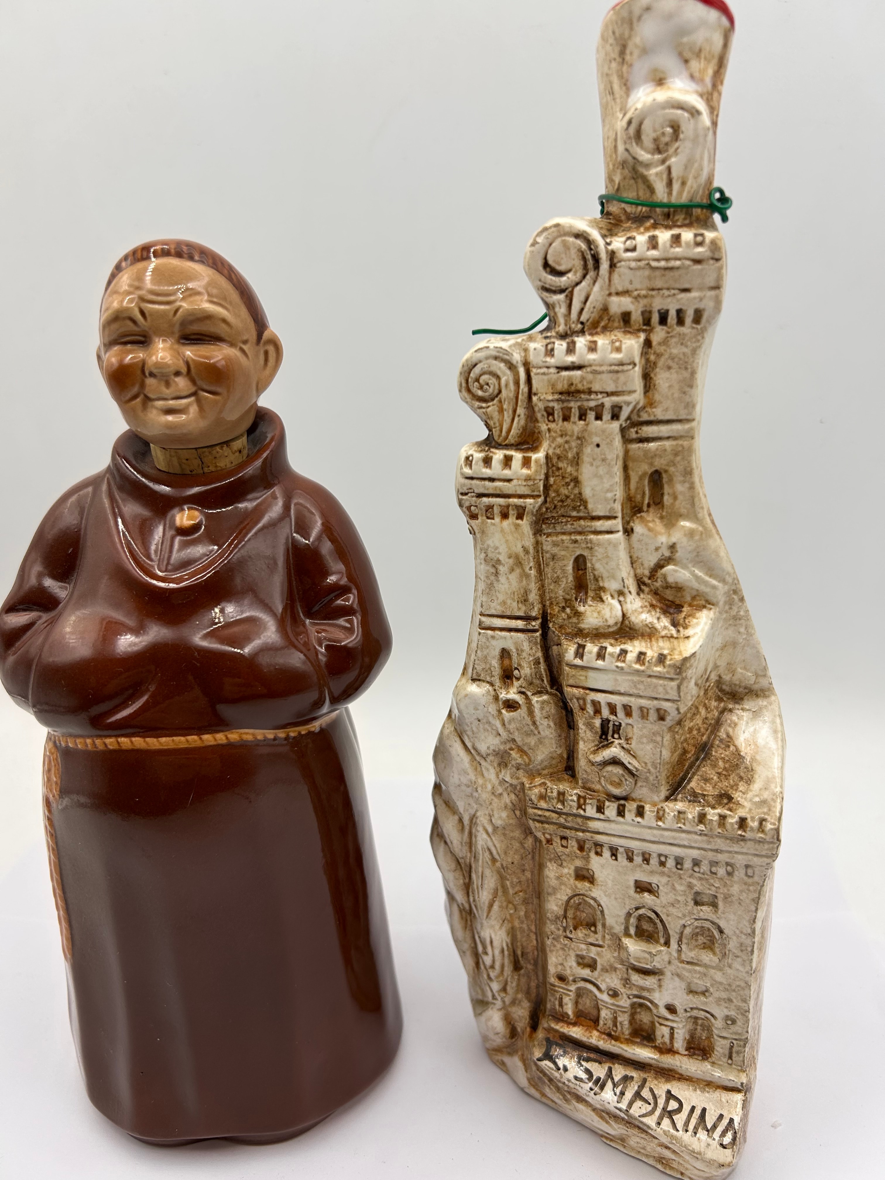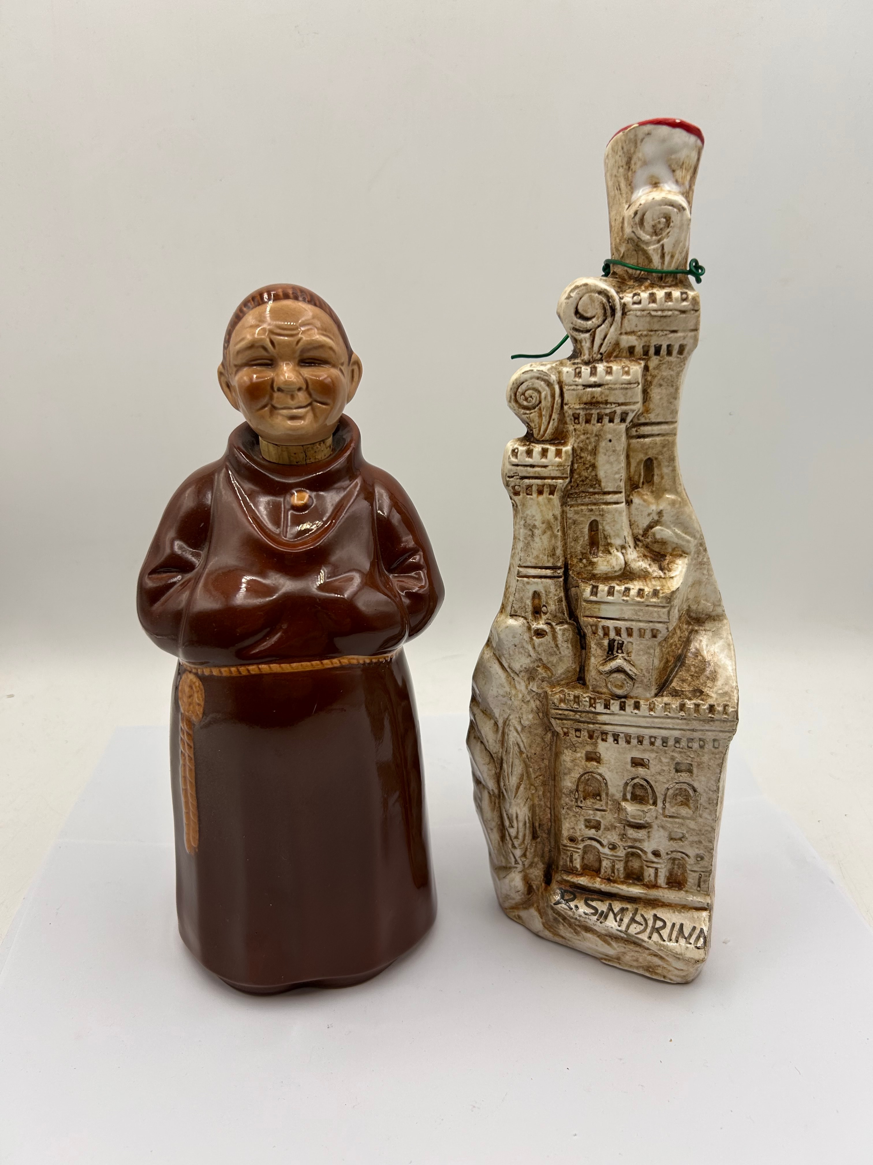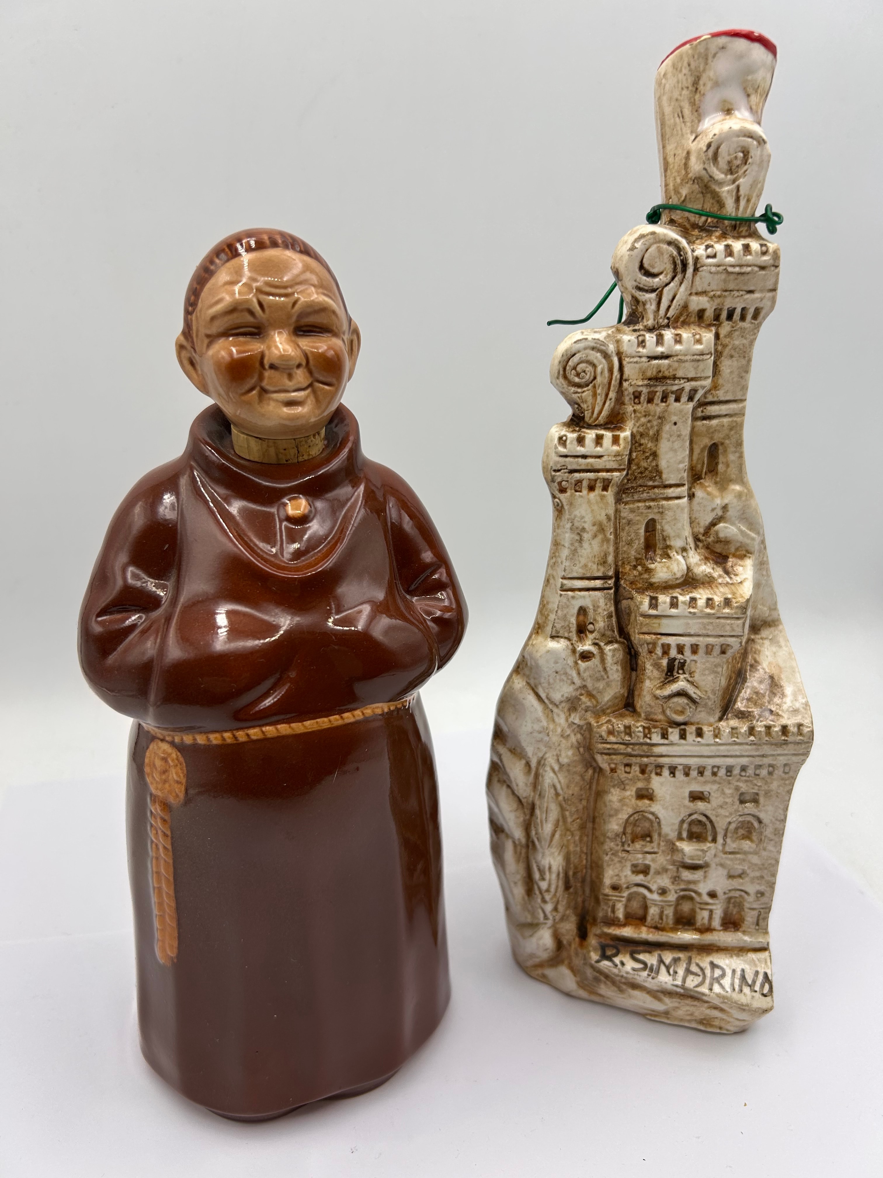 A vintage ceramic whiskey bottle, molded in relief to resemble a castle or fortress with multiple towers, inscribed “S. MARINO” and “R. S. MARINO” on its base, consistent with examples identified as ‘R.S. Marino Castle Form Whiskey Bottle’ in market reports. Presented in an off-white glaze with darker patination highlighting its textured details, with a green cord tied around its neck and a red-topped stopper partially visible. Accompanied by a figural ceramic decanter depicting a smiling monk or friar in a brown habit, with a visible cork stopper in its neck. Both items are glazed.