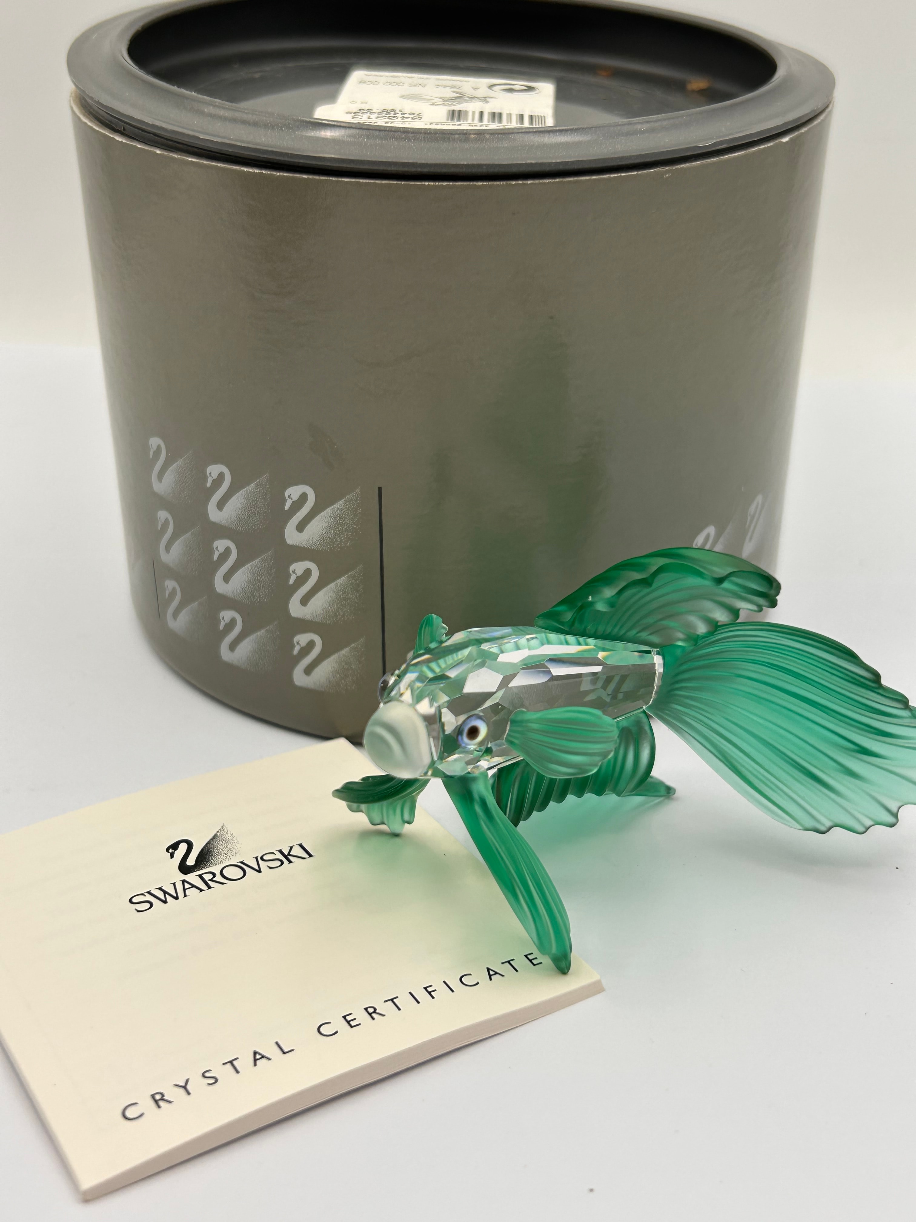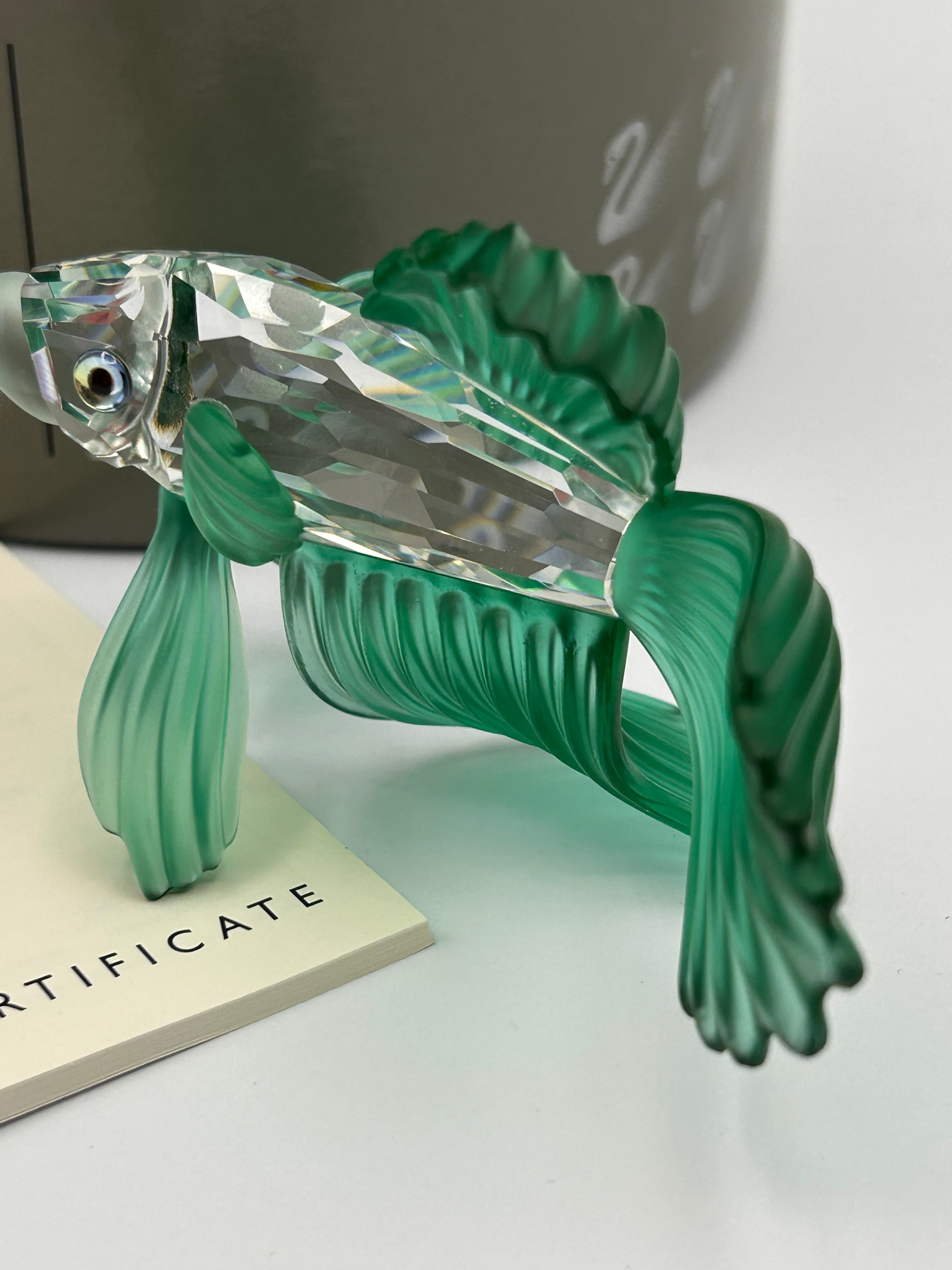 A Swarovski Crystal Siamese Fighting Fish Green Figurine. Crafted from faceted crystal with a clear body and translucent green fins and tail. The item is accompanied by its original grey cylindrical packaging box, adorned with the repeated Swarovski swan logo, and a paper ‘CRYSTAL CERTIFICATE’ bearing the ‘SWAROVSKI’ brand name.