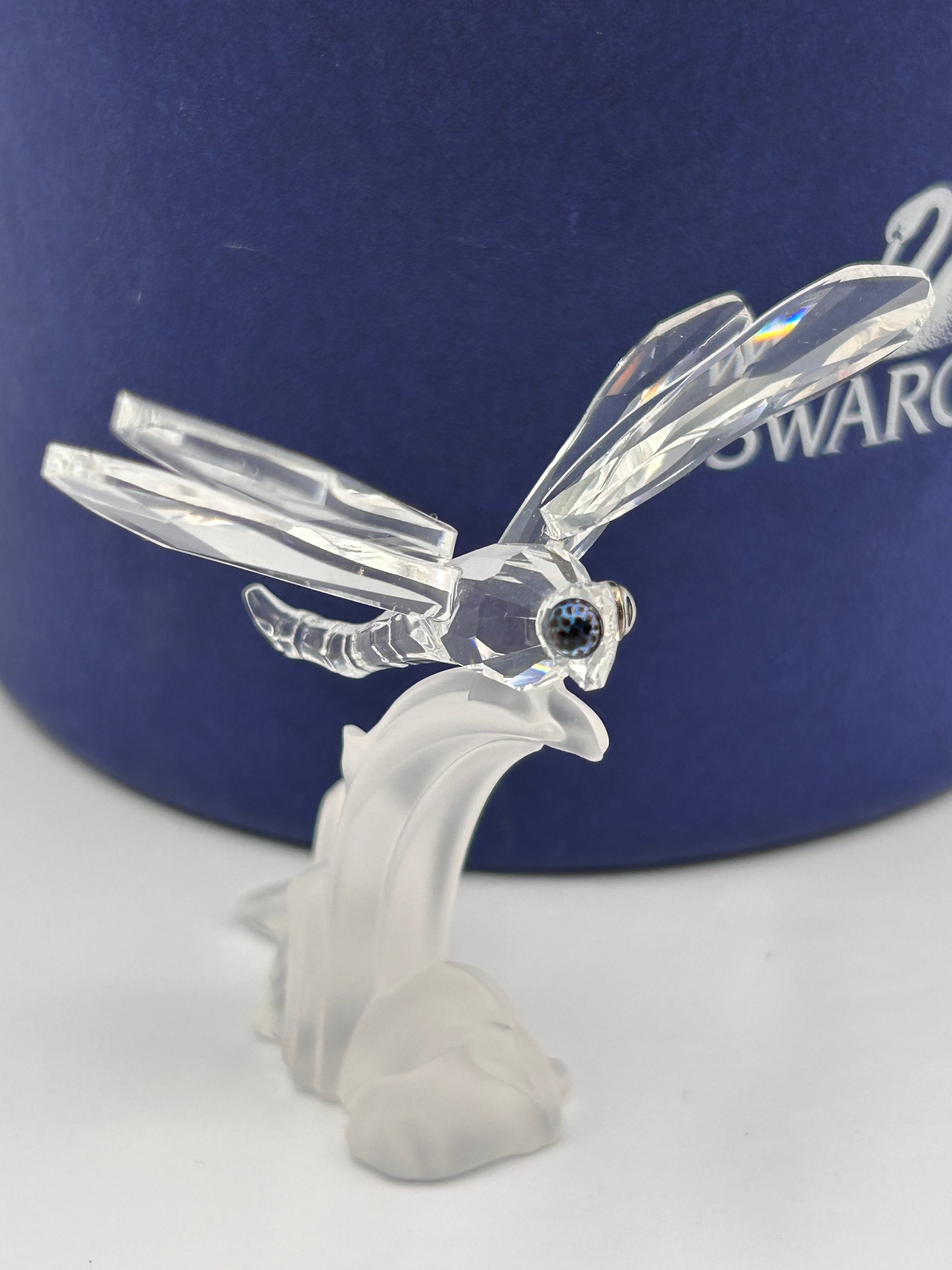 A Swarovski crystal figurine, model 190264, depicting a dragonfly. The figurine is crafted from clear, faceted crystal, featuring blue eyes and perched on a frosted crystal base. It is accompanied by its original dark blue cylindrical presentation box, which displays the ‘SWAROVSKI’ brand name and swan logo.