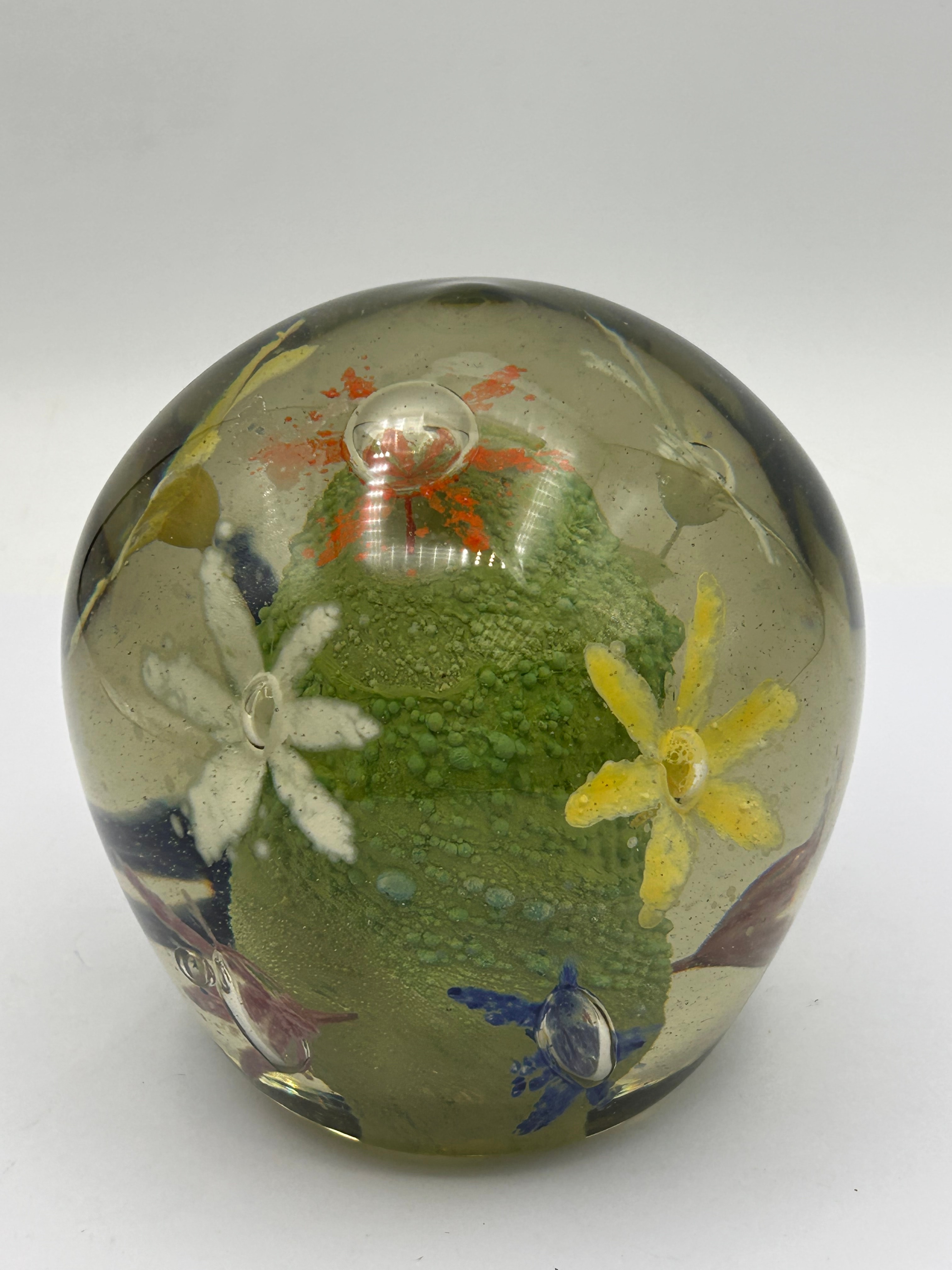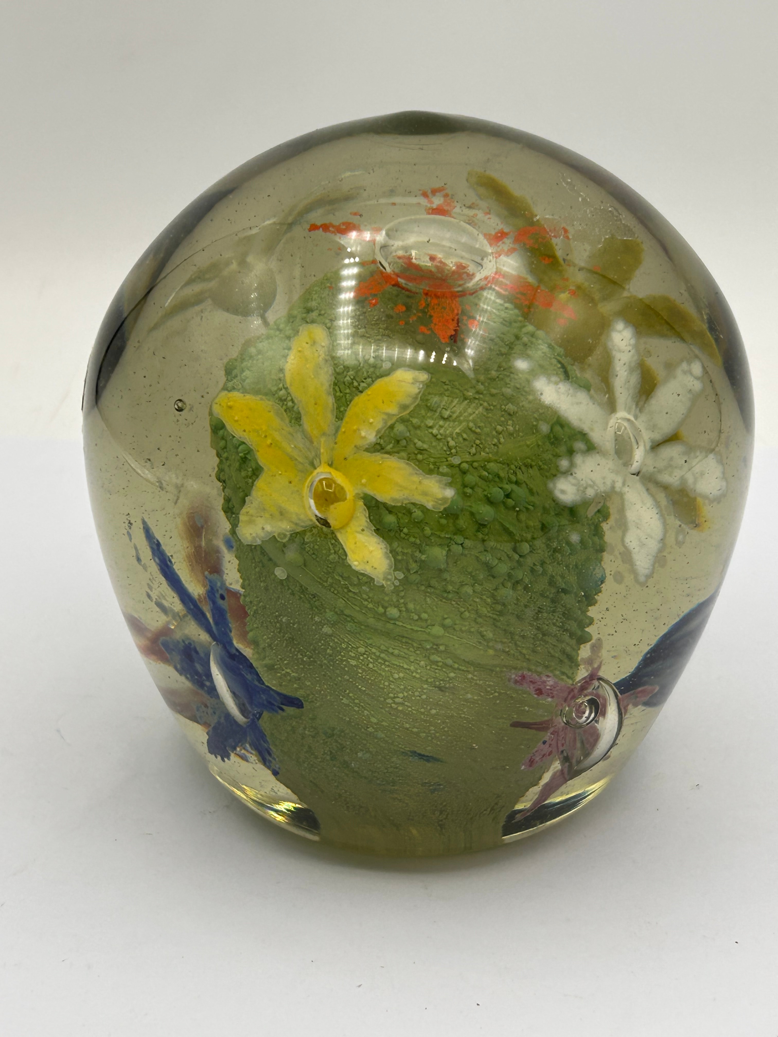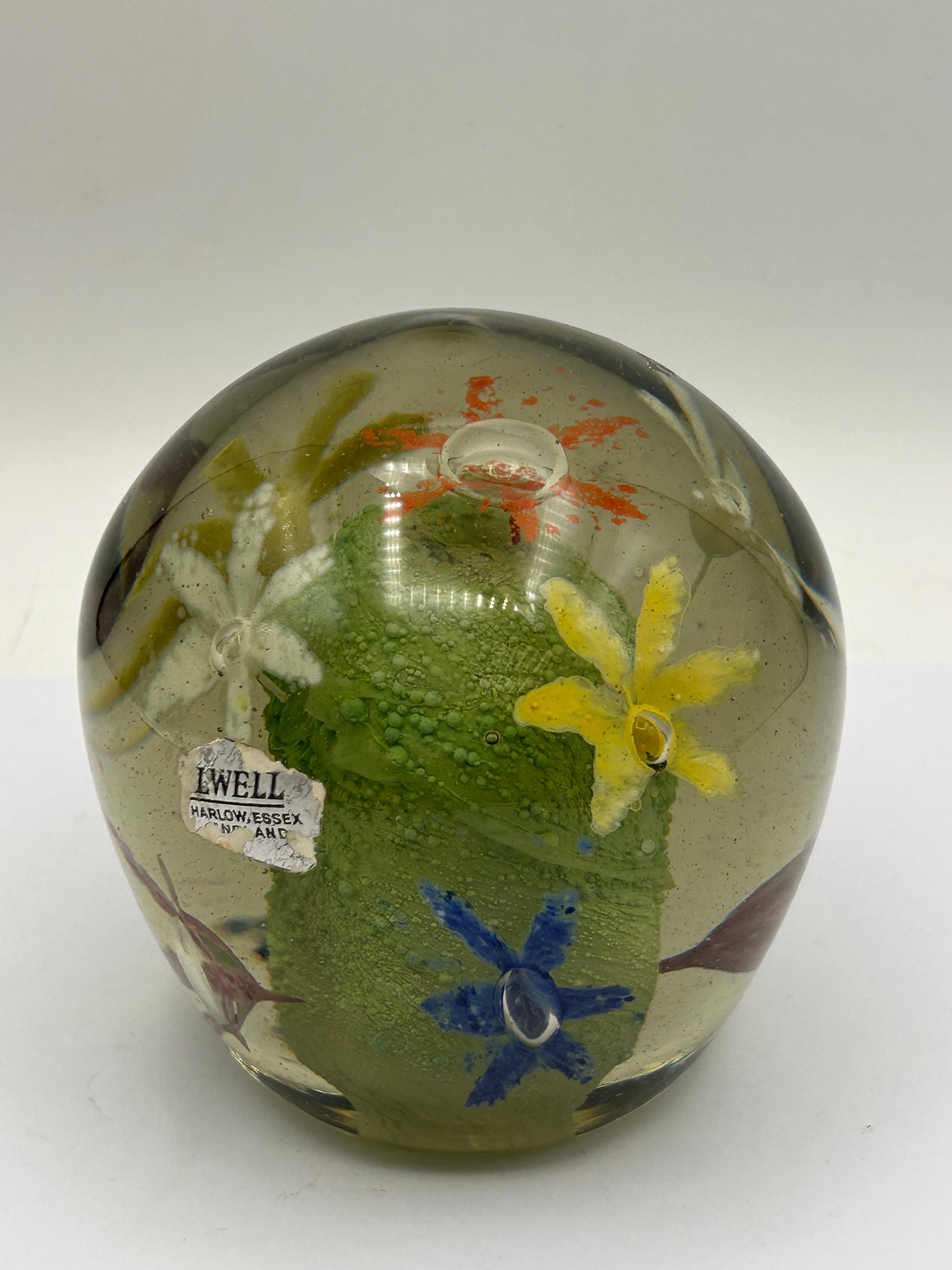 A spherical glass paperweight, featuring a clear glass exterior with a subtle smoky or yellowish tint. Internally, it encases a textured, mottled green organic form, possibly abstract or resembling moss, surrounded by several embedded, stylized glass floral elements in white, yellow, orange, blue, and reddish-purple, frequently accompanied by small air bubbles. A white rectangular label is affixed to the side, displaying black text that reads “LWELL”, “HARLOW, ESSEX”, “N°”, and “AND”.