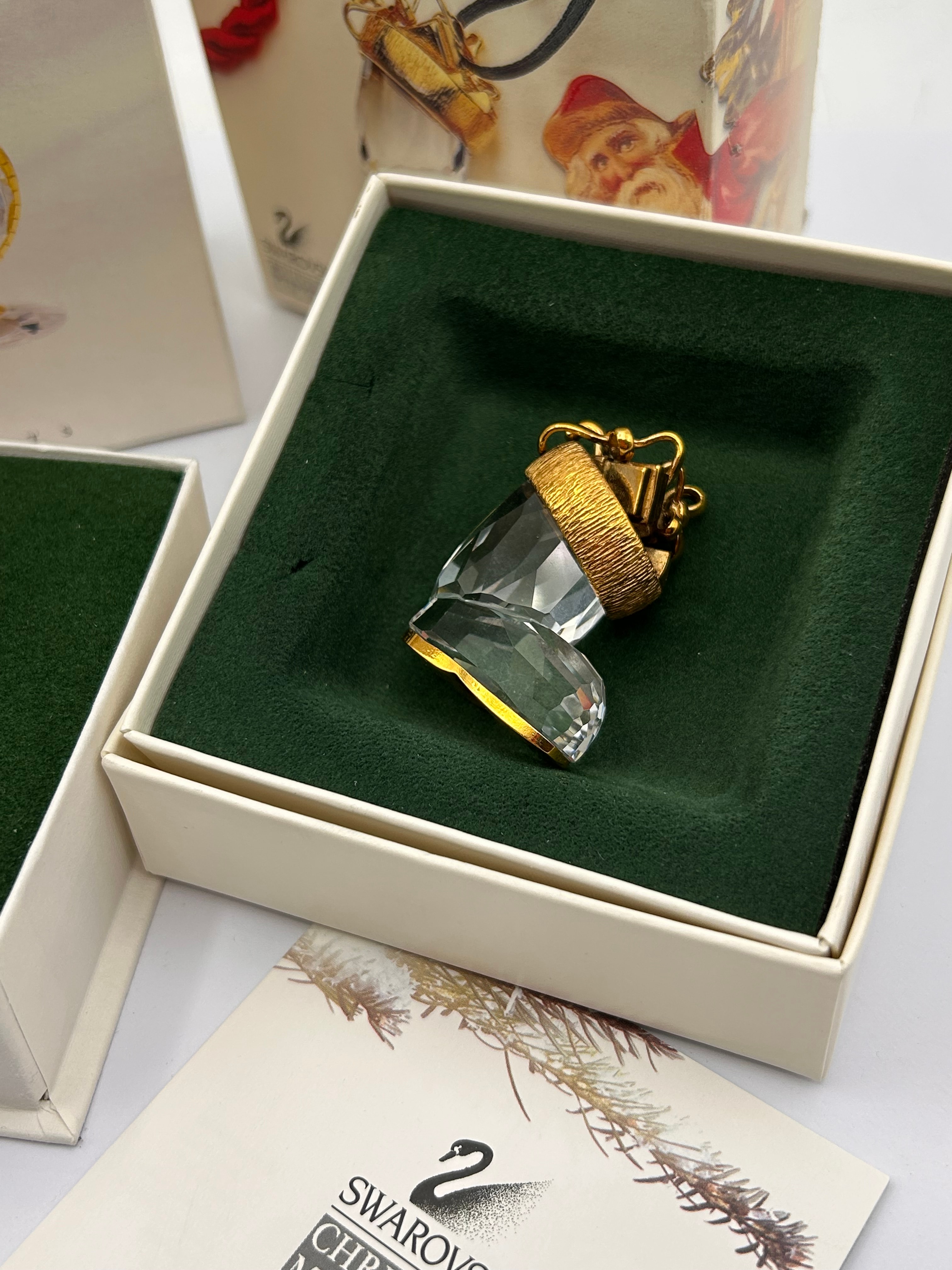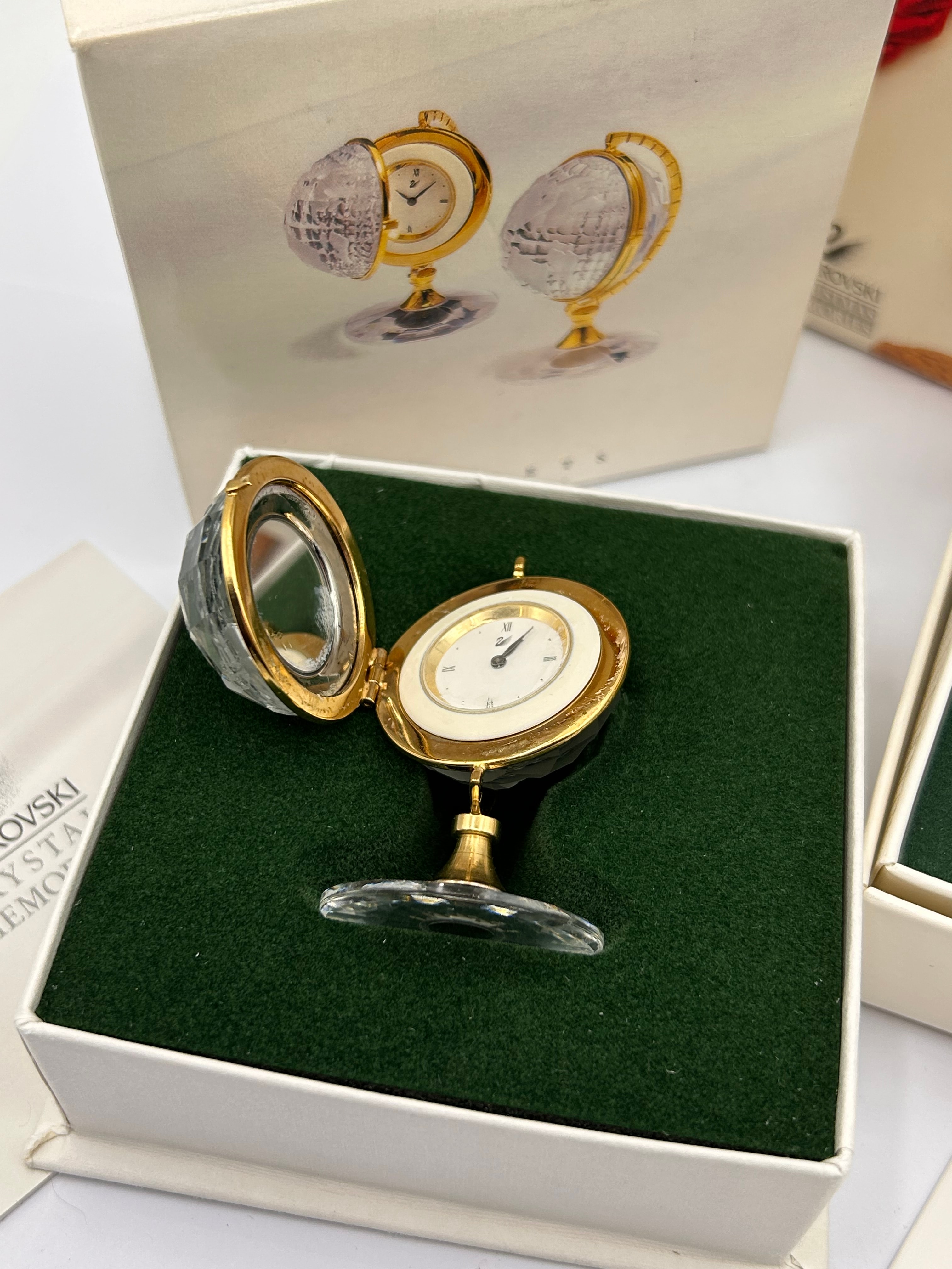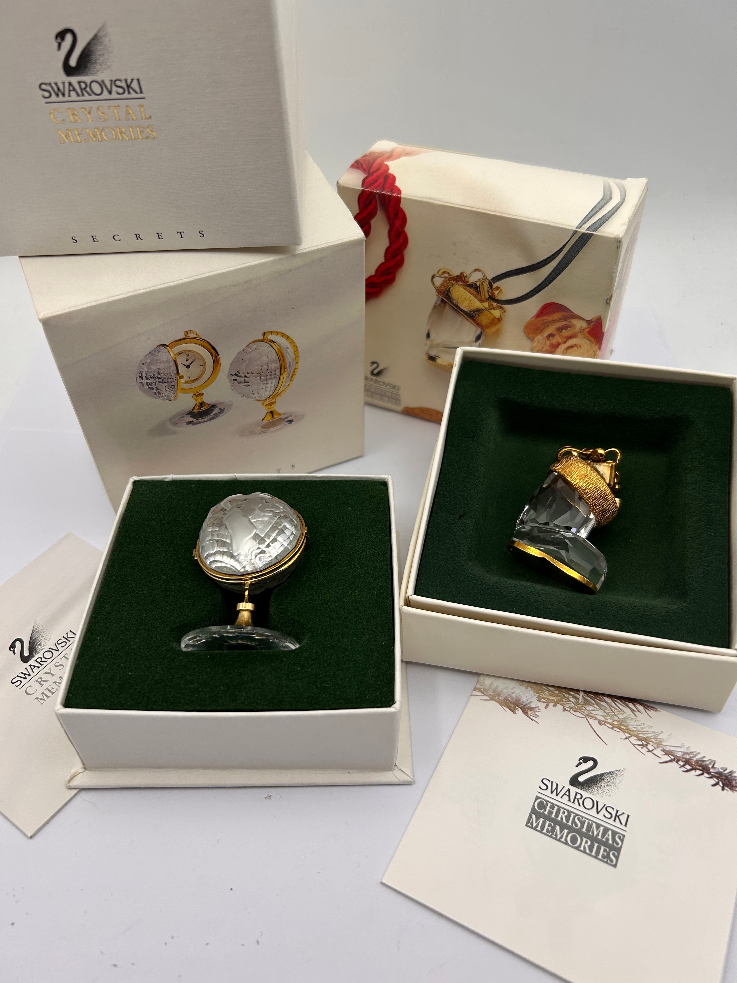 A group of three boxed Swarovski crystal decorative objects, predominantly clear faceted crystal accented with gold-tone metal. One item is a miniature globe-shaped clock, identified as a Swarovski Crystal Miniature Globe Clock, which hinges open to reveal a white clock face with black Roman numerals, presented on a clear crystal base. Another item is a miniature Christmas stocking or boot, featuring clear faceted crystal with a textured gold-tone metal cuff. All items are clearly branded “SWAROVSKI” with the iconic swan logo on their original fitted boxes and accompanying leaflets. Series names “CRYSTAL MEMORIES,” “SECRETS,” and “CHRISTMAS MEMORIES” are prominently indicated on the packaging.