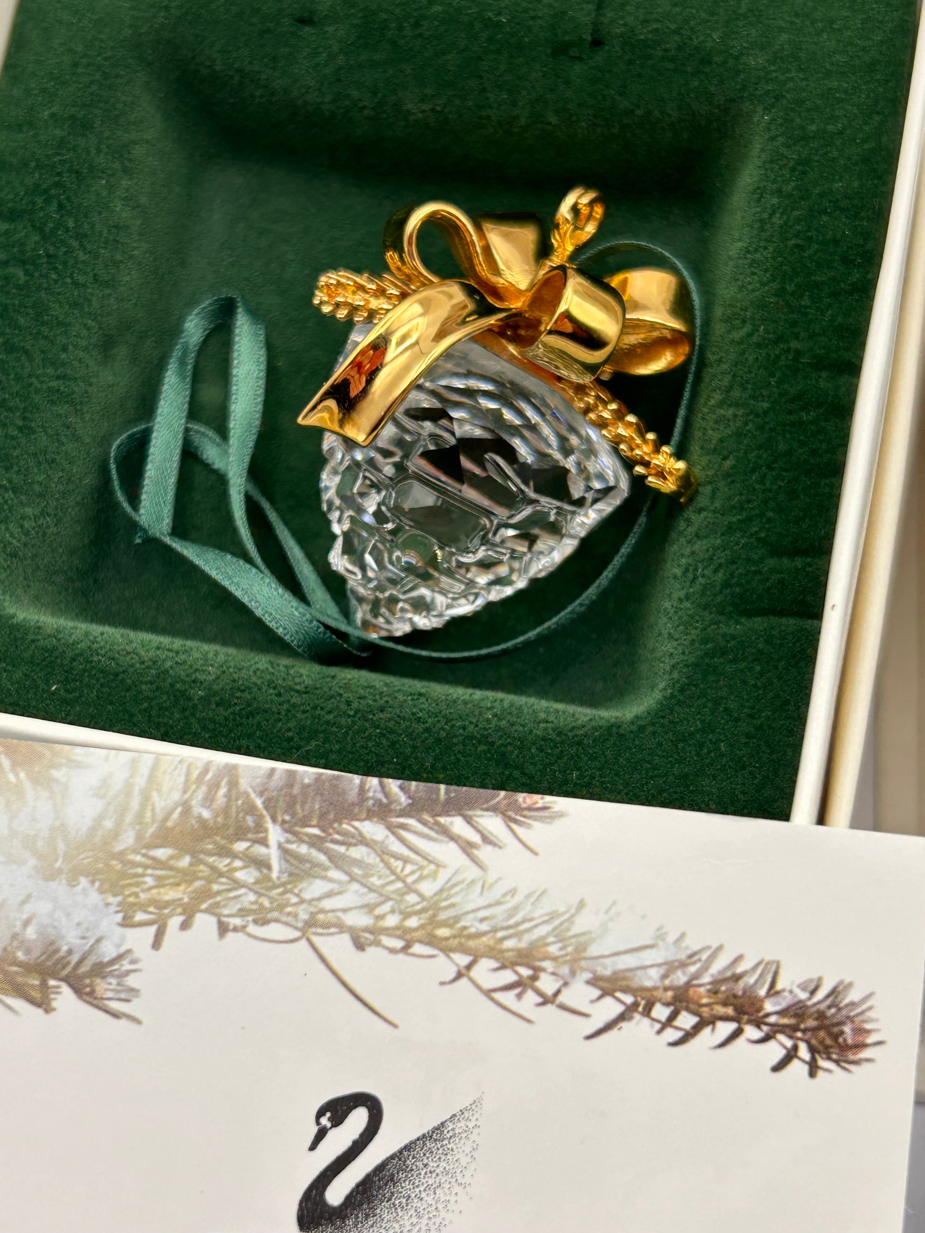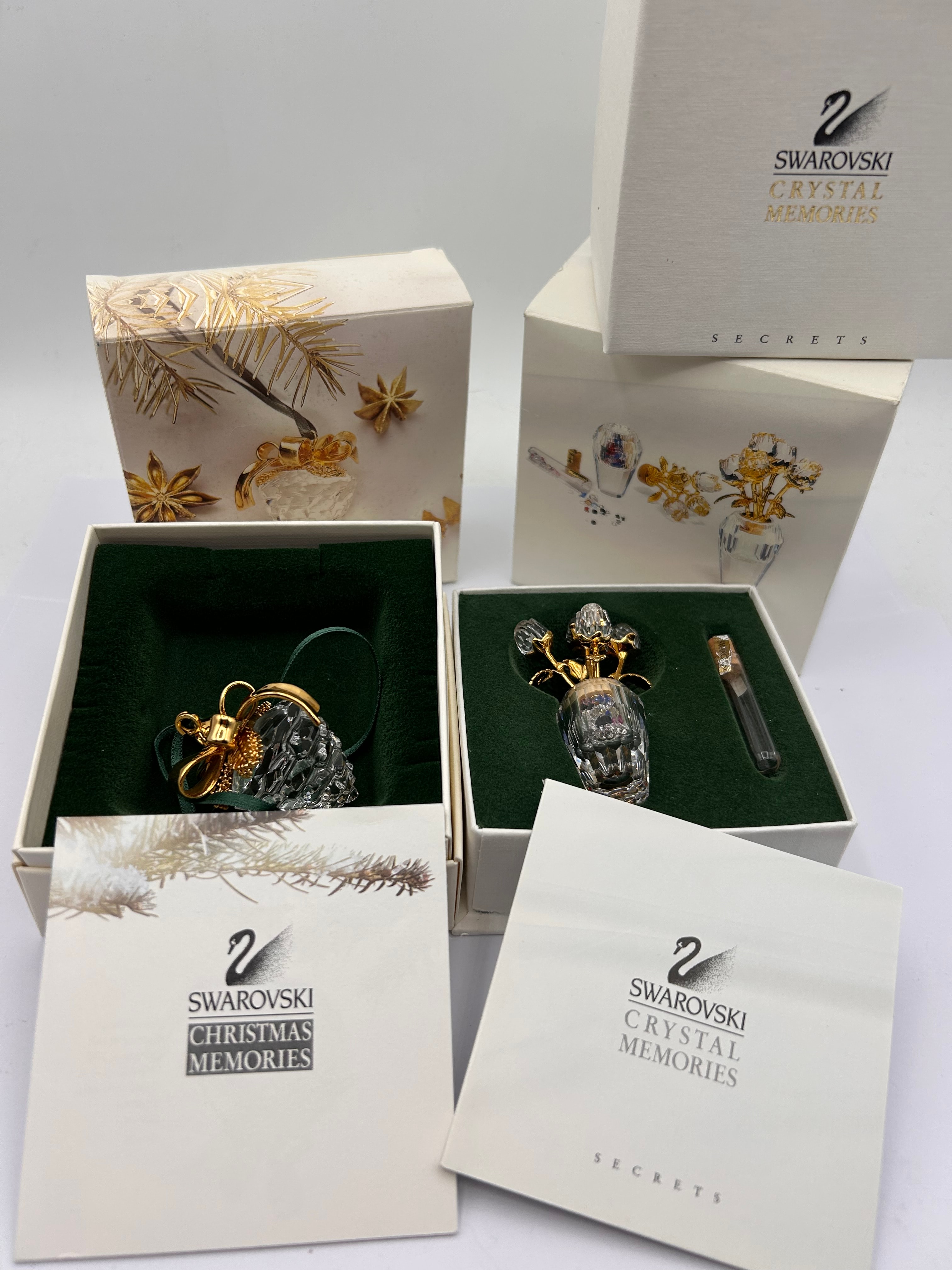 A pair of Swarovski Crystal Memories items. The first item is a ‘Christmas Memories Pine Cone’ ornament, composed of a faceted clear crystal pine cone form accented with a gold-tone metal bow and a green hanging ribbon. Web intelligence suggests this ornament is commonly described as 18K gold plated. The second item, from the ‘Crystal Memories Secrets’ line, is a figurine depicting gold-tone stemmed flowers with faceted clear crystal heads set in a faceted clear crystal vase containing small multi-colored crystals. It is accompanied by a small glass vial with a cork stopper explicitly marked “SWAROVSKI.” Both pieces are housed in their original white boxes, each featuring a green velvet-lined interior and accompanying branded paperwork.