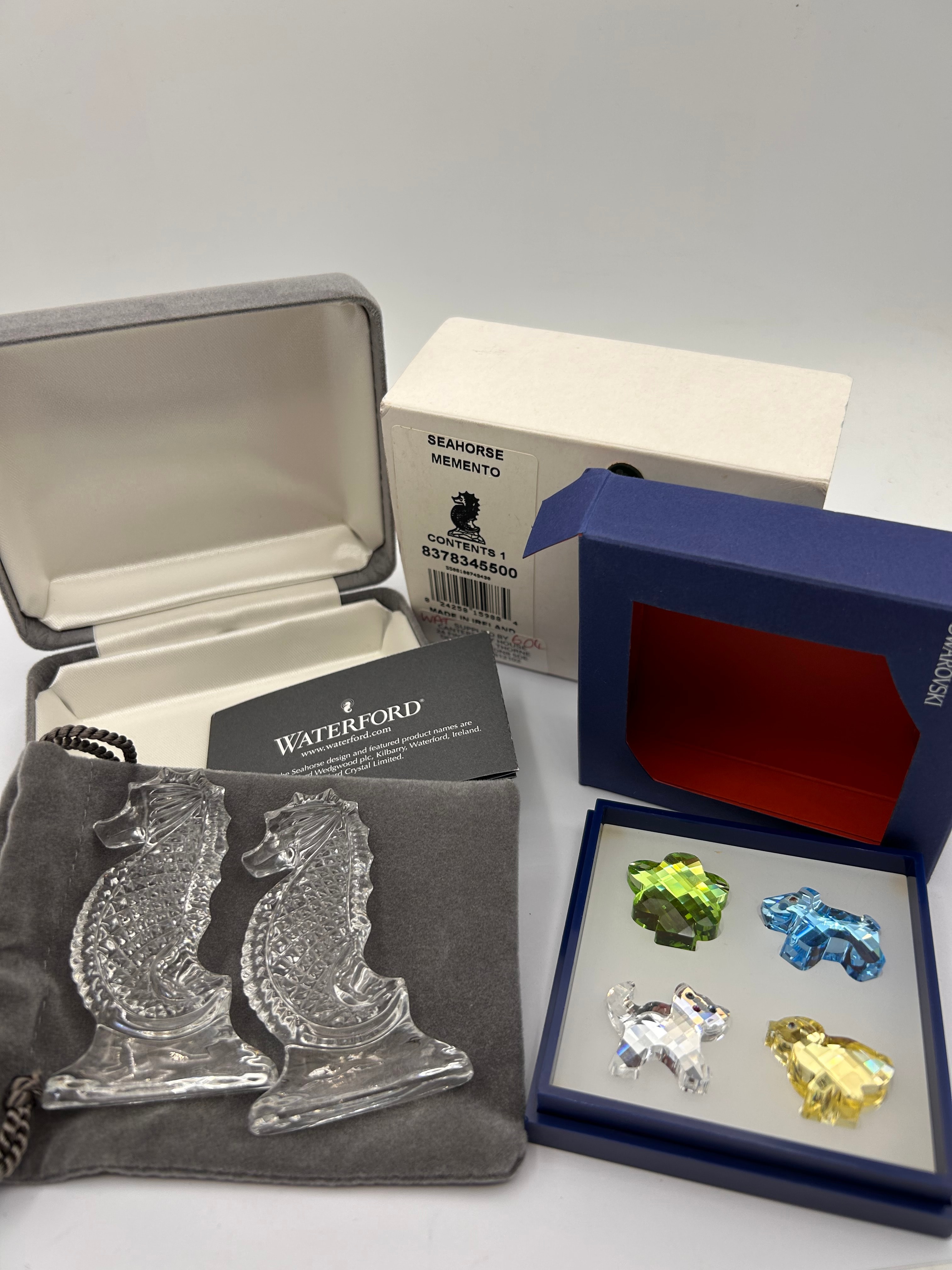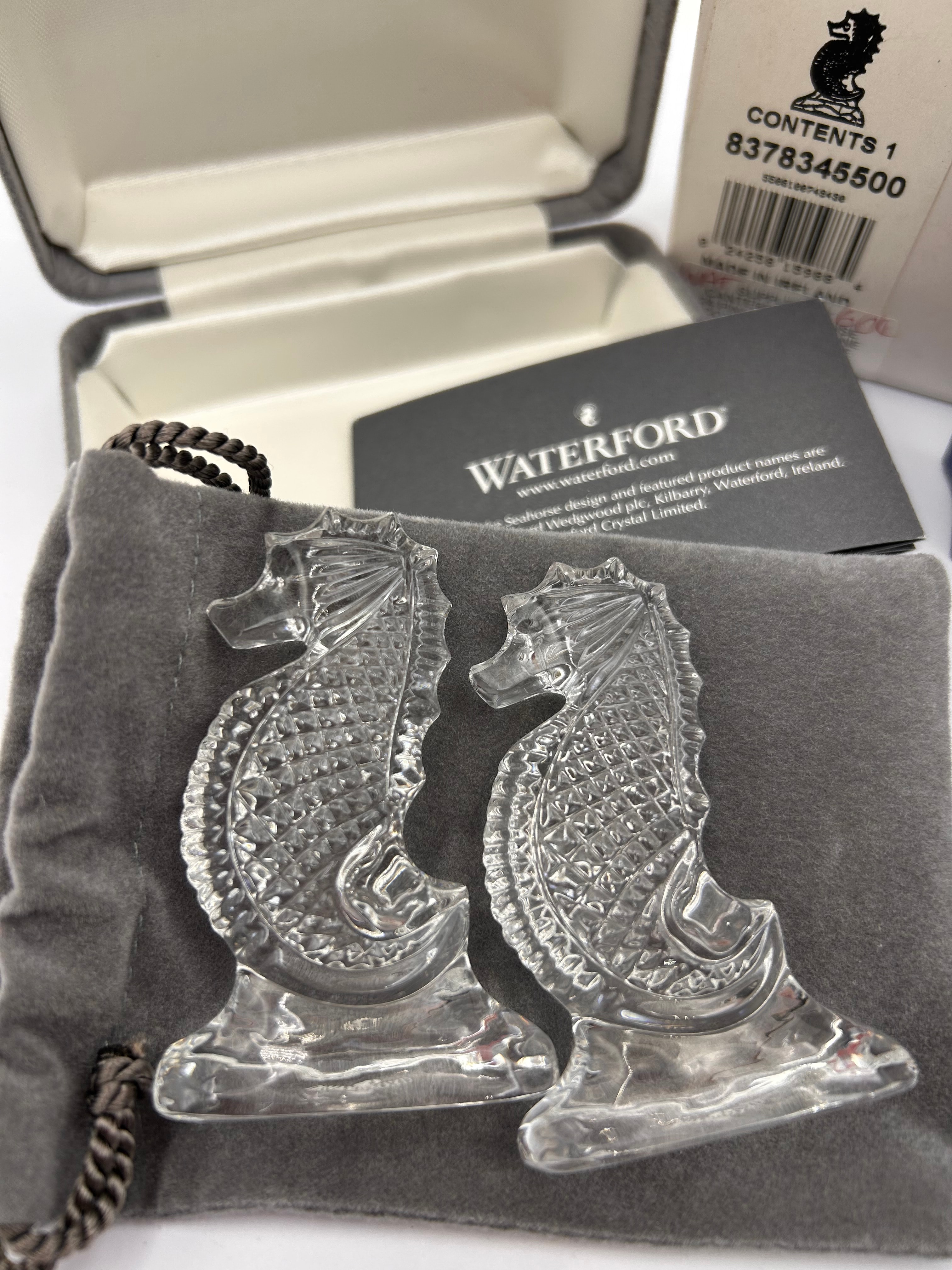 A pair of Waterford ‘Seahorse Memento’ clear cut-glass or crystal figurines, each with intricate textured detailing. Accompanied by a grey velvet drawstring pouch and a ‘WATERFORD’ branded information card referencing “www.waterford.com” and “Waterford, Ireland.” Housed in their original white cardboard box, labeled “SEAHORSE MEMENTO” and indicating “CONTENTS 1” with SKU “8378345500.”