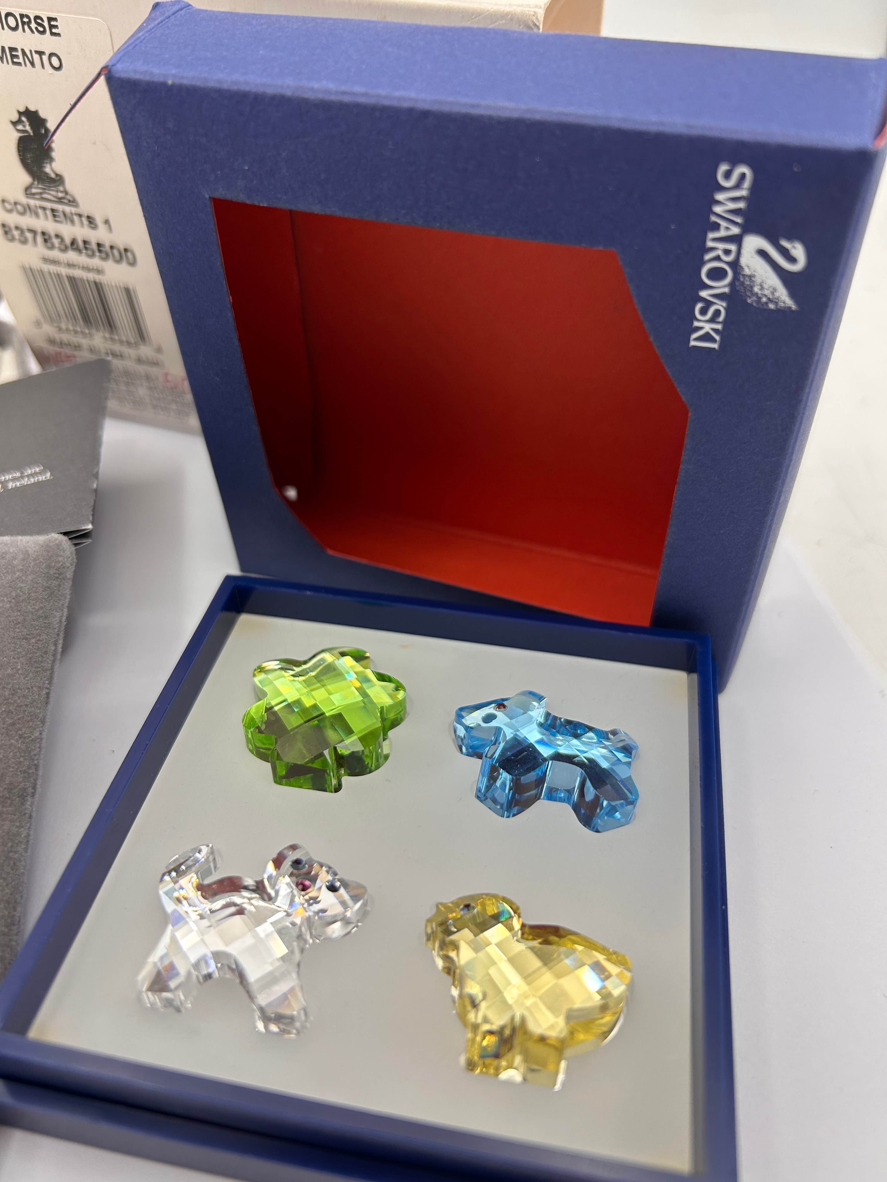 A set of four Swarovski faceted crystal animal figurines, appearing as stylized quadrupeds, in vibrant green, blue, clear, and yellow hues. Presented within a white tray inside an open dark blue ‘SWAROVSKI’ branded box with a red interior.
