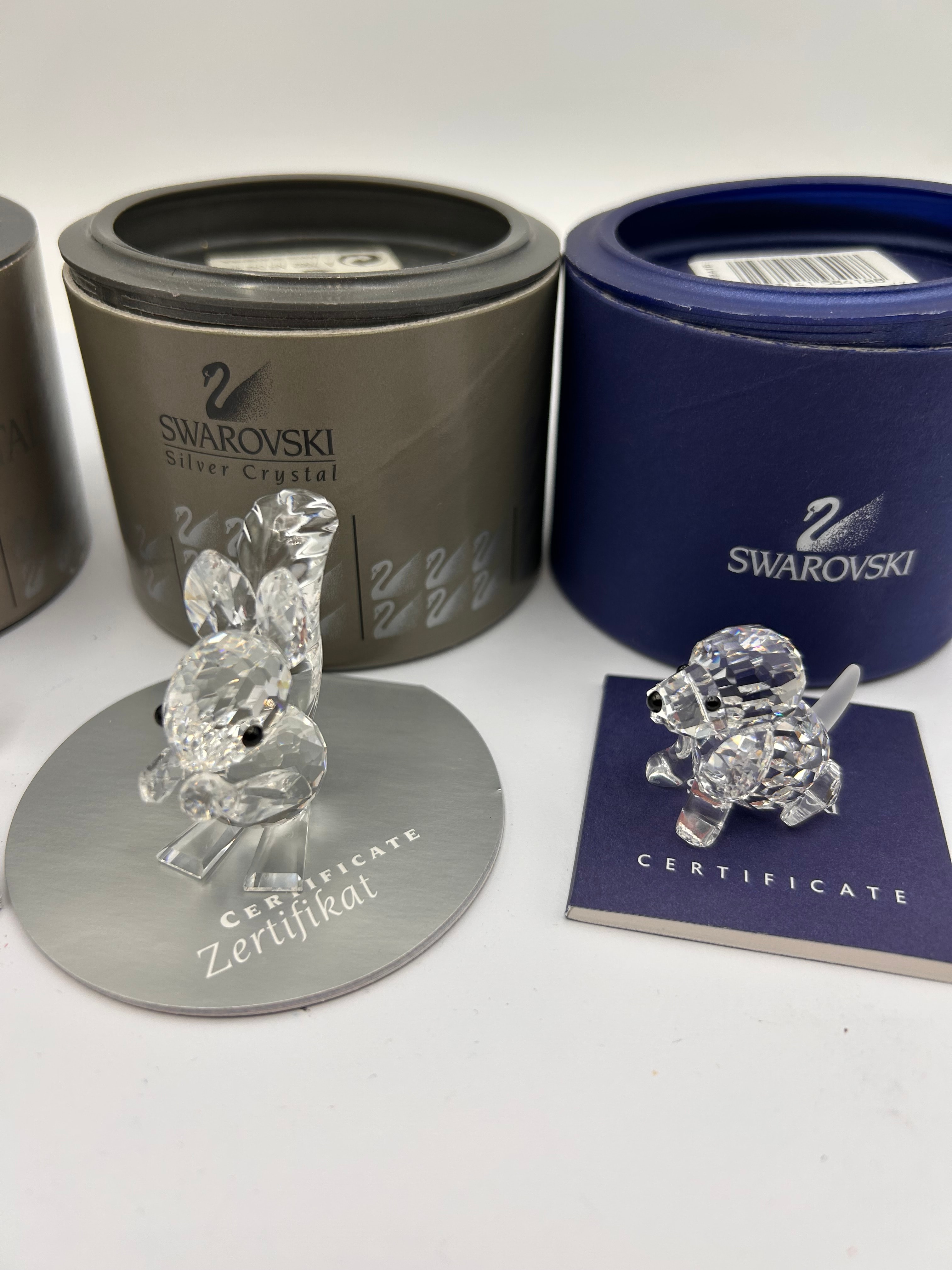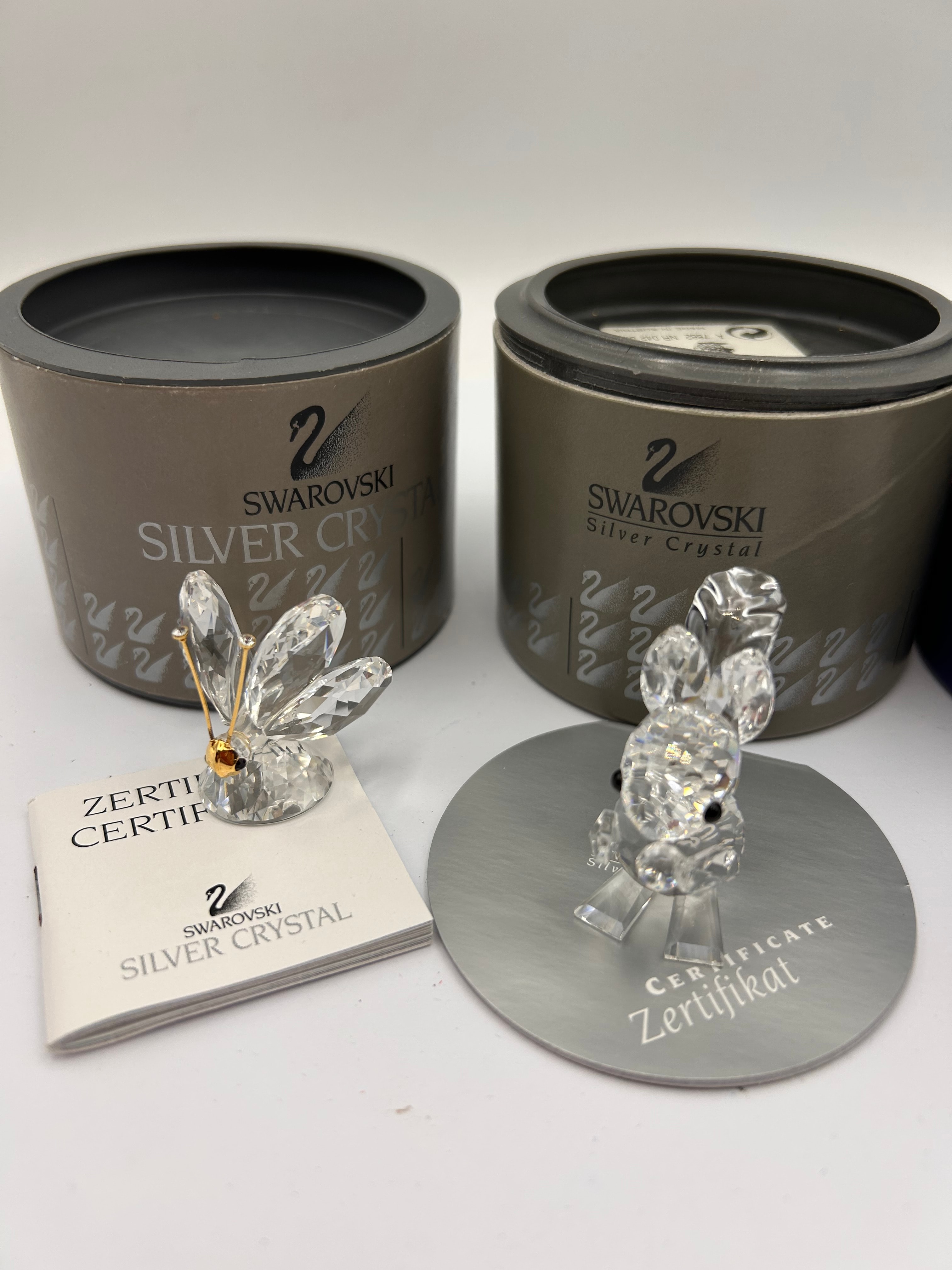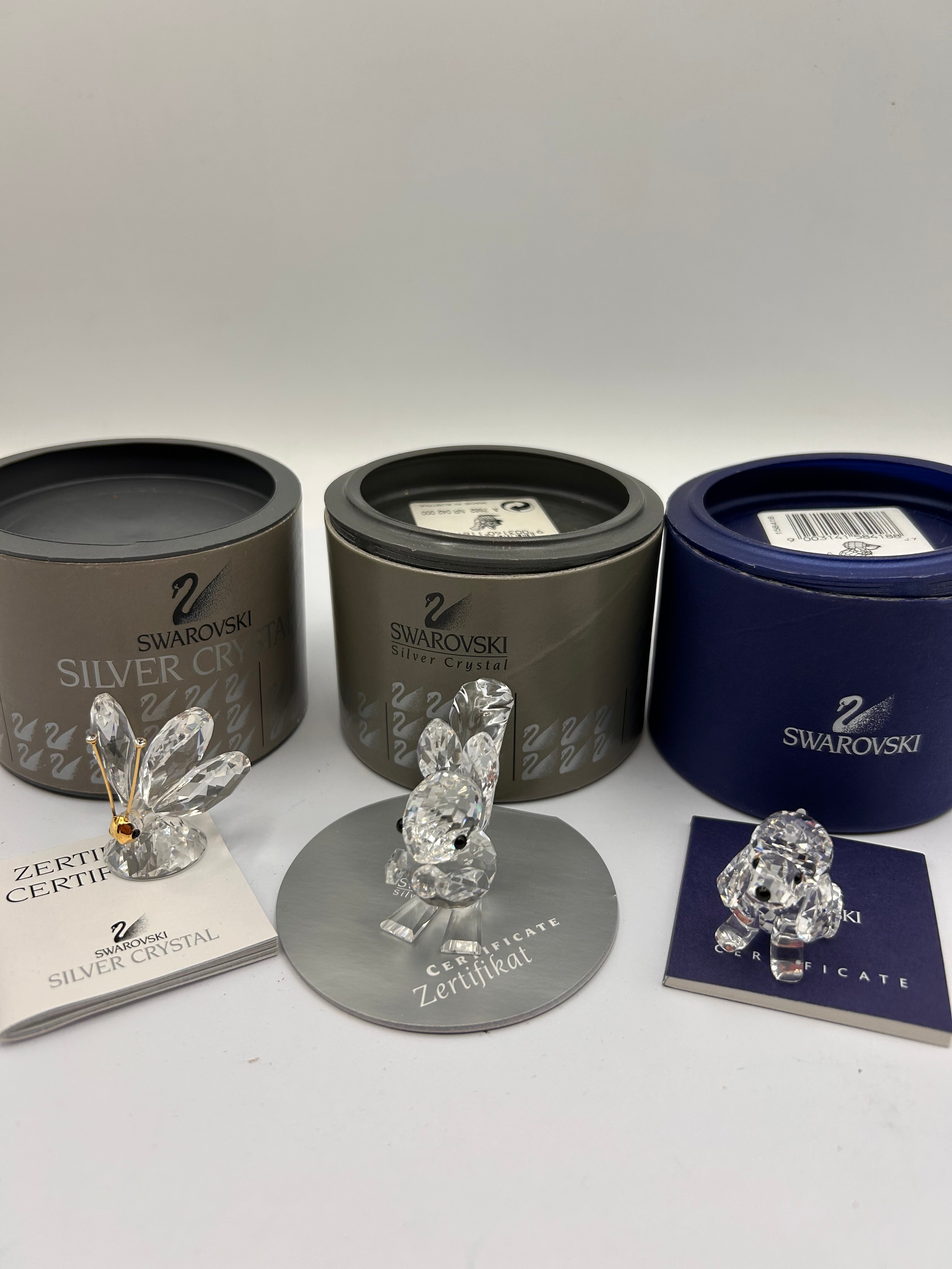 A collection of three modern faceted clear crystal animal figurines by Swarovski Silver Crystal. The group comprises a butterfly with gold-toned metal accents and a red jewel-like detail, a sitting rabbit, and a crouching dog with black dot eyes. Each figurine is accompanied by its original cylindrical packaging, in grey/bronze or dark blue, bearing the “SWAROVSKI Silver Crystal” branding and swan logo. Associated documentation, including “CERTIFICATE” and “Zertifikat” slips or booklets, some also marked “SWAROVSKI Silver Crystal,” and one silver-colored round disc with embossed text, are present.