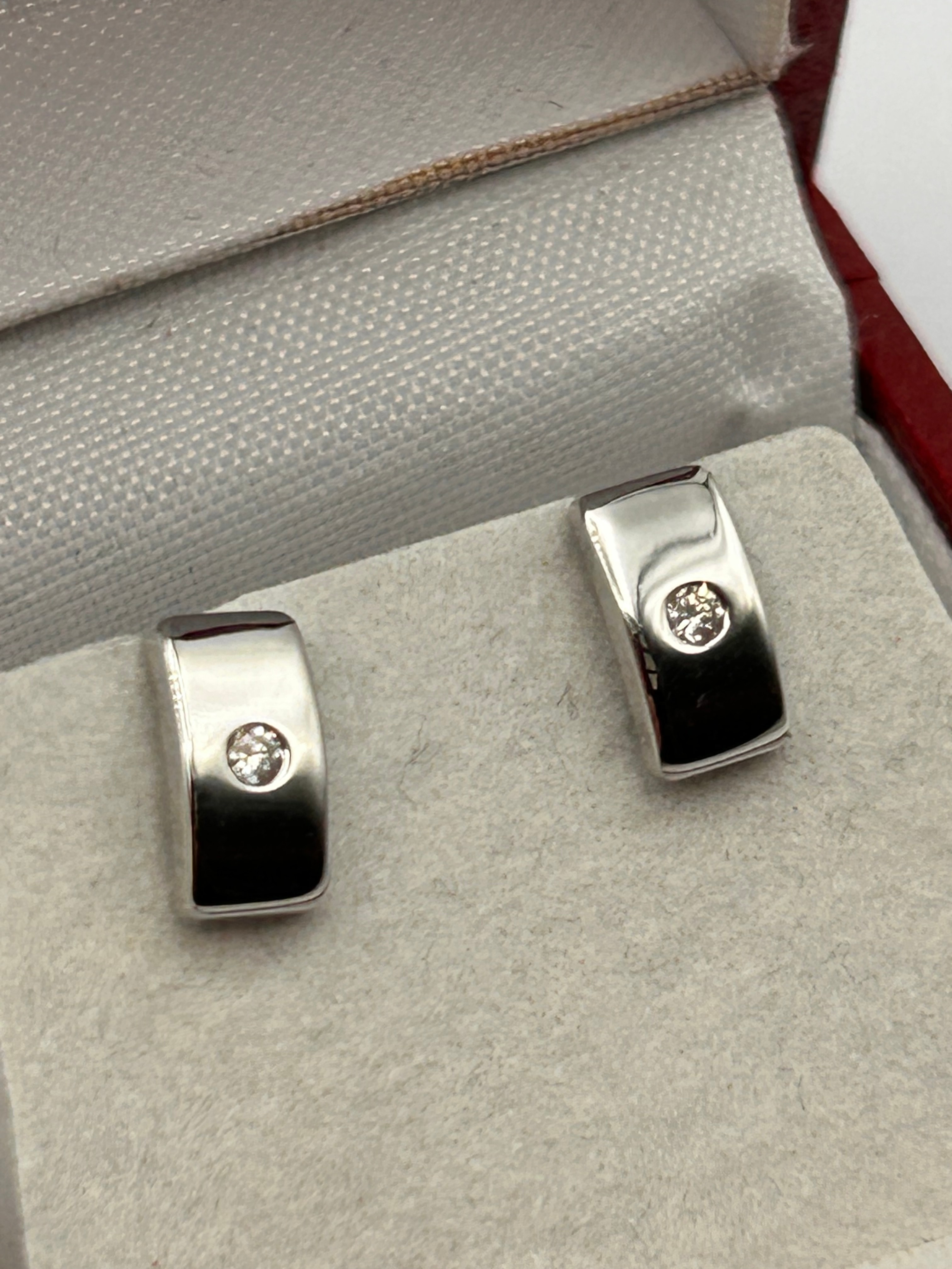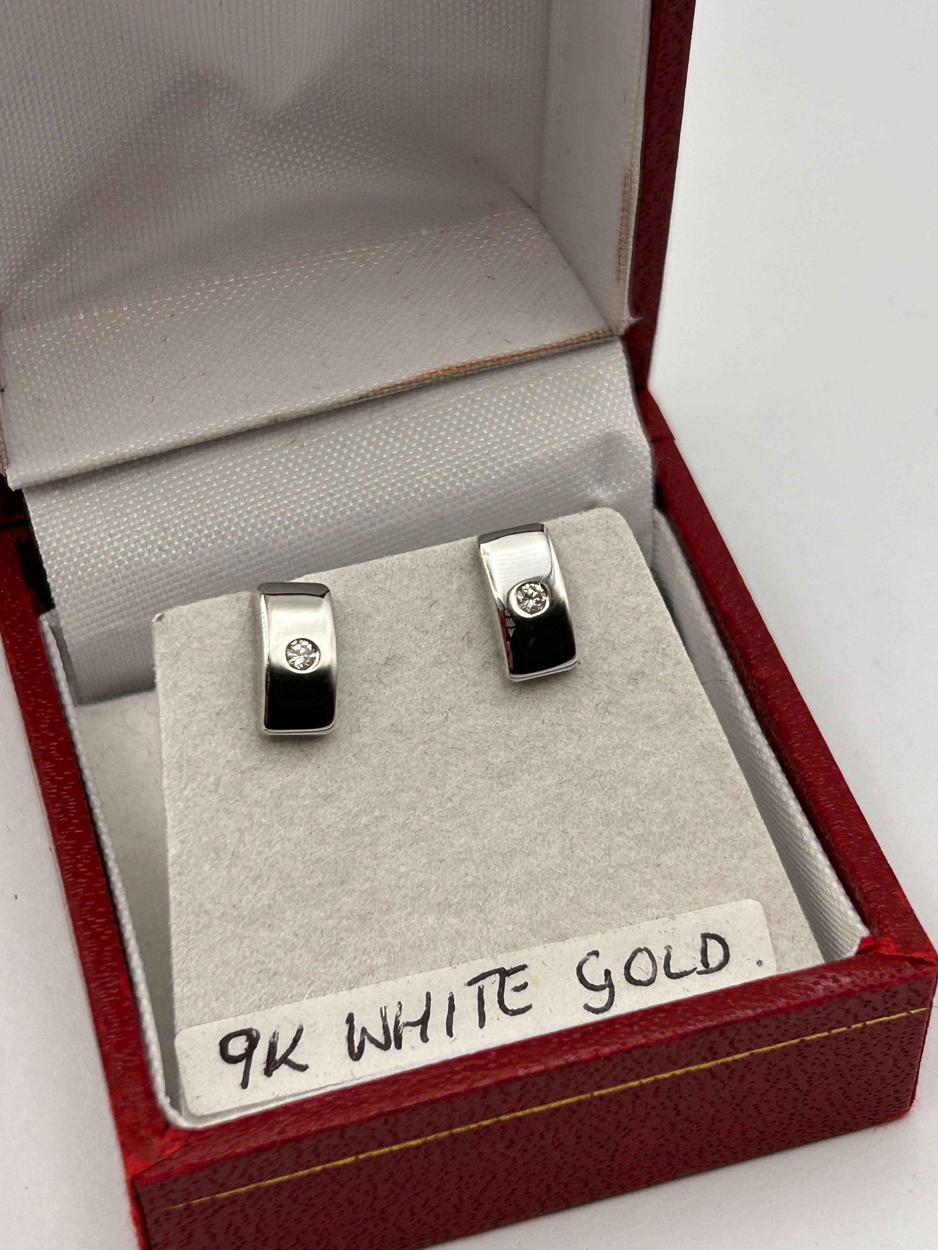 A pair of contemporary 9ct white gold stud earrings, each crafted from polished white gold in a curved bar or elongated rectangular design, flush-set centrally with a single round brilliant-cut gemstone. The items are presented on a light grey insert within a red hinged jewelry box.