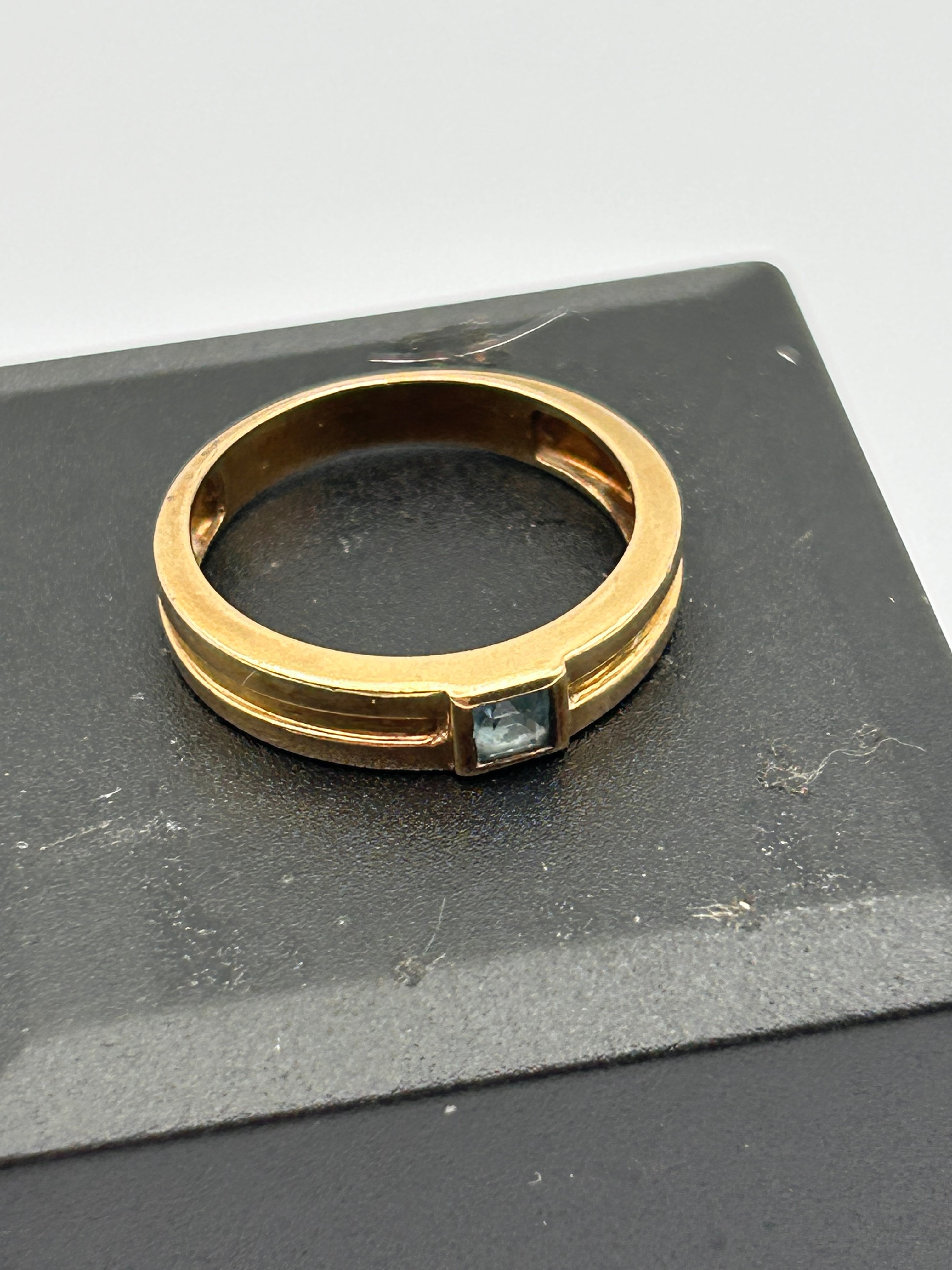 A modernist or contemporary style ring crafted from 9ct gold, featuring a channel-set, square-cut light blue gemstone. The band exhibits a grooved design, creating a split-effect around the central stone. No specific text or hallmarks are visible.