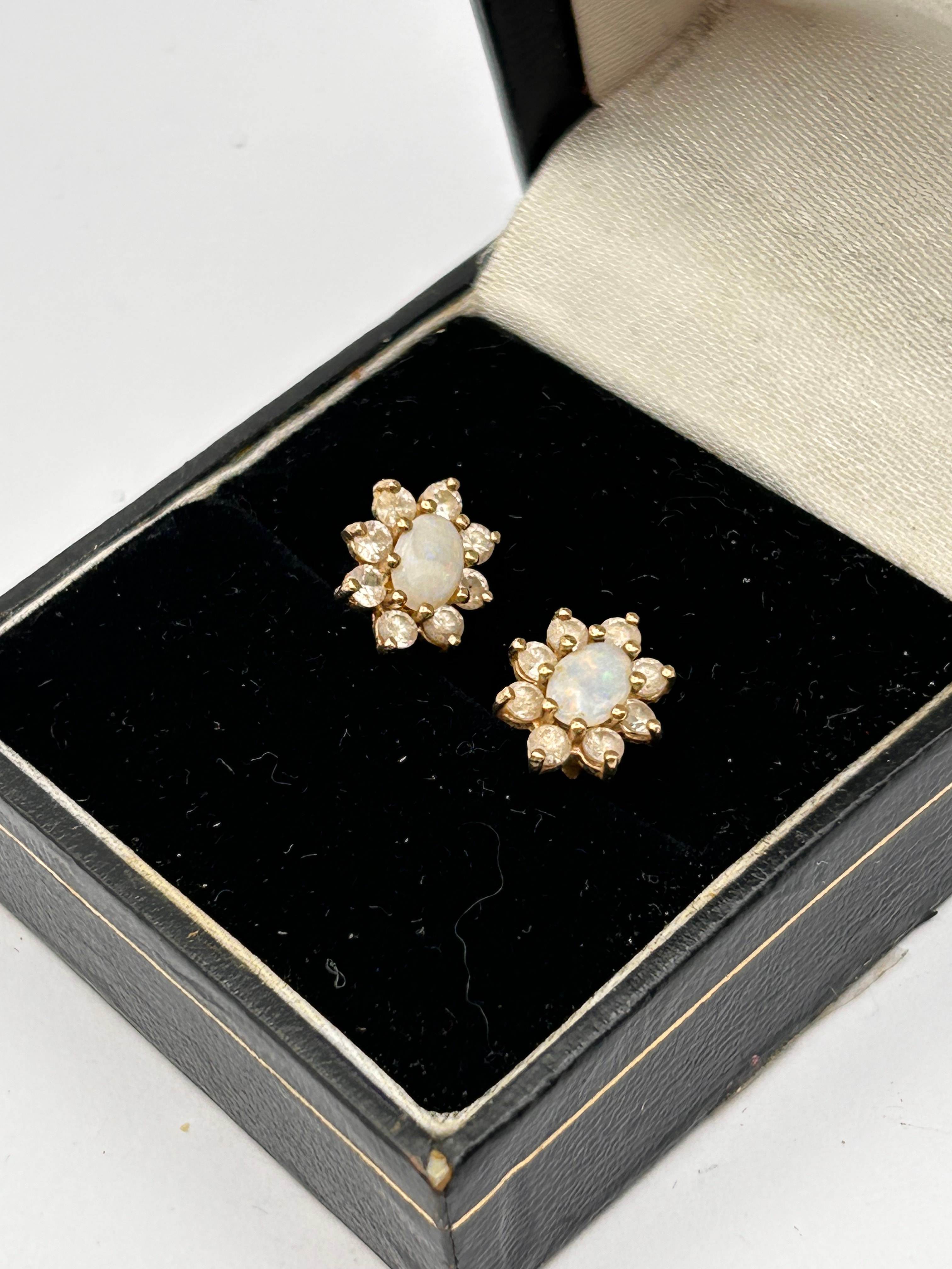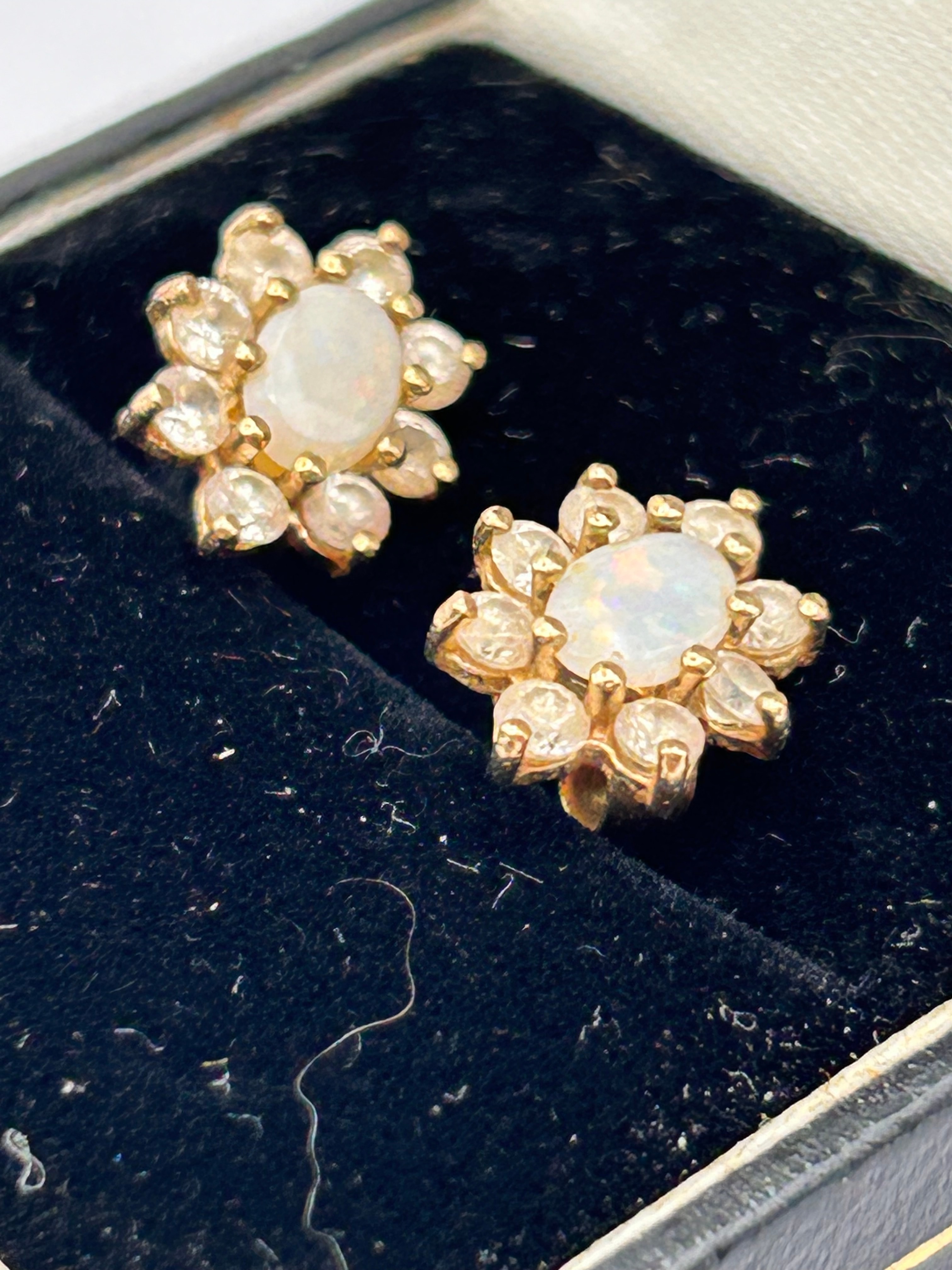 A pair of 9ct Gold stud earrings, each featuring a floral cluster design. The center of each earring is set with an oval cabochon stone exhibiting opalescence, encircled by eight smaller, clear faceted stones. The gold metal is polished, and all stones are securely set.