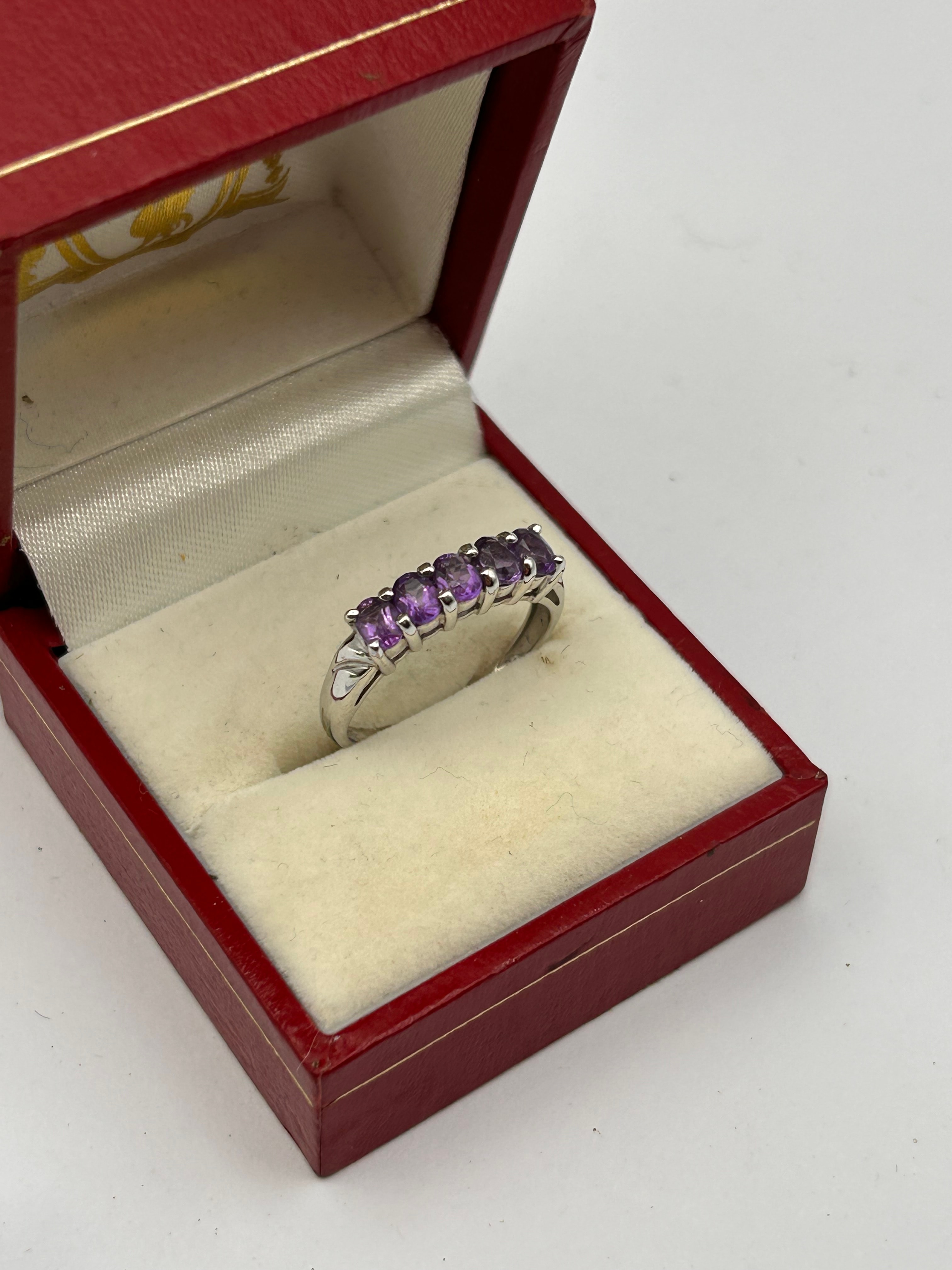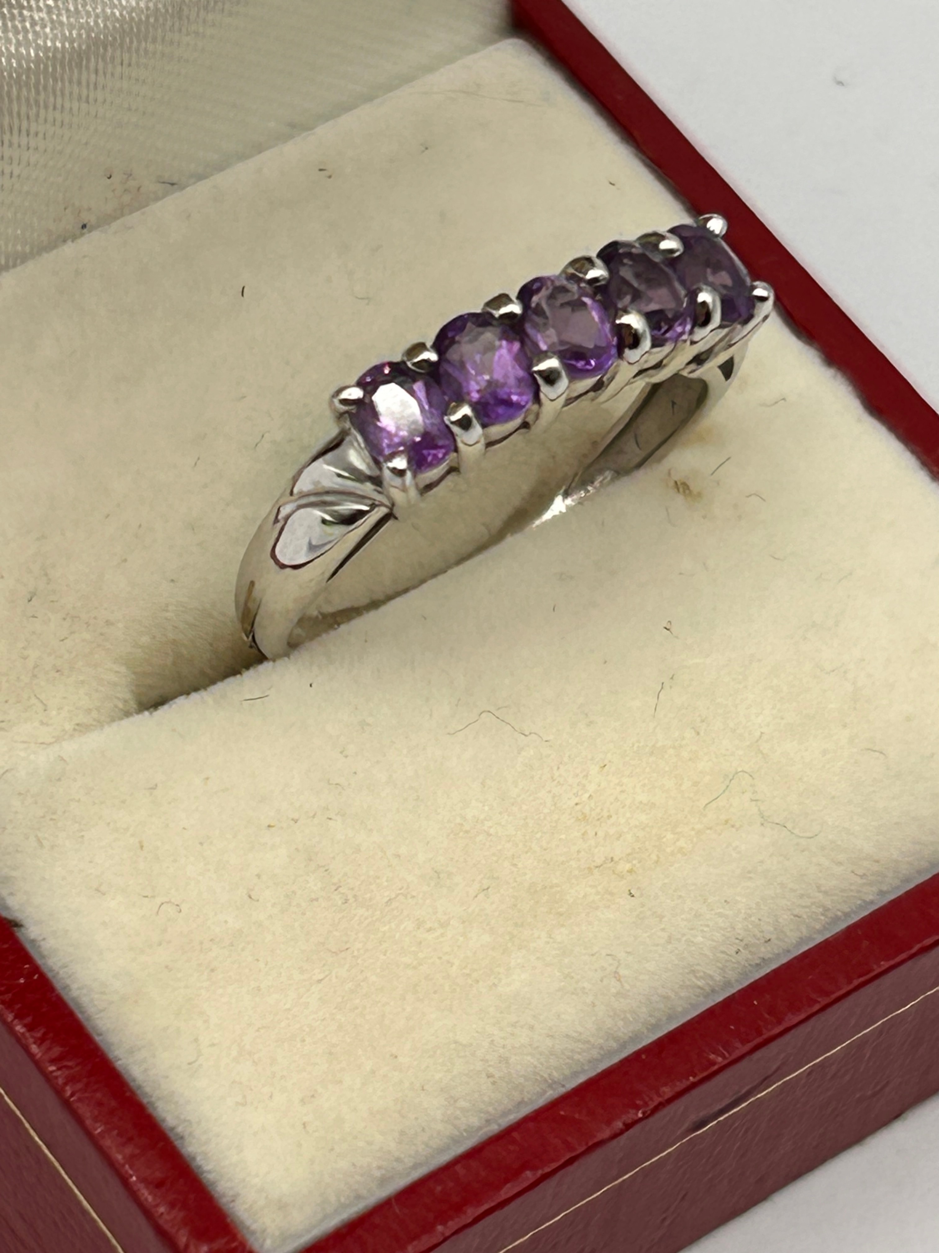 A 9ct gold half eternity ring, featuring a band set with five uniformly sized oval-cut purple gemstones, likely amethysts, arranged in a line and secured by individual prong settings. The ring’s shoulders display decorative scroll-like engravings or cut-outs. Presented in a rectangular red faux leather hinged box with a cream velvet-lined interior.