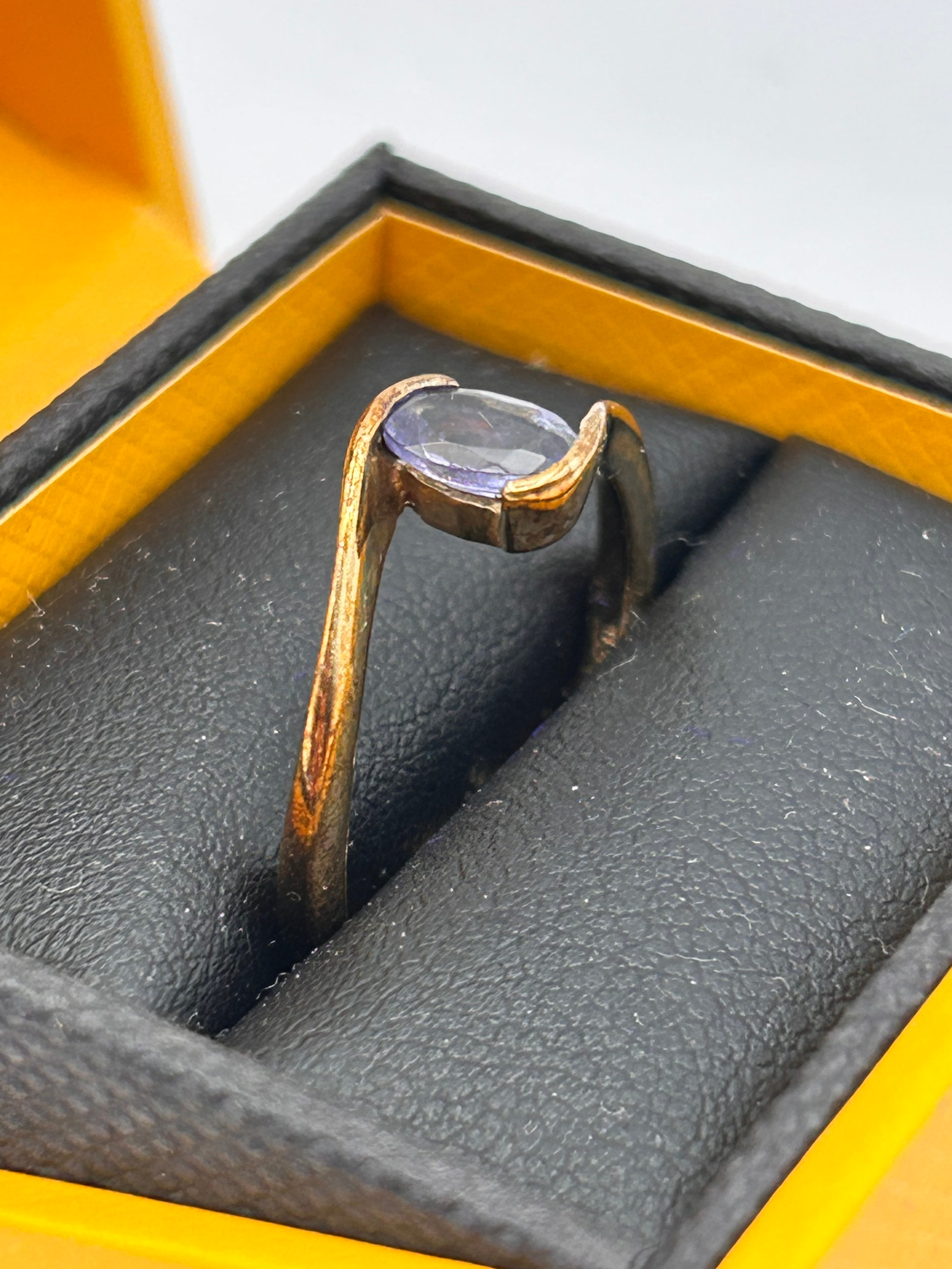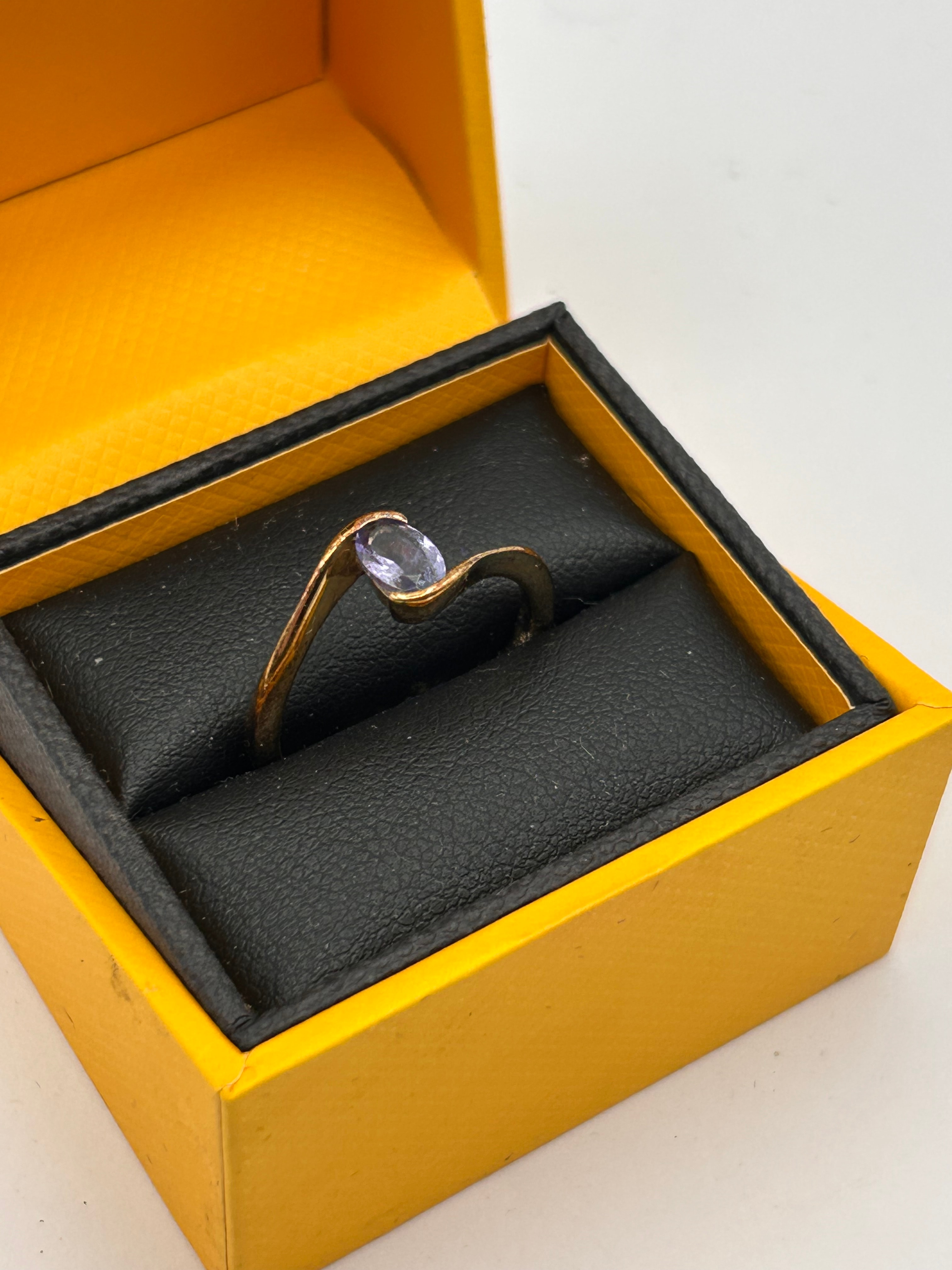 A modern-style 9ct Gold finger ring, weighing 2.2g and of Size O. The ring features a bypass or tension-like setting that horizontally cradles a single, oval-cut amethyst gemstone of a pale purple or lilac hue. Crafted from gold, the ring exhibits a contemporary design.
