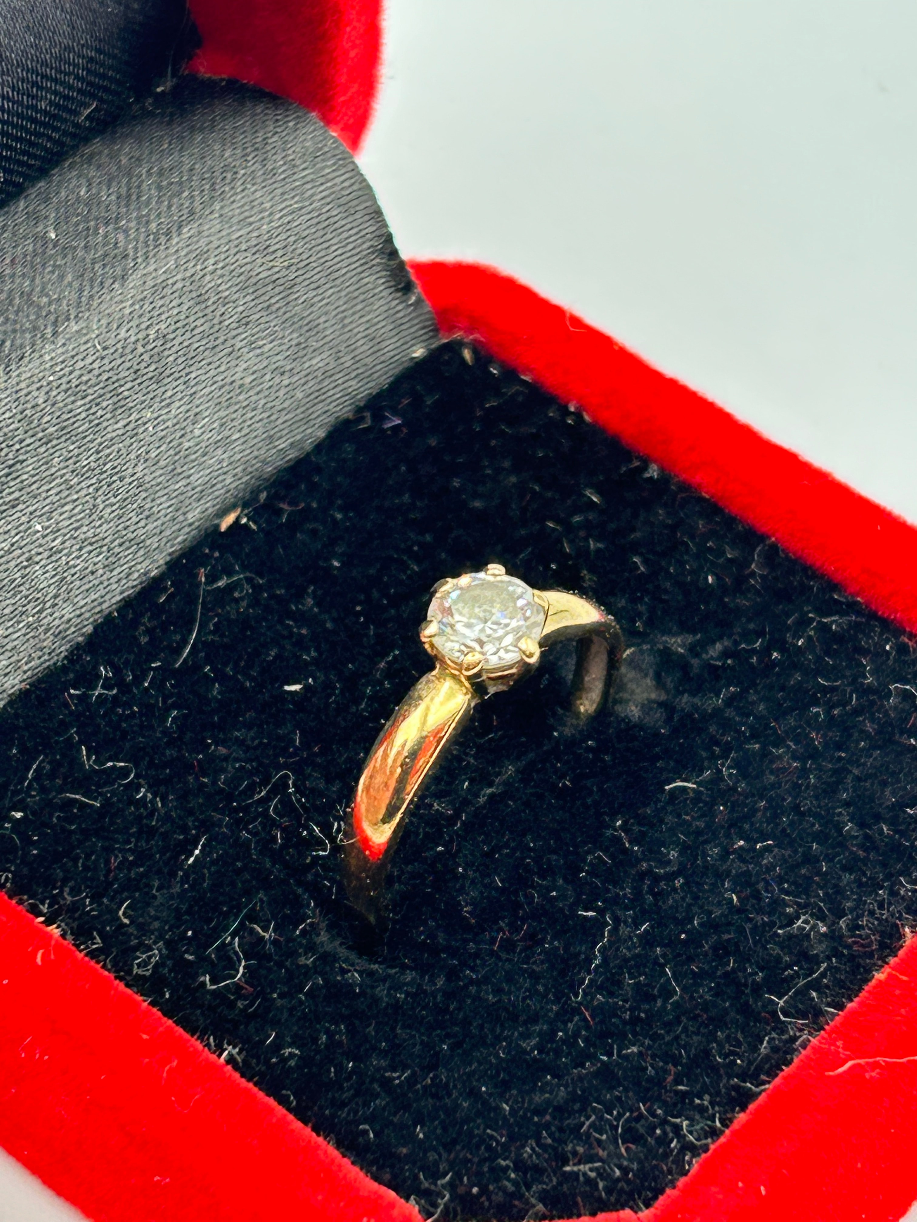 A 9ct yellow gold solitaire diamond ring, featuring an estimated 1.4 carat round brilliant-cut diamond. The clear, faceted stone is securely set in a six-prong mounting on a polished yellow-toned metal band. The ring is presented within an open red box with a black velvet-lined interior. The item’s materials are confirmed to be Gold.