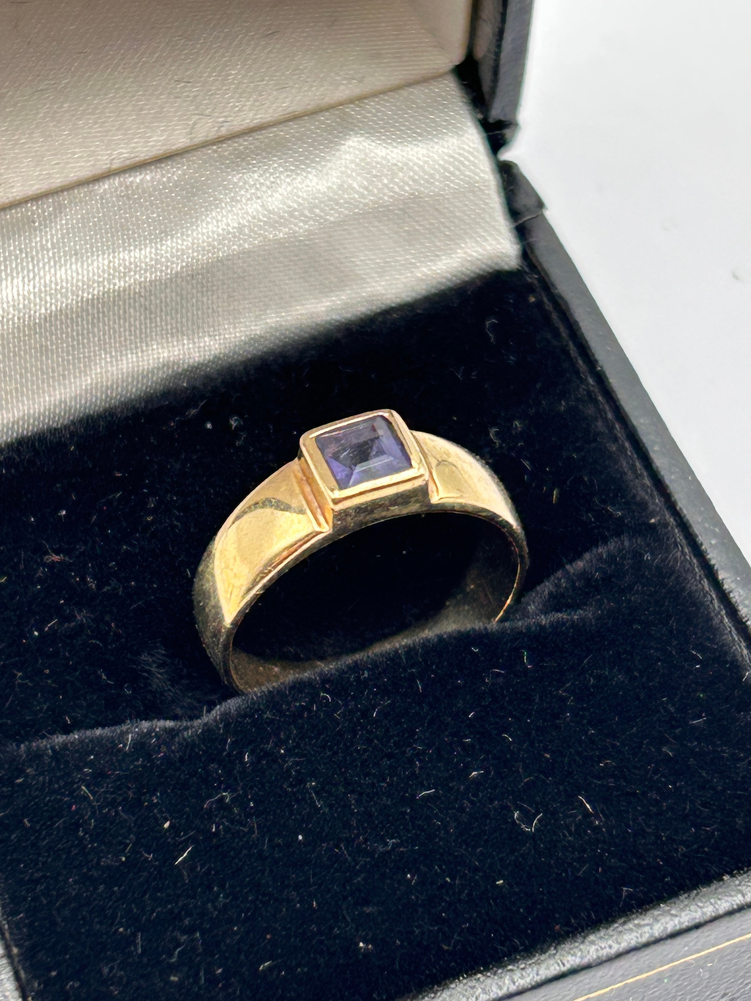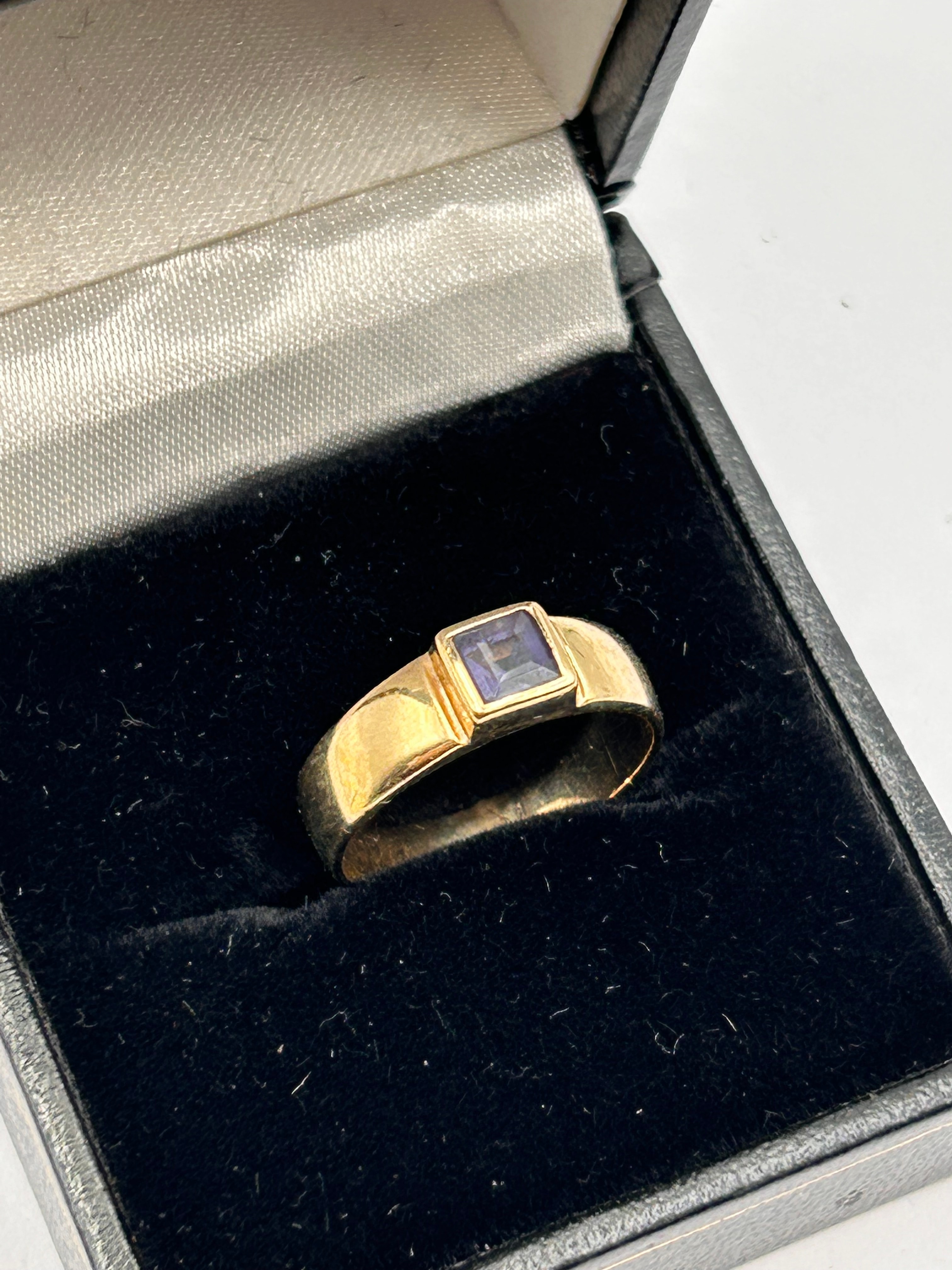 A 9ct yellow gold ring set with a square-cut sapphire. The central bezel-set gemstone exhibits a purple or violet hue. The design is characterized by a thick, plain band and a minimalist setting, suggesting a modernist or contemporary style. The materials are confirmed to be Gold.
