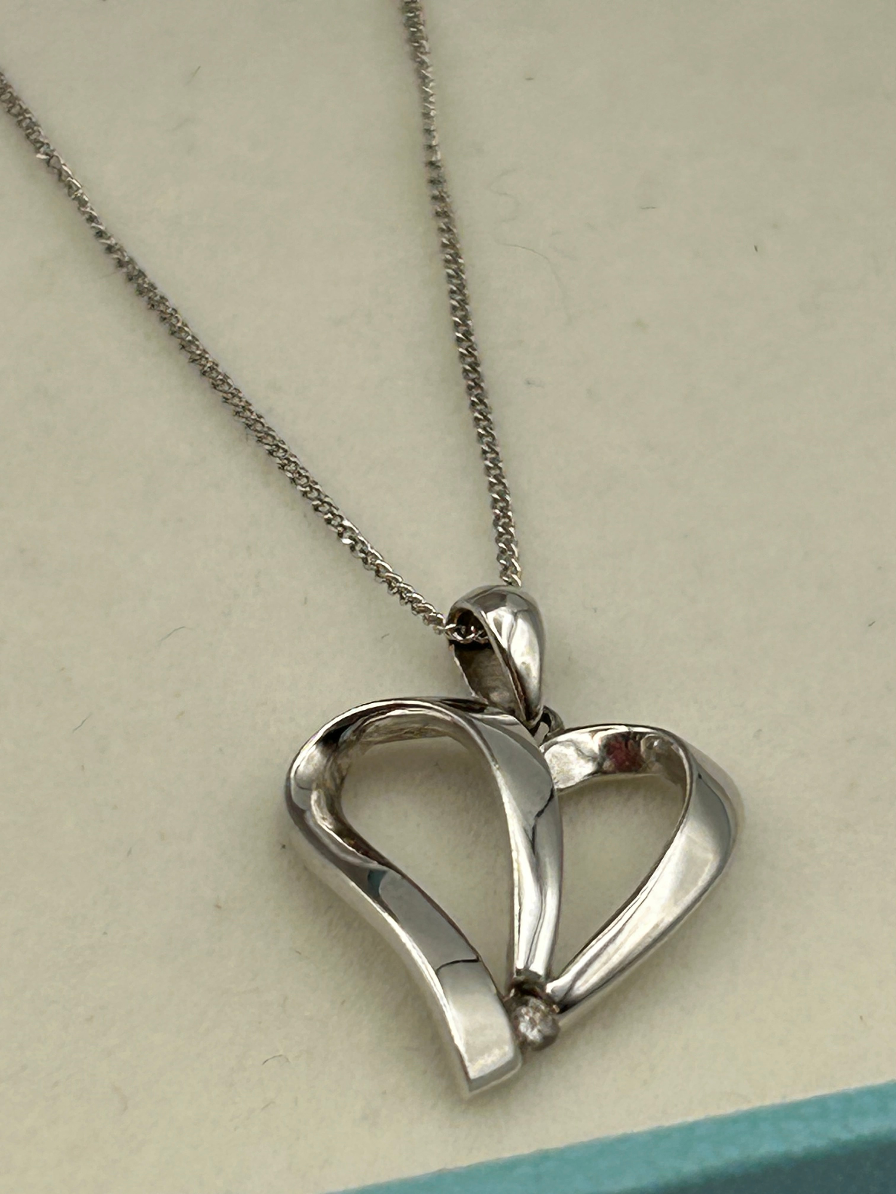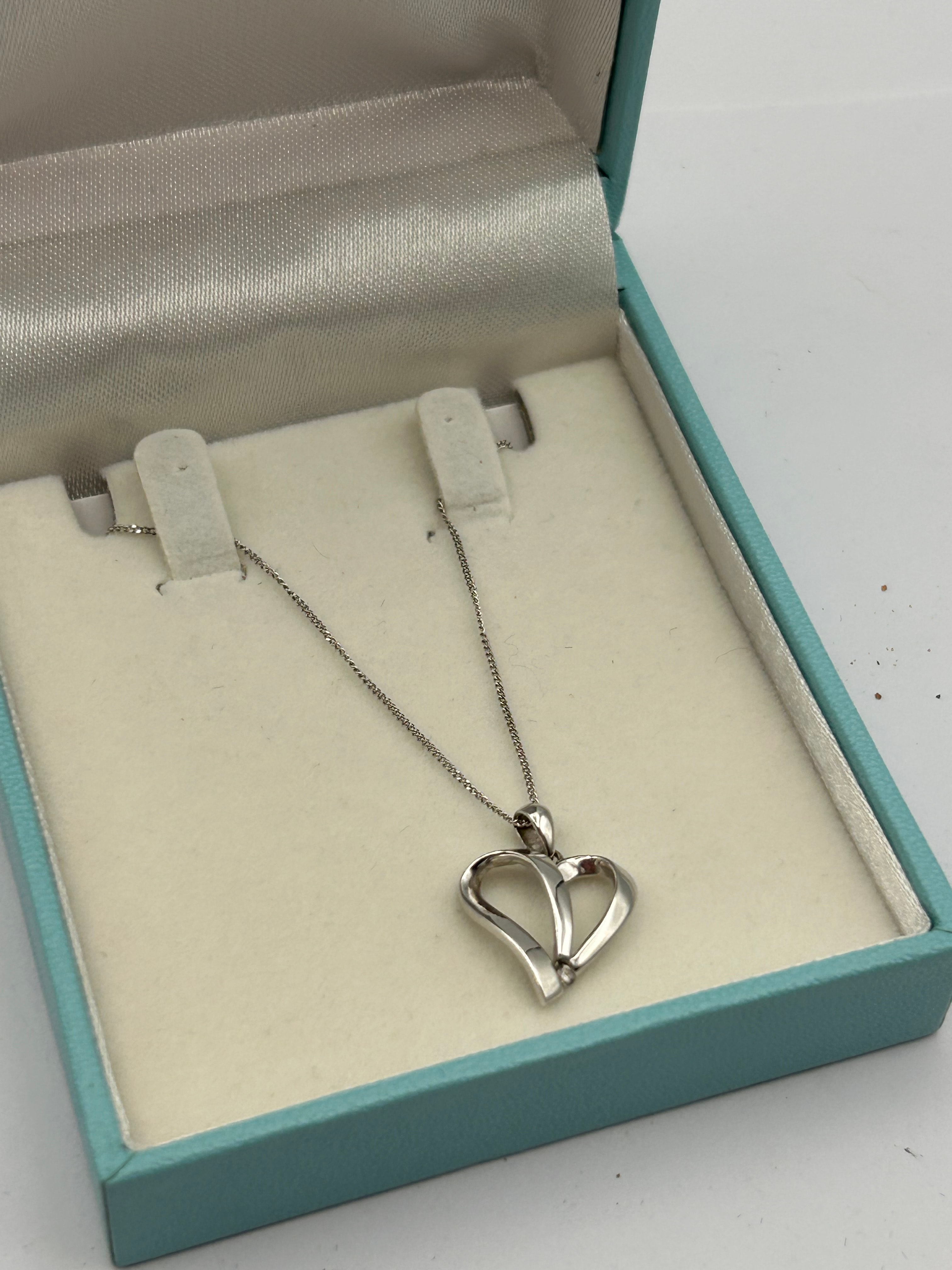 A necklace comprising a fine link chain and a stylized heart pendant, crafted from 9ct Gold. The pendant features an abstract, open-heart design with fluid, curving lines, accented by a single small, round, clear stone set at the lower joining point of the heart’s two halves. The necklace is presented in a light blue hinged jewelry box with a cream-colored satin interior.