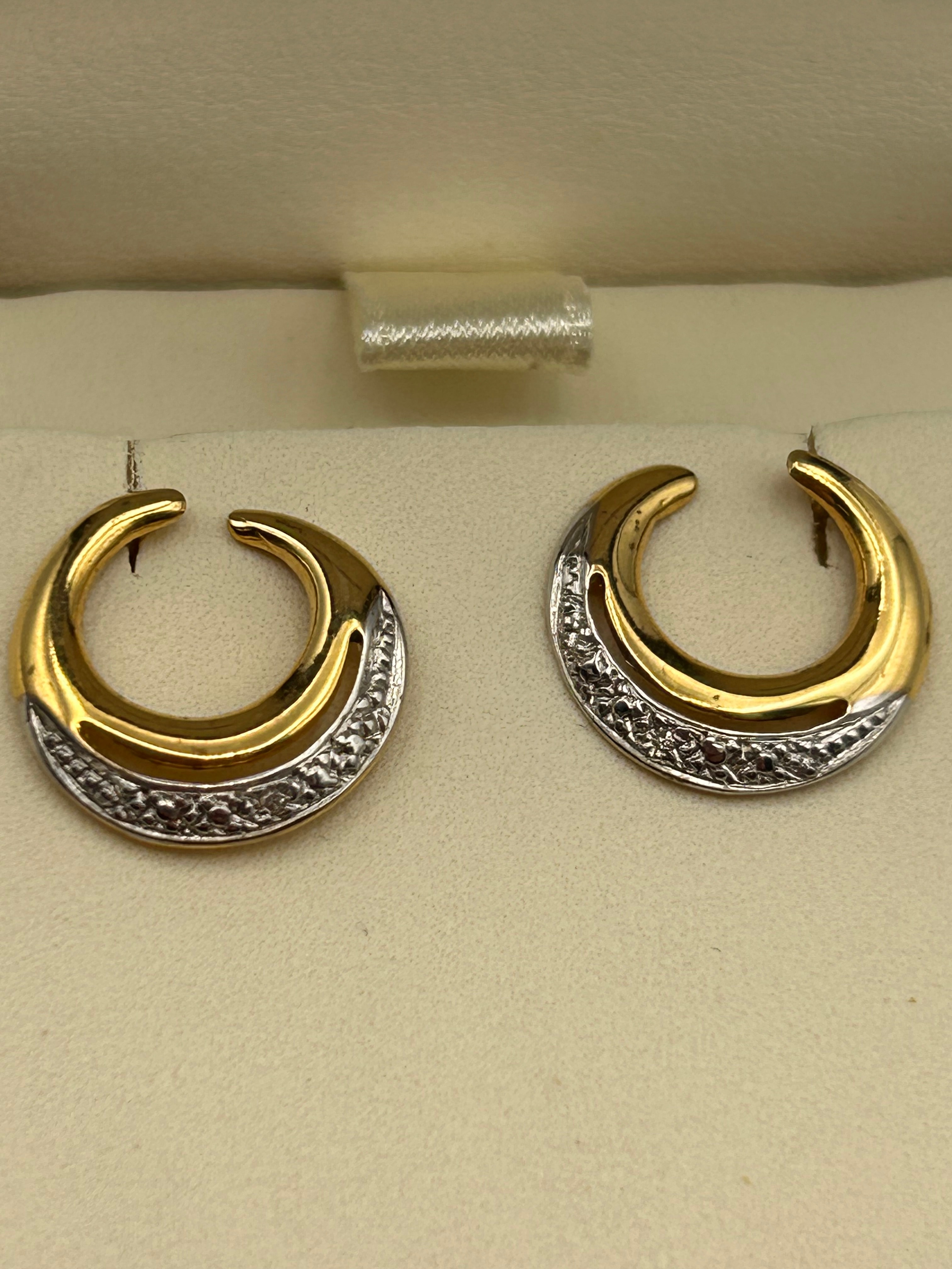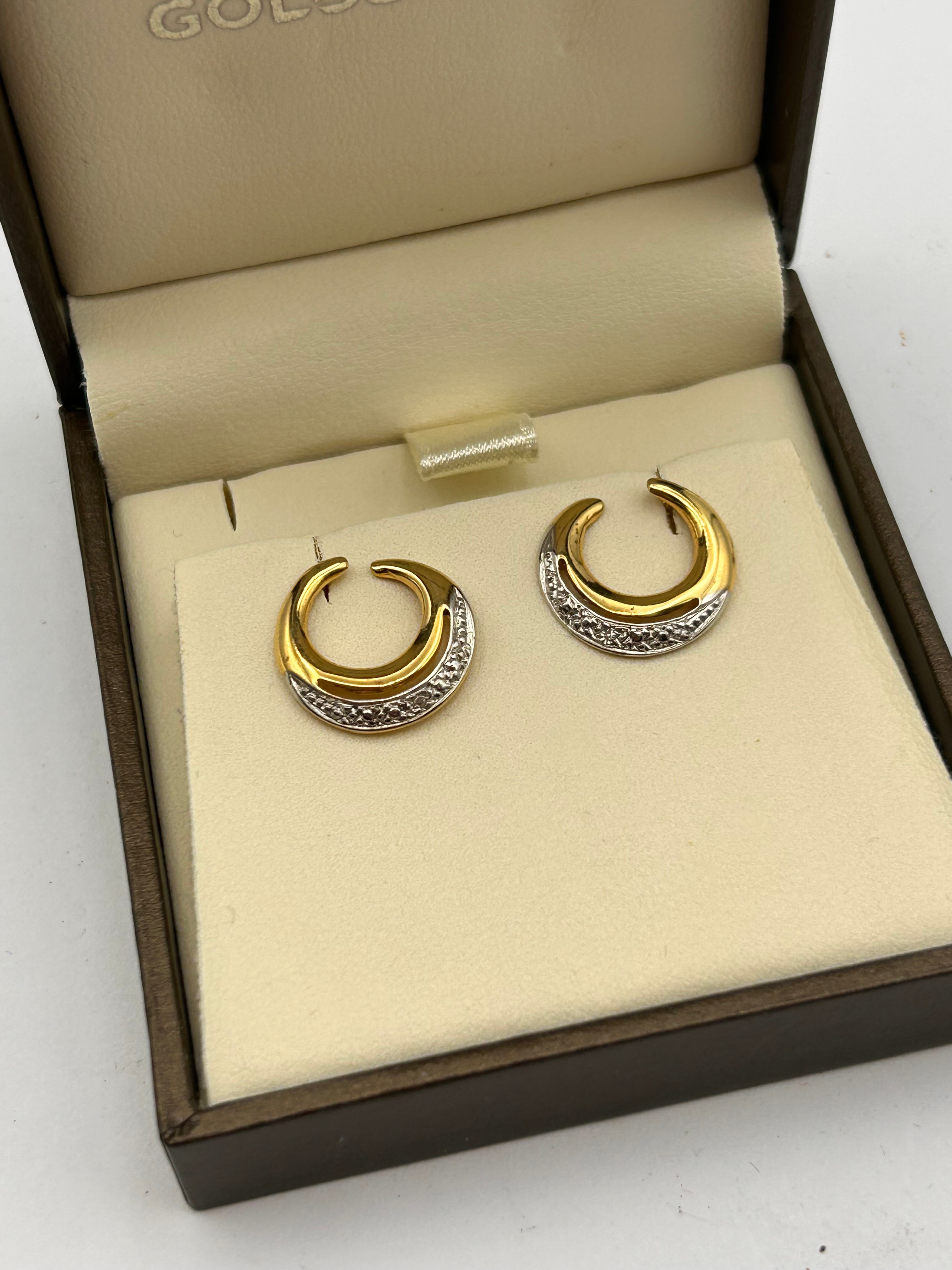 A pair of modern 9ct two-tone gold and diamond open-hoop earrings. Each earring features a polished yellow gold crescent form, partially adorned with a white gold section pavé-set with numerous small, round diamonds. The earrings are presented in a hinged brown jewelry box with a cream-colored interior, the box lining showing a partial word ‘GOL’.