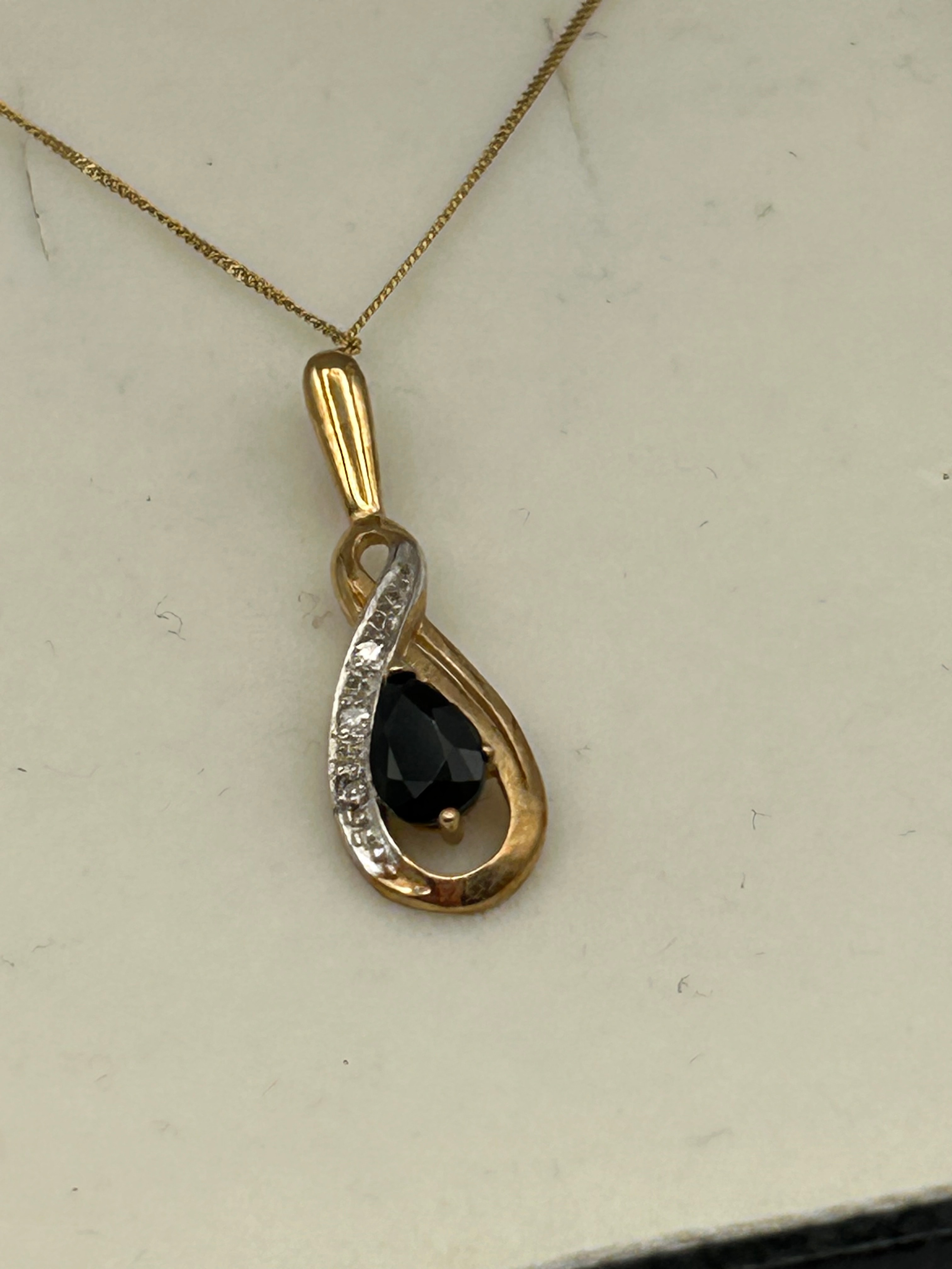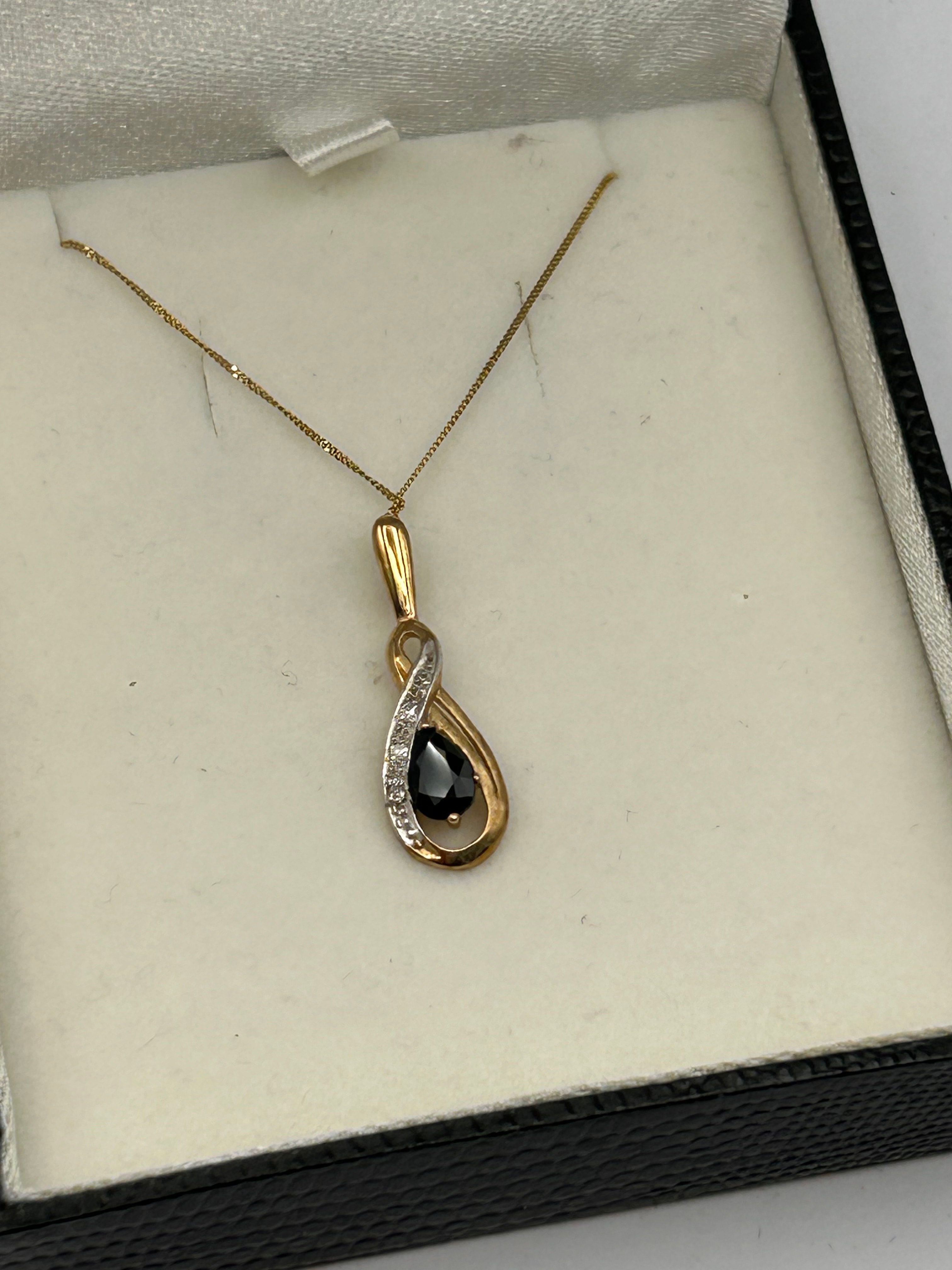 A contemporary-style pendant necklace crafted from 9ct gold, weighing 1.1g. The bimetallic pendant features an elongated, stylized ribbon or infinity loop motif. It is composed of yellow gold with a contrasting white gold section, channel-set with a row of small, round brilliant-cut diamonds. A single pear-shaped black gemstone, possibly a sapphire or onyx, is centrally bezel-set within the lower curve of the yellow gold portion. The necklace is presented with a fine gold chain in a lined jewelry box.