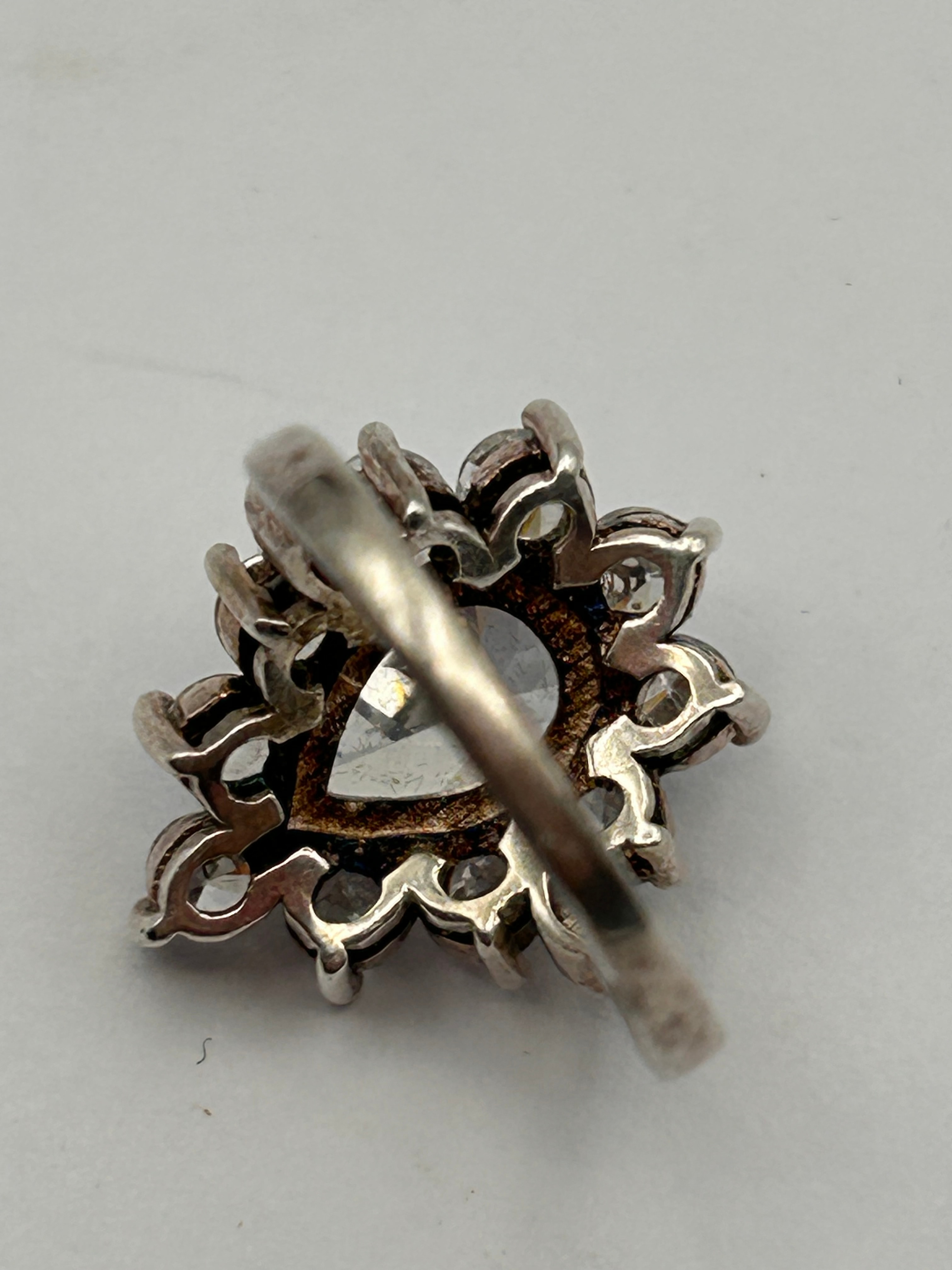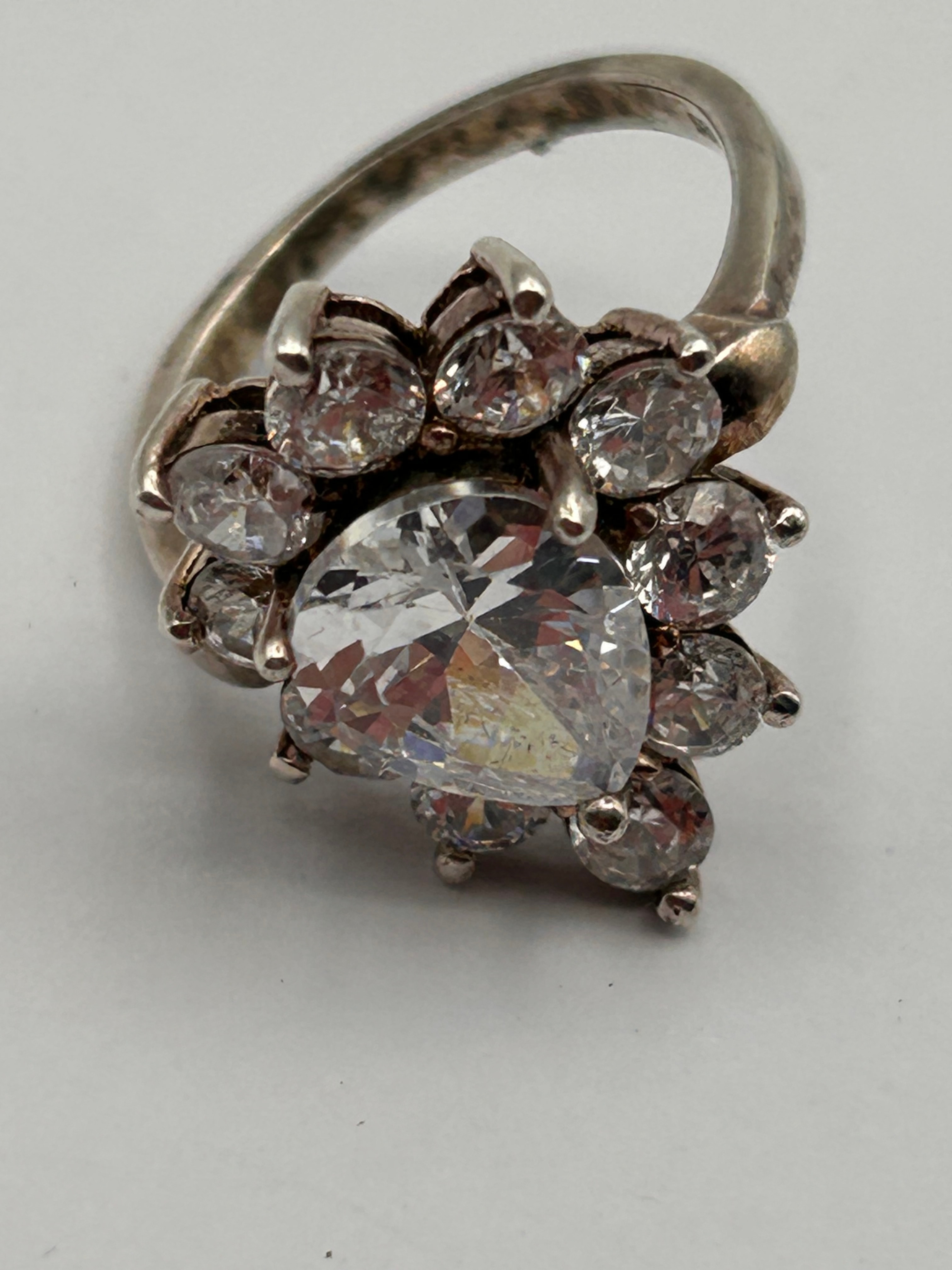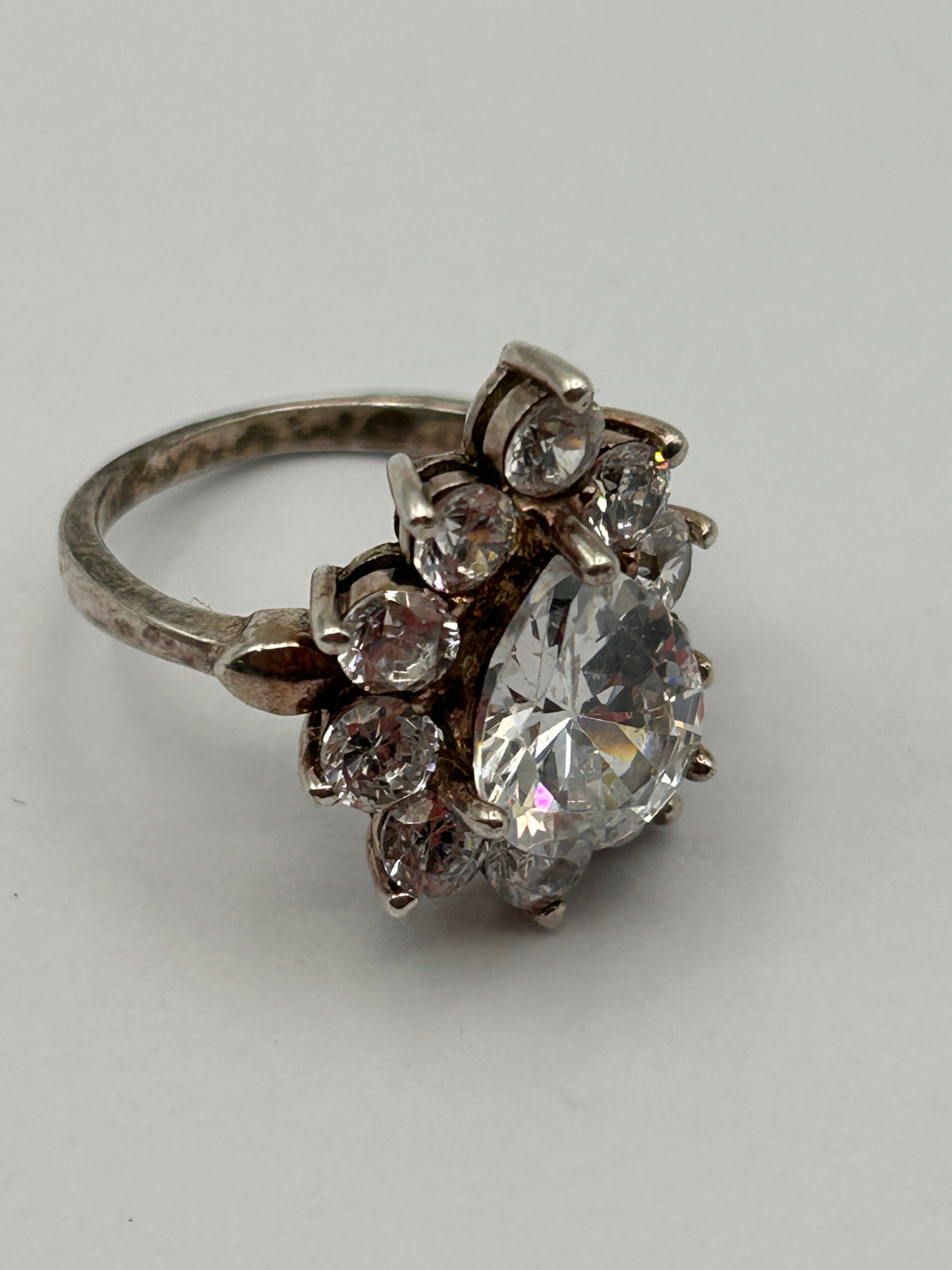 A modern or contemporary style silver-toned metal cluster ring, featuring a central pear-shaped faceted clear stone surrounded by eight smaller round faceted clear stones, all prong-set. The design exhibits no visible text or hallmarks.