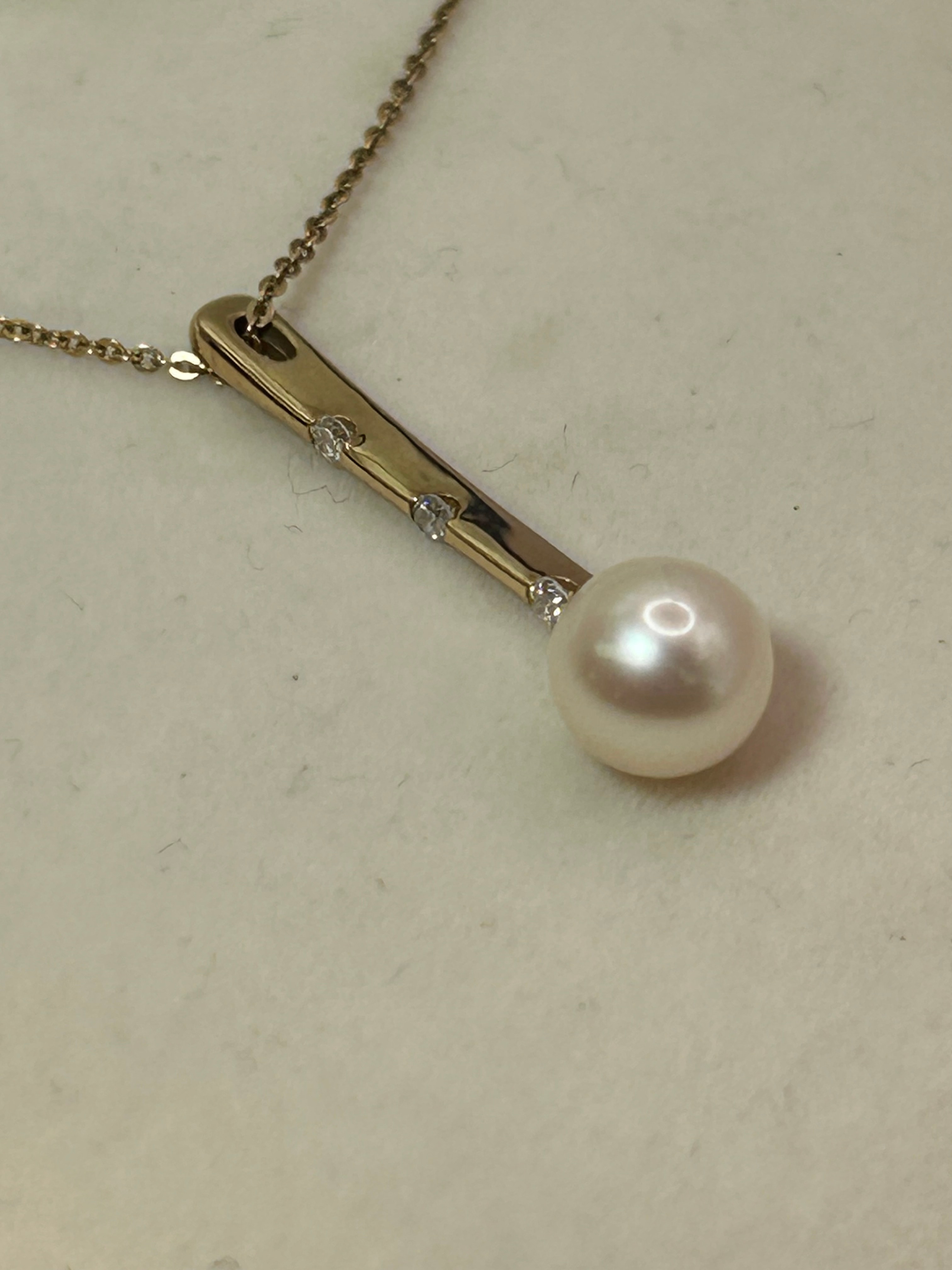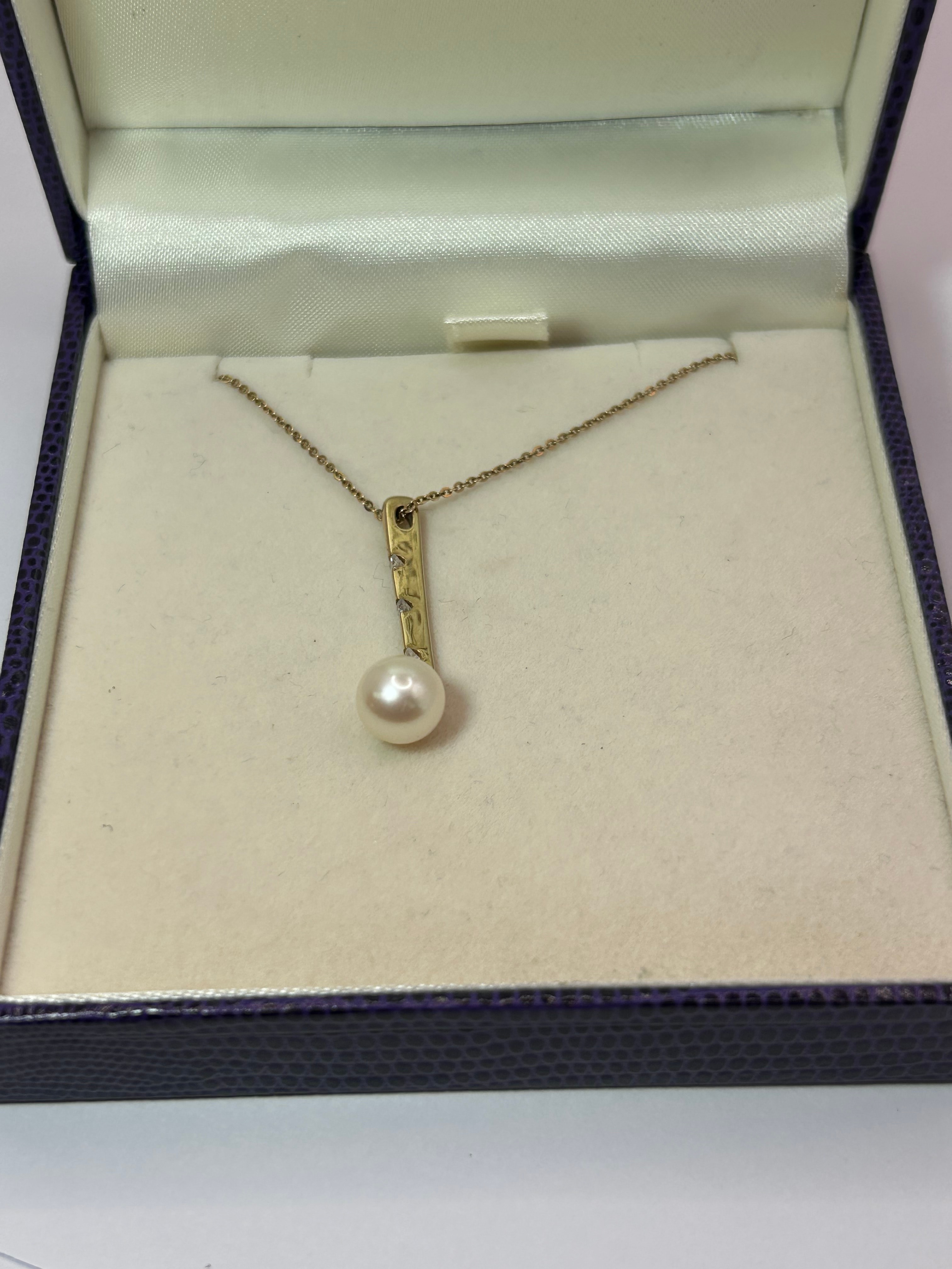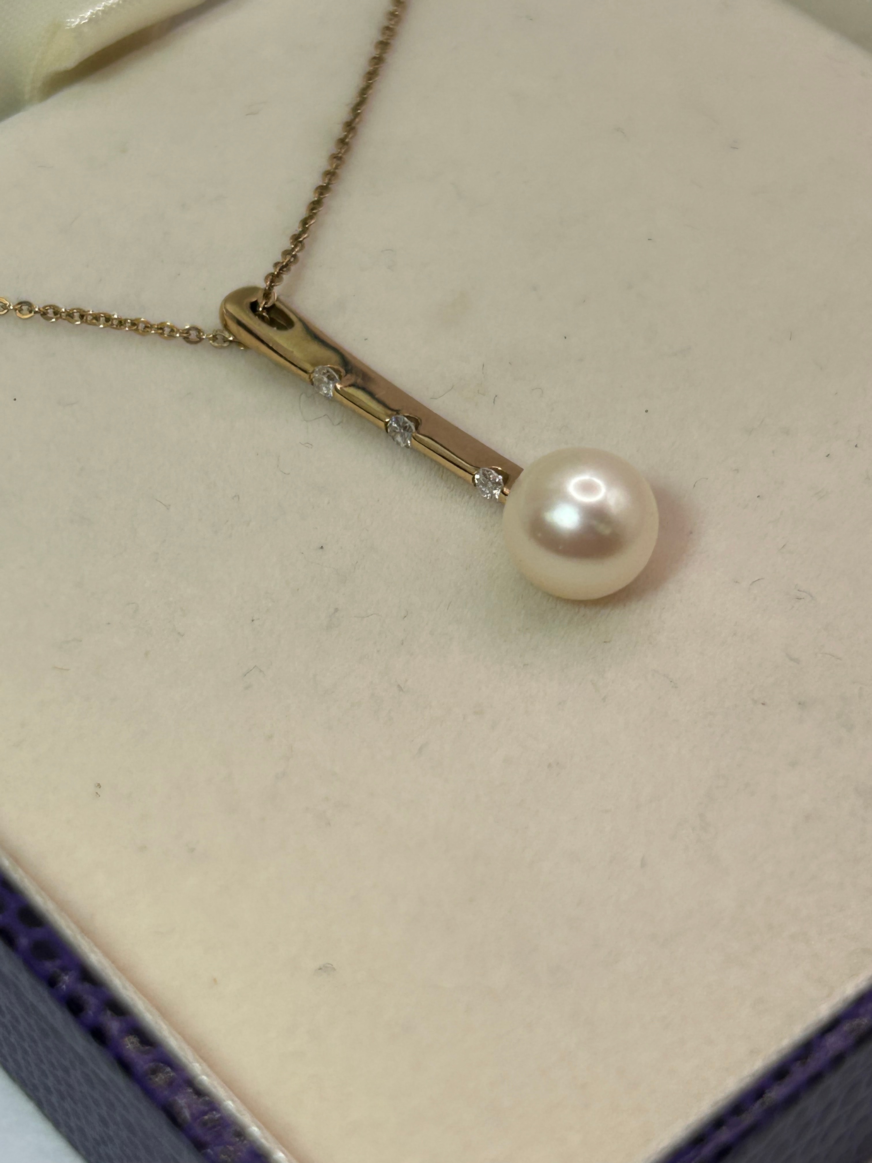 A modern 9ct Gold necklace featuring a delicate chain supporting a vertically oriented rectangular bar pendant. The pendant is set with three small, round, clear stones intermittently along its length, culminating in a single spherical white pearl at its base. The necklace is presented in a dark blue hinged jewelry box with a white satin-lined interior.