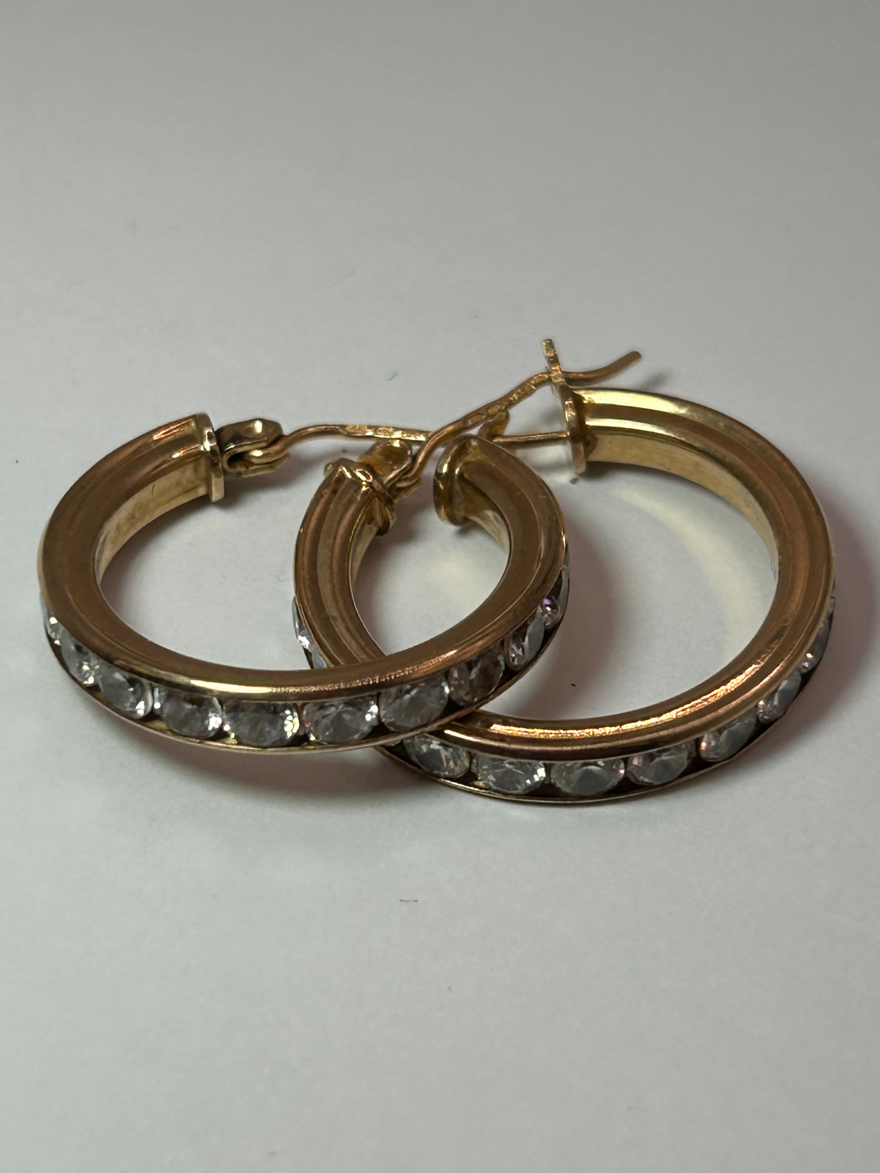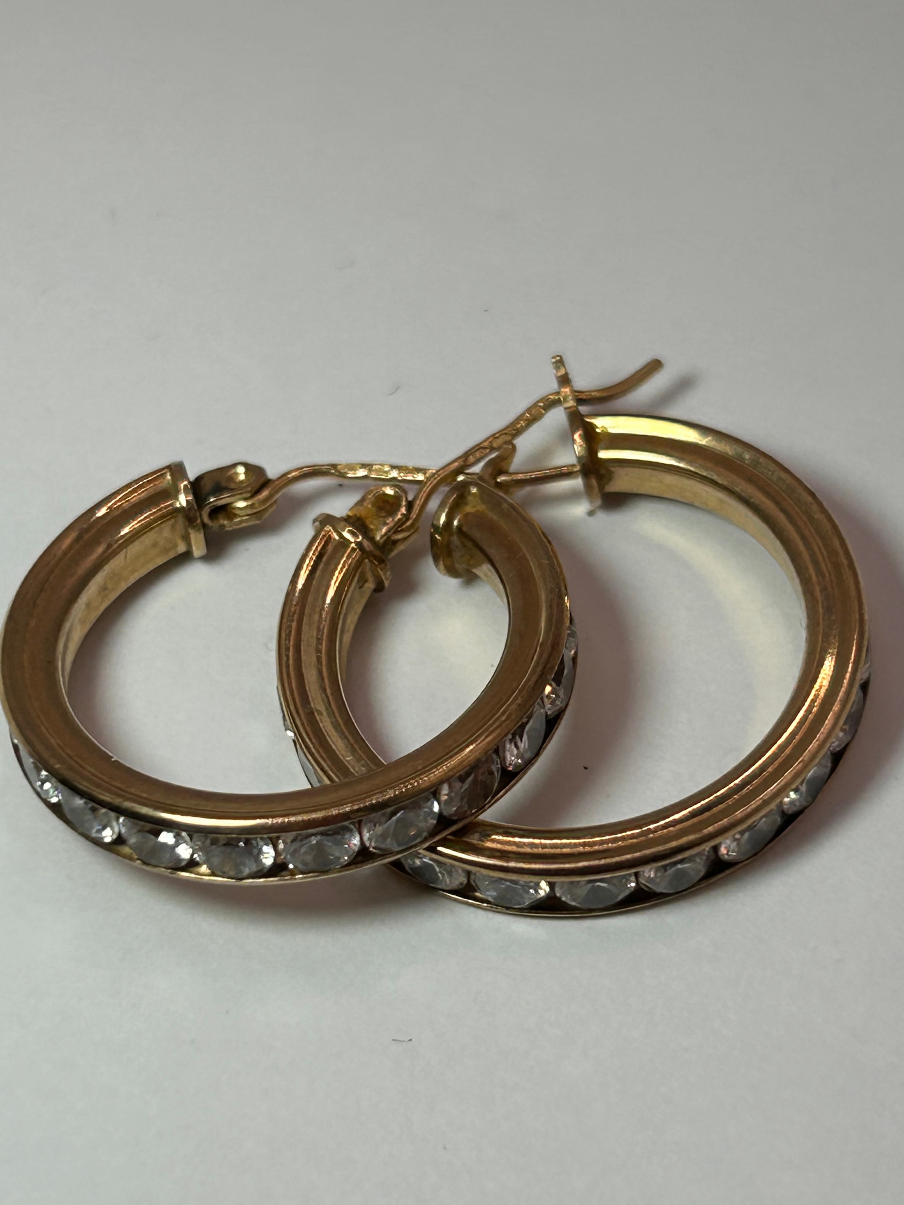 A matching pair of contemporary-style 9ct Gold hoop earrings. Each earring features a substantial circular hoop design, with the visible front half adorned by a row of numerous small, round, clear, faceted stones, channel-set. The earrings are secured by a hinged closure mechanism.